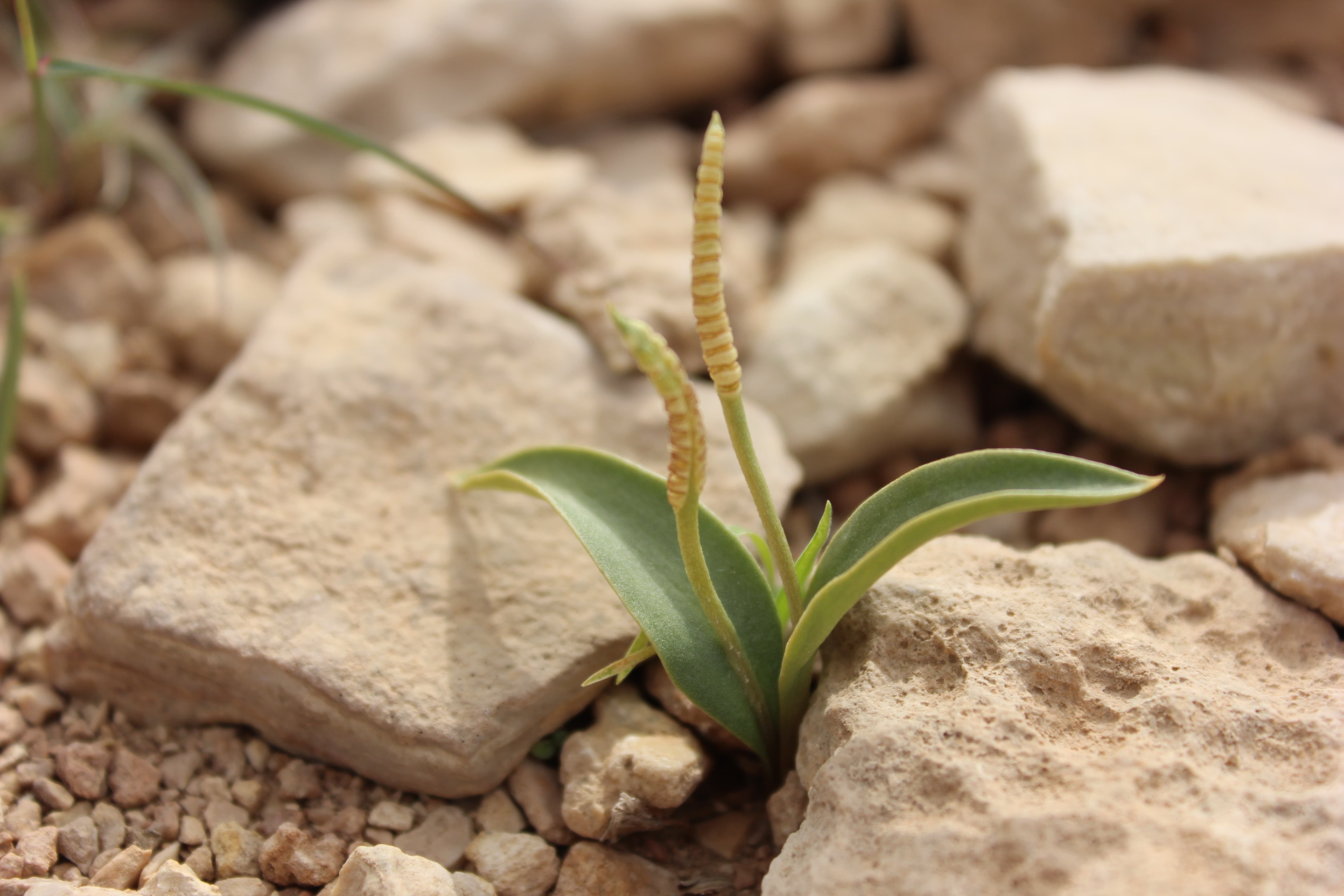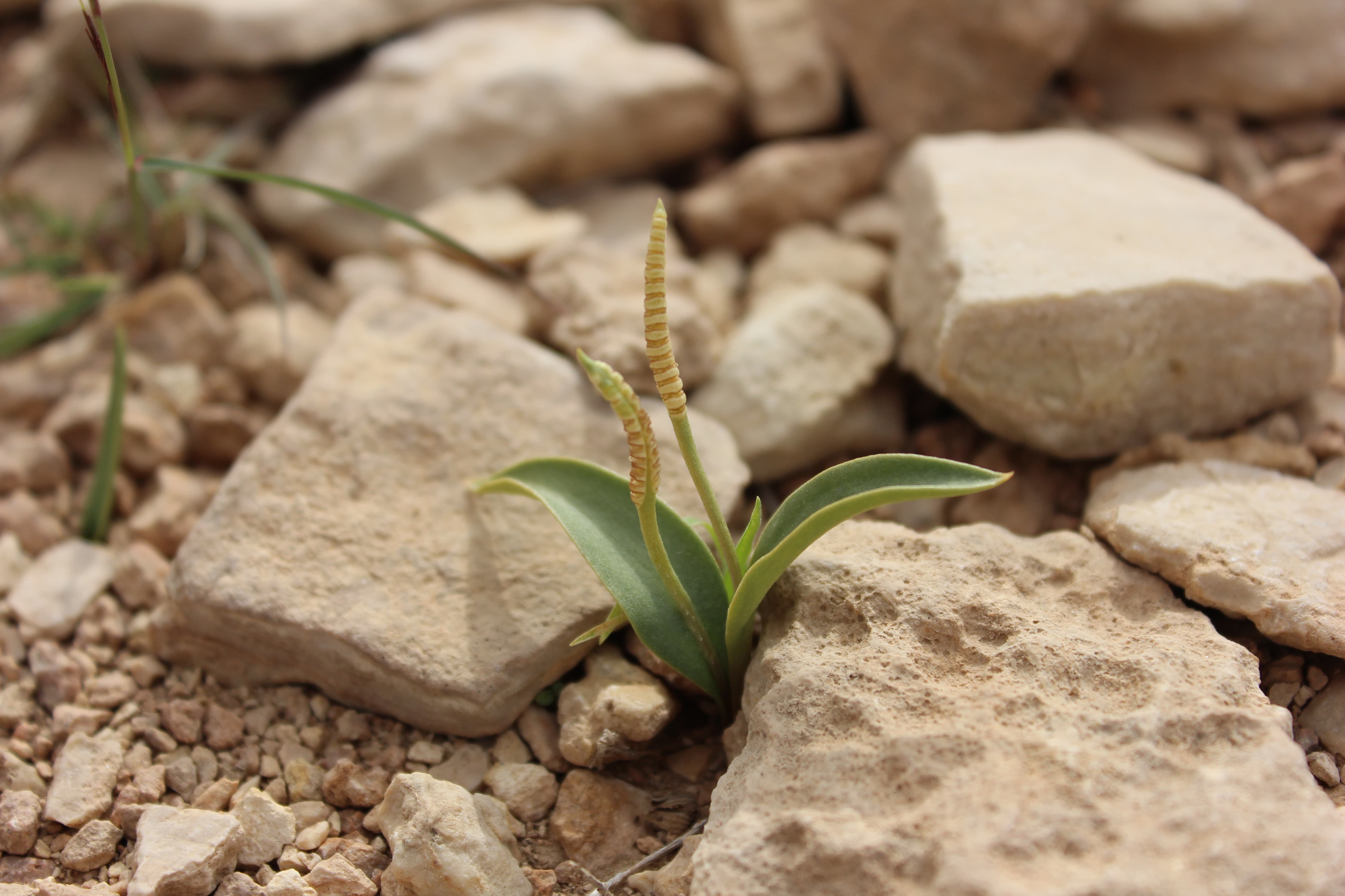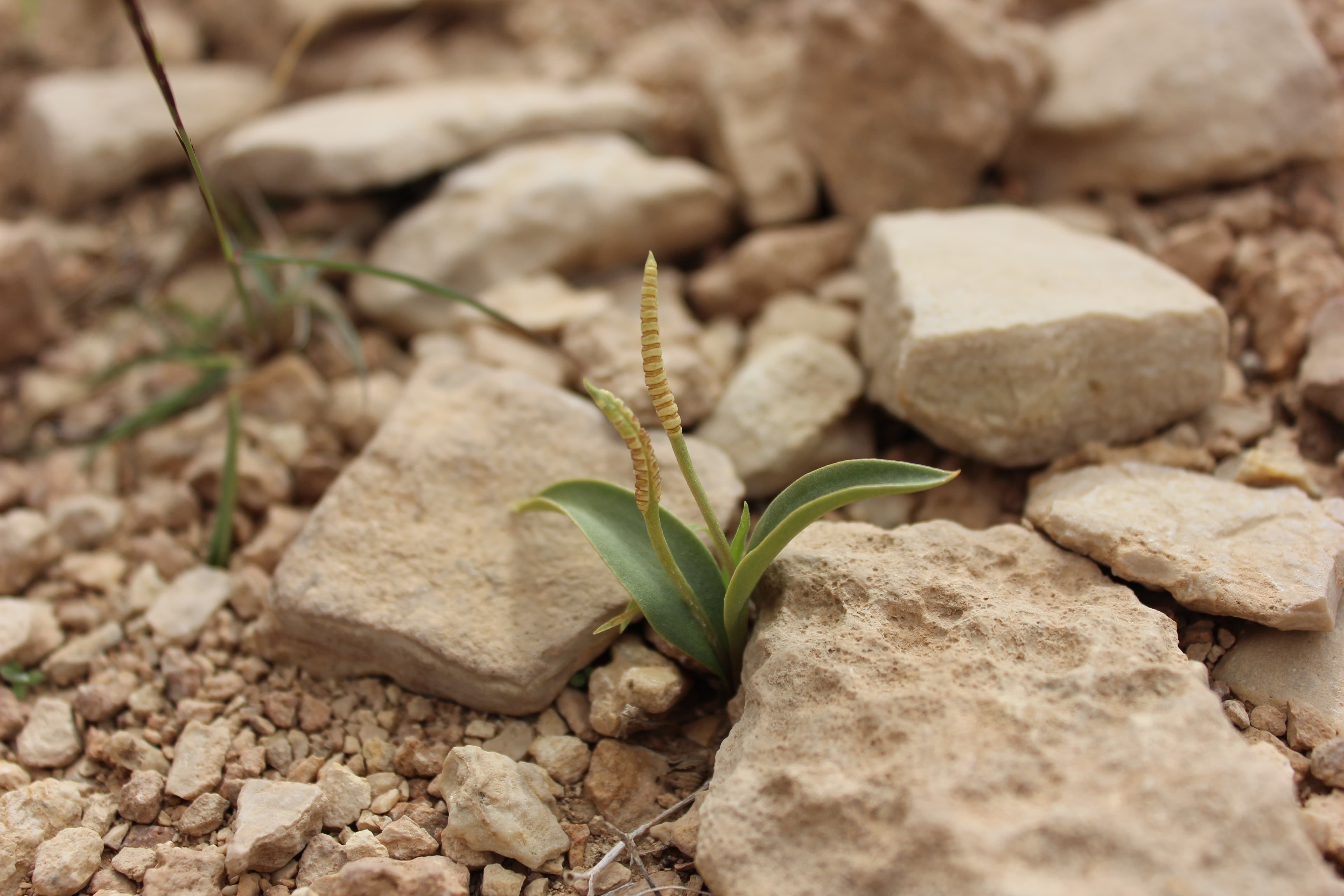 Rhizome , erect , spindle-shaped to linear ; up to 10 cm high , with fleshy , horizontaly , interconnected roots . Fronds (1-)2 , surrounded at the base by persistent leaf base ; sterile lamina grey or glaucus green , narrowly ovate to elliptic , apex pointed , mucronate , occasionally rounded , base wedge-shaped , texture rather fleshy ; fertile segment attached at the base of the sterile lamina , acute at the tip , with 13-30 pairs of sporangia . Sopre cases (sori) borne on a fertile long segment attached to the leaf base . (Ref . Miller & Cope ; 1996) .