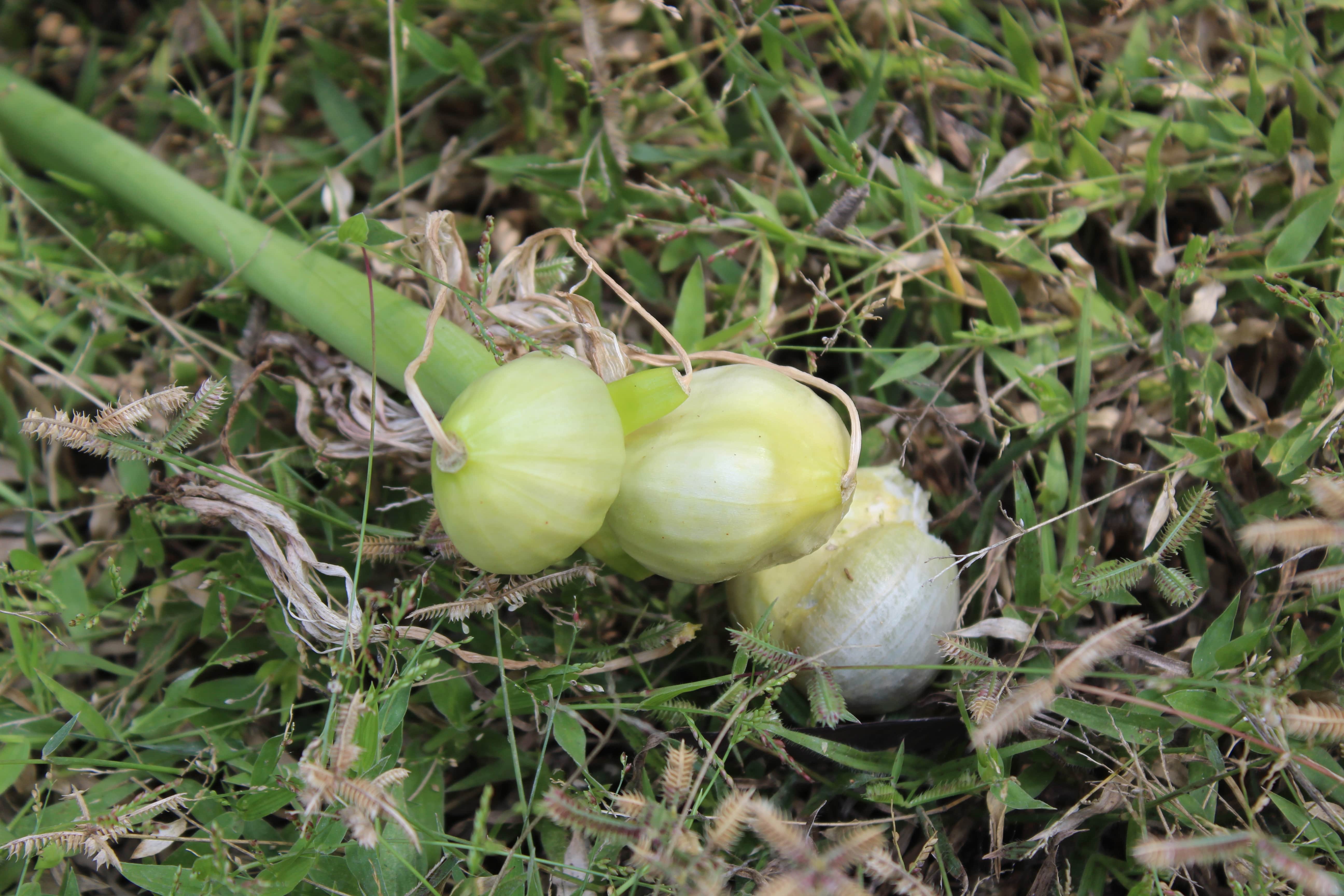 Bulbous geophyte with bulbs up to 10 cm in diameter . Stems erect to spreading , slender . Leaves 30 x 2 . 5–5 cm , spreading to erect , narrowly lanceolate , wavy margins , mostly with intact apices , not glaucous , with distinct midrib . Inflorescences sessile , in umbels , 4–6-flowered ; scape 25–65 cm long , contemporary with the leaves ; bracts greenish , tinged with red , persistent and erect . Flowers sessile , white ; perianth white with pink to purplish median region , with a long tube and oblong-elliptic lobes ; filaments white tinged red , shorter than the perianth segments ; anthers dark , 8–10 mm long , curved ; style tinged red distally . Fruit capsule , greenish tinged red , with thick pericarp , subglobose without or with a very short apical beak . Seeds light green , not particularly smooth , closely stacked and irregularly compressed . (Ref . https://plants . jstor . org) .