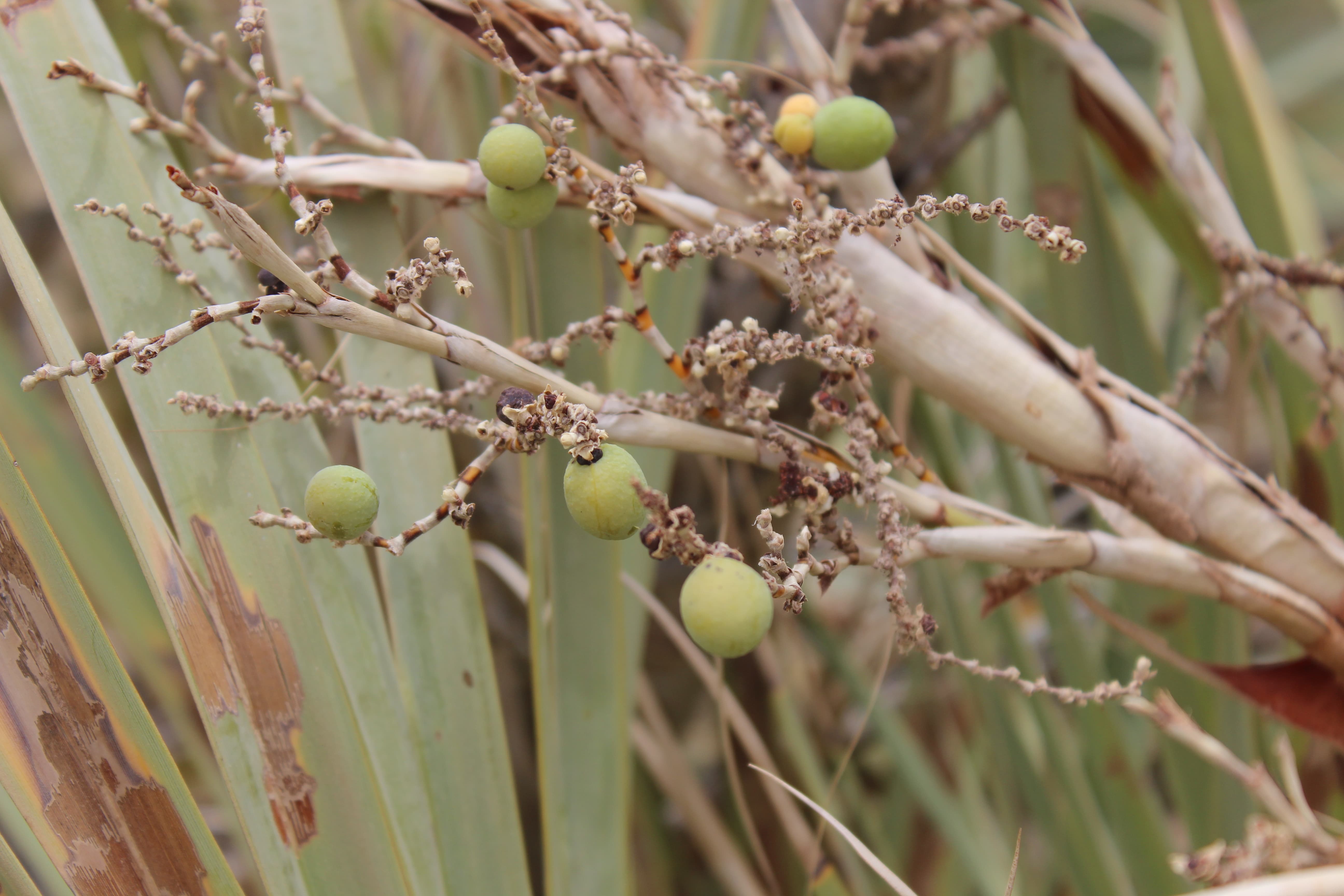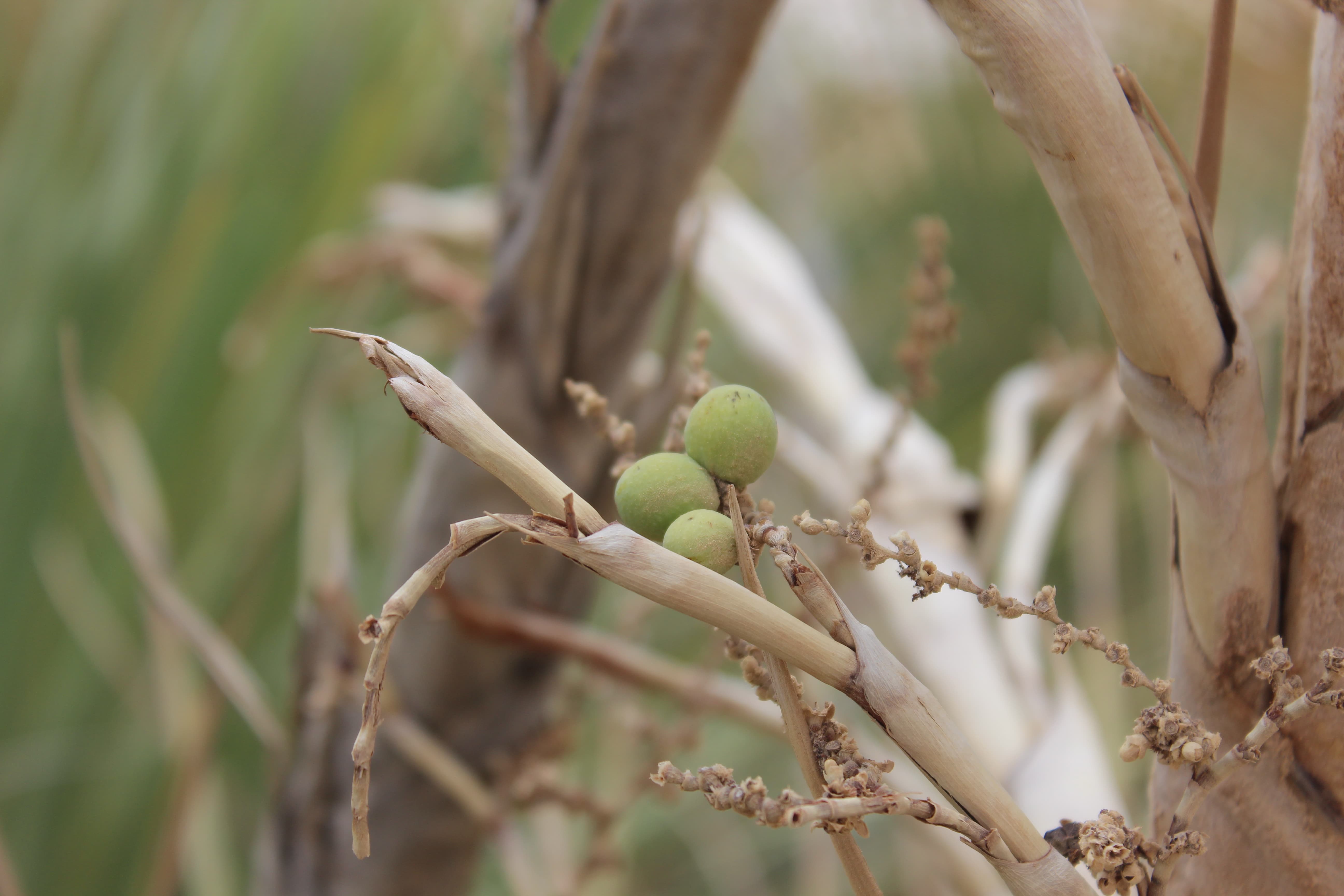Low shrubby palm ; up to 2-5 m tall , with a short , much-branched trunk . Stems branching dichotomous , erect or more commonly prostrate to sub-erect ; trunk and branches covered with hardened remains of old petiole bases . Leaves 30-120(-150) cm , fan-shaped , petiolate , palmetely divided , rigid , grey-green ; leaflets split to more than half their length , folded . Inflorescences terminal , up to c . 2 m tall , reaching beyond the leaves , branched . Flowers 4-5 mm , bisexual and male on the same plant , sessile or with a short stalk ; calyx tubular , 3-lobed , creamy-pink ; petals 3 , creamy-pink , valvate ; stamens 6 in bisexual flowers , 9 in male flowers . Fruit berry , 16-20 mm , subglobose , fleshy , purple-red when ripe , 1-seeded . Seeds (9-)12-16 x 12-15 mm , very hard with edible pulp . (Ref . Flora of Oman ; vol . 4) .