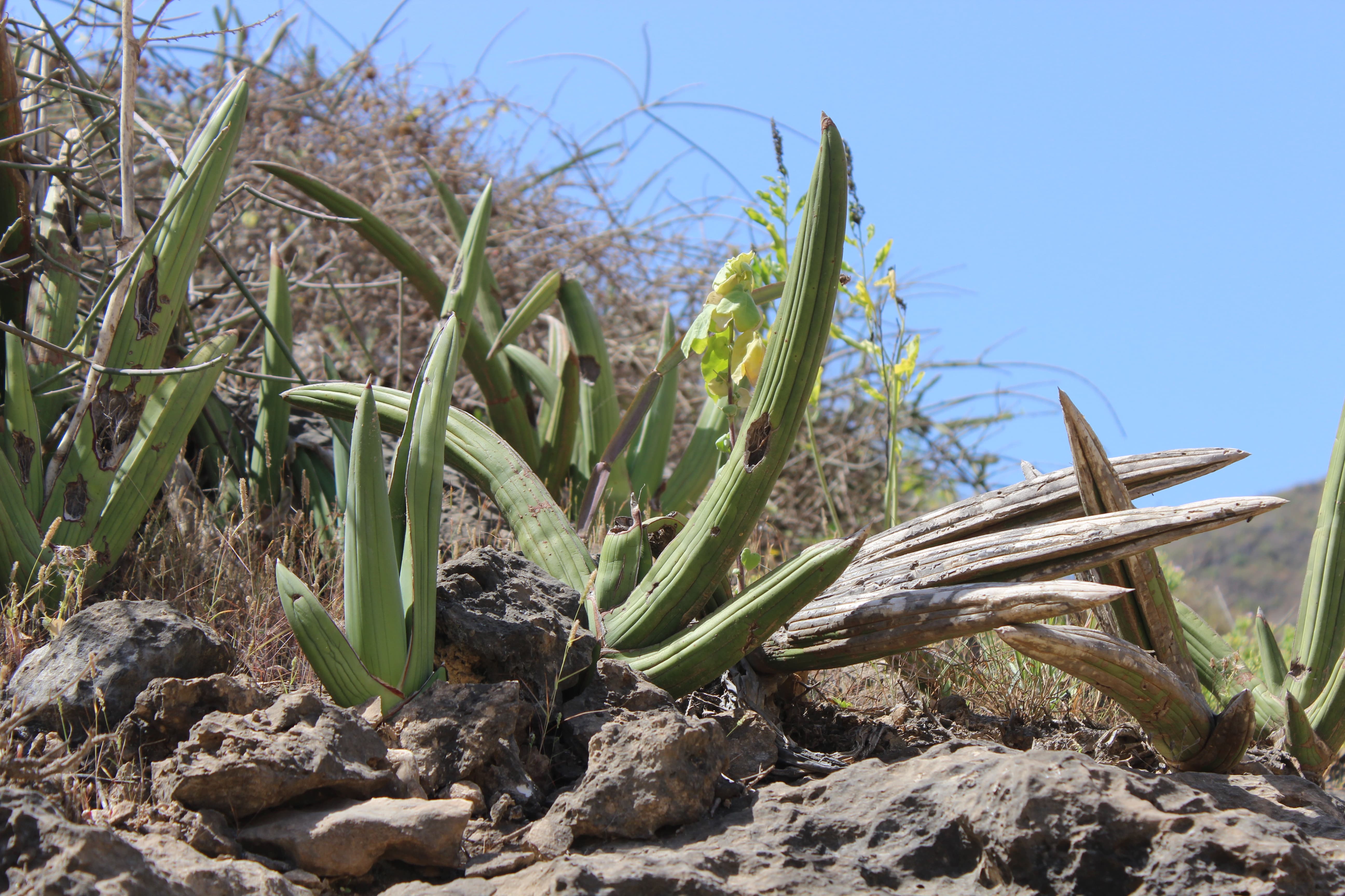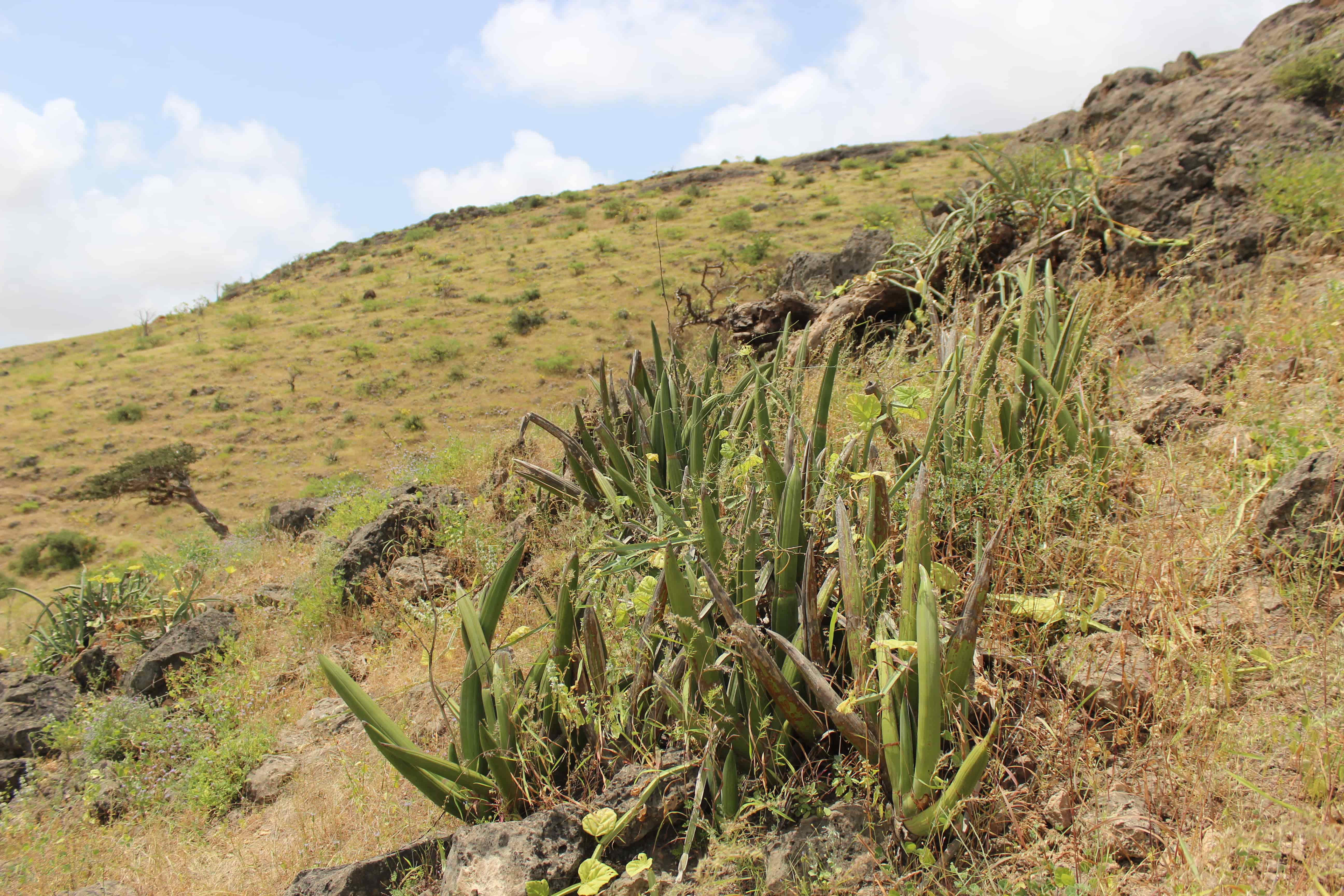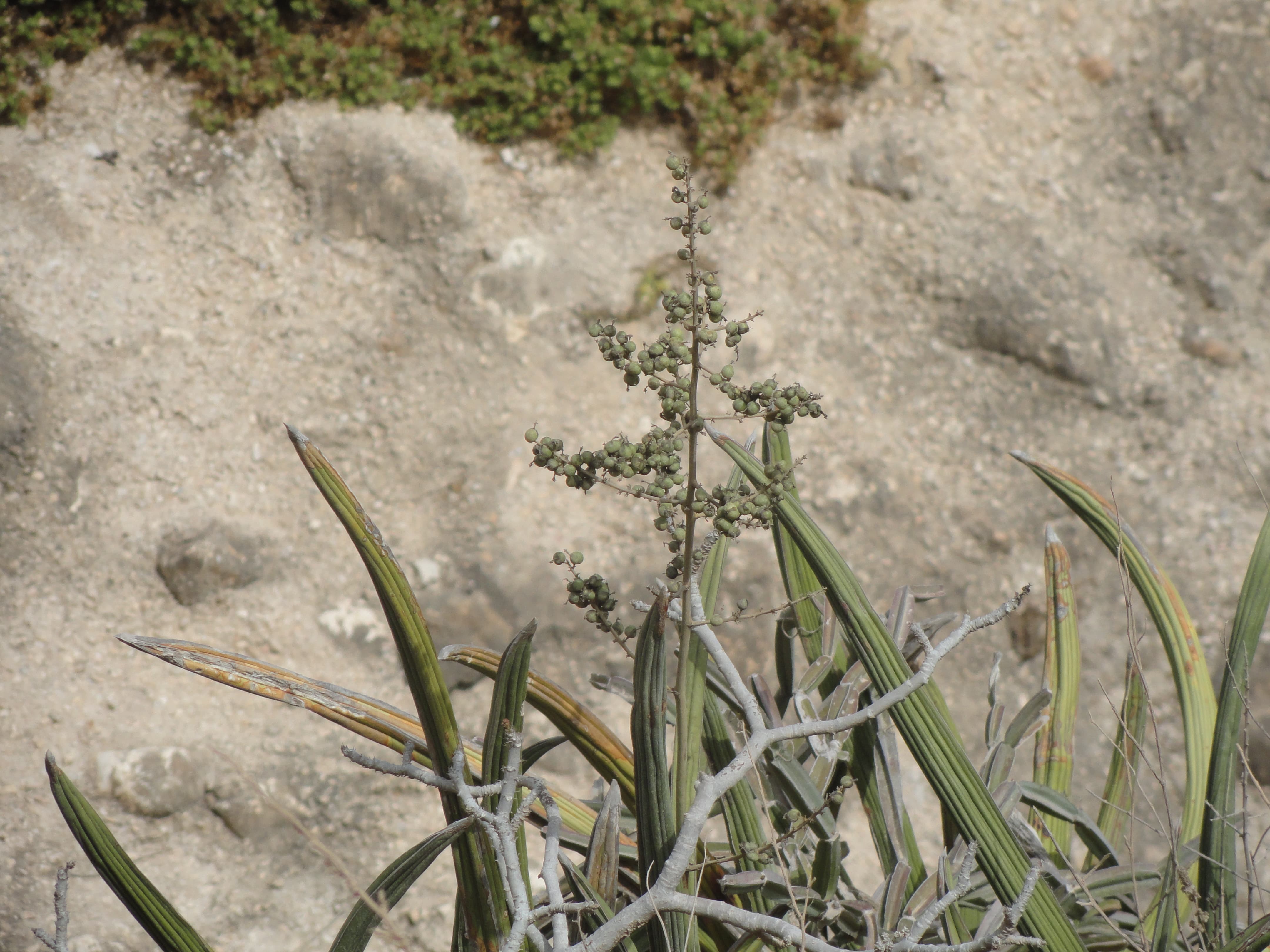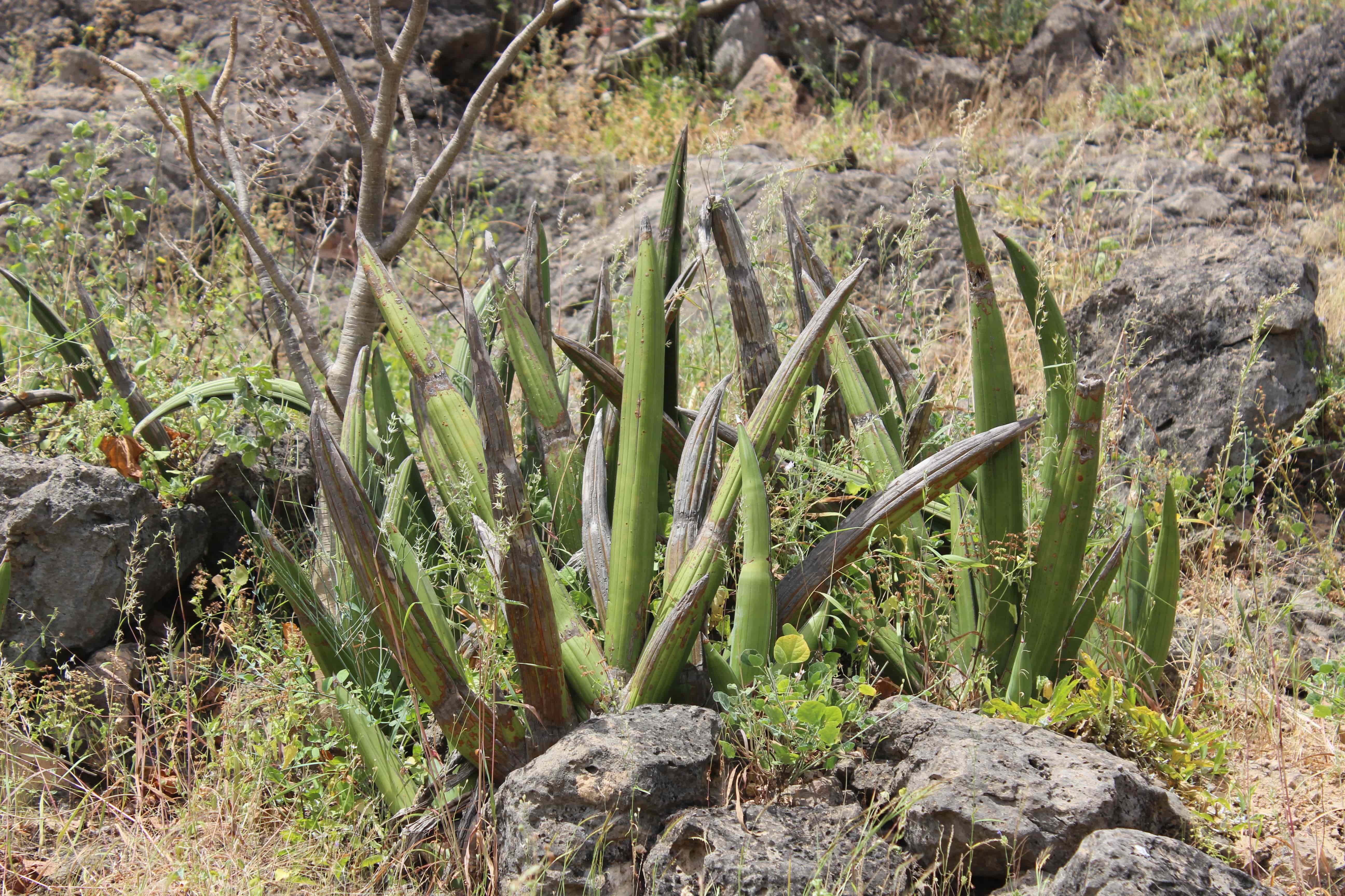 In Omani studies: Miller & Morris (1988) wrote that: "This plant was used in Dhofar to make rope and twine. The leaves were cut, then taken and left to soak in water, (preferably the salty and stagnant water of the lagoons [J: xor] where livestock were taken to water), until the outer layer had split and rotted down, and could be easily separated from the fibrous matter inside. They were then removed from the water and taken to a hard flat surface and beaten with heavy clubs until the fibres were loosened. The fibrous material was then extracted, separated into strands and worked into cordage of various thicknesses, by rolling on the thigh or twisting between the fingers. Fibres from plant made short but very strong threads which were popular when making the slingshot [J: mexdifot] used in the rainfed agricultural plots of the mountains, as well as in the
