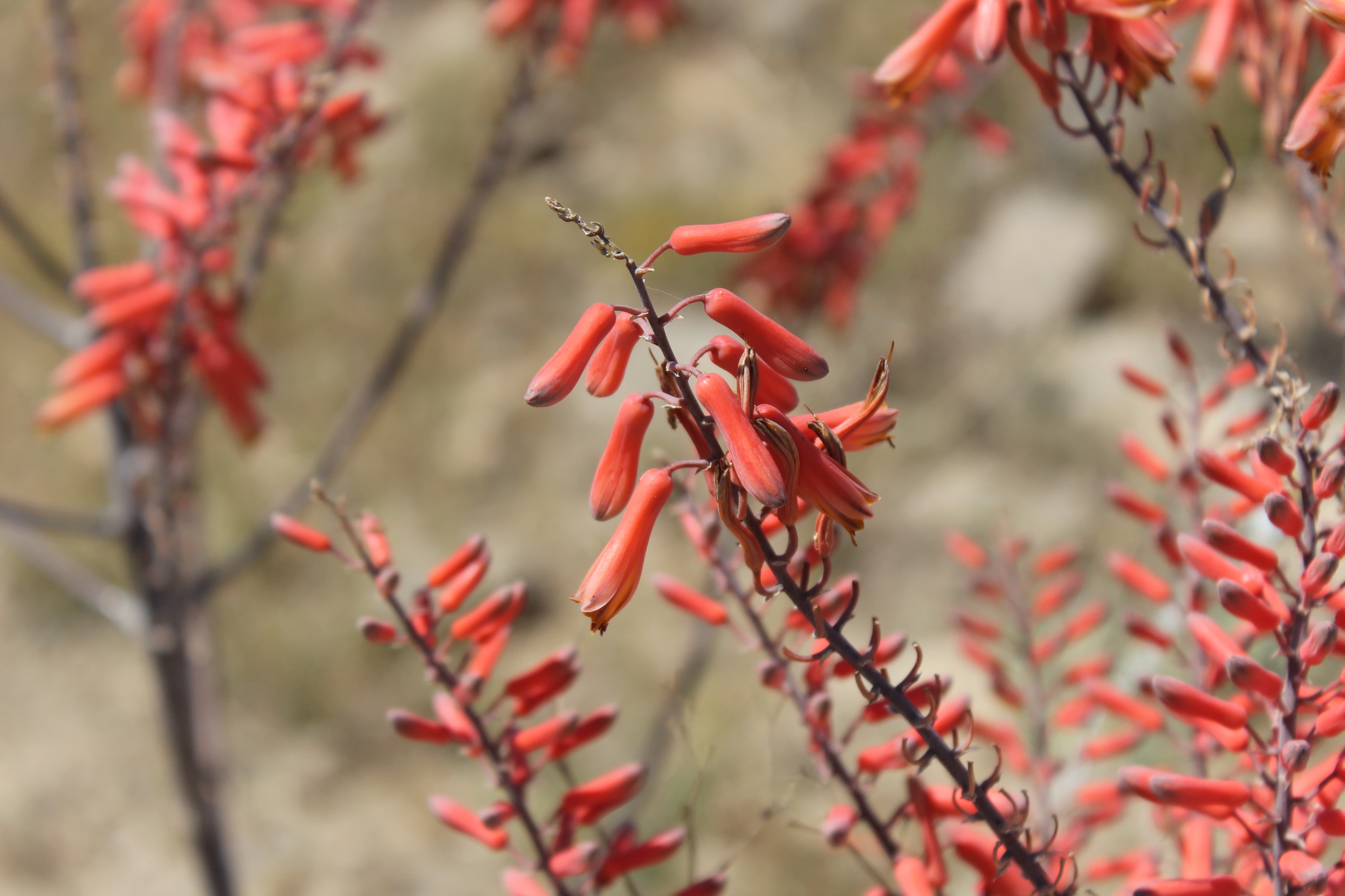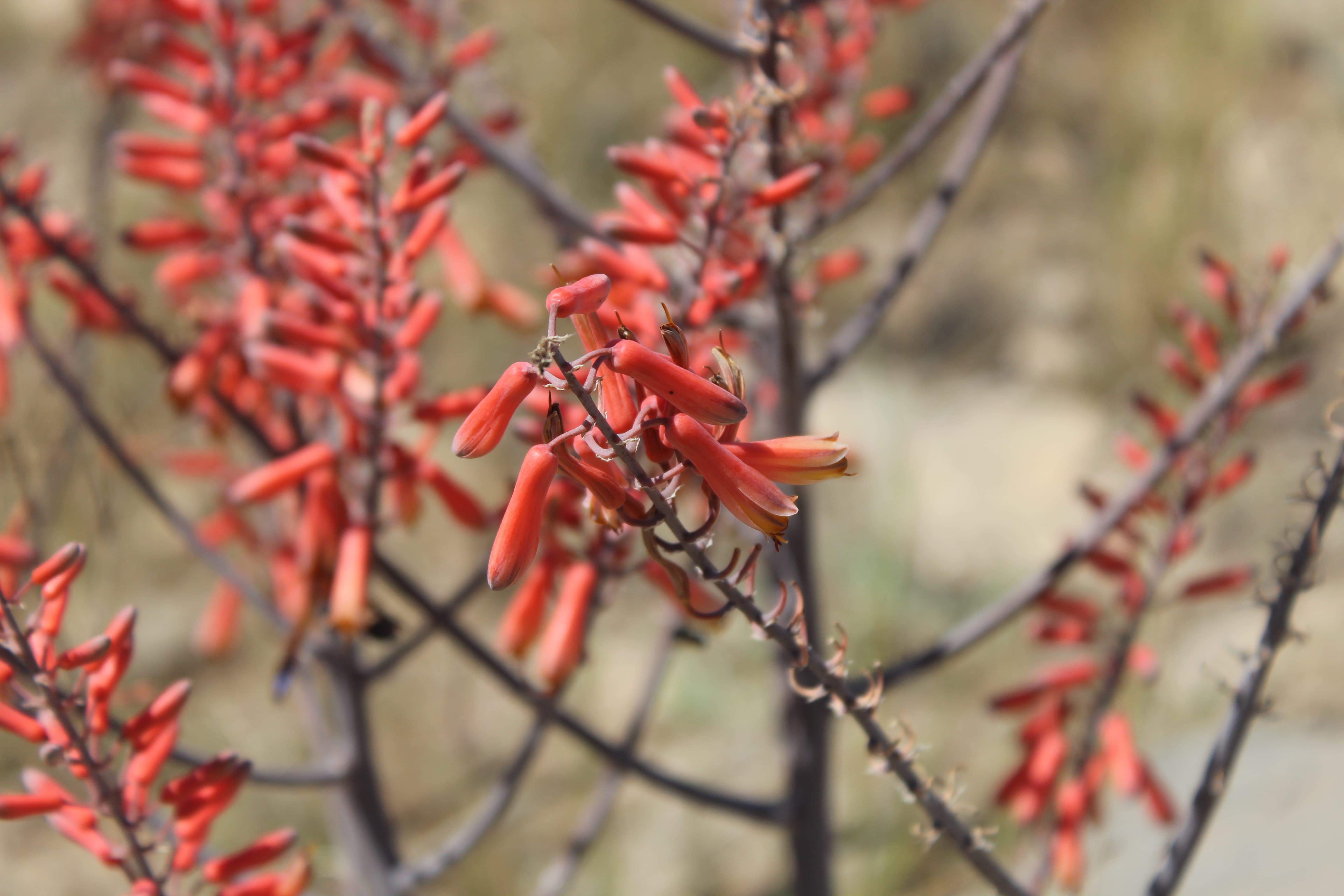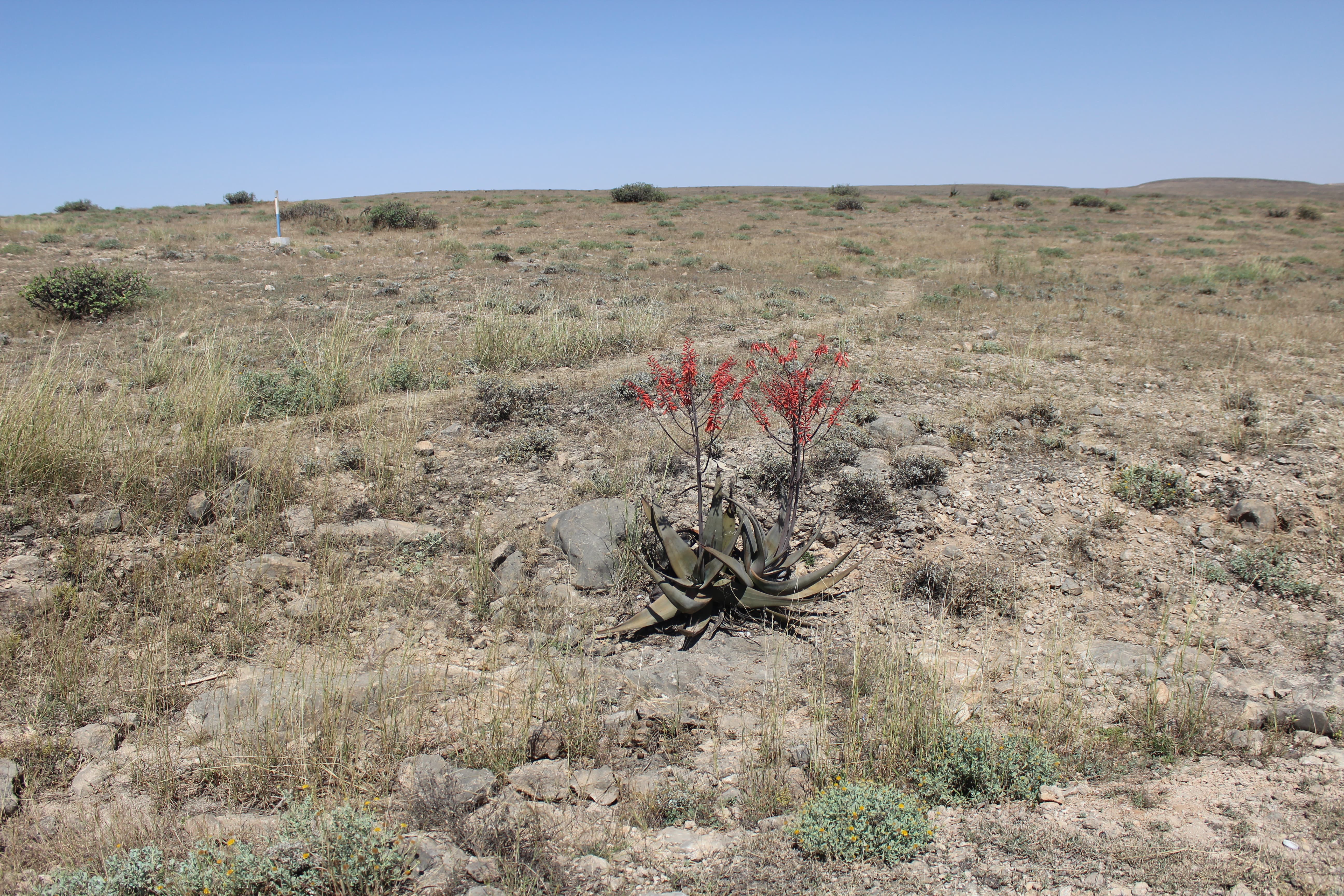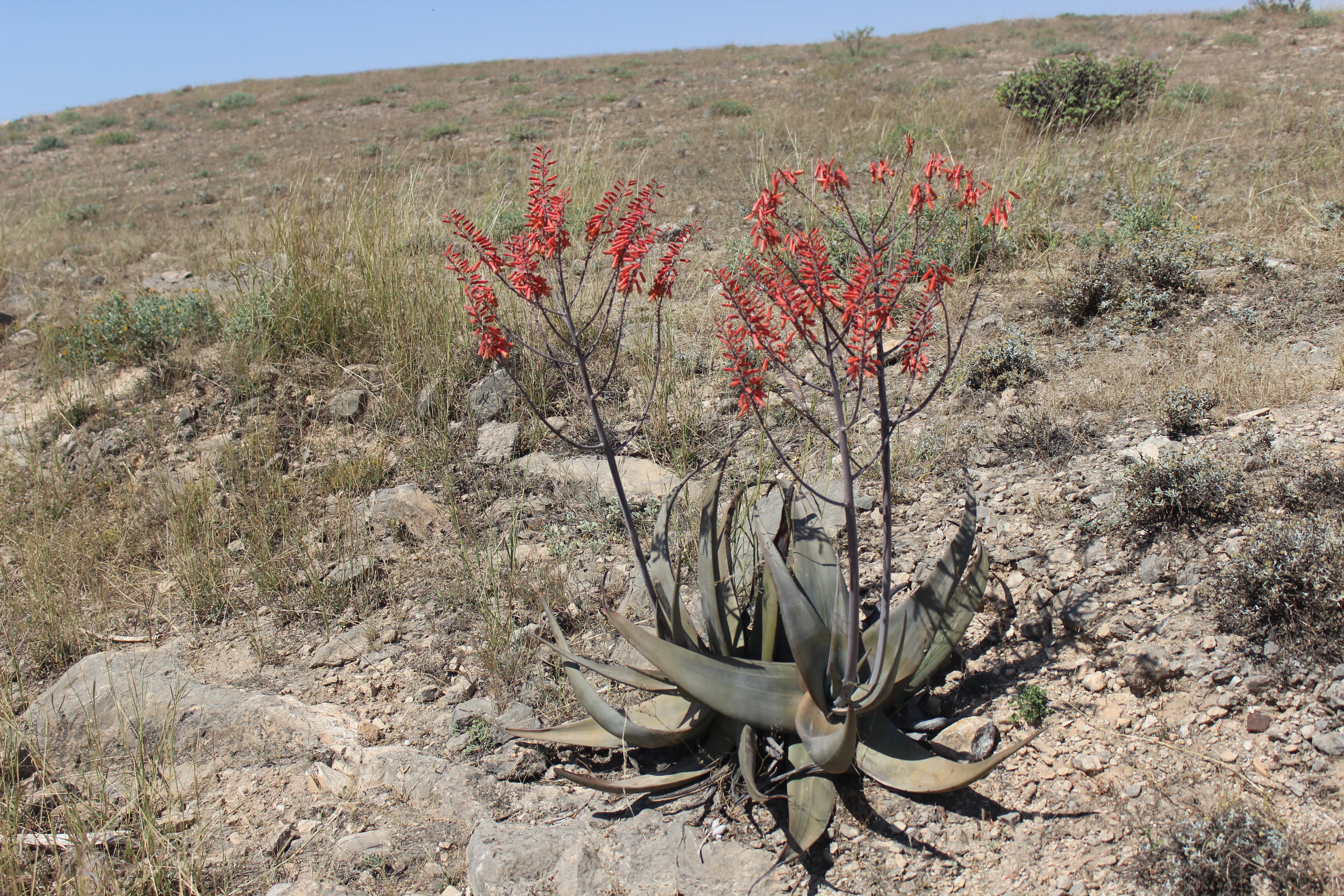 A succulent , perennial herb ; up to 30 cm tall , with yellow sap . Stems ± absent or short . Leaves 10-16 , spirally arranged as a rosette at the base of the stem , succulent with a smooth surface , spreading or ascending , broadly triangular with an acute and often slightly recurved apex , 25-40 cm long x 8-10 cm across , blue-gray without any spots in mature plants . Inflorescences erect or produced at a slant , up to 120 cm tall , with 10-30 , divaricately spreading branches that are often re-branched ; racemes rather short , laxly flowered , flowers often sub-secund ; bracts ovate , with an acute tip , 5-8 x 2 . 5 mm ; pedicels 10 mm long . Flowers tubular , red with greenish brown tips , often yellow at the mouth , glabrous , constricted above the ovary , averaging 25 mm , outer segments free for 7 mm ; filaments yellow ; anthers brown , shortly exserted . Fruit capsule , 20 x 5 mm , 3-valved , held erect , becoming hardened and almost
