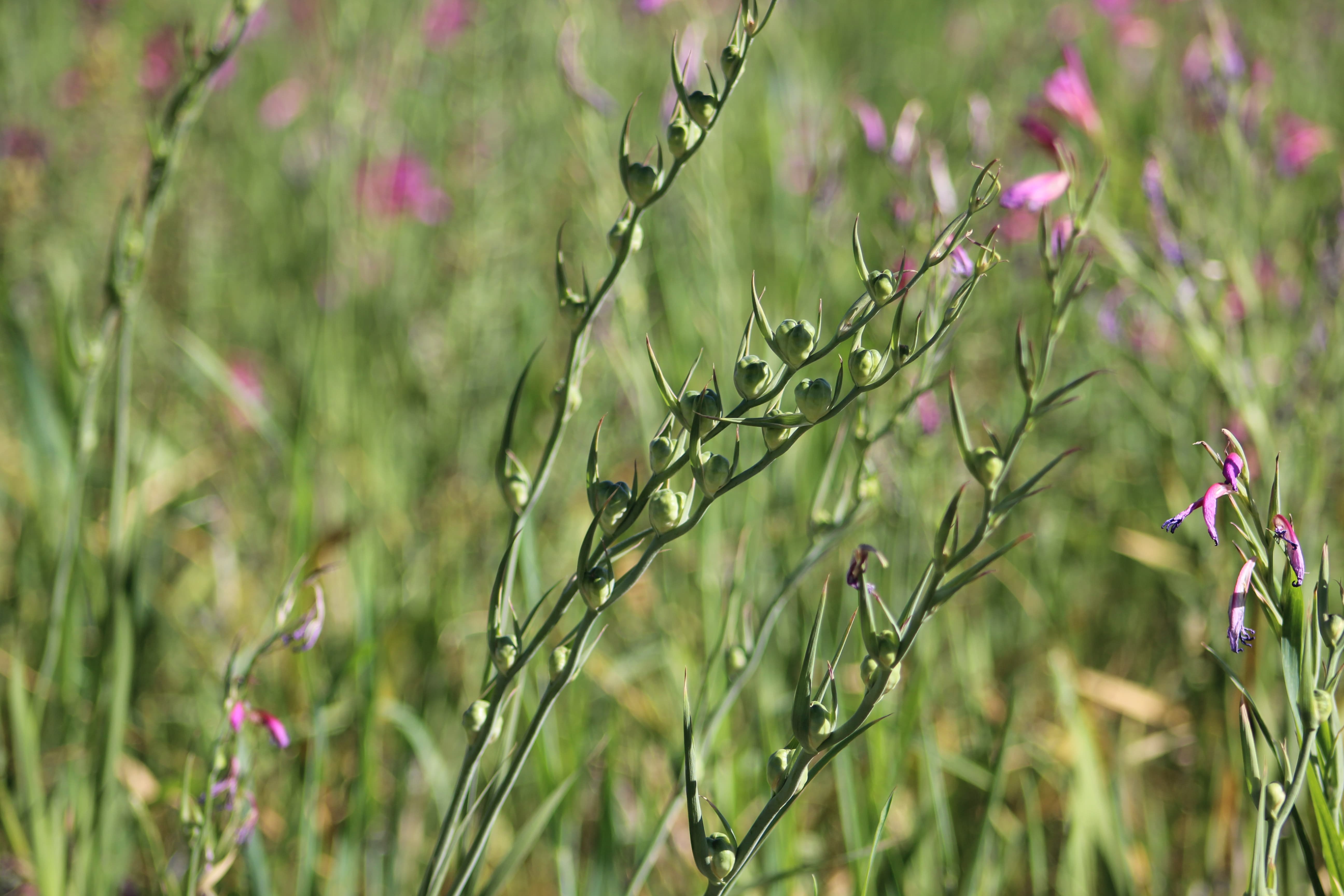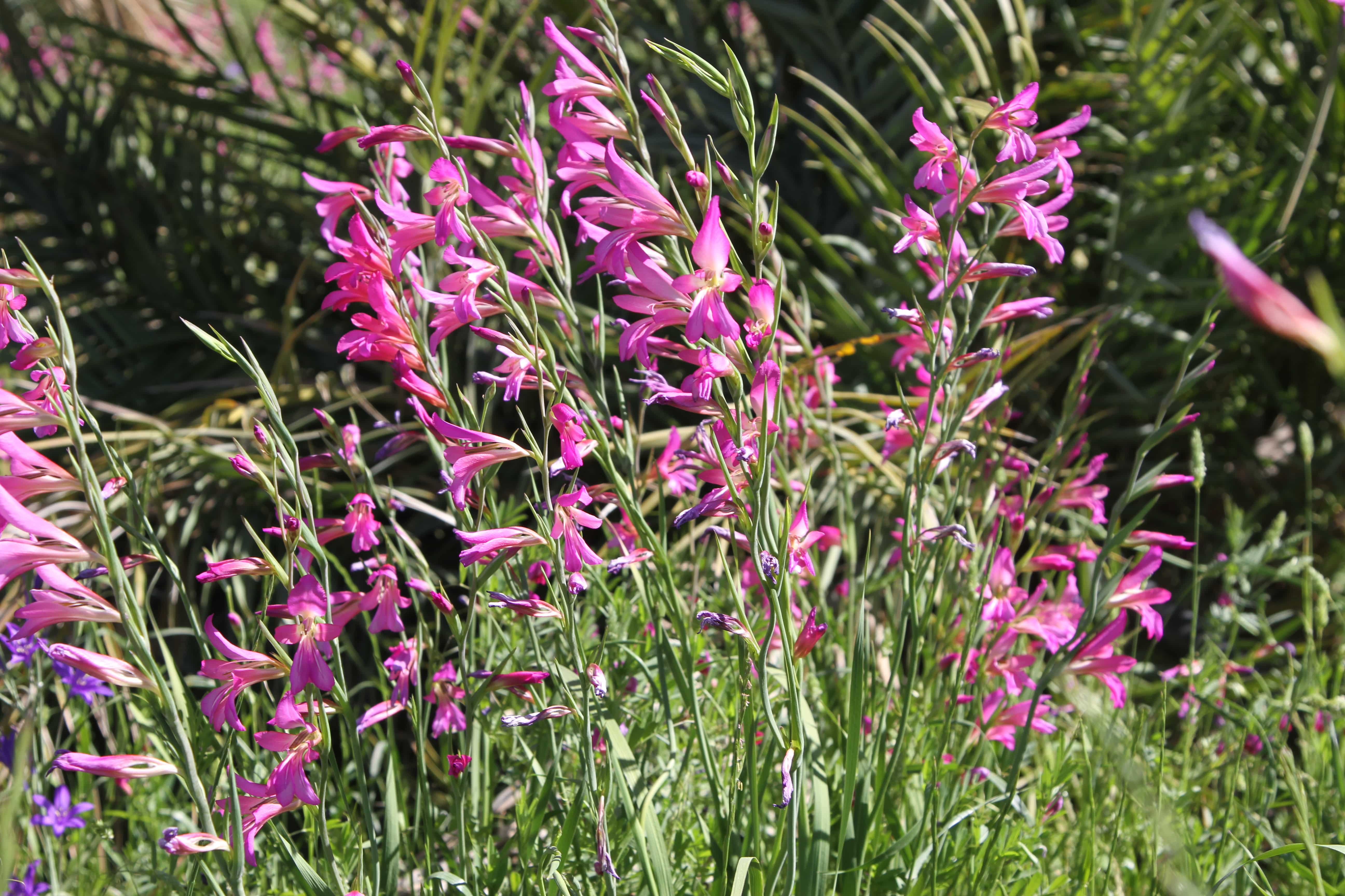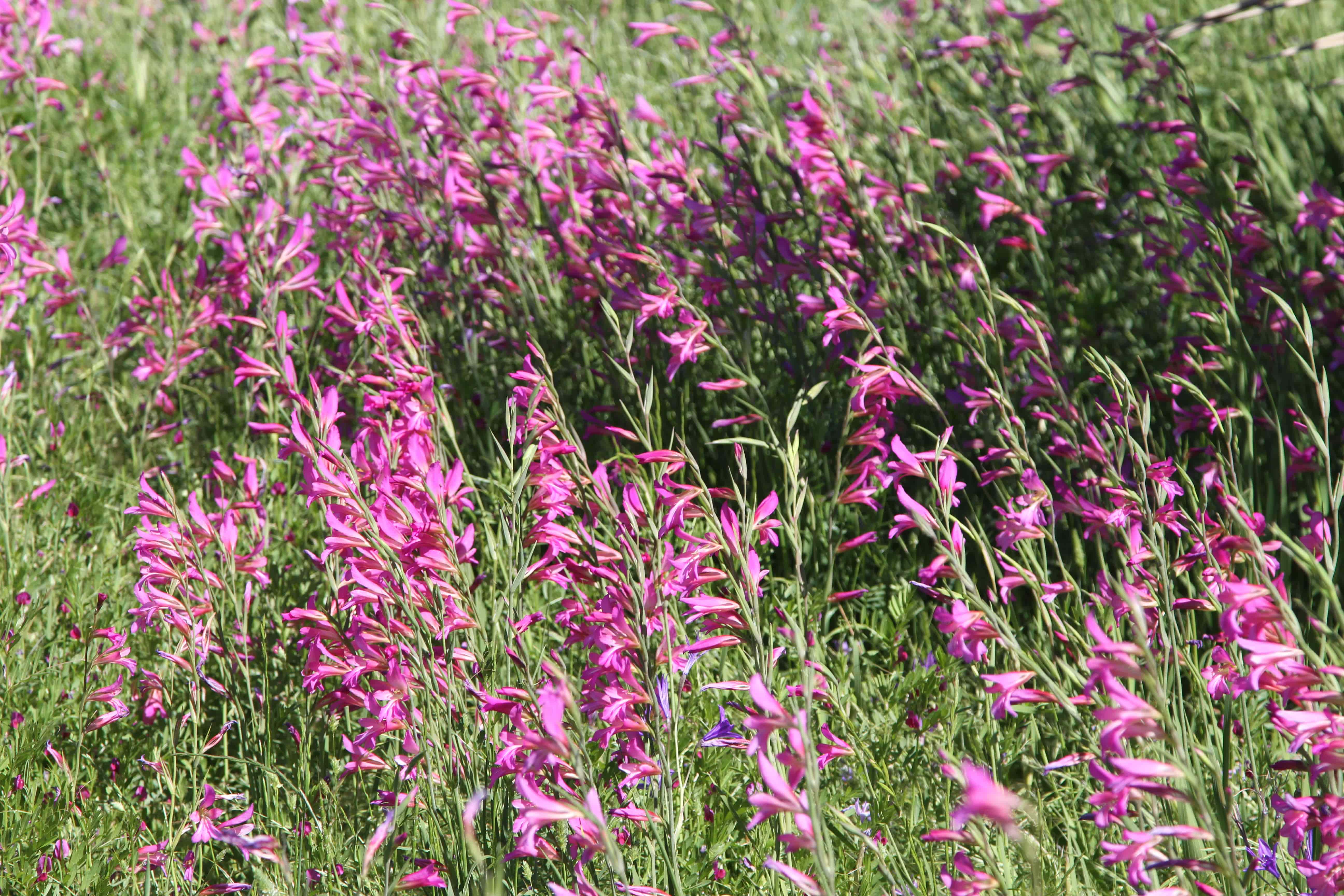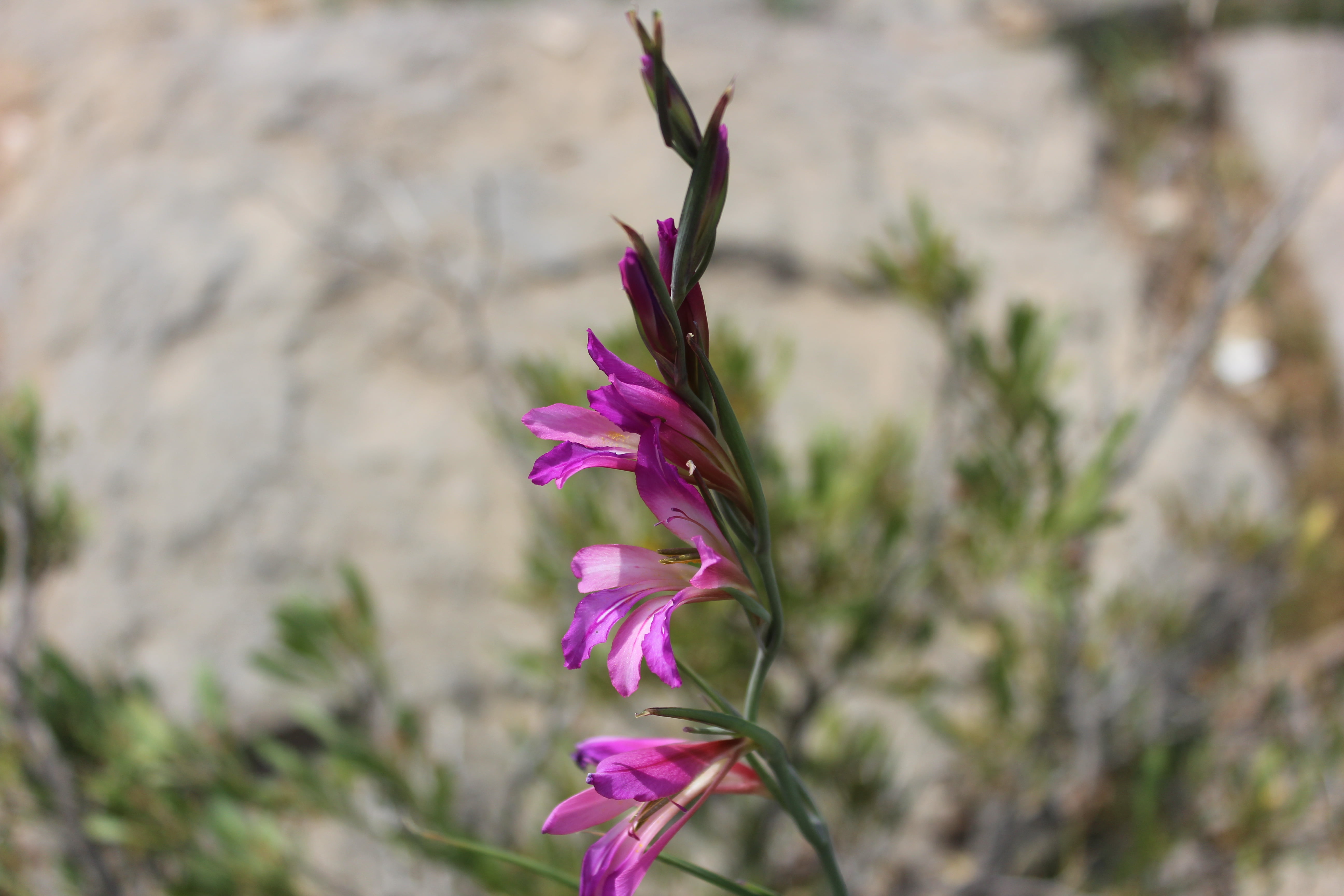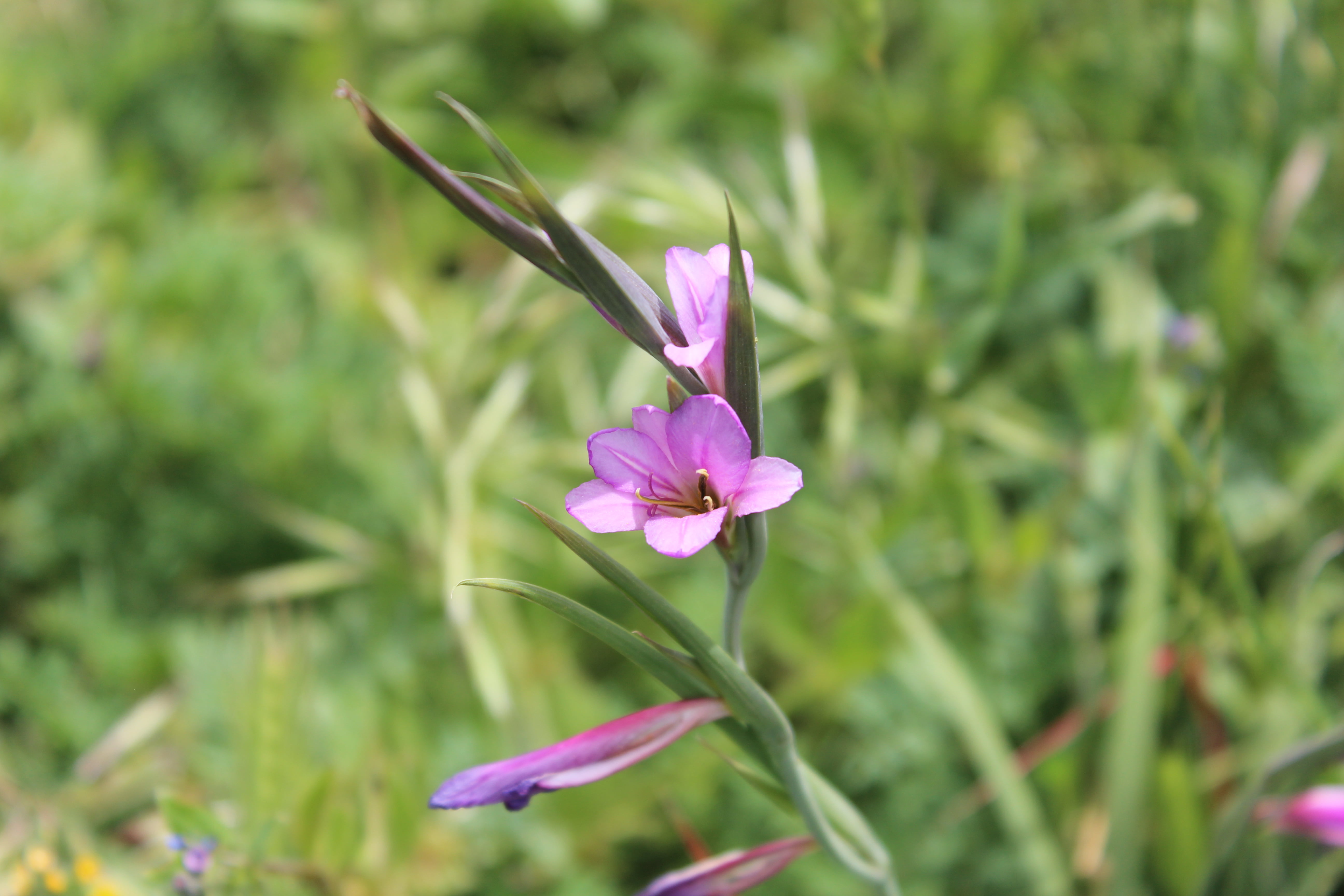 A perennial herb ; up to 1 m high , with an ovoid corm covered with brown fibrous tunics . Stems erect to ascending , slender , weak . Leaves alternate , dark green , 4(-5) , lance-shaped , long with entire margins , glabrous . Inflorescences in simple 6-10 flowers in a one-sided spike . Flowers pink to pale purple , long , funnel shaped ; perianth segments with the upper median longer , the lower 3 , elliptic ; stamens 3 , inserted in throat of perianth ; ovary 3-locular ; style exserted ; stigma 3-lobed . Fruit capsule , obovoid , between two bracts . Seeds round , brown , globose , without wings . (Ref . Flora of Oman ; vol . 4) .