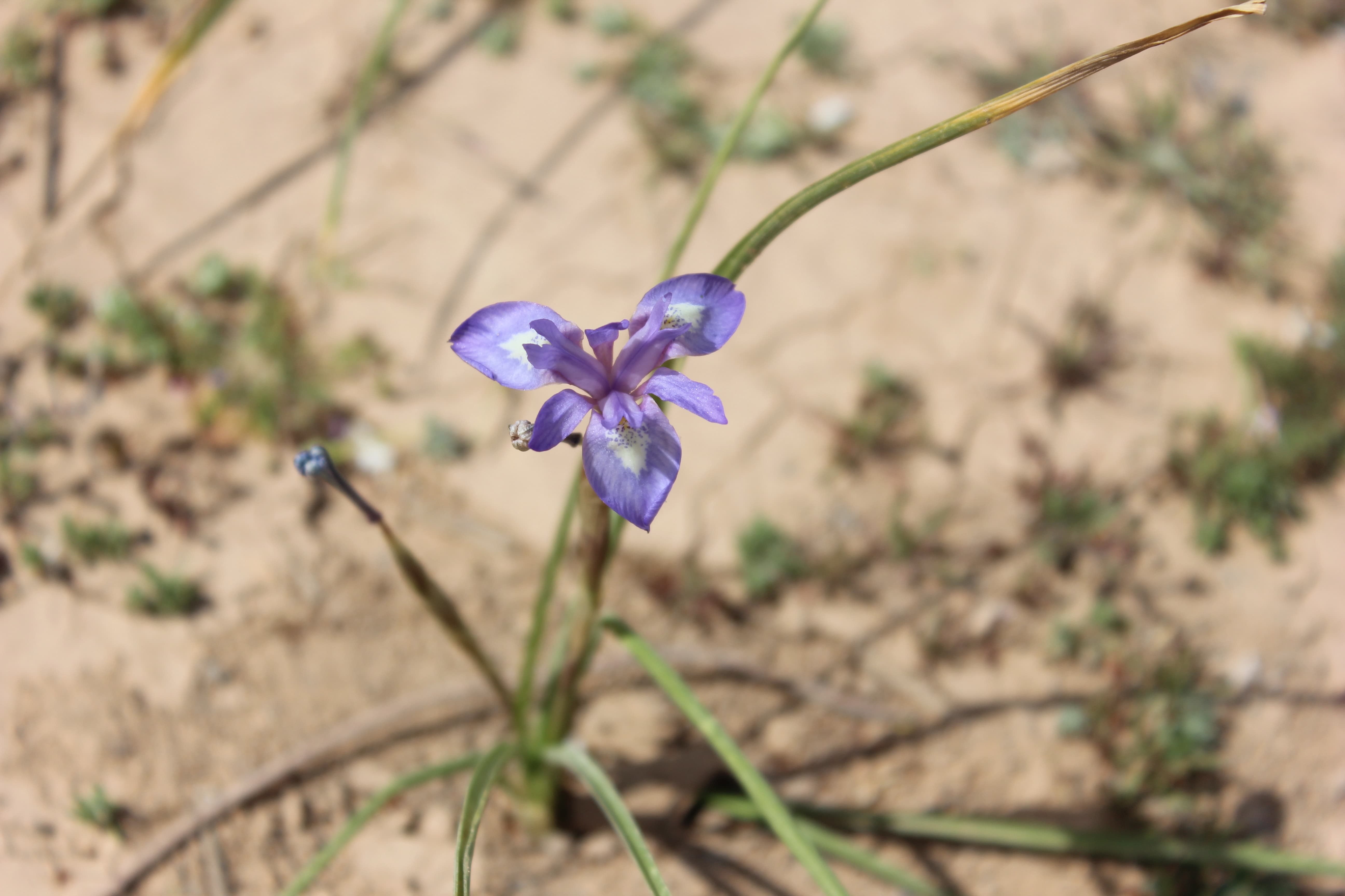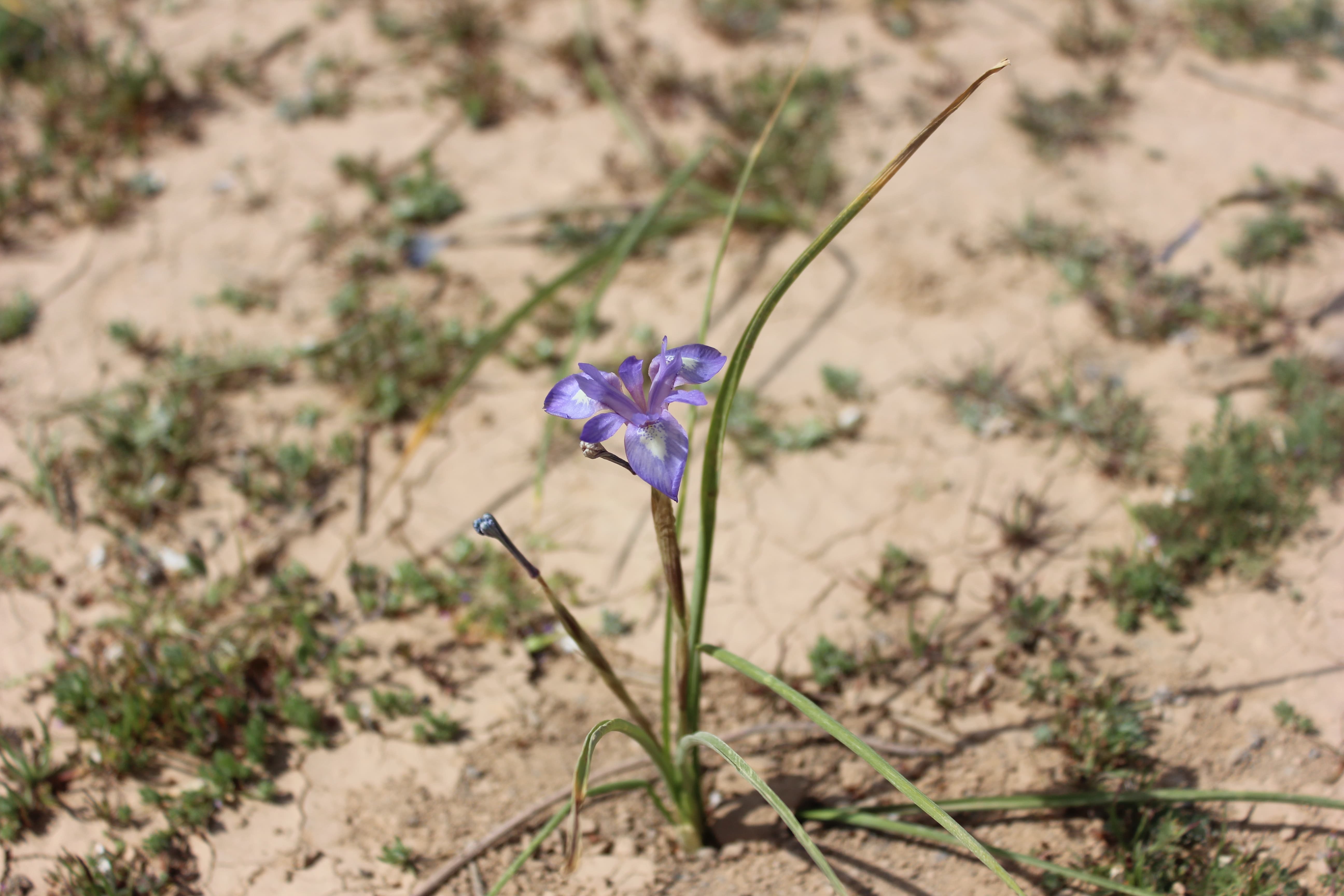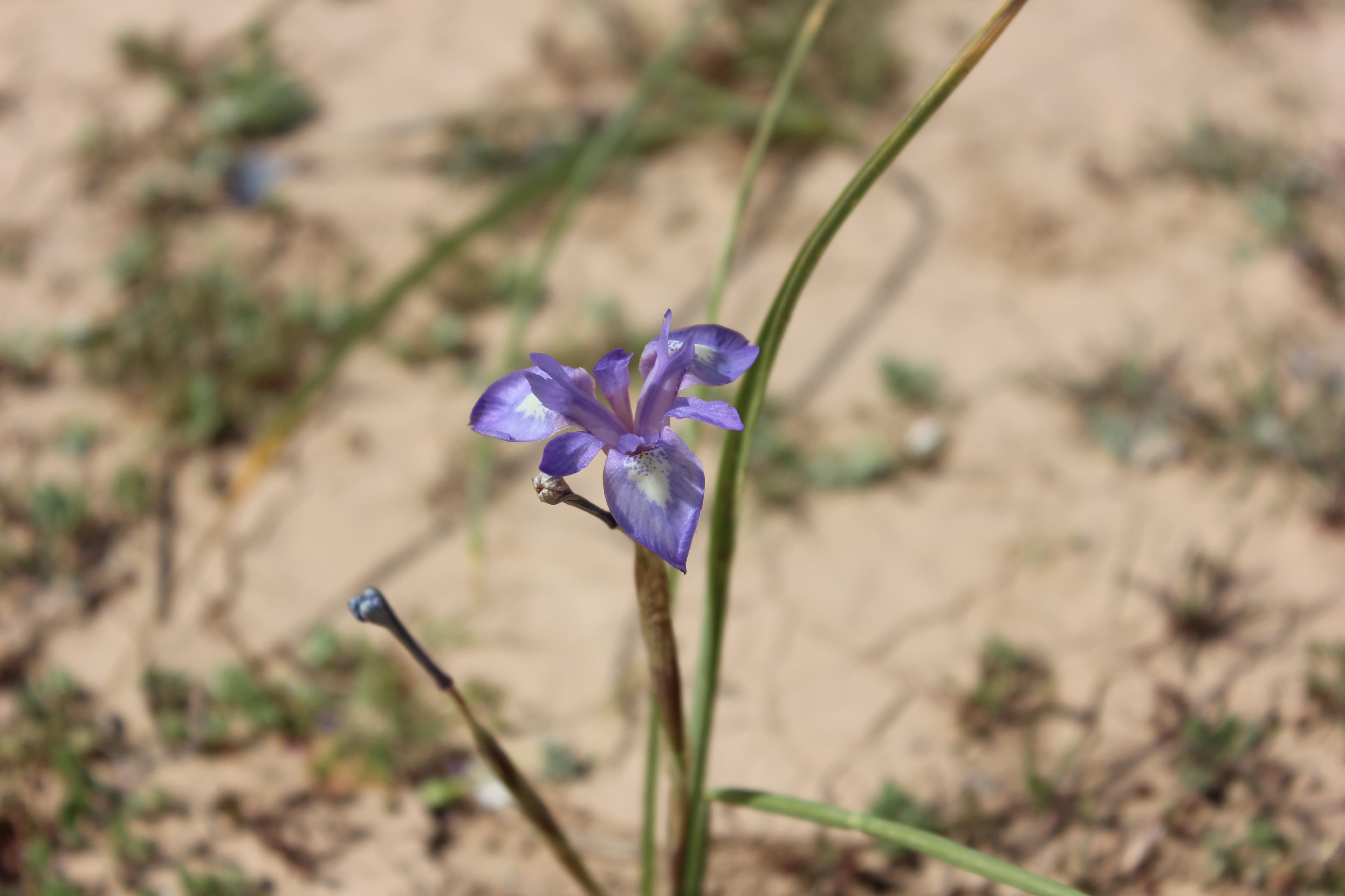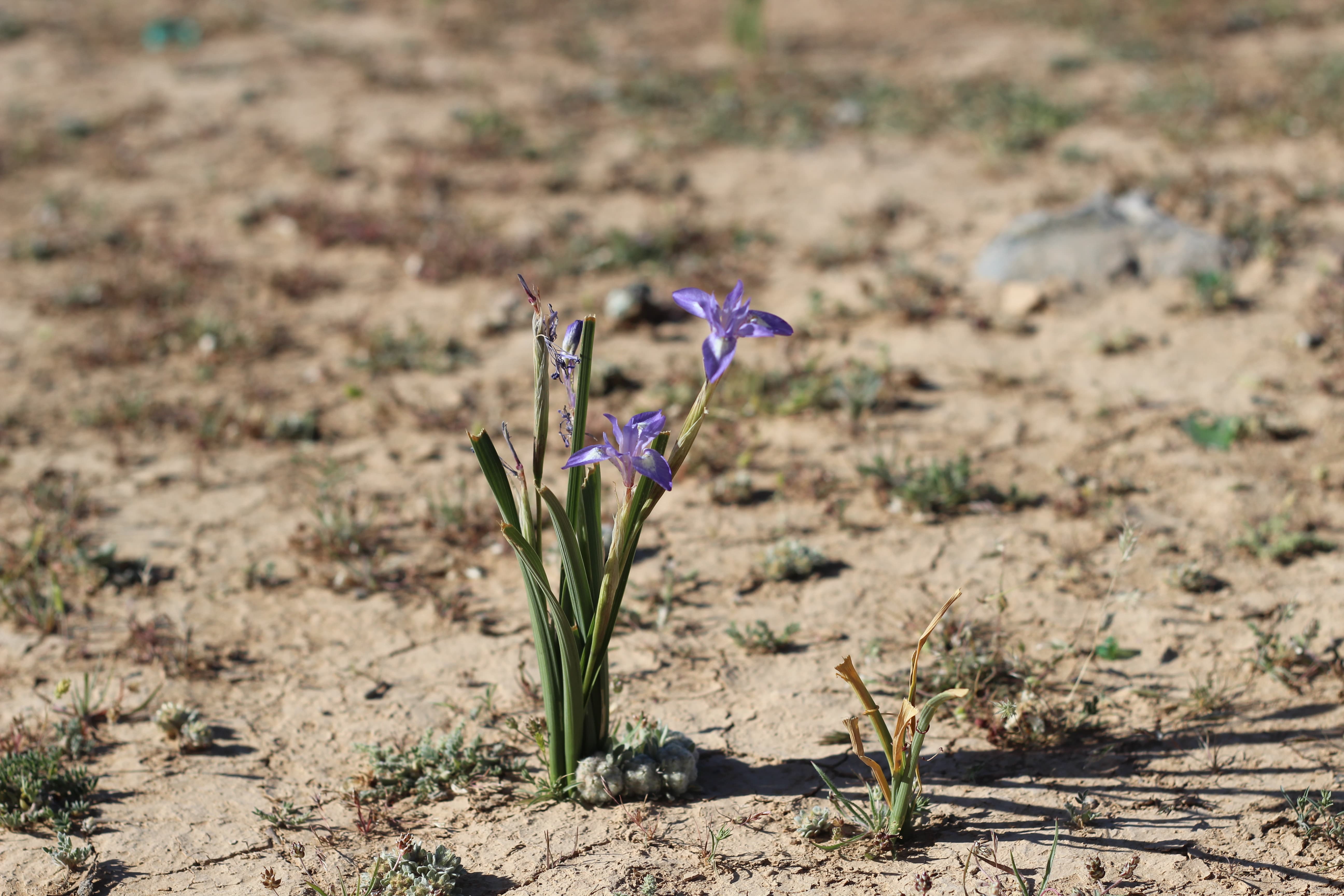An erect perennial herb ; up to 20 cm tall , with an ovoid corm covered with fibrous tunics . Stems erect to ascending , slender , weak . Leaves 2-3 , with long , sheathing base , linear , canaliculate , procumbent or ascending . Inflorescences in 1-4 compact cymes , each with 2-4 flowers . Flowers deep lilac/blue with a white throat , no scent ; perianth segments bluish purple , usually with a white or yellow patch in the centre of the outer segments ; stamens 3 , inserted at throat of tube ; stylar branches 3 , petioloid , each with 2 triangular lobes at apex ; stigma on lower surface of stylar arms at base of the 2 lobes . Fruit capsule , cylindrical to ellipsoid , with persistent 2 cm long beak . Seeds 1 . 5 mm , brown , ellipsoid , compressed . (Ref . Flora of Oman ; vol . 4) .