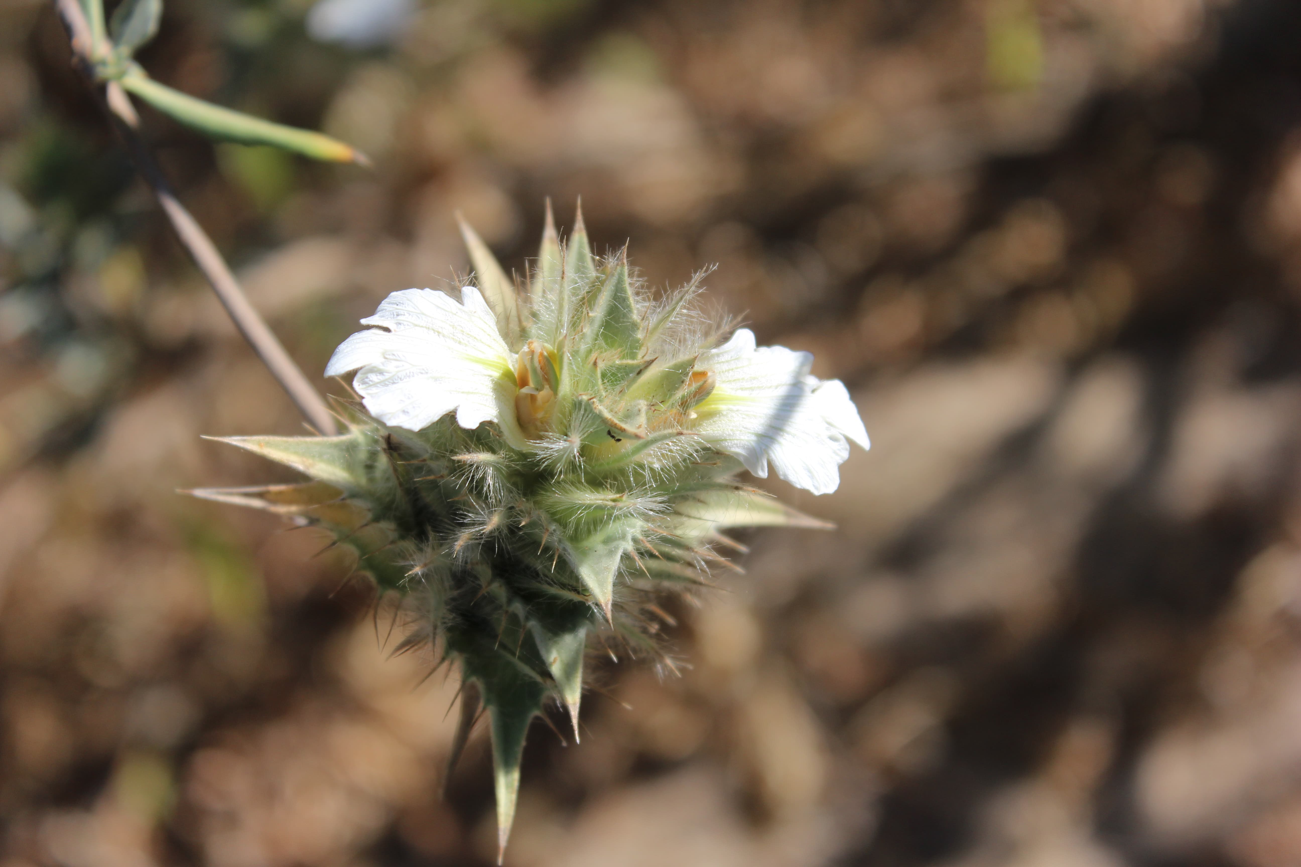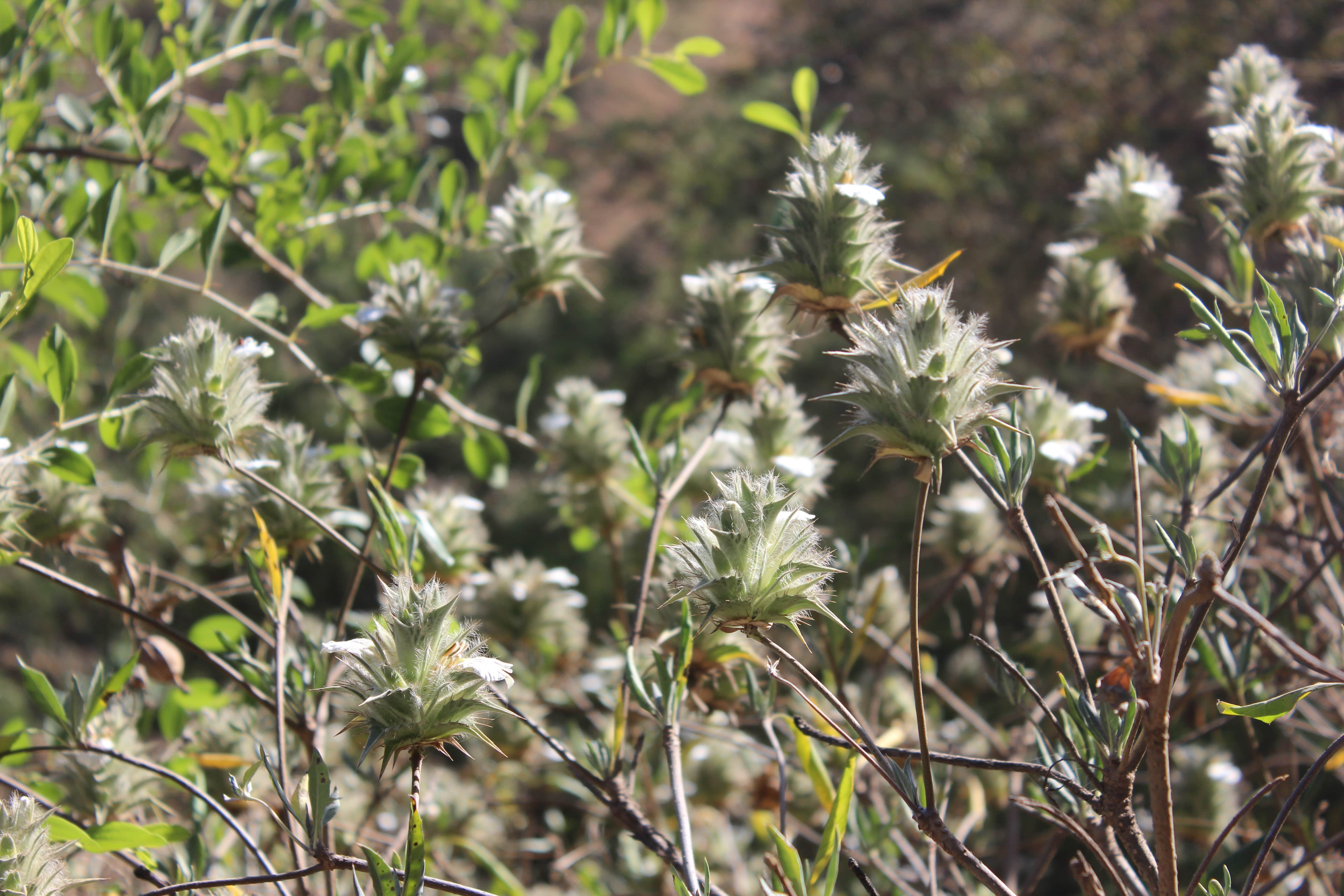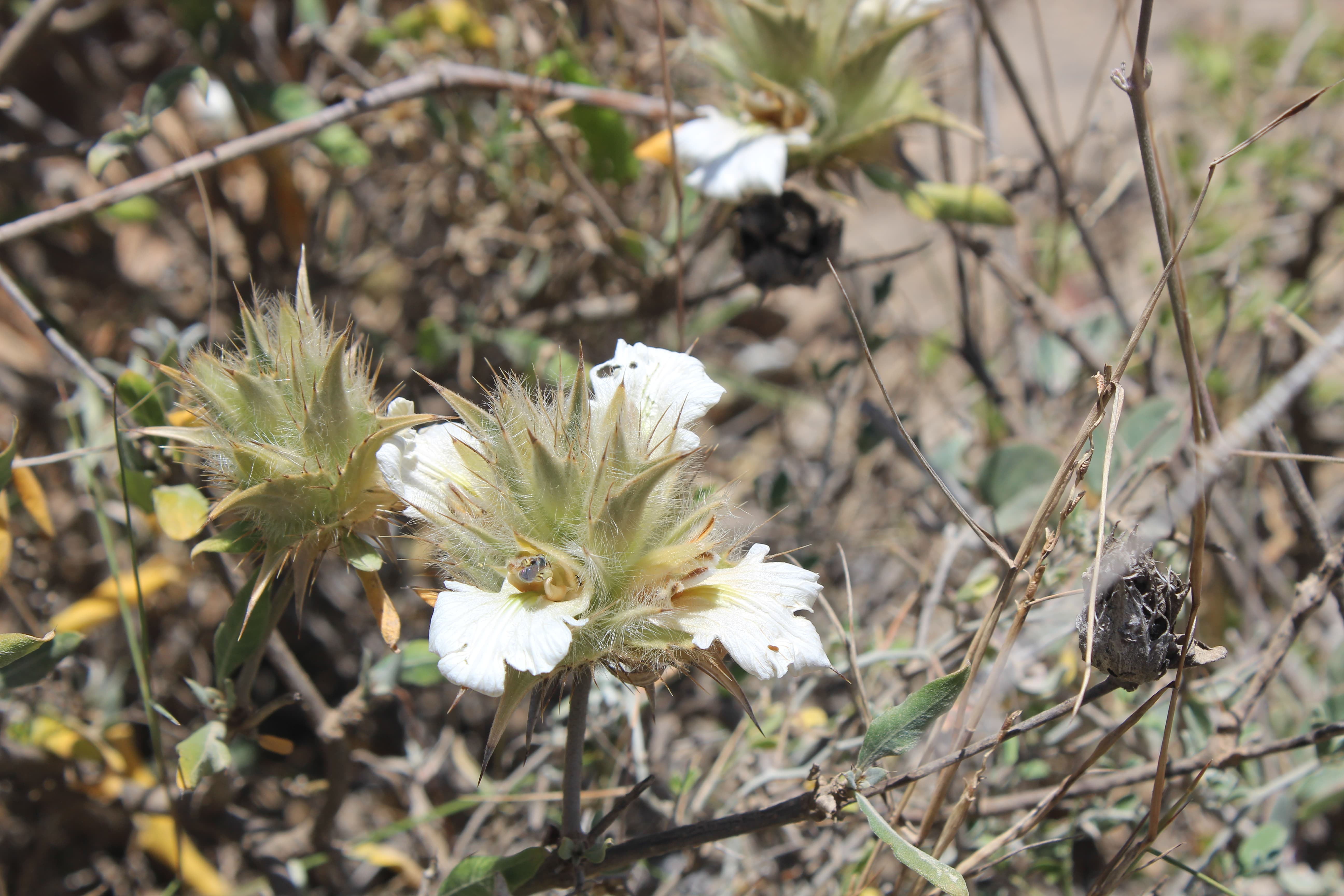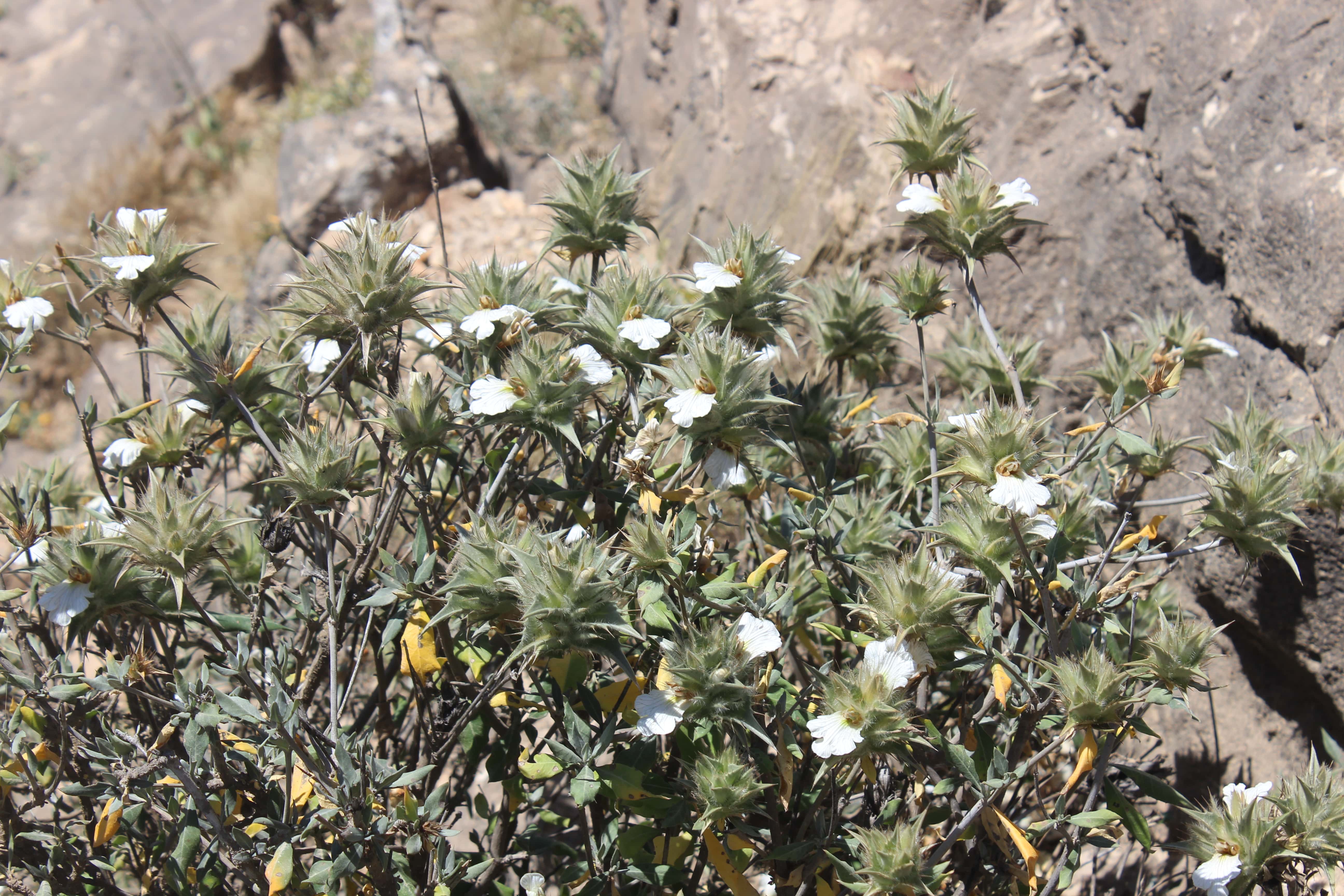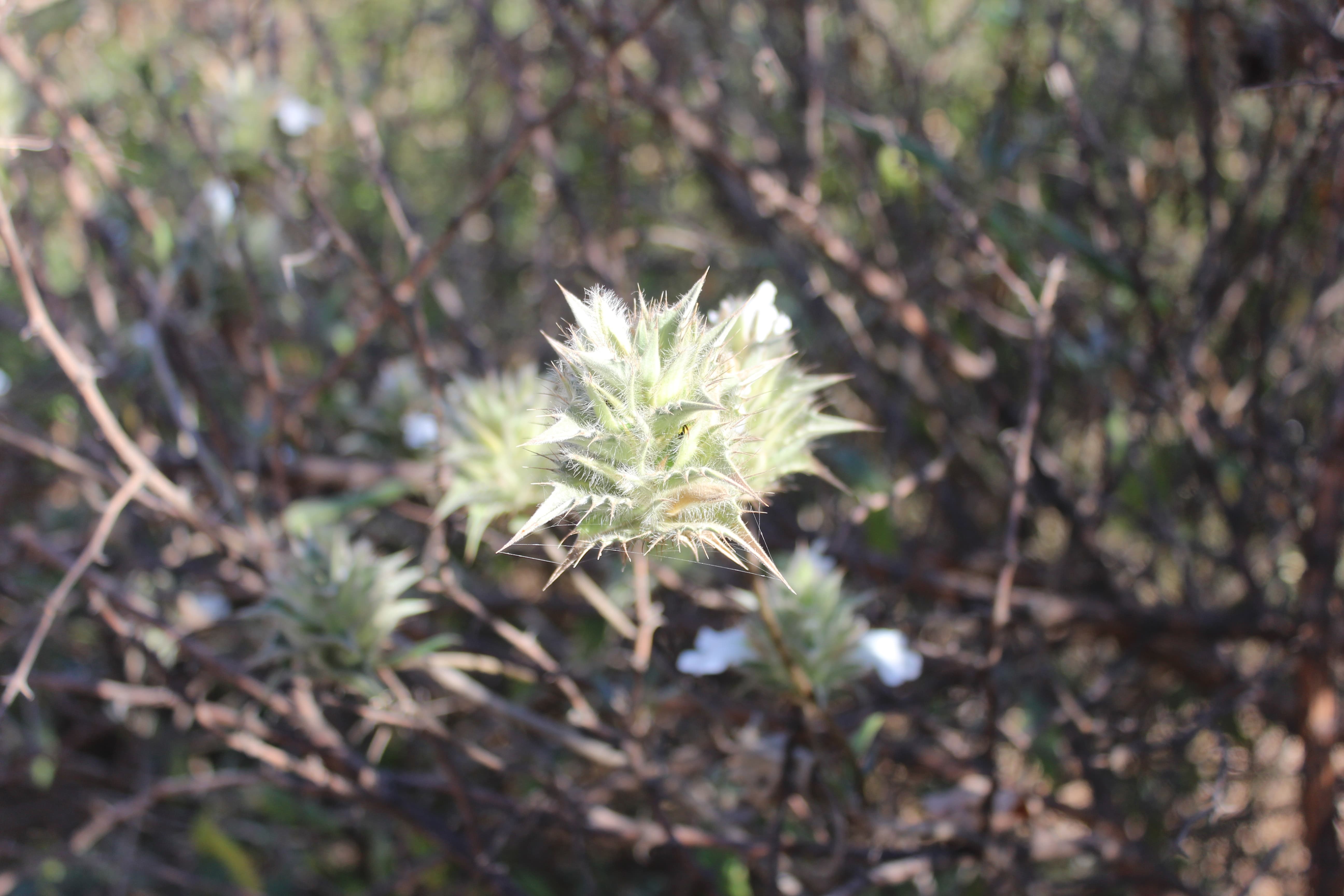 A large shrub or small spindly tree ; up to 5 m tall . Stems much branched ; older wood grey with prominent lenticels , young wood reddish brown , thinly covered with appressed hairs . Leaves opposite or arranged in whorls of four , 5–18 × 1–4 . 5 cm , narrowly elliptic , margins with a few weak spinules , apex spinulose , base sessile or attenuating into a short petiole bearing pair of spinules at the base . Inflorescences emerge from a large cluster of spiny bracts ; peduncle 6–15 cm ; bracts and bracteoles in the inflorescence obovate to rhomboid , spiny towards the apex , tip spiny , sericeous ; lower bracts sterile ; bracteoles 2 per bract . Flowers 8–10 , white ; calyx of 4 unequal lobes sericeous ; dorsal ± 32 × 10 mm , apex with 2 weak spines ; ventral similar to dorsal lobe , ending in one weak spine ; lateral ±16 × 6 mm , ovate ; corolla white , 1-lipped , 40–45 mm , unequally 5-lobed , the central lobe largest ; tube