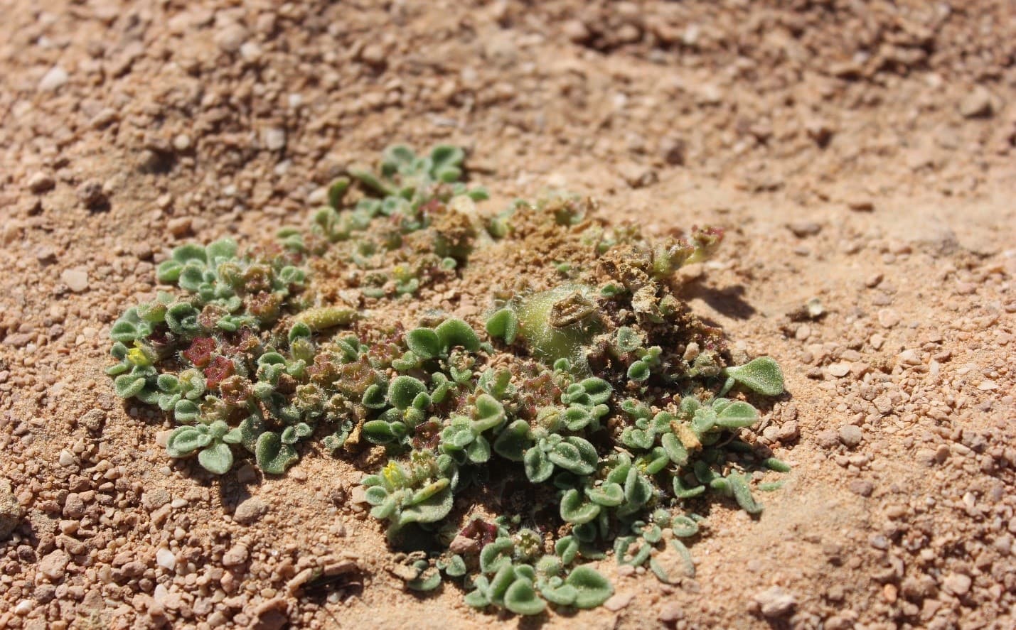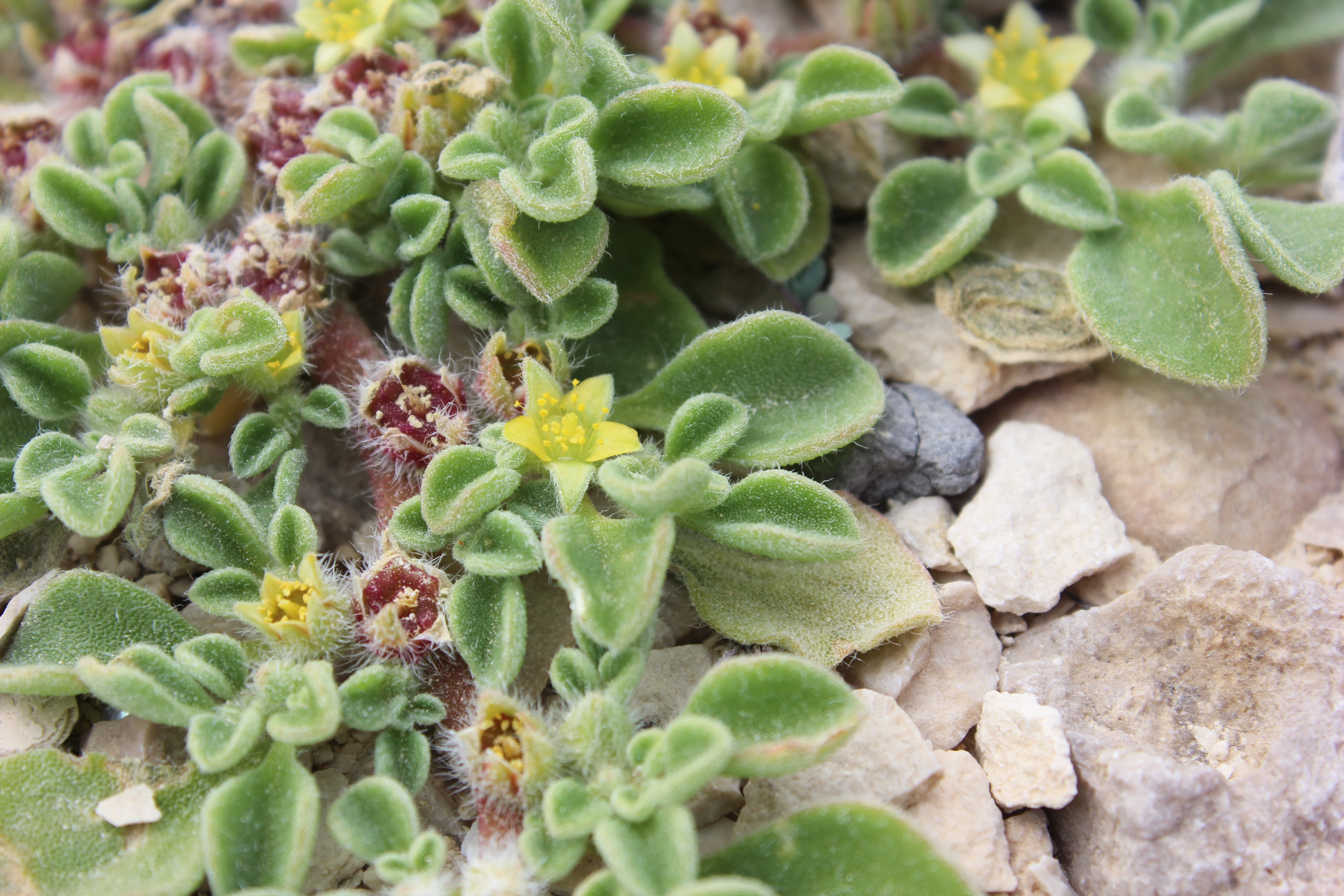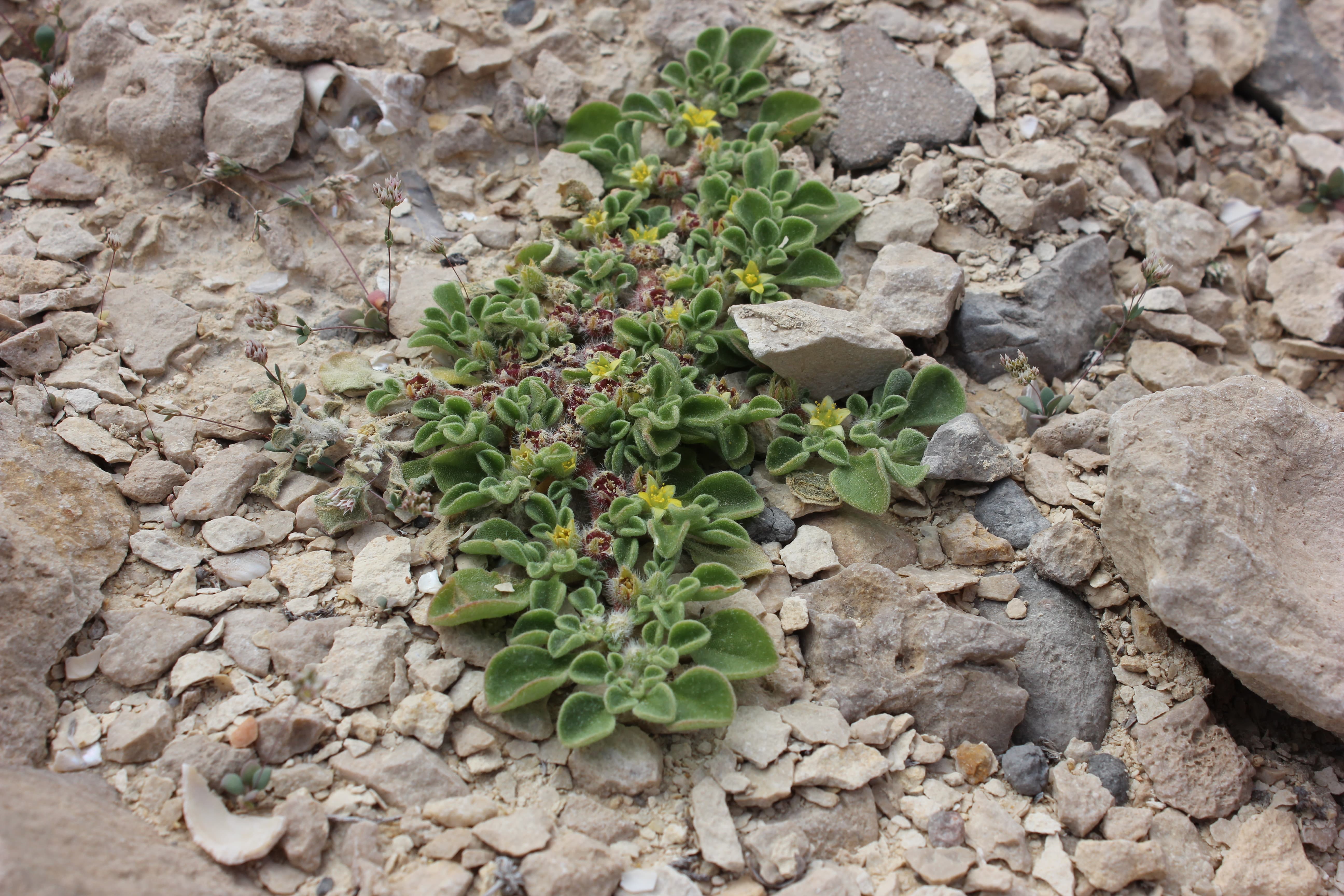 Annual or short-lived woody perennial herb ; up to 20 cm high , densely to thinly pilose . Stems prostrate , with zig-zagging branches radiating out from the centre . Leaves alternate or subopposite , 10–30 x 5–11 mm , fleshy , bright green , spatulate , apex rounded to subacuminate , base attenuating into the petiole , margin entire ; petiole 5–14 mm . Inflorescences borne in forks of branches , solitary , sessile . Flowers tiny , greenish or yellowish with a yellow centre , up to 4 mm wide ; sepals 3–5 mm , 5-lobed , with a white-hyaline margin , pubes- cent ; petals absent ; stamens many , arranged in groups (5 bundles) . Fruit capsule , c . 5 mm in diameter , 5-angled , star-shaped , flattened at the top , valves not recurving on dehiscence , red or pink . Seeds many , reniform , concentrically ridged . (Ref . Flora of Oman ; vol . 1) .