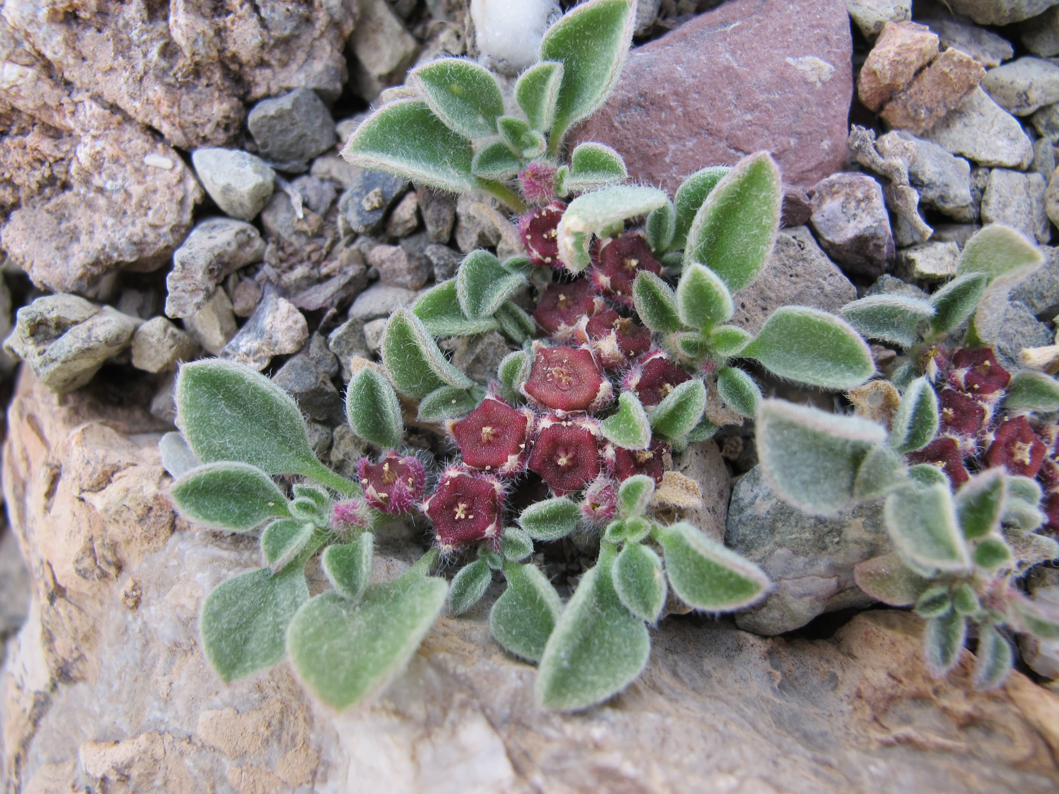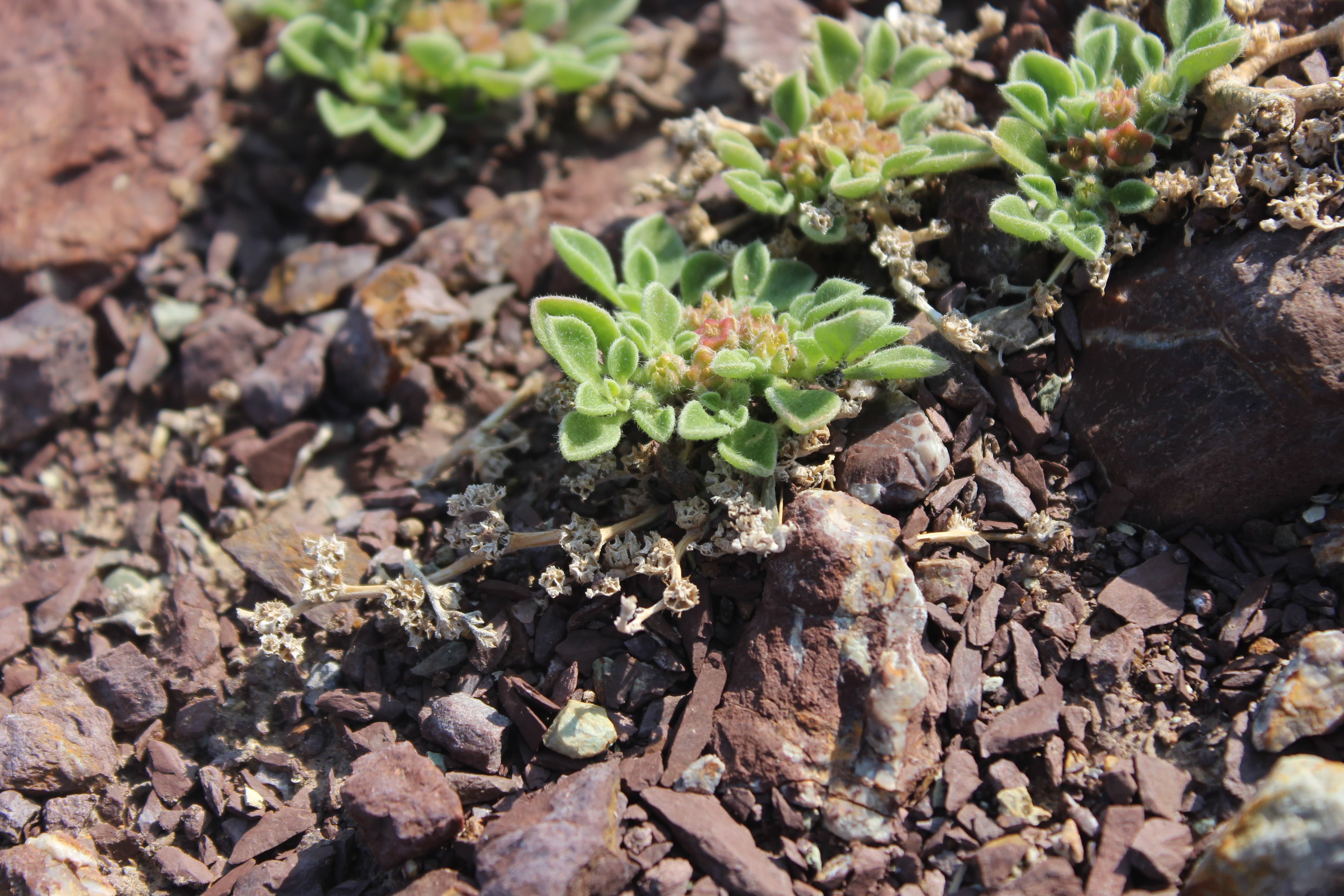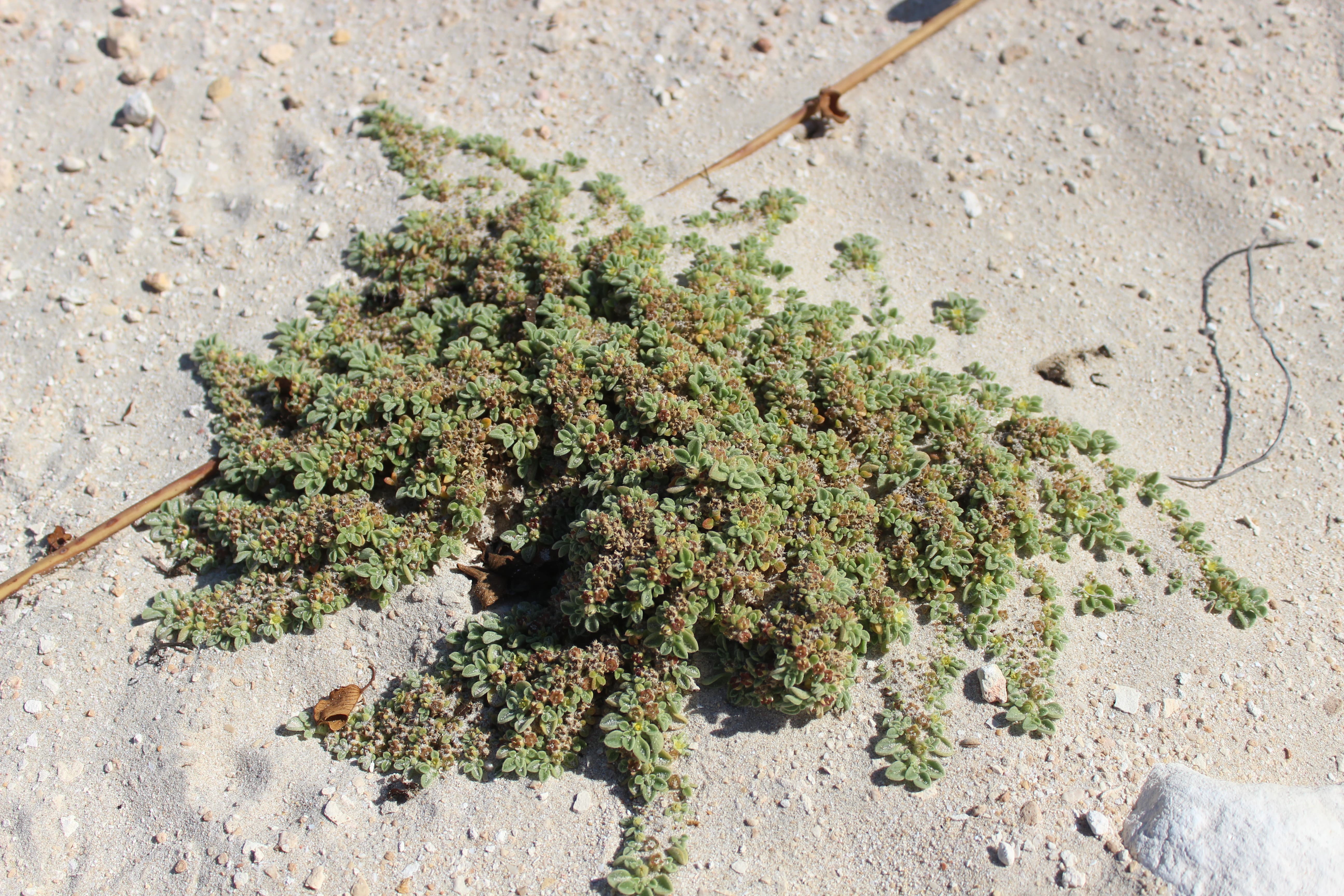 Annual or short-lived woody perennial herb ; up to 20 cm high , densely to thinly pilose . Stems prostrate , with zig-zagging branches radiating out from the centre . Leaves alternate or subopposite , 10–30 x 5–11 mm , fleshy , bright green , spatulate , apex rounded to subacuminate , base attenuating into the petiole , margin entire ; petiole 5–14 mm . Inflorescences borne in forks of branches , solitary , sessile . Flowers tiny , greenish or yellowish with a yellow centre , up to 4 mm wide ; sepals 3–5 mm , 5-lobed , with a white-hyaline margin , pubes- cent ; petals absent ; stamens many , arranged in groups (5 bundles) . Fruit capsule , c . 5 mm in diameter , 5-angled , star-shaped , flattened at the top , valves not recurving on dehiscence , red or pink . Seeds many , reniform , concentrically ridged . (Ref . Flora of Oman ; vol . 1) .