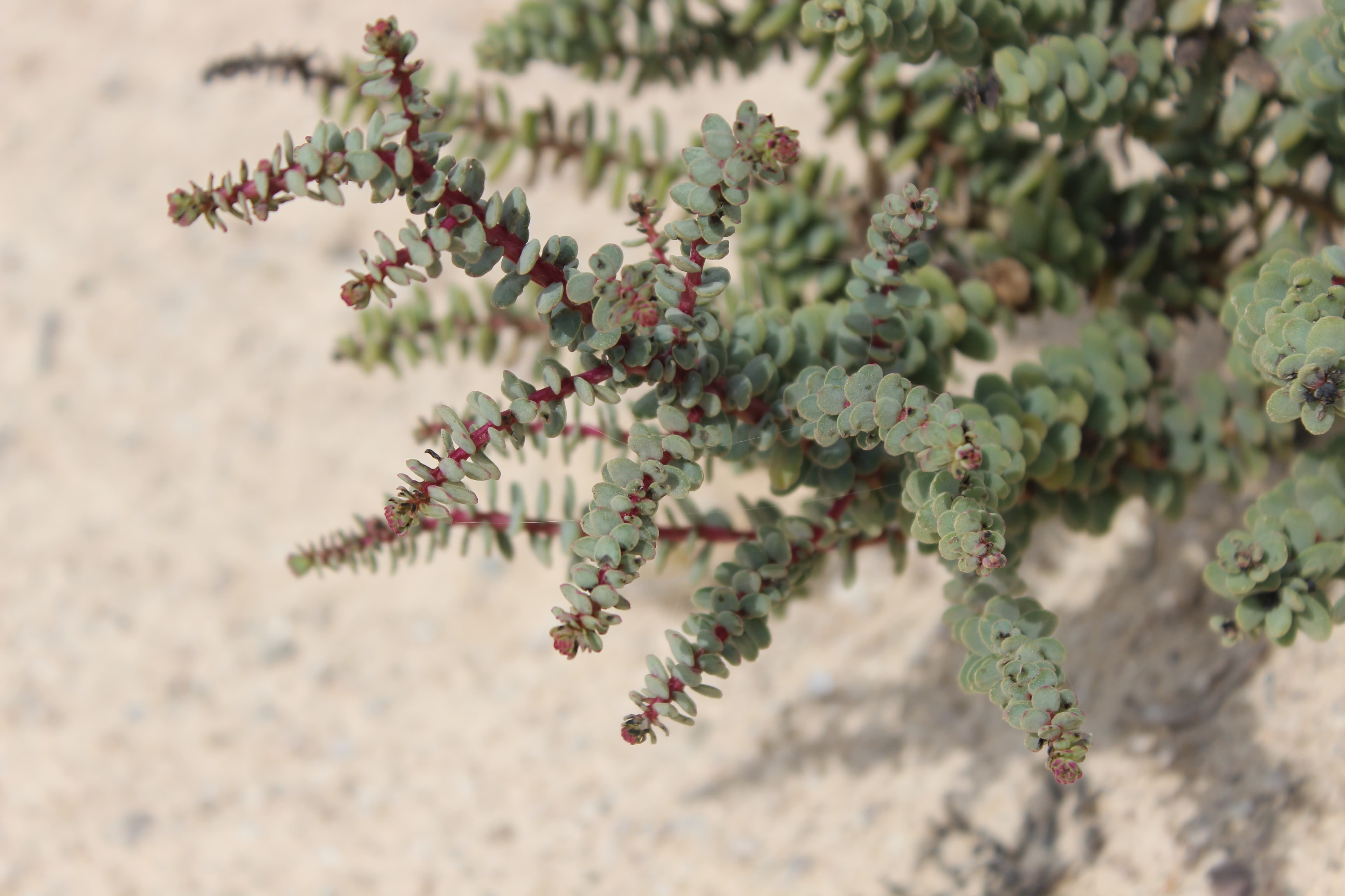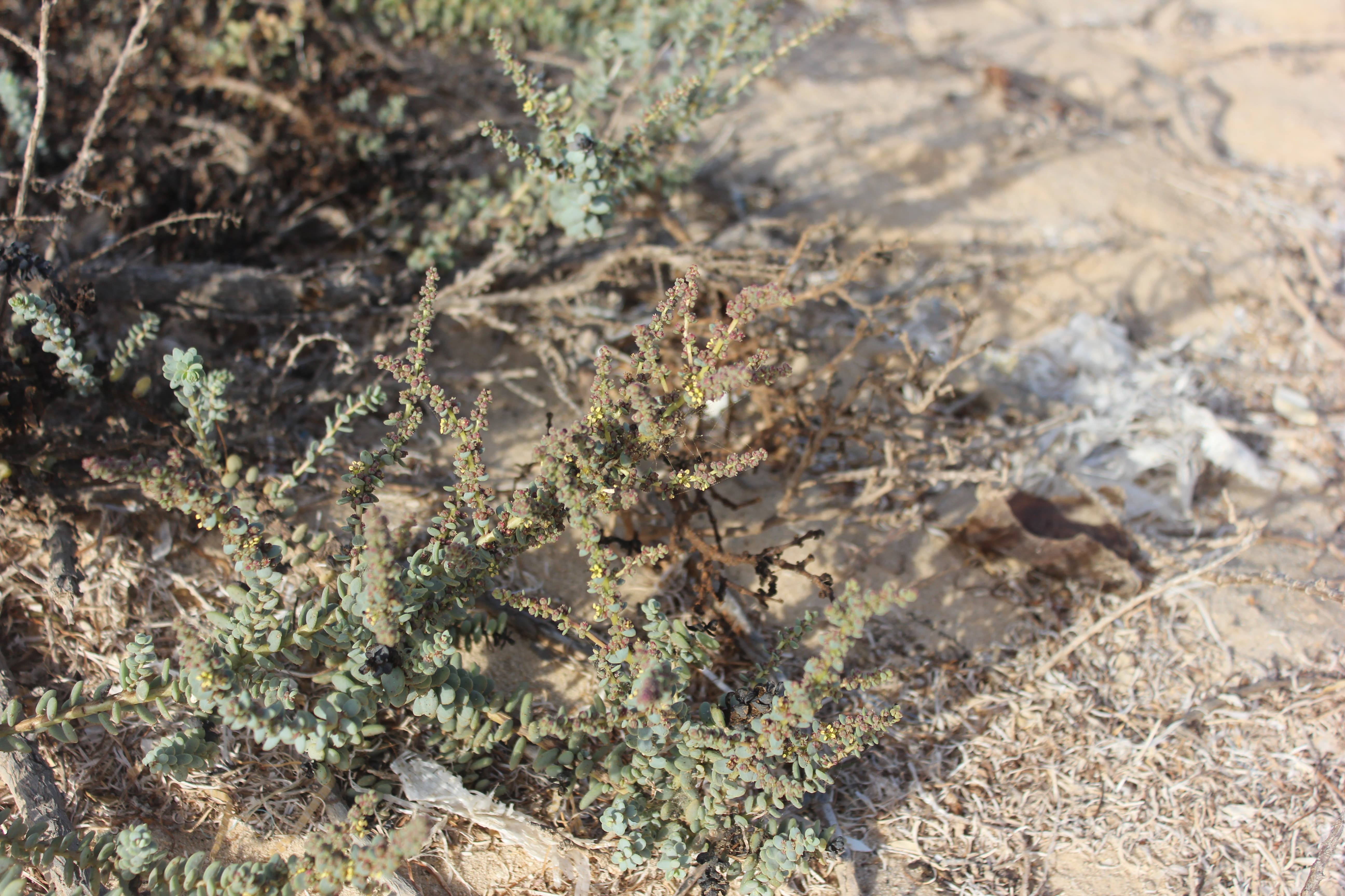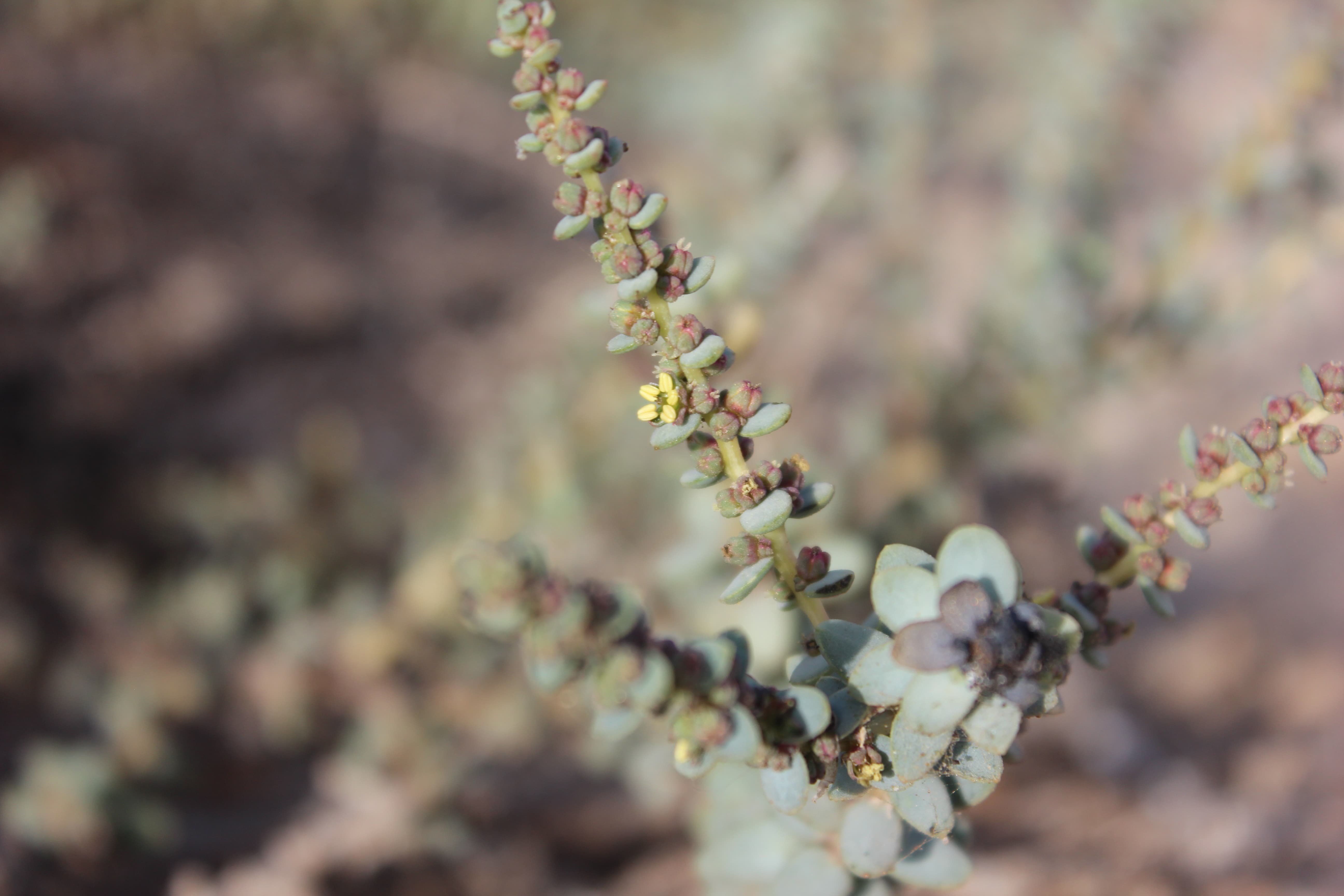 Succulent shrub ; up to 20-50(-100) cm tall . Stems erect to ascending to decumbent , woody at the base , much-branched ; young branches often reddish . Leaves 5–15 x 3–8 mm , sessile , spirally arranged , broadly ovate to suborbicular , succulent , flattened or semi-globose , decreasing in size upwards . Inflorescences solitary or in 2–3-flowered clusters forming terminal and lateral racemes , up to 10 cm ; bracts ±1 mm , scarious . Flowers sessile , bisexual , yellow , with a strong pungent disagreeable musky odour when fresh ; perianth segments 1–2 mm , fused below , yellow-green (drying black) , margins scarious ; stamens 2–3 . Fruit with free percarp . Seeds 0 . 75-1 mm , rounded . (Ref . Flora of Oman ; vol . 1) .