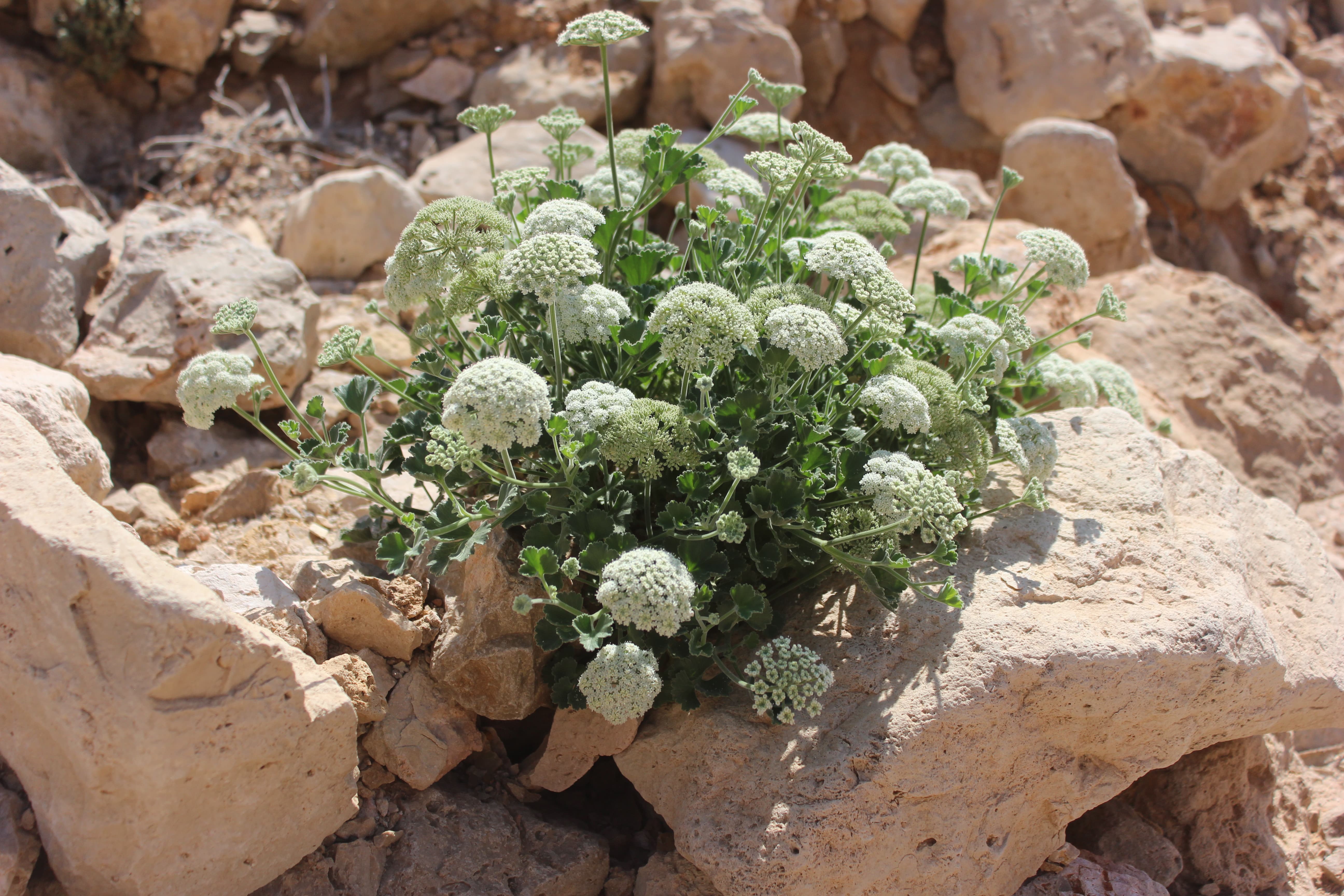 Erect annual herb ; up to 50 cm tall , sometimes with a woody root-stock . Stems several , arising from the base , grooved , grey-green , glabrous or pubescent . Leaves alternate , pinnately lobed ; leaflets 10-25 mm long , deeply segmented to lobed with lanceolate to linear segments , entire to coarsely dentate , pubescent ; petiole 2-10 cm , sheathing at the base , pubescent . Inflorescences in axillary and terminal umbels ; peduncles up to 3 cm , pubescent ; rays 4-10 ; bracts ± 4 mm , linear ; bracteoles ± 3 mm , linear . Flowers white ; calyx minute ; petals ± 1 mm ; stylopodium conical ; styles 2 , distinct . Fruit ± 2 mm , ovoid to subglobose , ridged , covered with glochidiate hairs . (Ref . Flora of Oman ; vol . 2) .