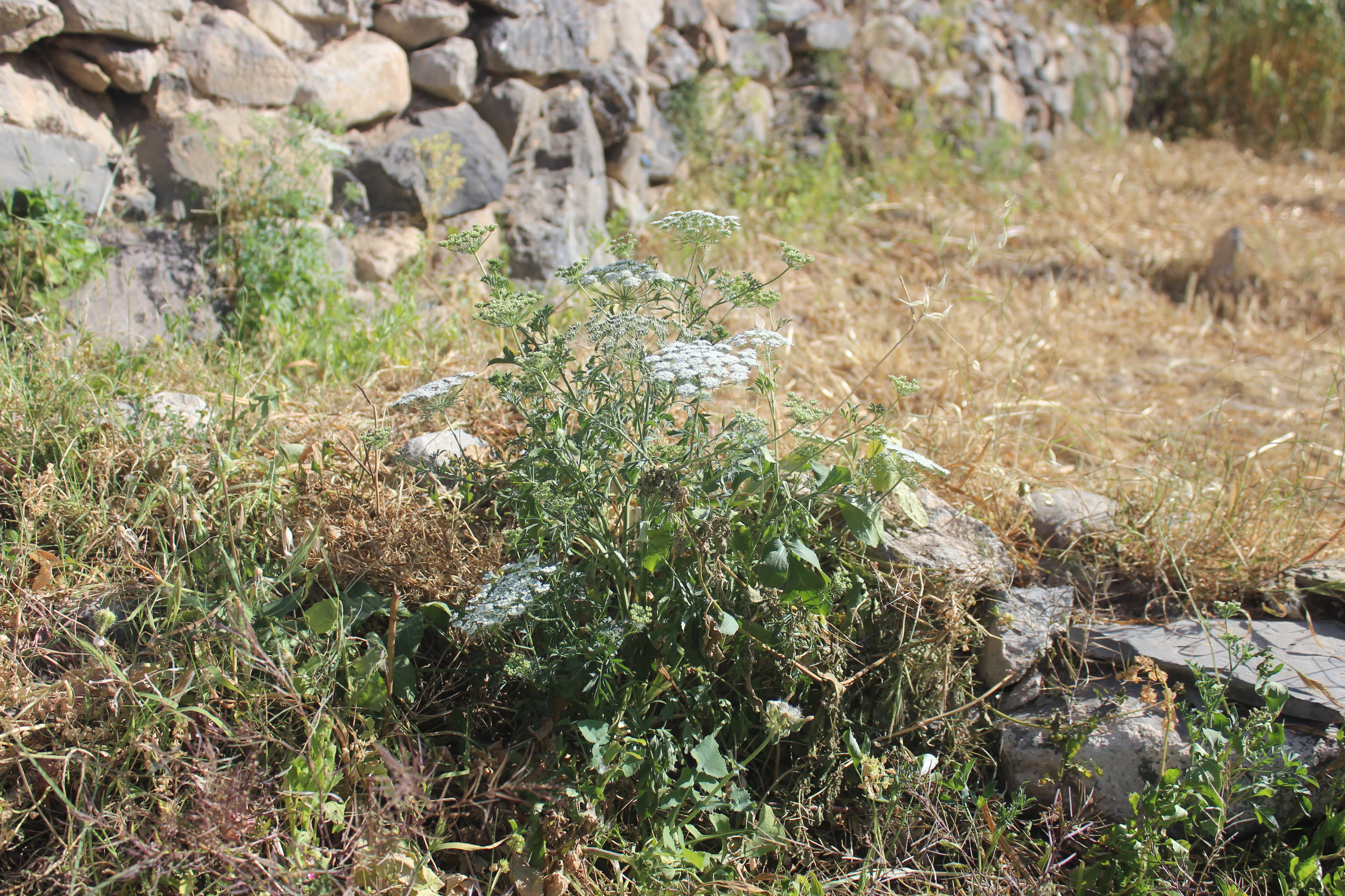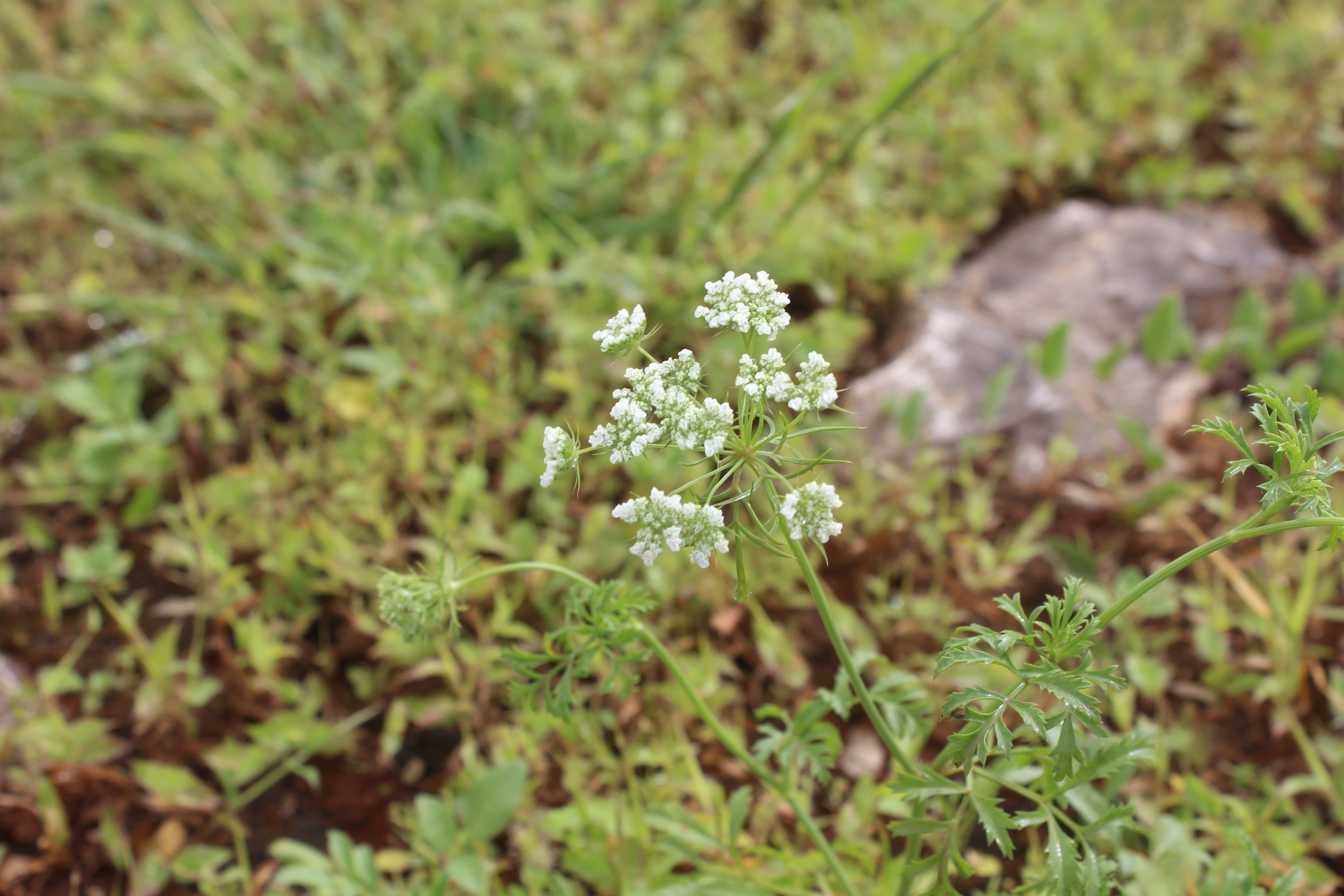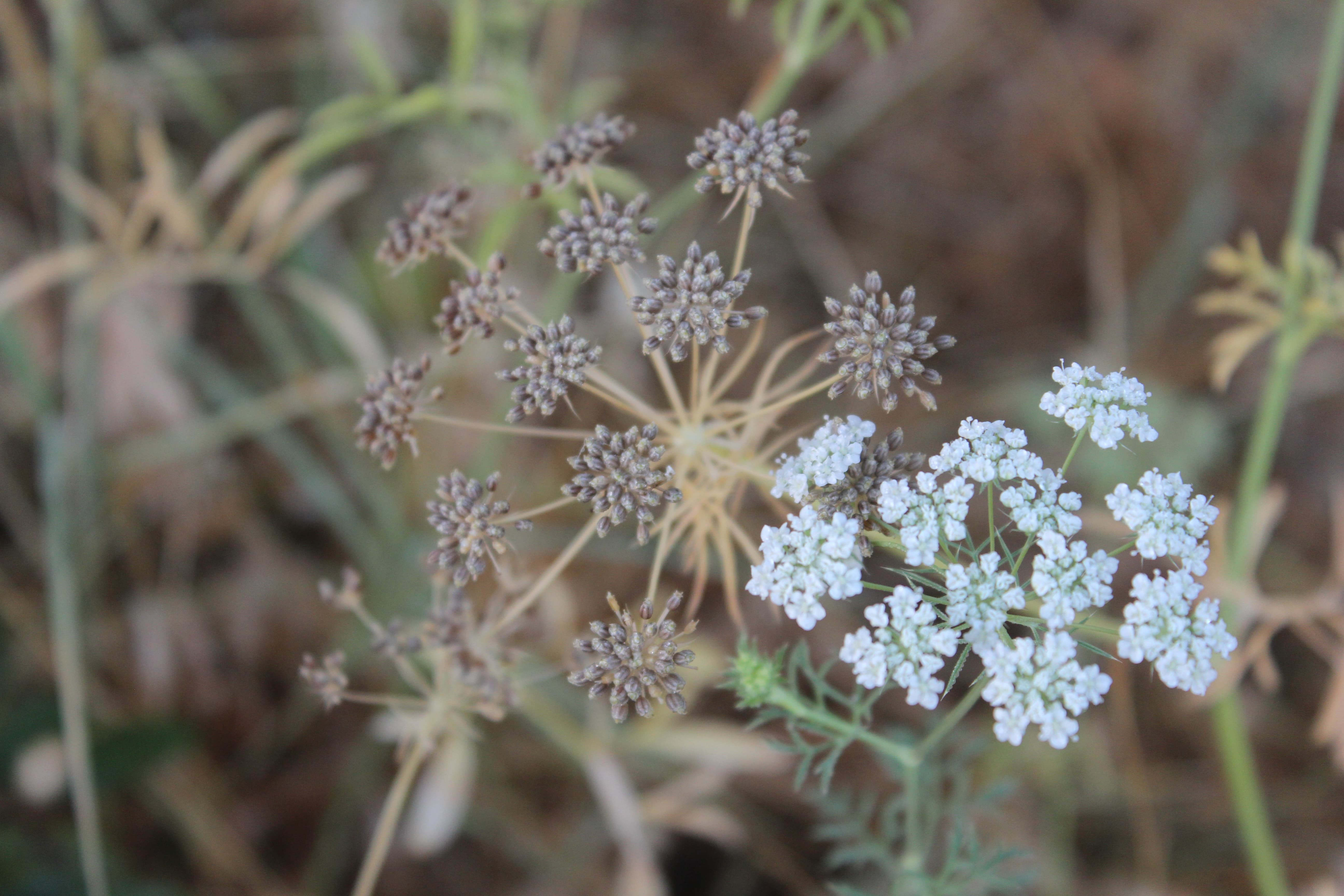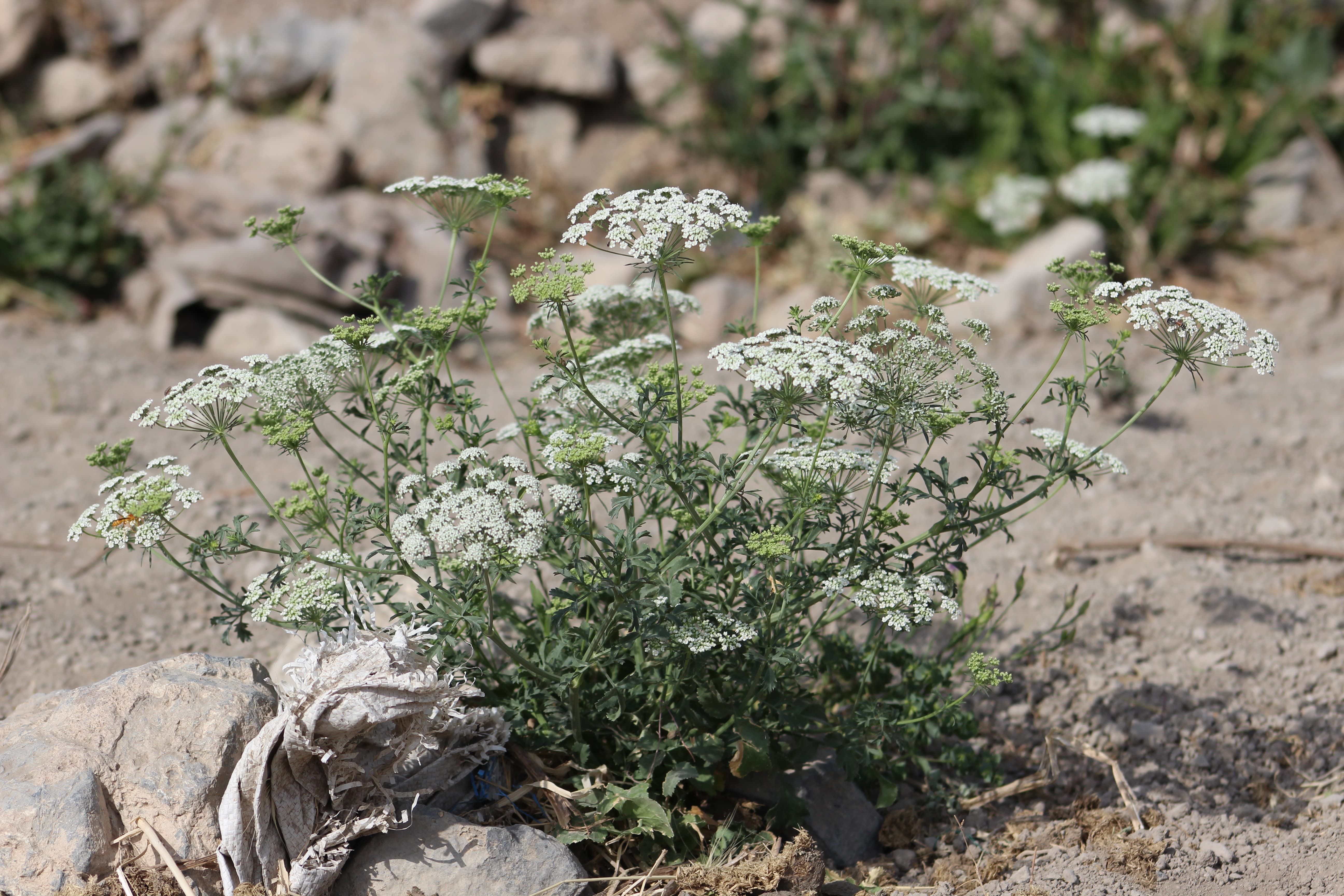 Erect annual herb ; up to 60(-100) cm high , glabrous . Stems erect to ascending , branched from base , grooved , terete , striate . Leaves alternate , pinnately dissected ; leaflets 10-15(-40) x 1-5(-25) mm , lobed at the apex , margin entire to serrate , glabrous ; petiole 10-15 mm , sheathing at the base . Inflorescences in axillary and terminal umbles ; peduncles 6-12 cm , glabrous ; rays 10-30 ; bracteoles of divided bracts with filiform segments . Flowers white ; calyx minute ; petals ± 1 mm ; carpophore bifid ; styles reflexed . Fruit ± 2 mm , flat , ovoid-oblong and bristly , glabrous . (Ref . Flora of Oman ; vol . 2) .