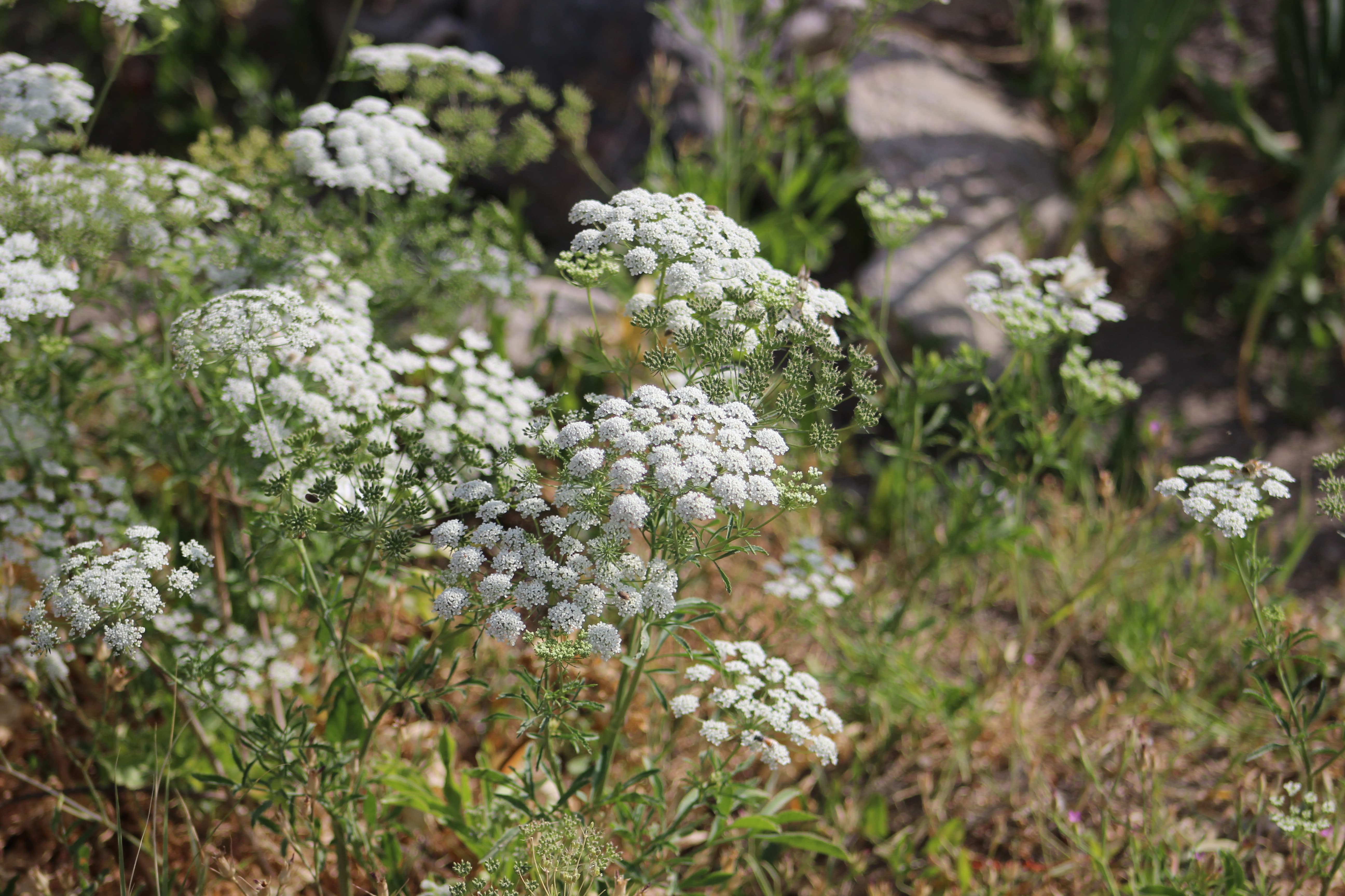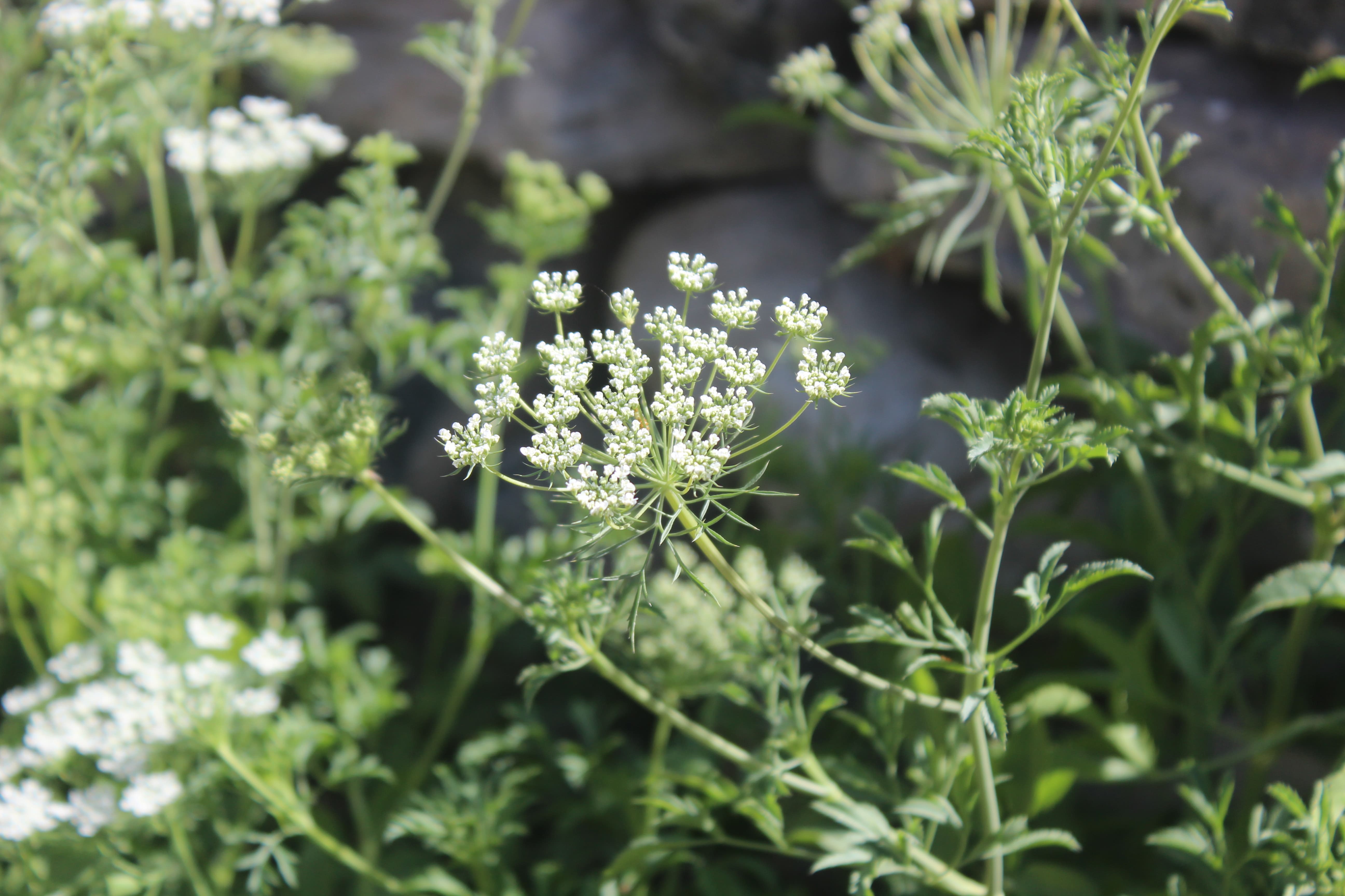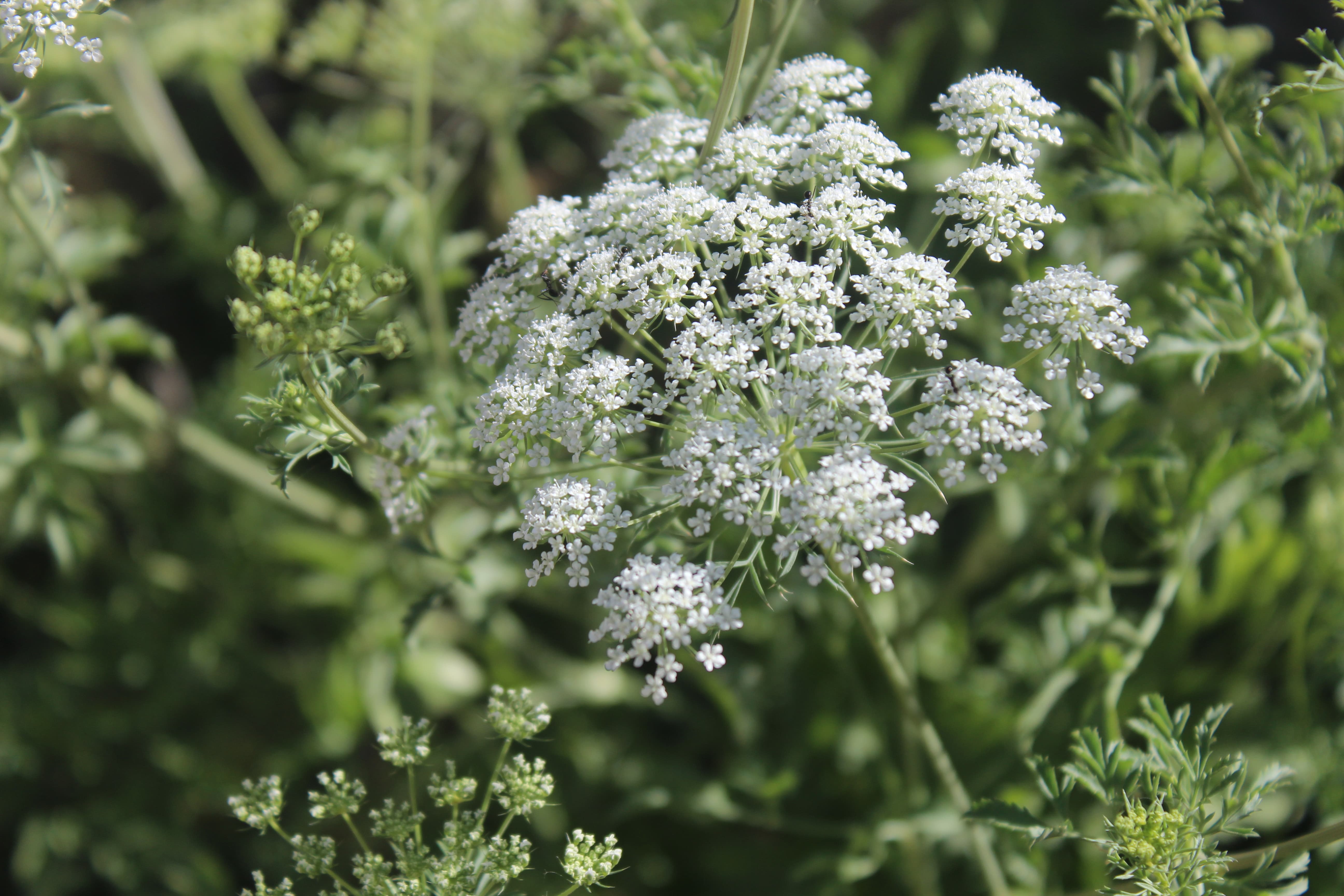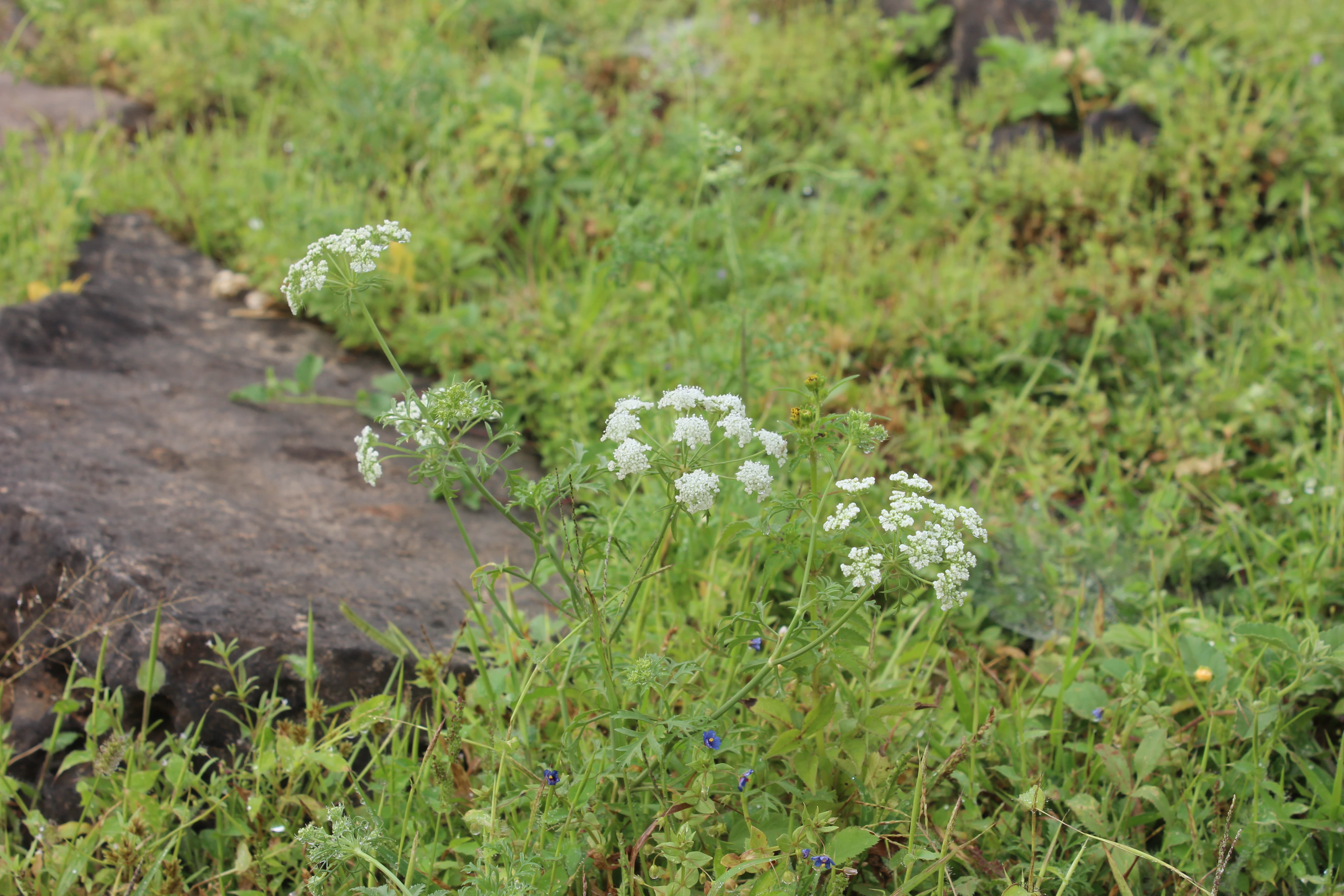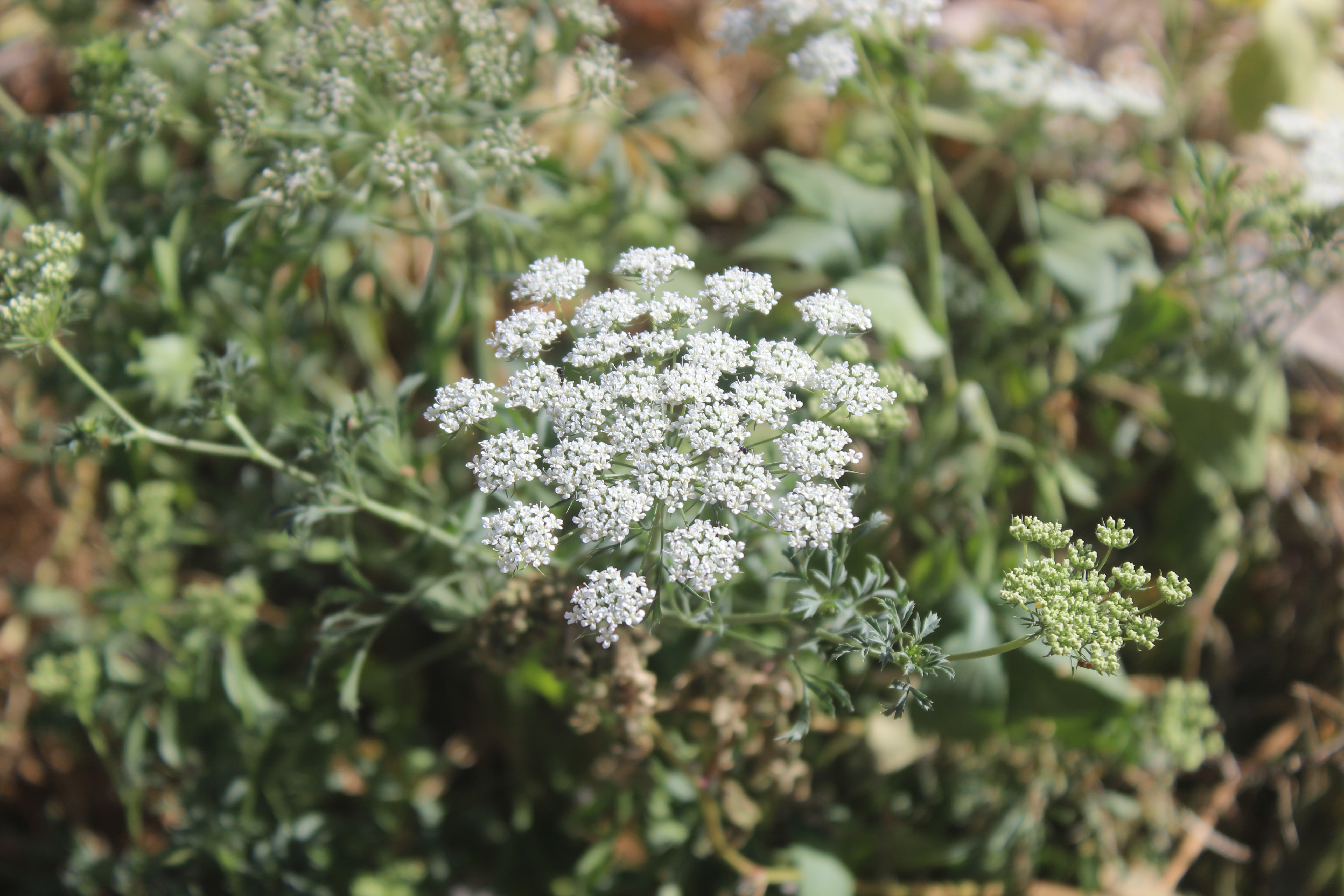 Erect annual herb ; up to 60(-100) cm high , glabrous . Stems erect to ascending , branched from base , grooved , terete , striate . Leaves alternate , pinnately dissected ; leaflets 10-15(-40) x 1-5(-25) mm , lobed at the apex , margin entire to serrate , glabrous ; petiole 10-15 mm , sheathing at the base . Inflorescences in axillary and terminal umbles ; peduncles 6-12 cm , glabrous ; rays 10-30 ; bracteoles of divided bracts with filiform segments . Flowers white ; calyx minute ; petals ± 1 mm ; carpophore bifid ; styles reflexed . Fruit ± 2 mm , flat , ovoid-oblong and bristly , glabrous . (Ref . Flora of Oman ; vol . 2) .
