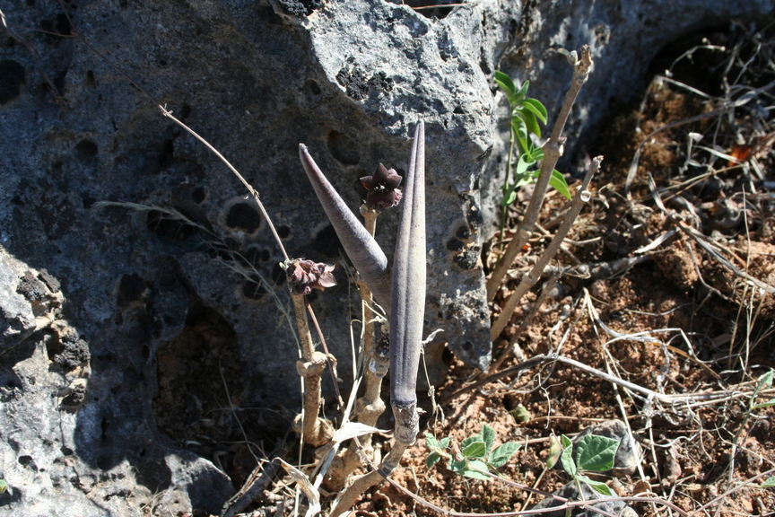 to centre of flower ; inner lobes at first erect with dorsal thickening and appressed to backs of anthers , then cylindrical and recurved away from centre of column , 1−2 mm long ; stigmatic surface covered with a thin membrane covering the short , grooved , rectangular anthers ; pollinia solitary in each anther cell . Fruit follicle , ± 6 cm , ovoid , only one developing . (Ref . Flora of Oman ; vol . 3) .