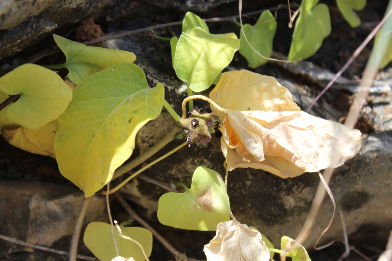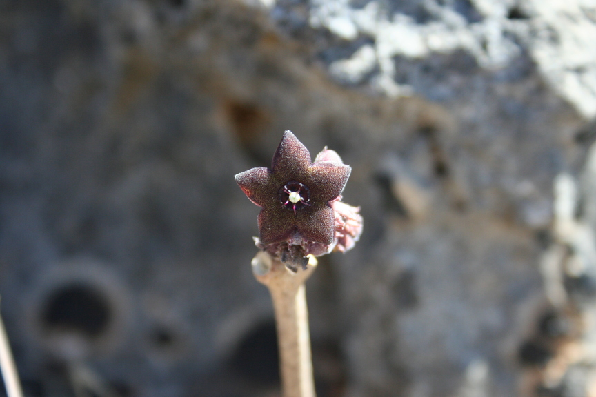 Prostrate or scrambling herb or shrub ; up to 1 . 5 m long , with a large swollen underground tuber . Stems trailing or sometimes twining , with milky sap . Leaves opposite , 4−15 x 2−10 cm , ovate to ovate-oblong , apex acute , base cordate to truncate , margins entire , somewhat undulate , densely pubescent below , thinly pubescent above ; petiole 1−6 cm long , thinly woolly . Inflorescences in axillary clusters , 15-25-flowered . Flowers fleshy , greenish to brownish or purplish with dark purple spots ; calyx 5-lobed to the base ; lobes 2 . 5−3 mm , linear-ovate , crisp pubescent ; corolla rotate , 5-lobed , 12−14 mm across ; lobes fleshy , spreading , 4−5 mm , triangular-ovate , greenish to brownish or purplish with dark purple spots , puberulous above , short tomentose below ; corona white , 3 mm across , in two series: outer lobes united into a 5-sided disc appressed to the surface of the corolla , an upward and inwardly pointing tooth arising from each lobe , lobes marked by a groove running from the margin