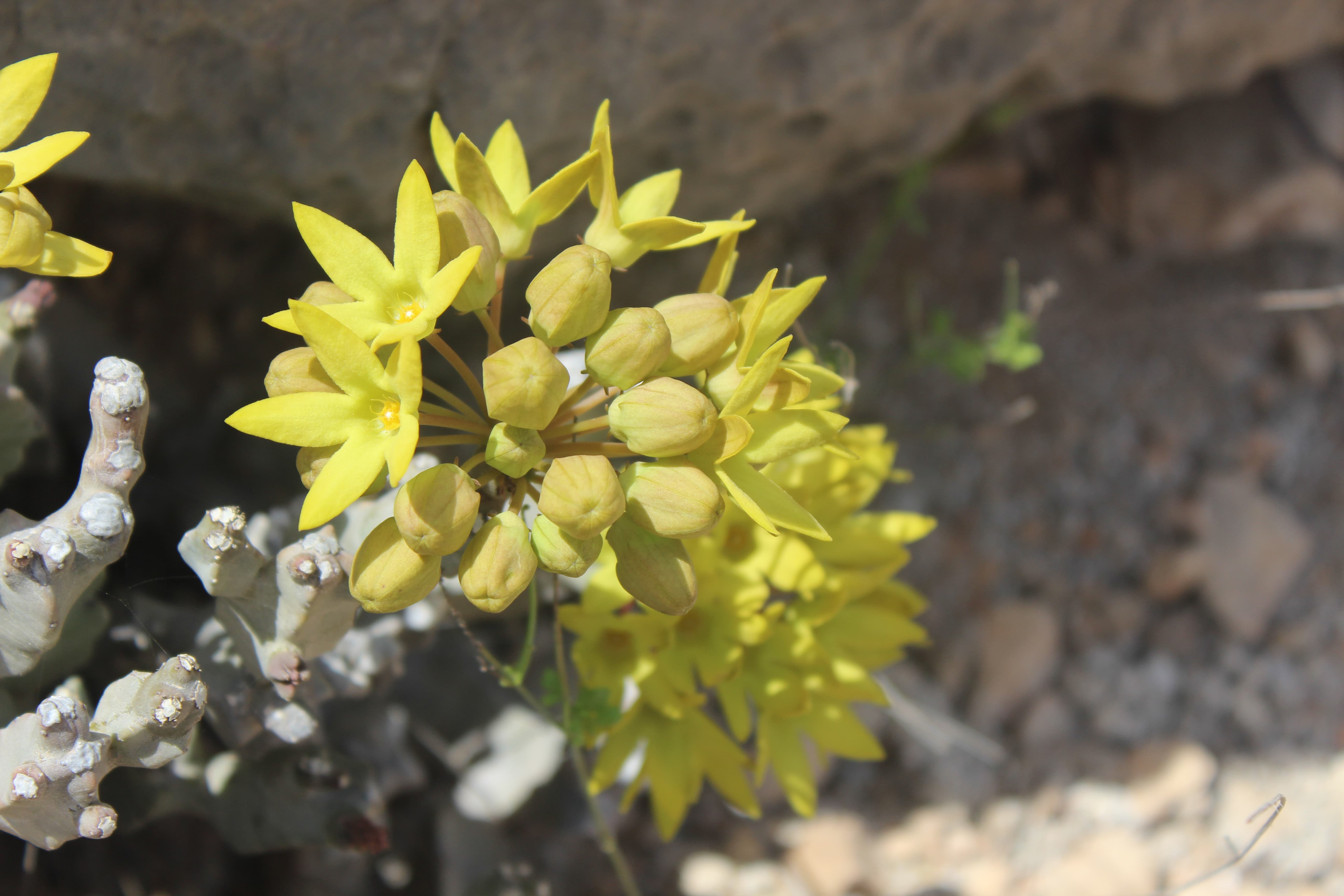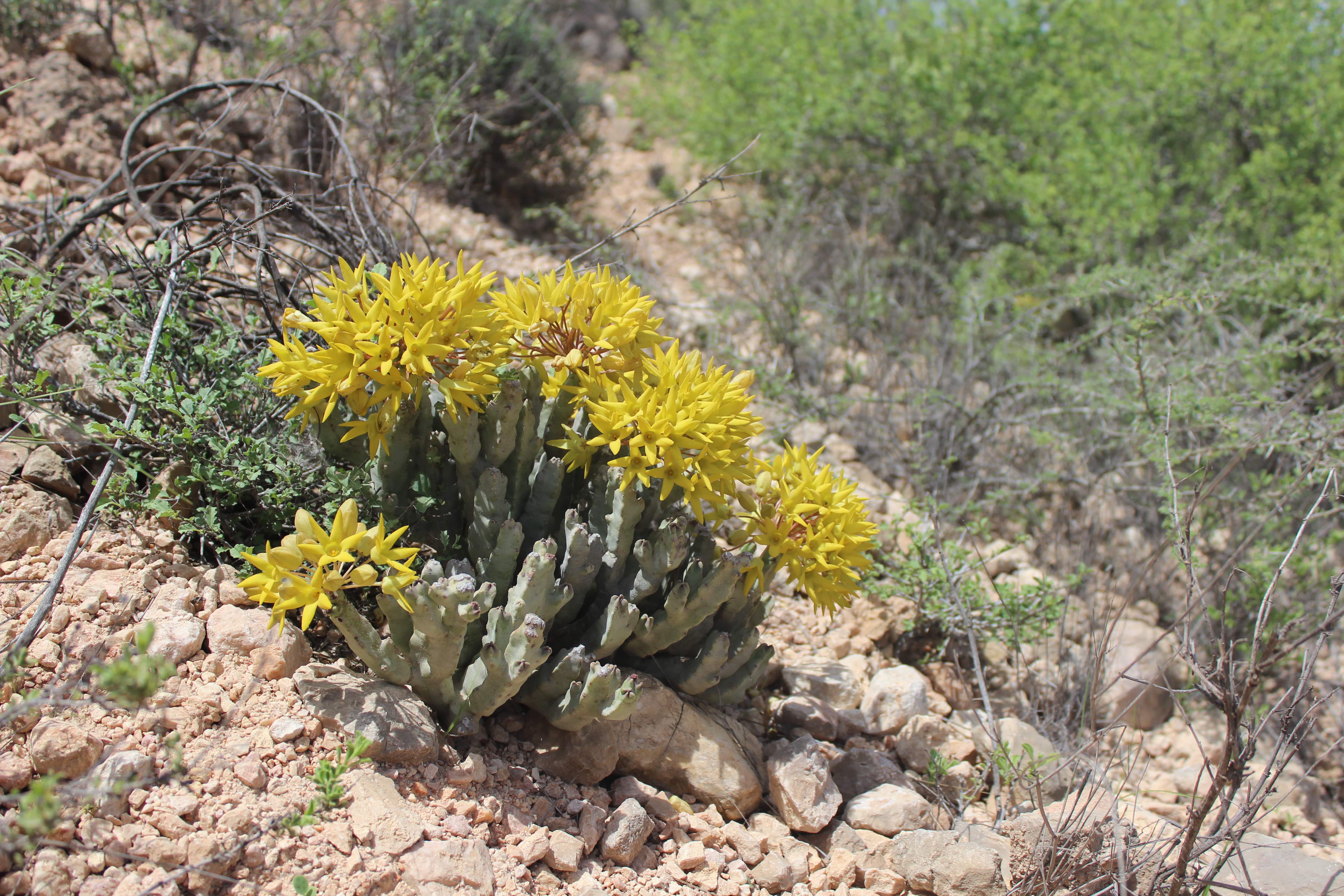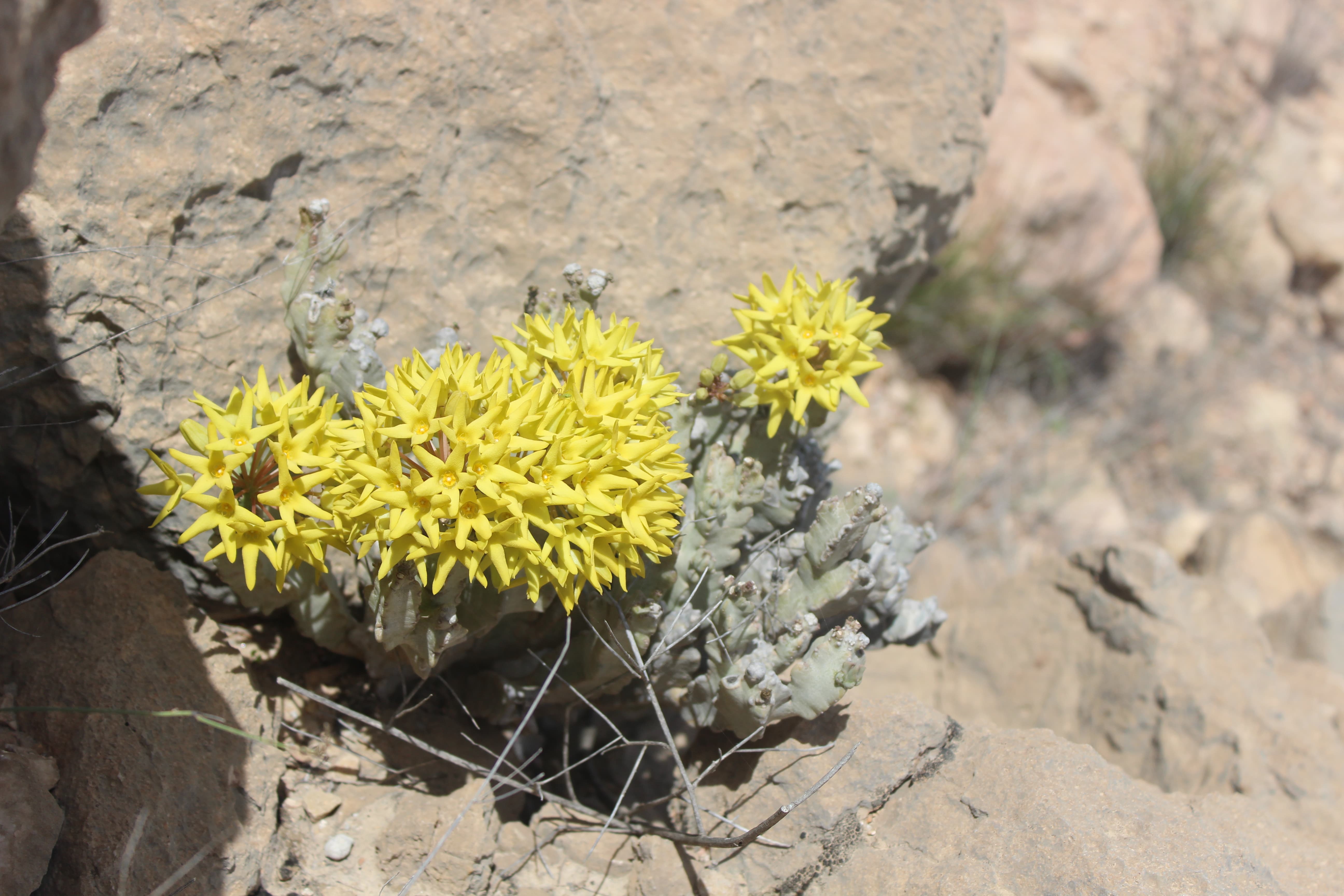 Clump-forming succulent perennial herb , up to 30 cm in height . Stems branching from the base , grey-green to purple-brown , 4-angled in cross-section , 15−20 mm across , angles irregularly triangular with often prominent white scars on the tips . Leaves absent . Inflorescences in apical umbellate , in clusters of 15 to 30 flowers ; pedicels 10−20 mm . Flowers bright yellow , unpleasantly strong smelling ; calyx 5-lobed almost to base , lobes 2−3 mm , narrowly triangular ; corolla bright to pale yellow , cup-shaped at base , 5-lobed ; lobes spreading , 10−13 mm , narrowly triangular ; corona in 2 series: outer corona lobes erect , bifid to the base with 2 narrow segments 3 mm long ; inner lobes obtuse ; pollinia solitary in each anther locule , ascending . Fruits follicles , 9−10 cm , paired , erect , narrowly ovoid , acute , glabrous , large , brown when mature . Seeds brown , with a tuft of white hairs at the tip . (Ref . Flora of Oman ; vol . 3) .