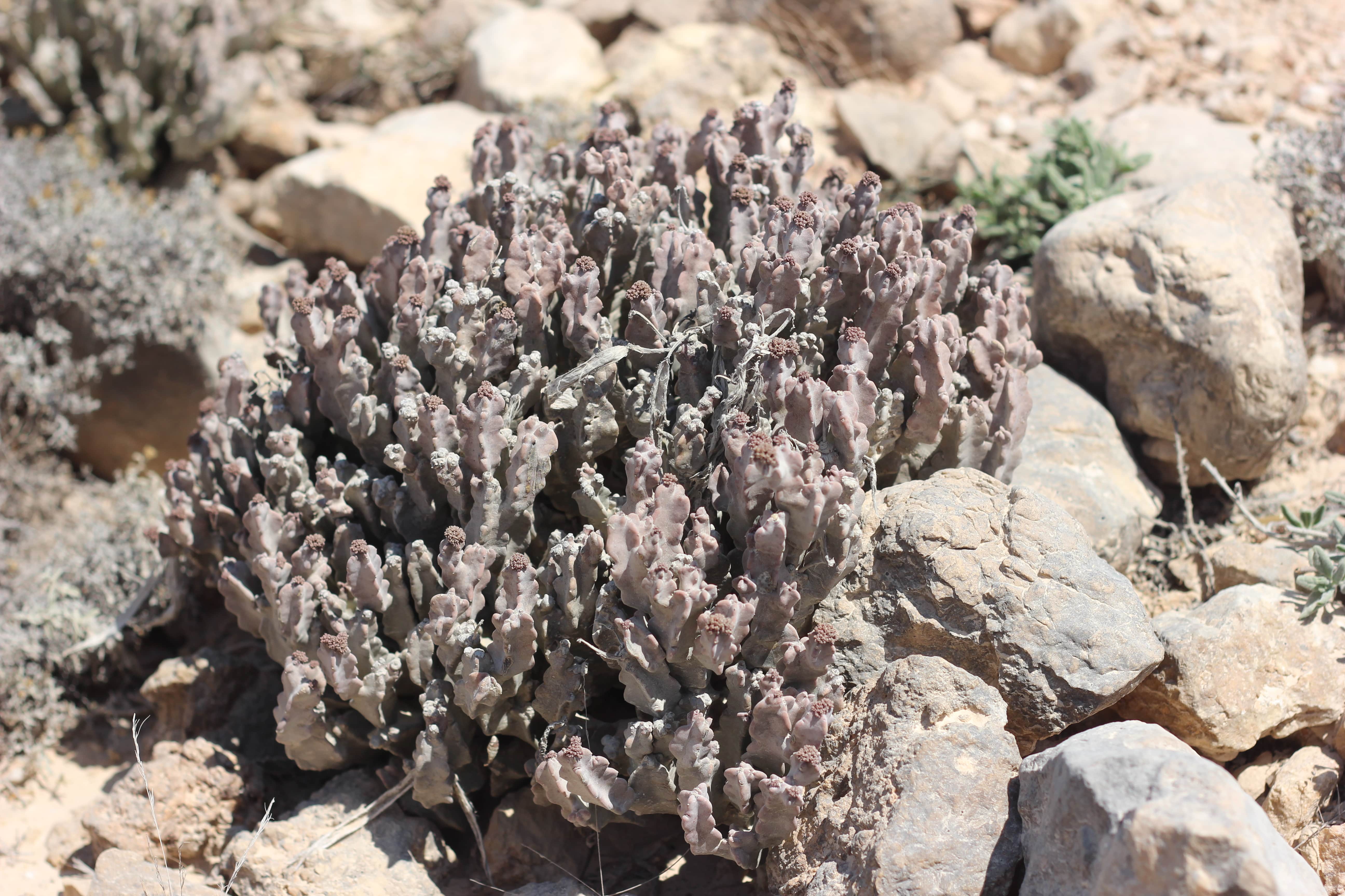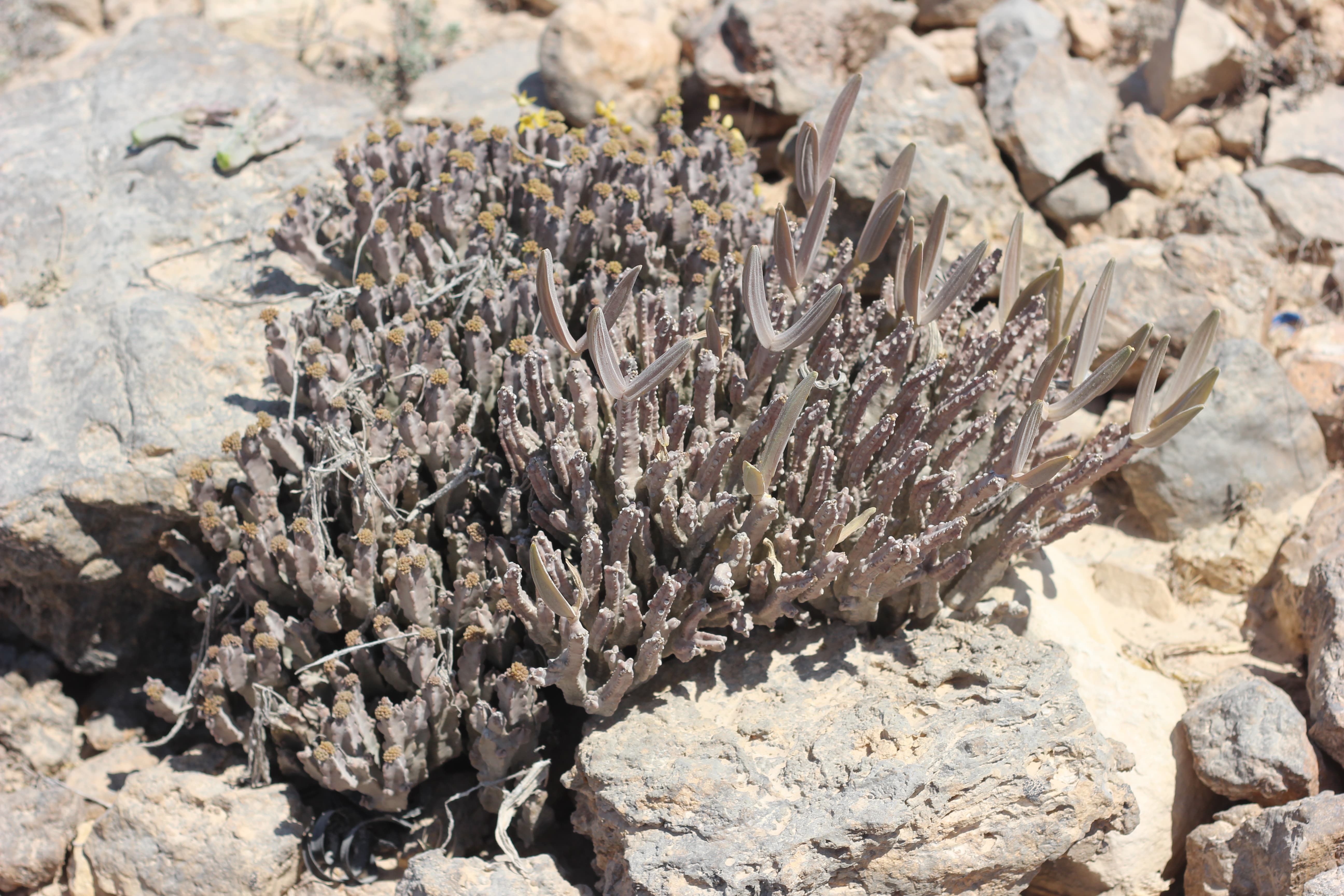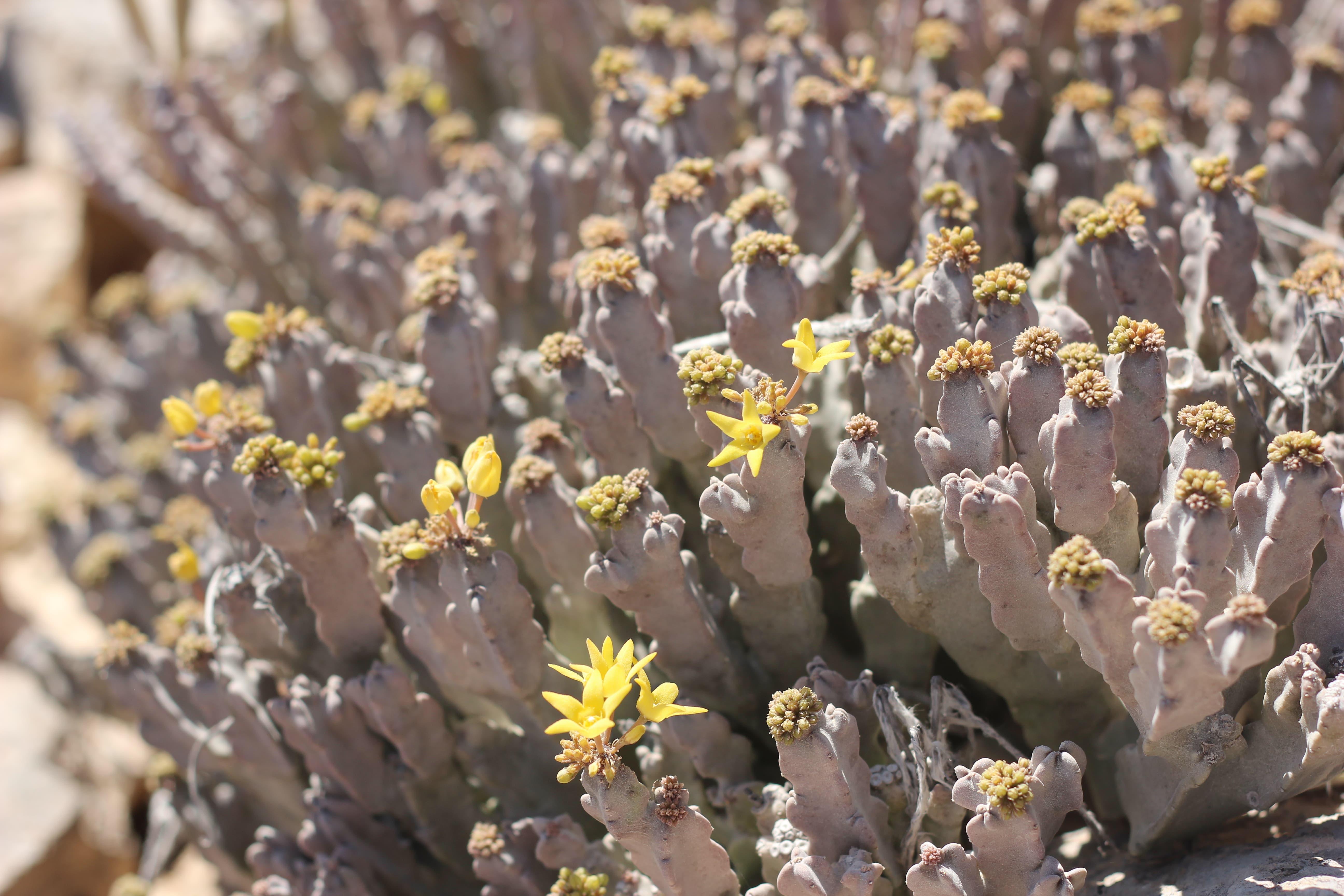 Clump-forming succulent perennial herb , up to 30 cm in height . Stems branching from the base , grey-green to purple-brown , 4-angled in cross-section , 15−20 mm across , angles irregularly triangular with often prominent white scars on the tips . Leaves absent . Inflorescences in apical umbellate , in clusters of 15 to 30 flowers ; pedicels 10−20 mm . Flowers bright yellow , unpleasantly strong smelling ; calyx 5-lobed almost to base , lobes 2−3 mm , narrowly triangular ; corolla bright to pale yellow , cup-shaped at base , 5-lobed ; lobes spreading , 10−13 mm , narrowly triangular ; corona in 2 series: outer corona lobes erect , bifid to the base with 2 narrow segments 3 mm long ; inner lobes obtuse ; pollinia solitary in each anther locule , ascending . Fruits follicles , 9−10 cm , paired , erect , narrowly ovoid , acute , glabrous , large , brown when mature . Seeds brown , with a tuft of white hairs at the tip . (Ref . Flora of Oman ; vol . 3) .