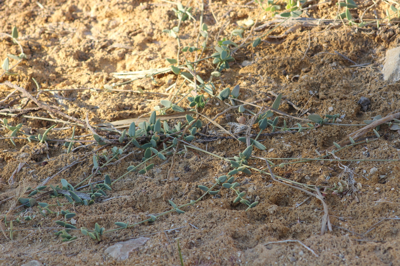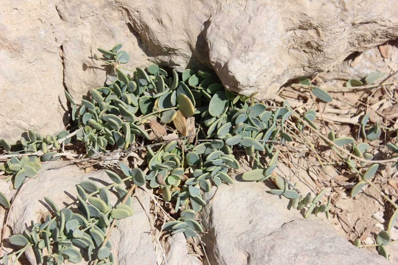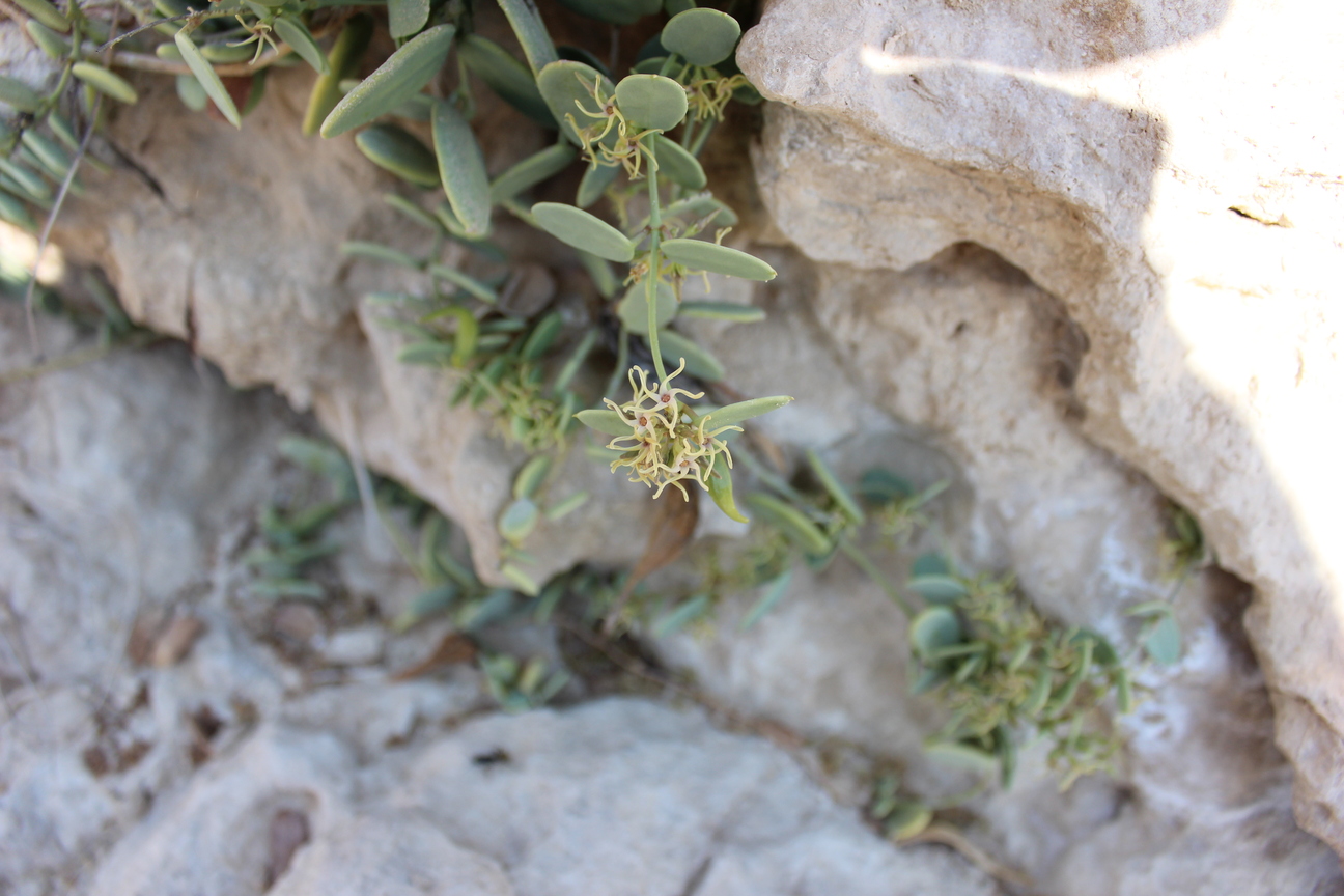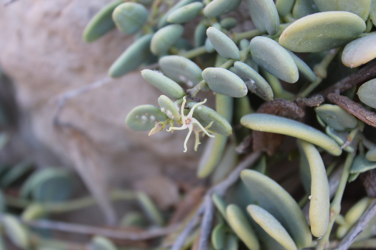 Perennial herb ; with clear latex . Stems creeping , yellowish-green , glabrous or glabrescent . Leaves opposite , 10–30 × 10−25 mm , petiolate , fleshy , broadly oblong to orbicular , apex obtuse with a mucro , base rounded to somewhat cordate , margins entire , grey-green , glabrous . Inflorescences 2–4 , in axillary clusters ; pedicel 2−3 mm . Flowers pale yellow to greenish-yellow ; calyx 5-lobed , lobes 2−3 mm , triangular , acute ; corolla pale yellow to greenish-yellow , with a narrow tube , obscuring the gynostegium , 5-lobed ; lobes 4−8 mm , linear-oblong , spreading , the ends spiralling , glabrous outside , densely minutely pubescent inside ; corona greenish , in one series , of 5 laterally compressed segments ± as long as the gynostegium , fleshy ; stamens united to form a column ; pollinia single in each anther locule , pendulous . Fruit follicles , solitary or rarely paired , ± 5 cm , ± erect , ovoid narrowing into an acute tip . Seeds flattened with a white tuft of hairs at the tip . (Ref . Flora of Oman ; vol . 3) .