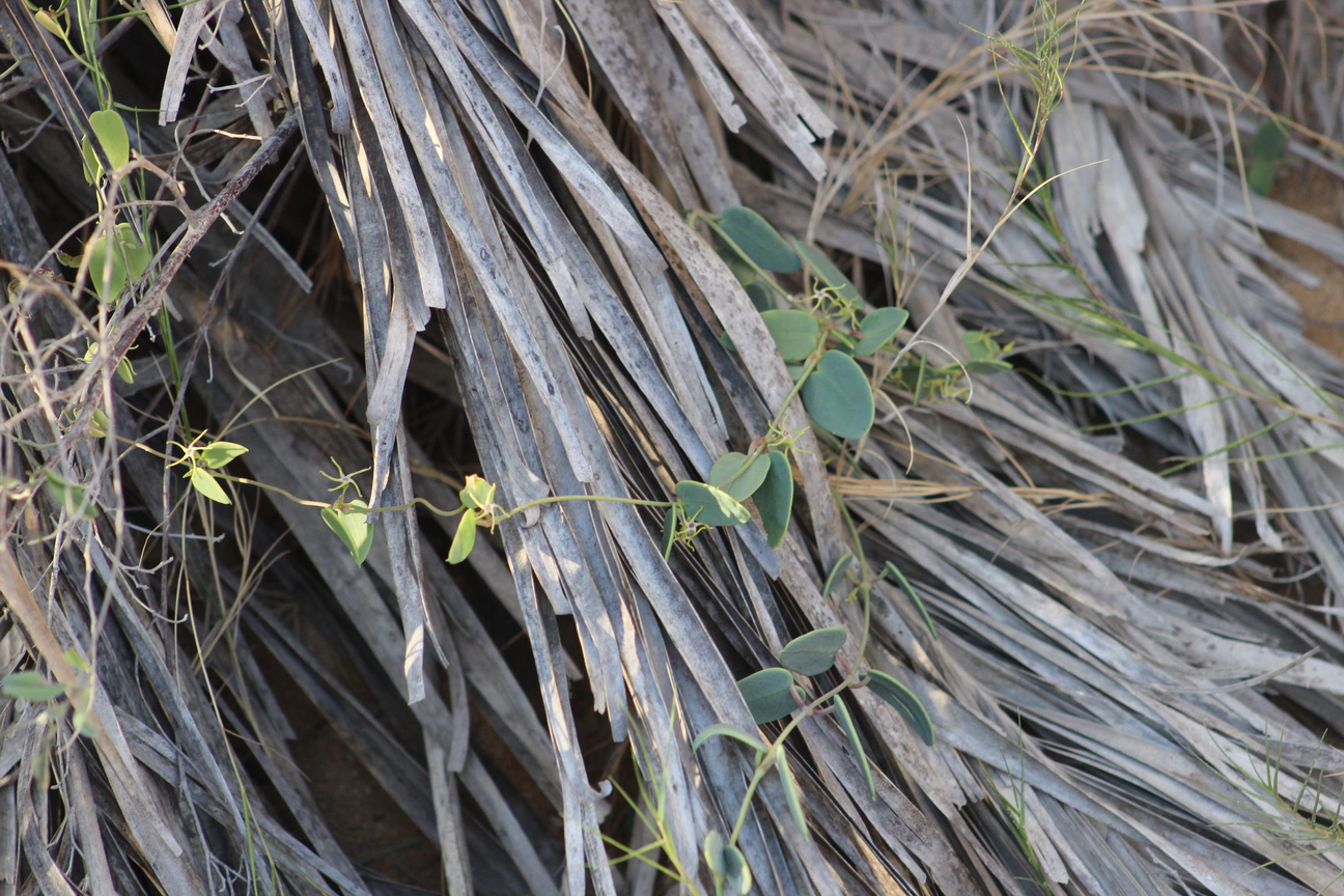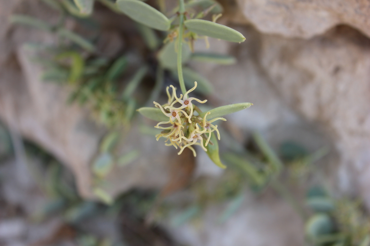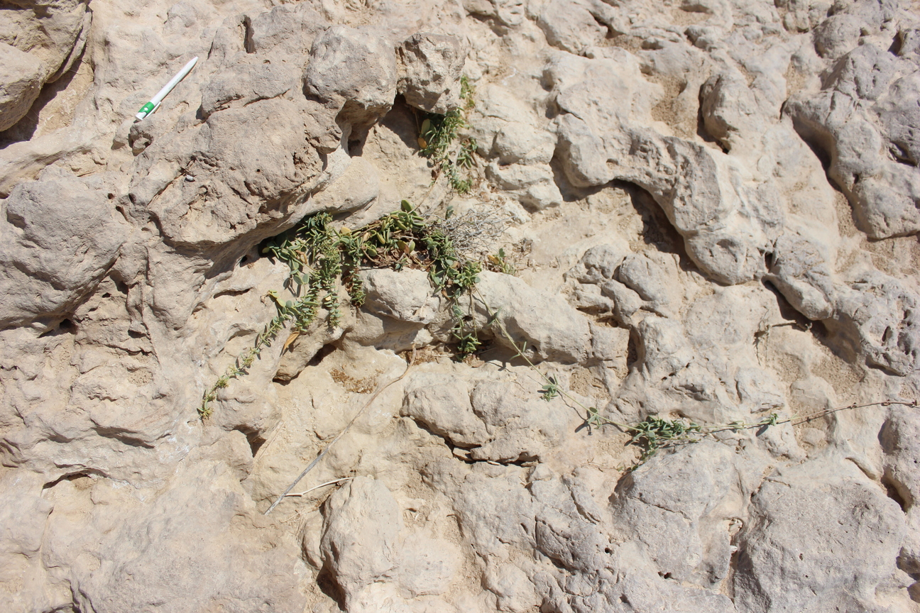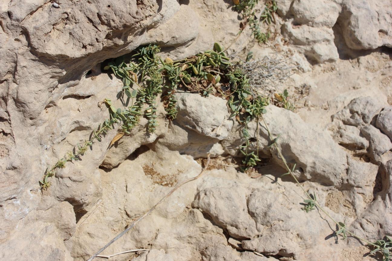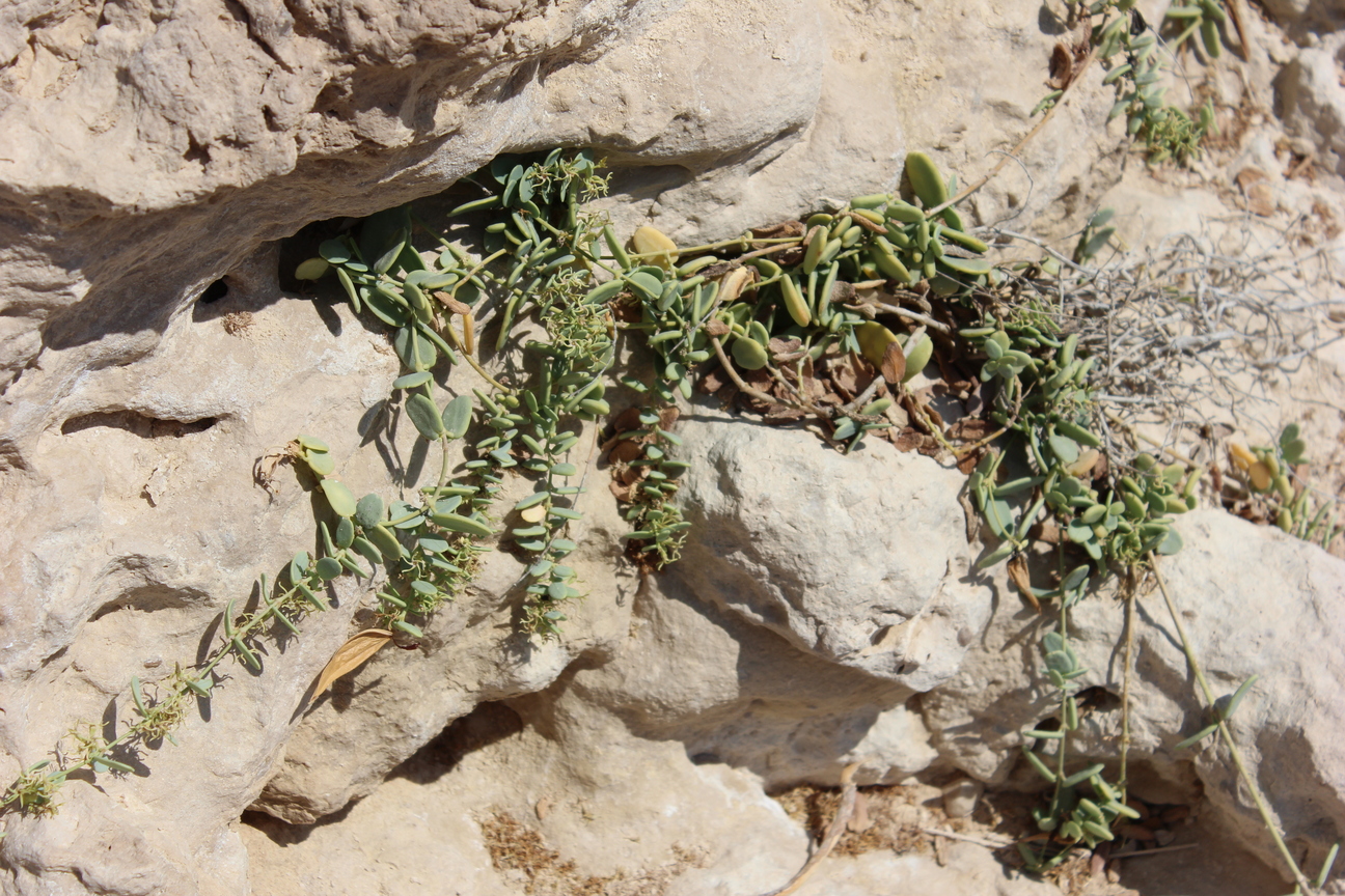 Perennial herb ; with clear latex . Stems creeping , yellowish-green , glabrous or glabrescent . Leaves opposite , 10–30 × 10−25 mm , petiolate , fleshy , broadly oblong to orbicular , apex obtuse with a mucro , base rounded to somewhat cordate , margins entire , grey-green , glabrous . Inflorescences 2–4 , in axillary clusters ; pedicel 2−3 mm . Flowers pale yellow to greenish-yellow ; calyx 5-lobed , lobes 2−3 mm , triangular , acute ; corolla pale yellow to greenish-yellow , with a narrow tube , obscuring the gynostegium , 5-lobed ; lobes 4−8 mm , linear-oblong , spreading , the ends spiralling , glabrous outside , densely minutely pubescent inside ; corona greenish , in one series , of 5 laterally compressed segments ± as long as the gynostegium , fleshy ; stamens united to form a column ; pollinia single in each anther locule , pendulous . Fruit follicles , solitary or rarely paired , ± 5 cm , ± erect , ovoid narrowing into an acute tip . Seeds flattened with a white tuft of hairs at the tip . (Ref . Flora of Oman ; vol . 3) .