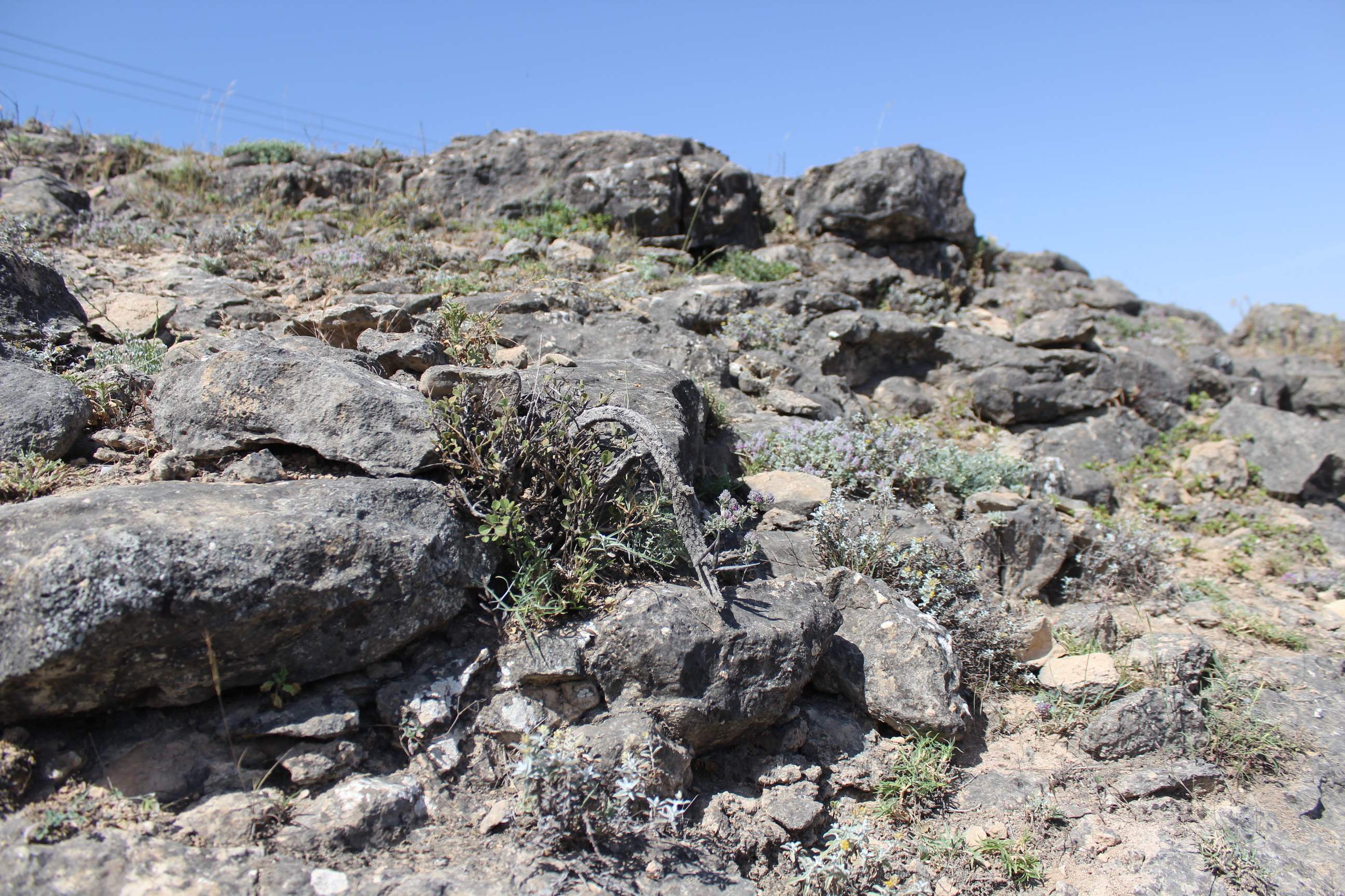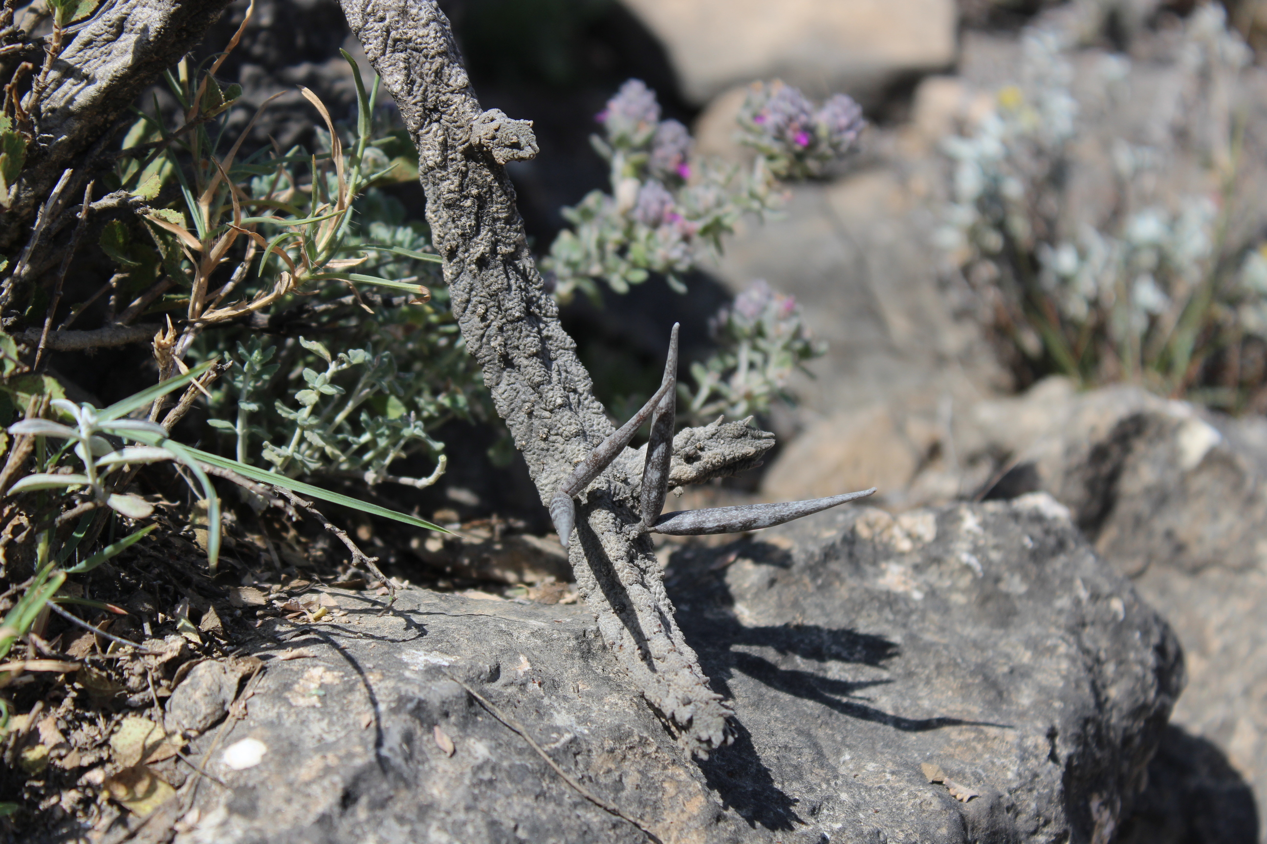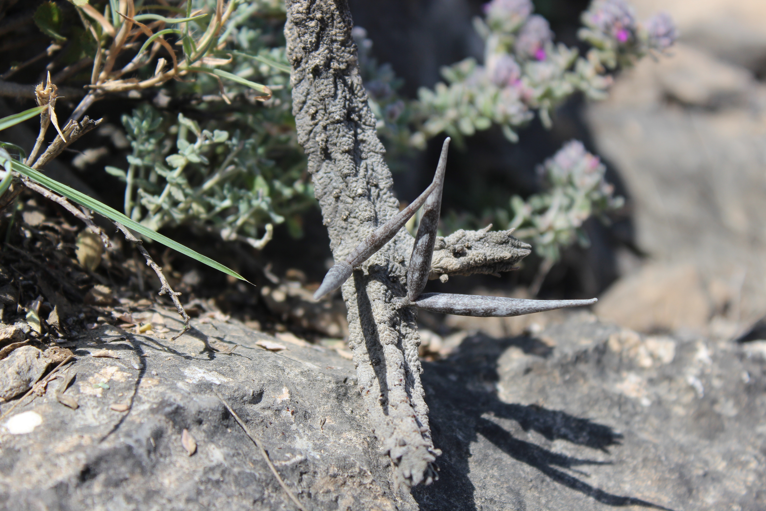 Low growing , prostrate , creeping to ascending succulent herb ; up to 20 cm tall , ± leafless . Stems simple or few branched sparingly from base , 4−5-angled , wrinkled with rounded tubercles , new growth bluish-green , older parts grey-green , covered with thick waxy coating . Leaves near the apex of stem , ± 3 mm , ovate , fleshy , small and rudimentary , falling soon . Inflorescences subsessile , 1- to 3-flowered , solitary or in pairs , scattered over the young parts of the stem , long-lived . Flowers small , 2 . 5−4 . 5 mm across , cage like , yellowish-brown with brownish-red transverse lines , rich in nectar and unscented ; calyx 5-lobed , lobes 2−3 mm , deltoid ; corolla 5-lobed , lobes free to the base , 4−10 mm , linear-spathulate , margins recurved , yellowish-brown with brownish-red transverse lines , connivent at the tips ; corona in 2 series , brown-red , 2−4 mm across ; outer lobes triangular with erect basal processes ; inner lobes pinkish , oblong , inwardly directed ; pollinia ovoid . Fruit follicles , 40 × 4 mm , paired , erect , linear , bluish-green