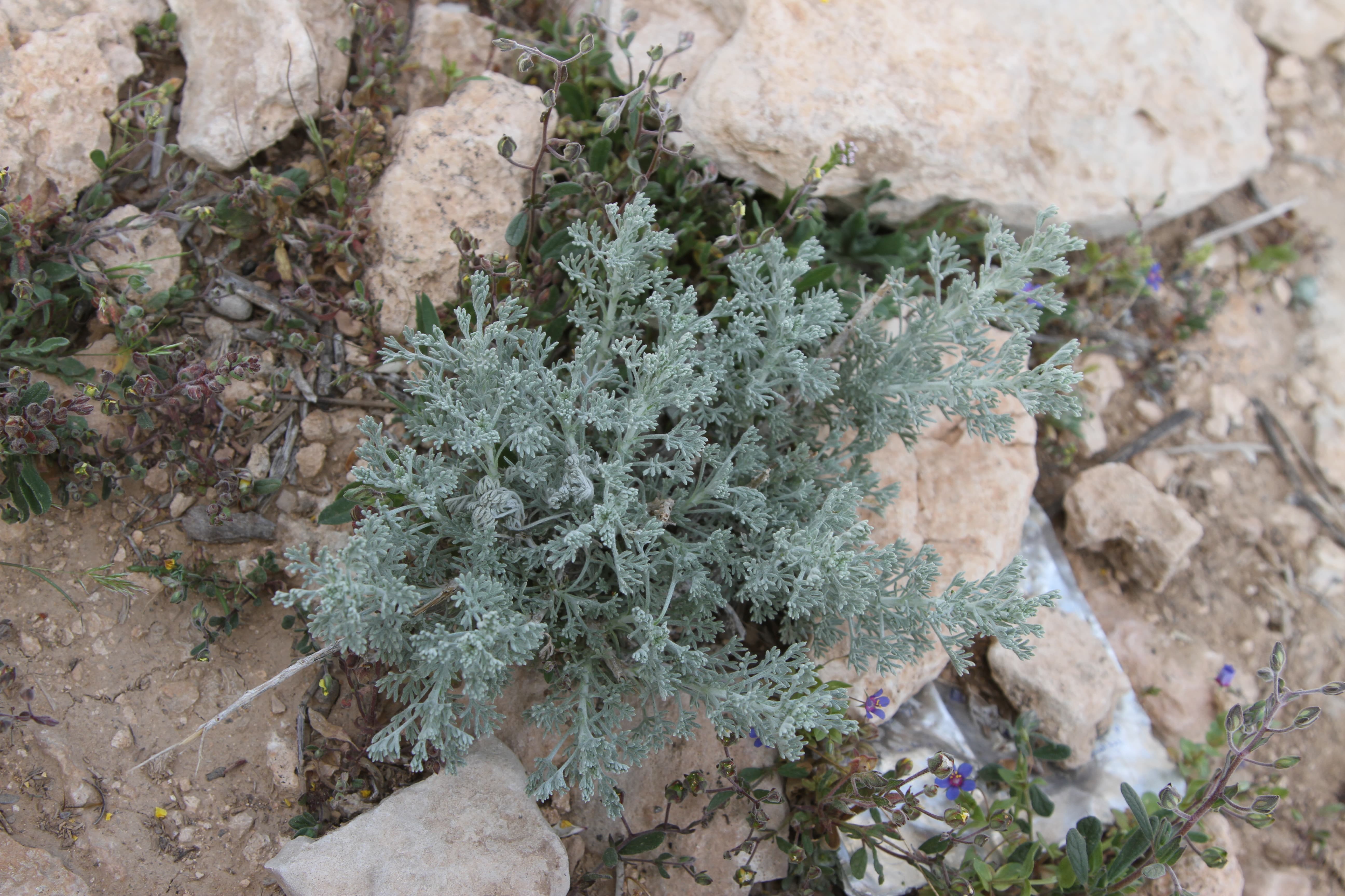 Strongly aromatic shrublet ; up to 40 cm tall , greyish-tomentose to glabrescent . Stems with many , rigid , erect to spreading branches . Leaves basal and lower leaves petiolate , rounded in outline , bipinnatisect , 5-16 x 5-12 mm , with lanceolate , obtuse segments to ± 4 mm long ; upper and middle leaves subsessile to sessile , basally auriculate , in the upper floral region palmatisect or linear , entire , subtending floral branches . Inflorescences numerous densely sessile in paniculiform synflorescences . Flowers 3-4(-5) , perfect , tubular , 5-toothed , yellowish to purple . Fruit achenes , ± 1 mm long , obovate . (Ref . Flora of Oman ; vol . 3) .