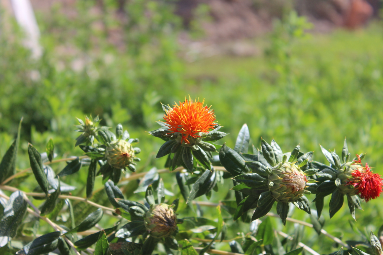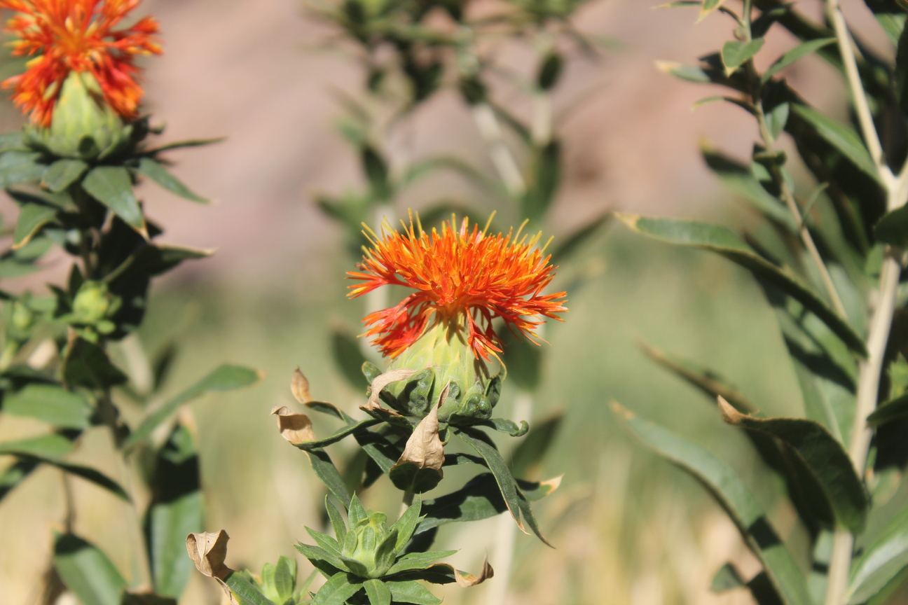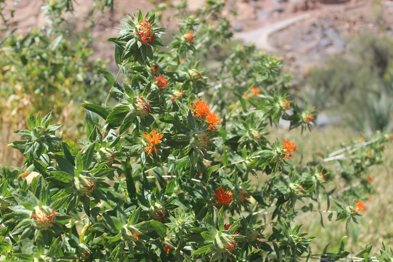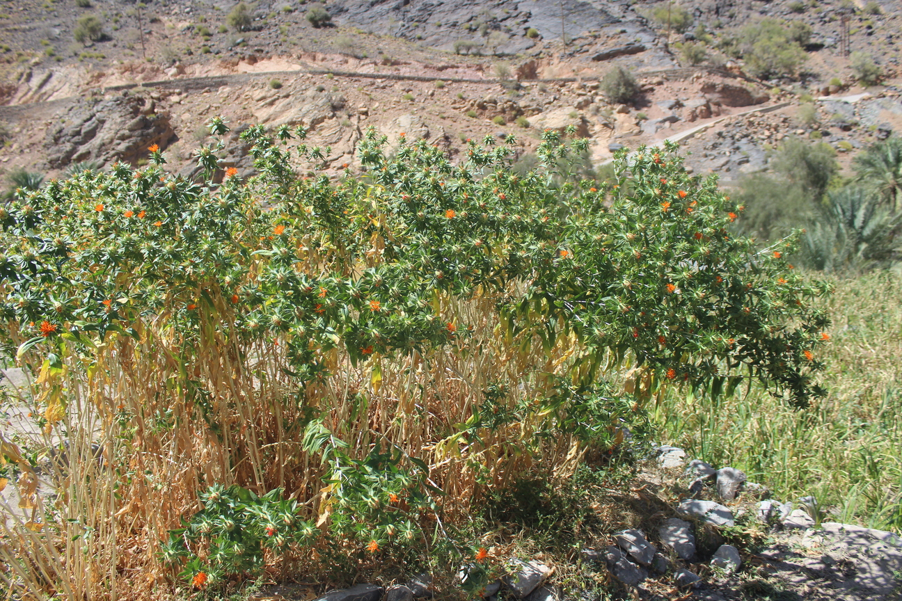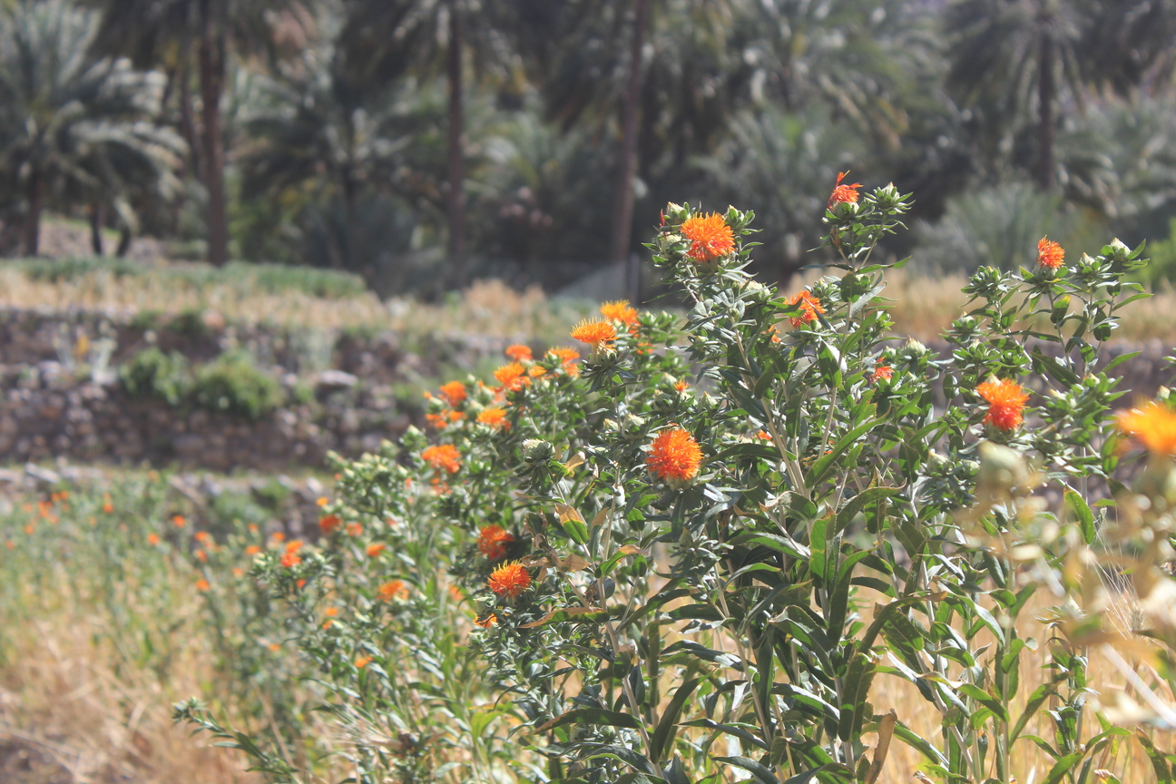 Cultivated for making well-known orange-red dye 'dehan' smeared on the forehead by women. Also, used as a treatment for headache by adding rose water. (Ref. Oman Botanic Garden). In Omani studies: Ghazanfar (2015) wrote that: "Safflower is widely cultivated in many parts of Arabia for the red-coloured dye obtained from the flowers used as a cosmetic, for dyeing cloth and wool, and as food colour; also the entire plant has been used in traditional medicine for treating red and swollen eyes". (Ref. Flora of Oman; vol.3).