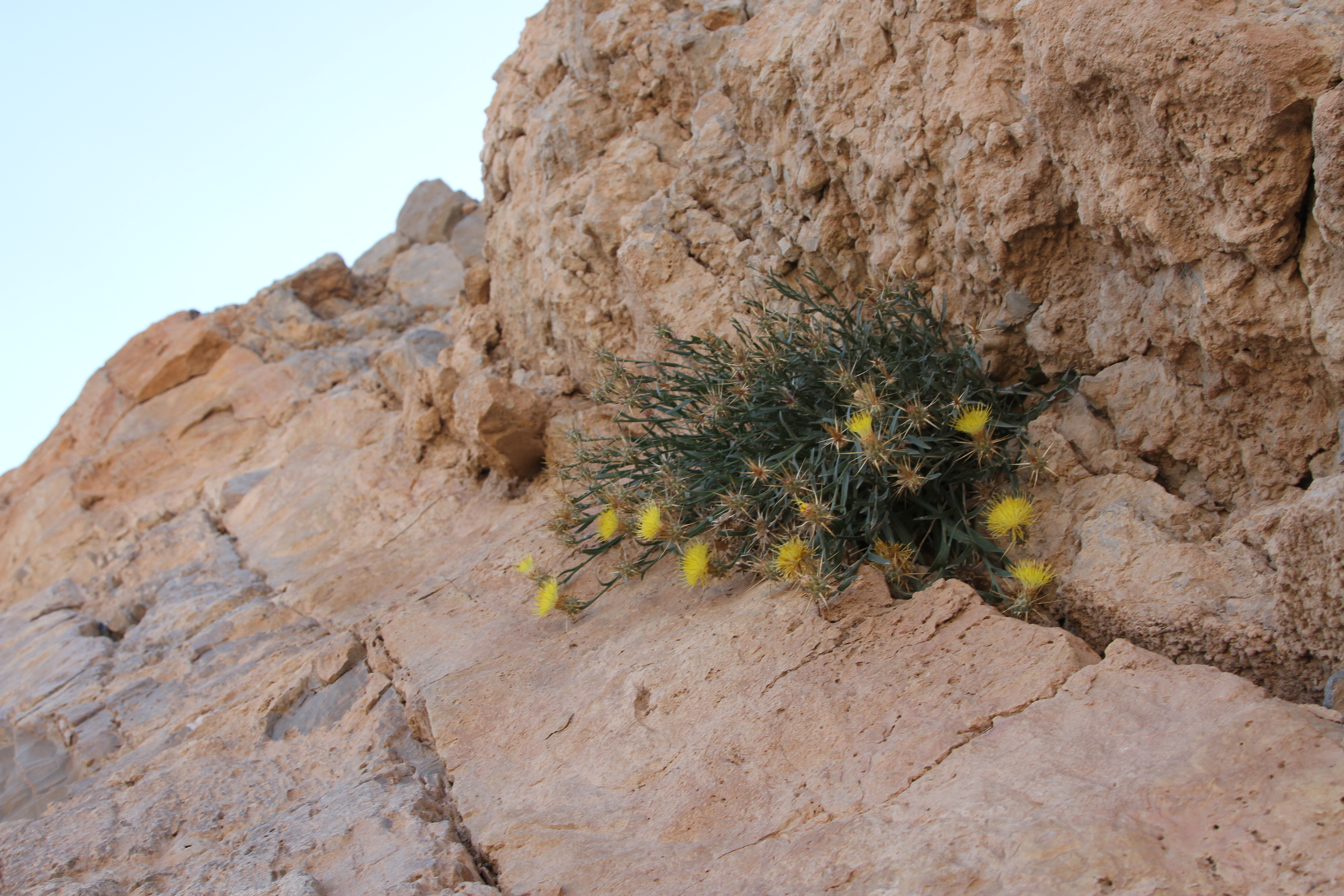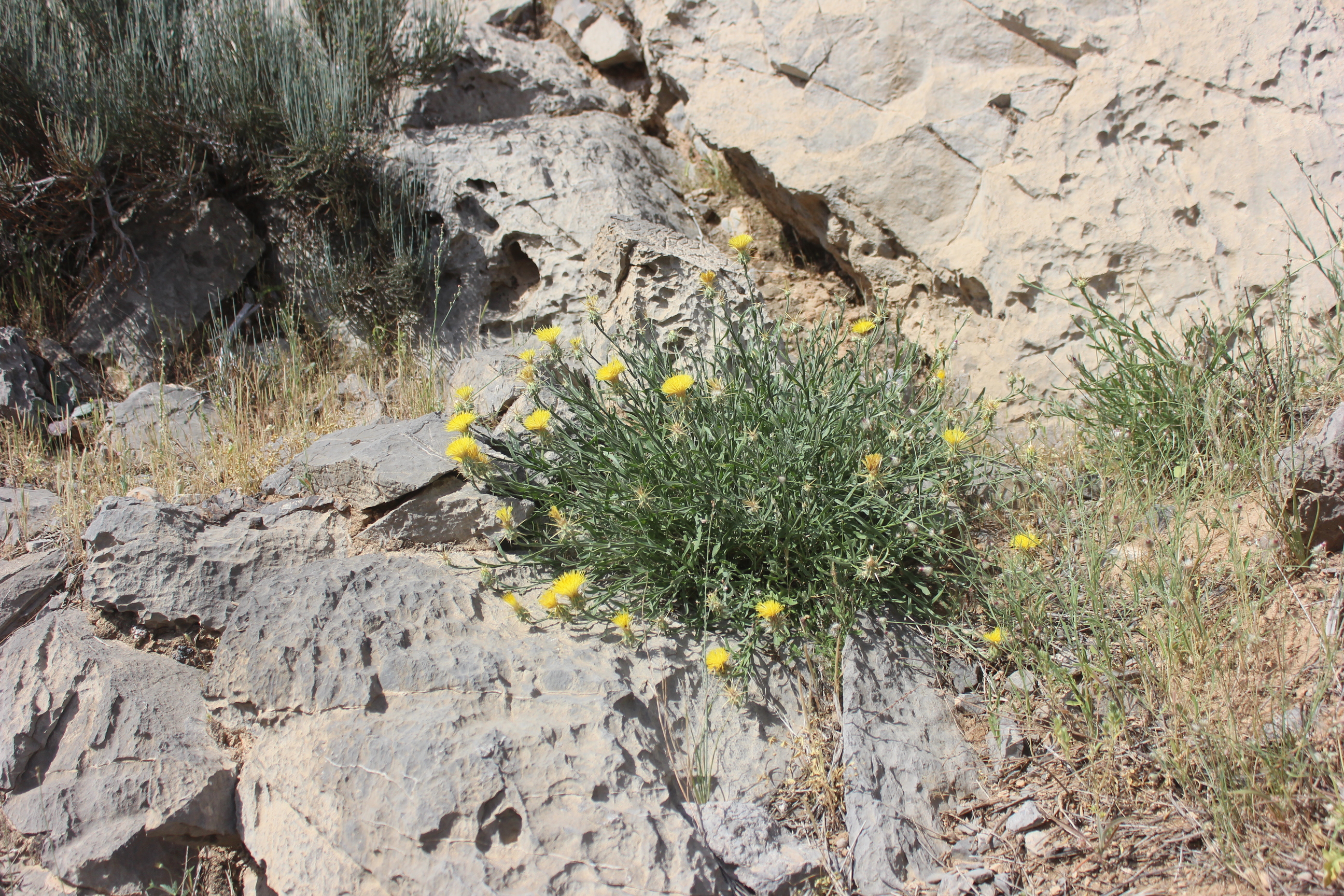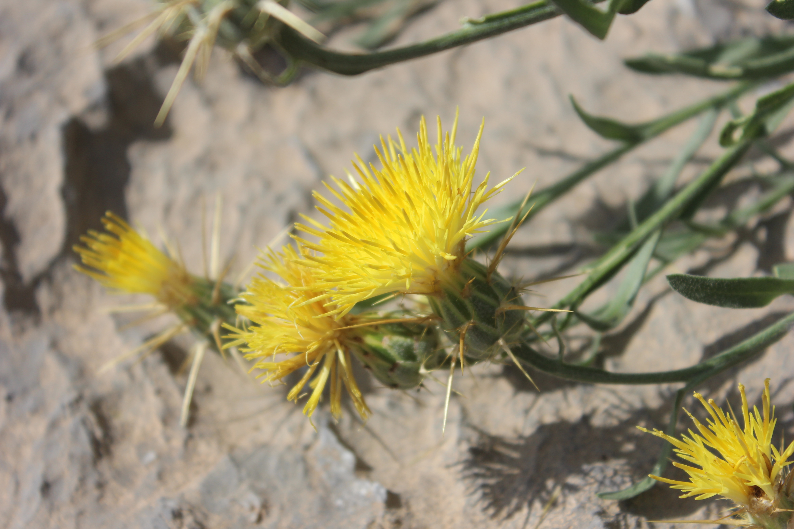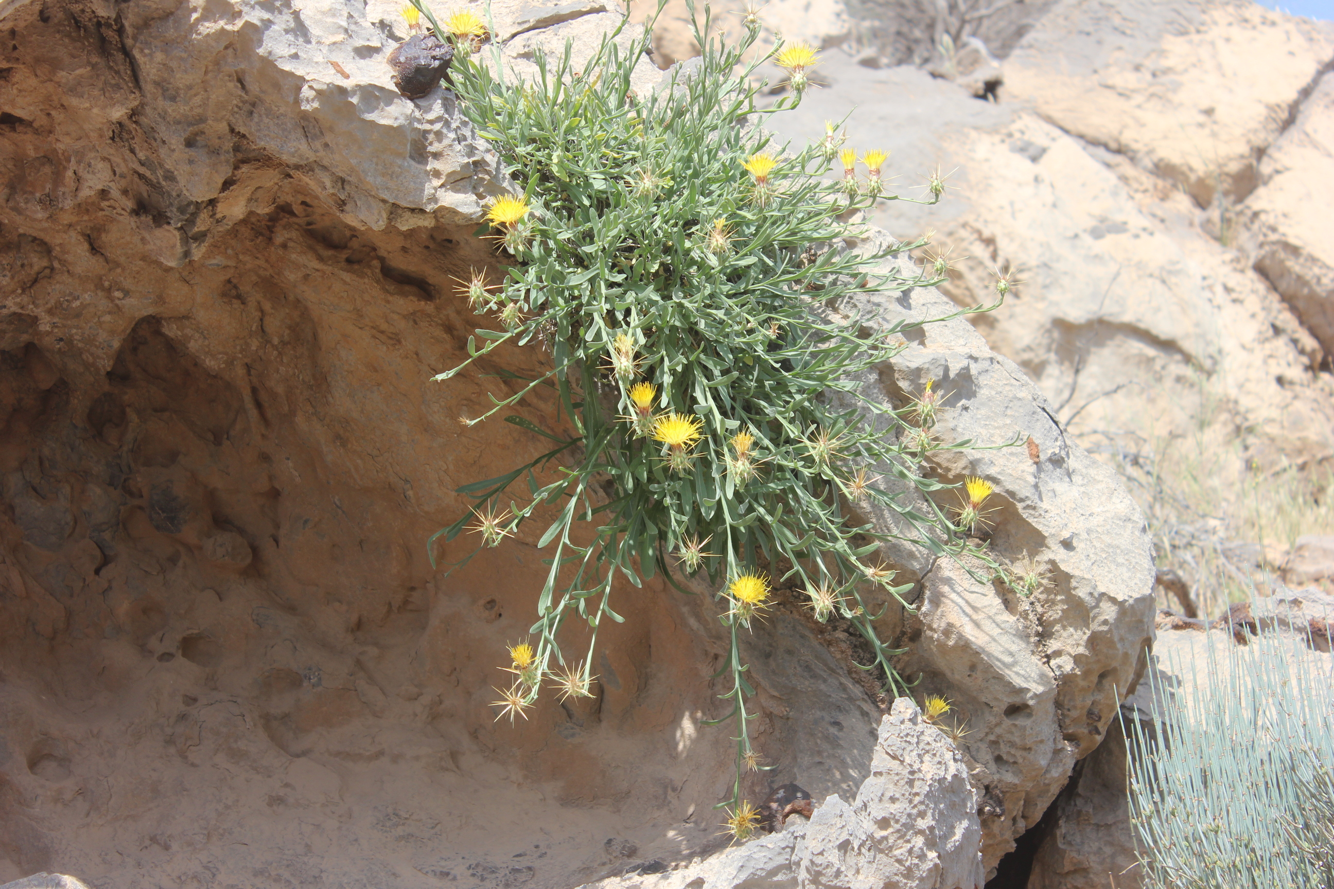 Cushion forming subshrub ; up to ± 50 cm high . Stems weakly tomentose , glabrescent . Leaves lyrately divided (the lower) to linear-lanceolate and ± entire , weakly tomentose , glabrescent . Inflorescences solitary at the end of the branches . Flowers bright yellow , glandular-sticky , much exceeding the involucre . Fruit achenes , 5–6 mm long . Seeds pappus , 6-7 mm long , innermost row of bristles as long as the outer . (Ref . Flora of Oman ; vol . 3) .