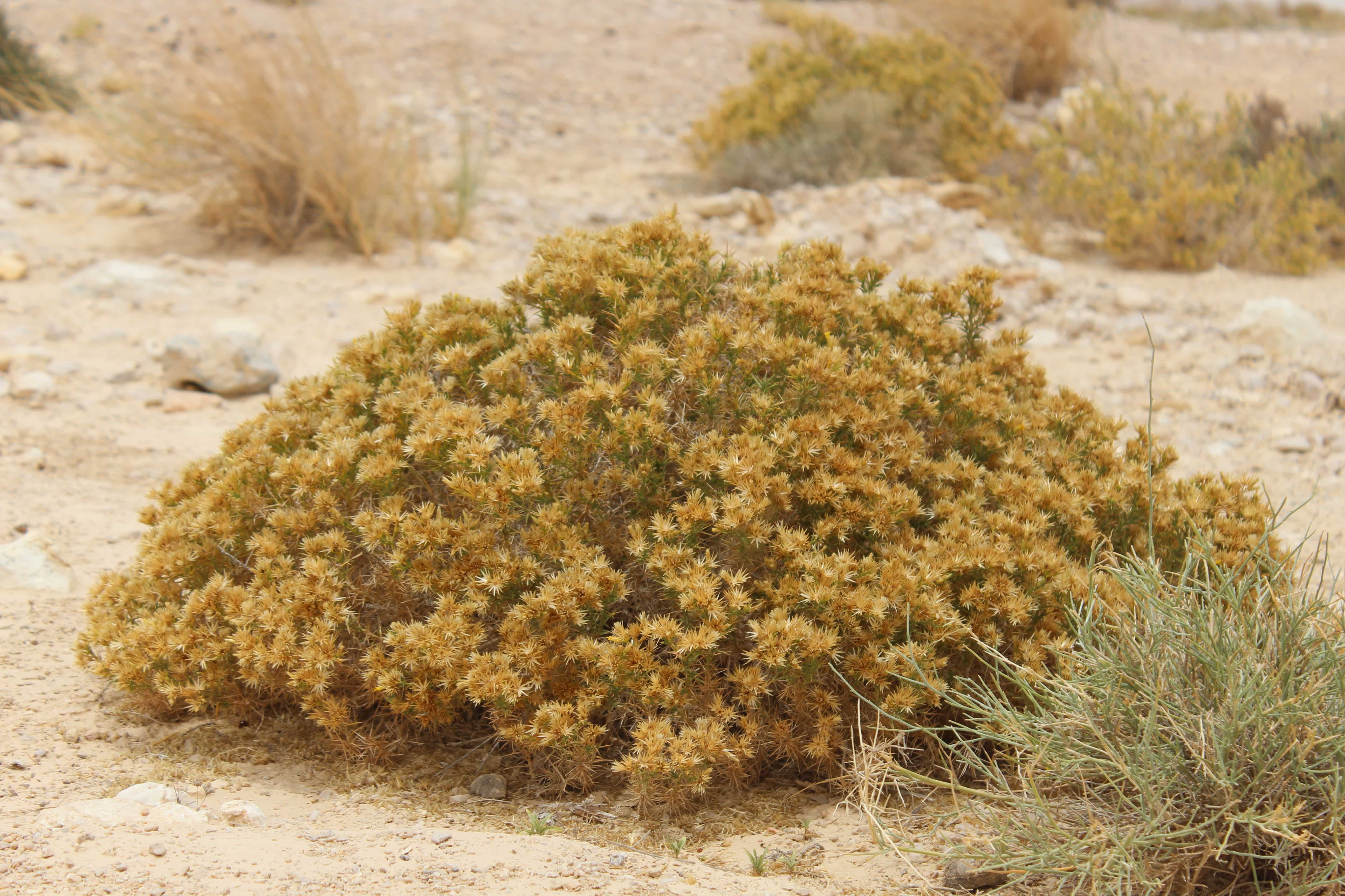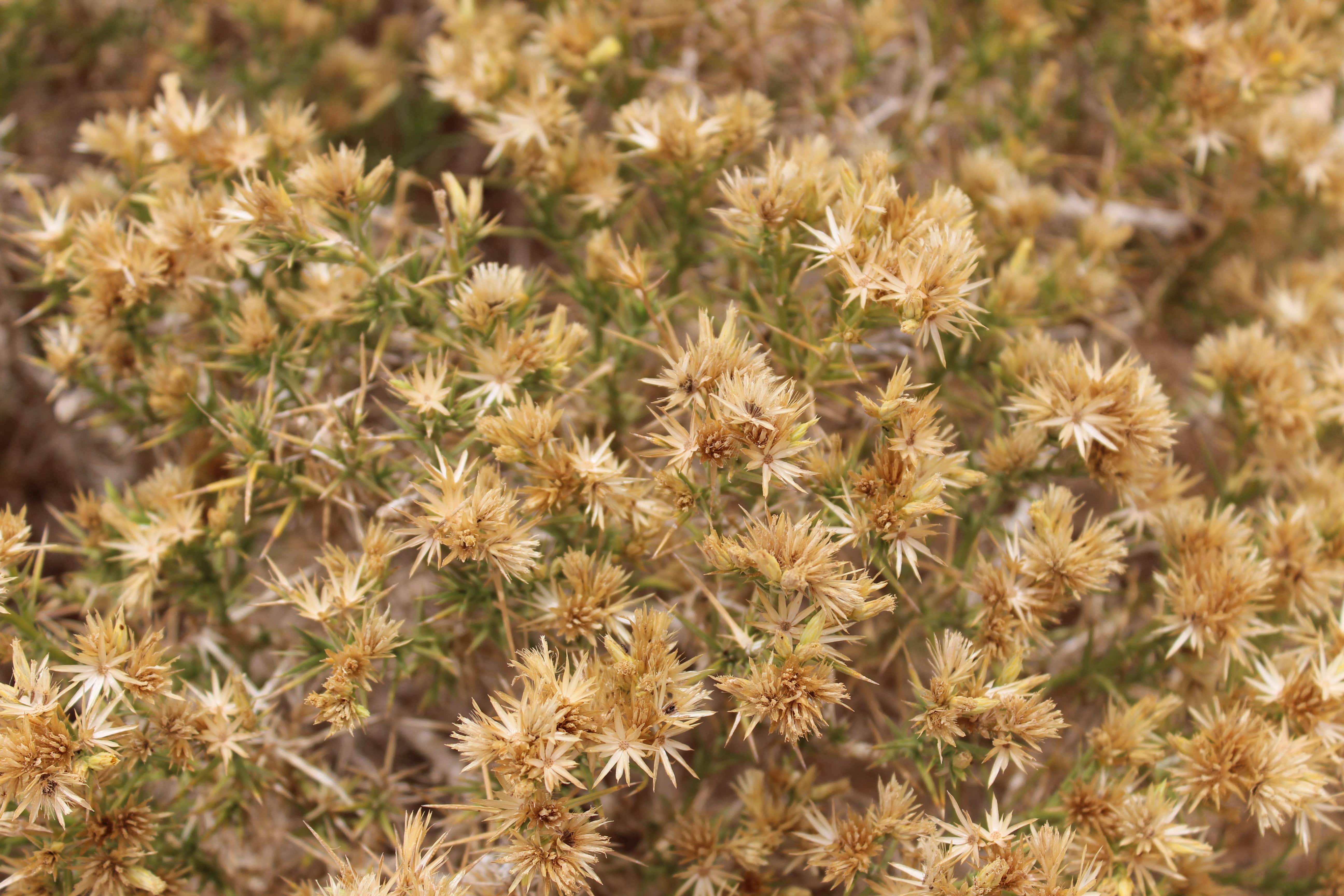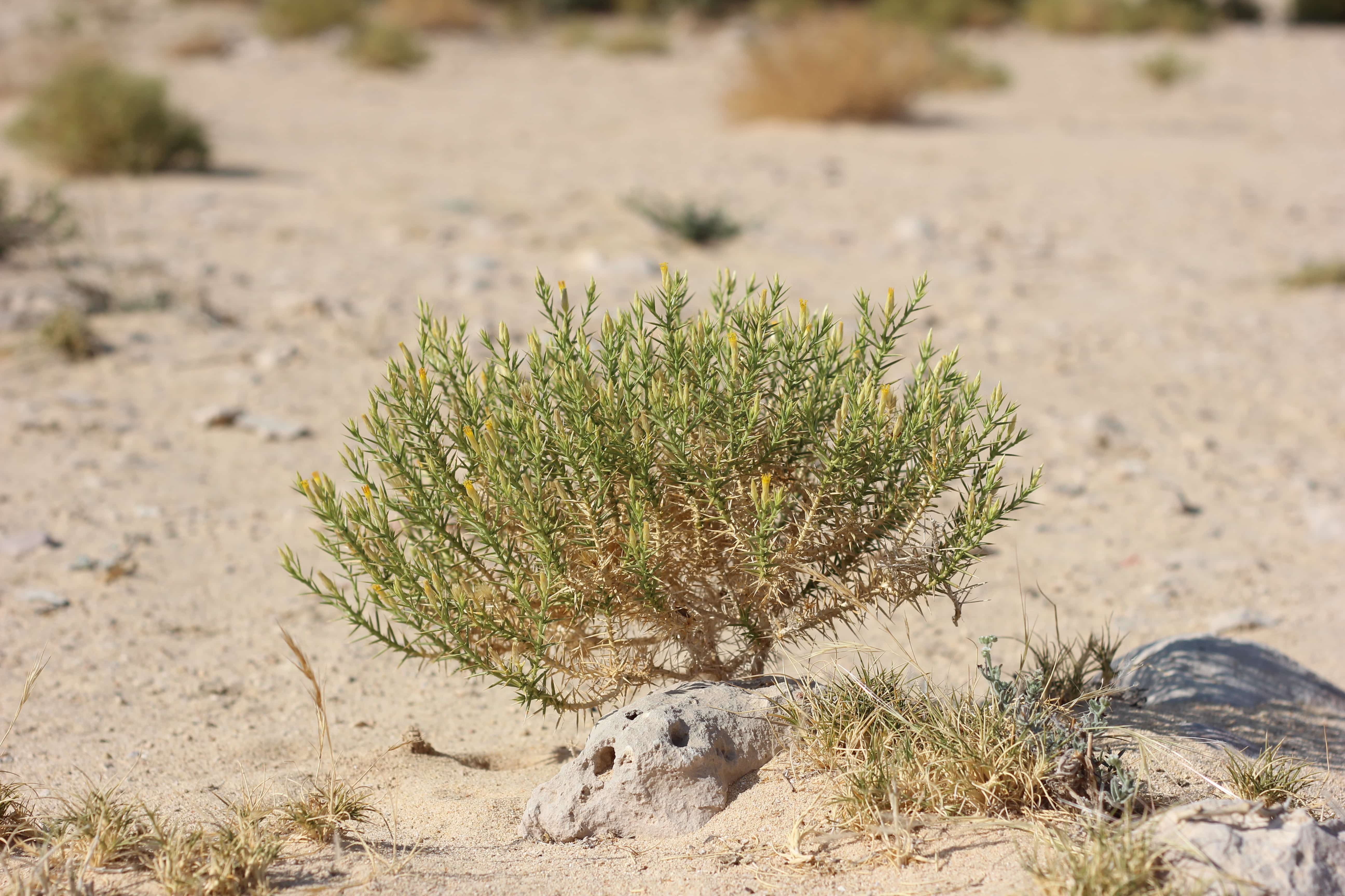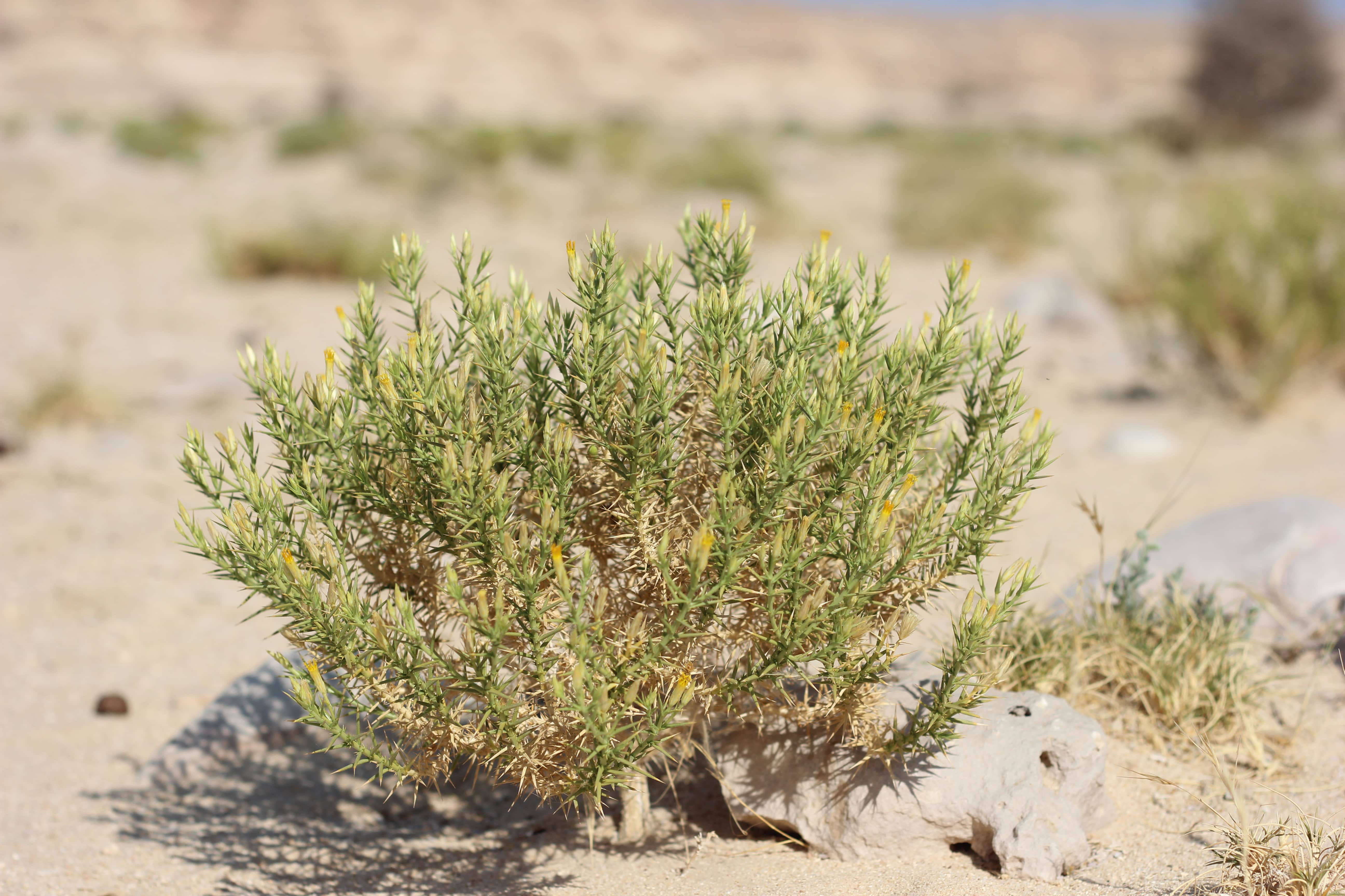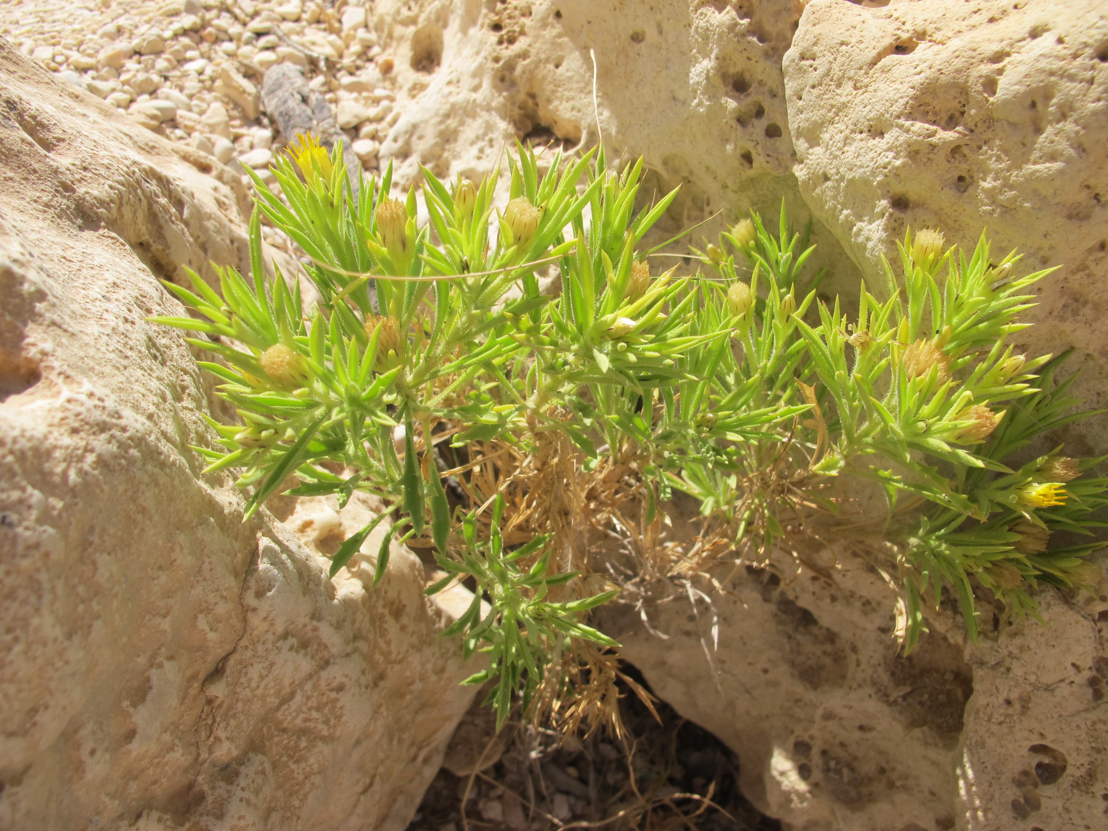 Subshrub ; up to 60 cm high . Stems strongly branched , glandular or glabrous . Leaves up to o 5 × 0 . 7 cm , linear and subulate to narrowly lanceolate , spathulate or elliptic and pungent , flat to canaliculate or folded along the midrib , entire or dentate to pinnatifid . Inflorescences solitary or by 3–10 in a loosely corymbiform synflorescence at the end of the branches . Flowers yellow , all tubular and perfect . Fruit achenes , ellipsoidal to obconical , ribbed and hairy , 2–3 mm long . Seeds pappus , 5–6 mm long , of numerous brownish bristles in serveral series , the inner successively longer than the outer . (Ref . Flora of Oman ; vol . 3) .