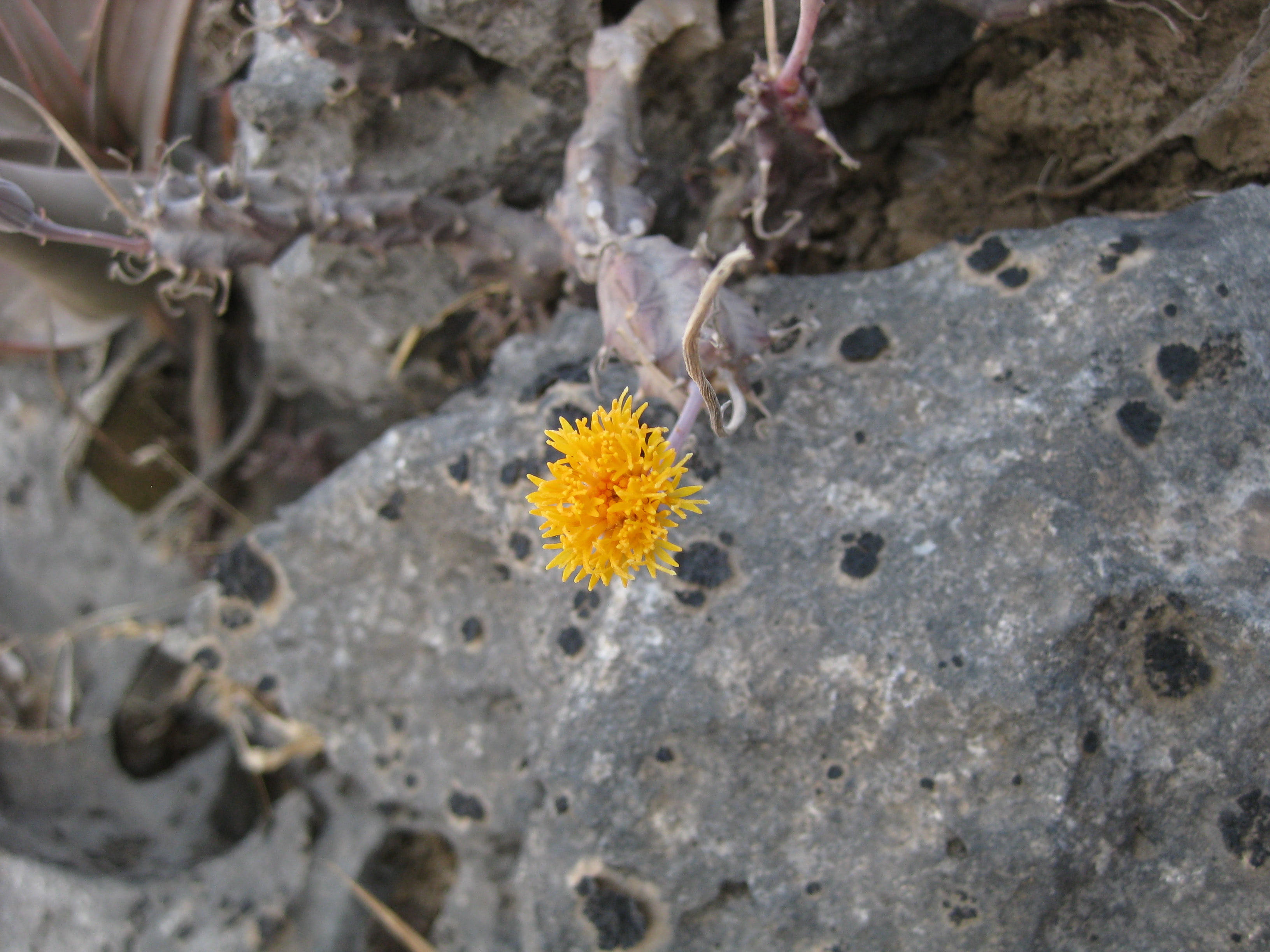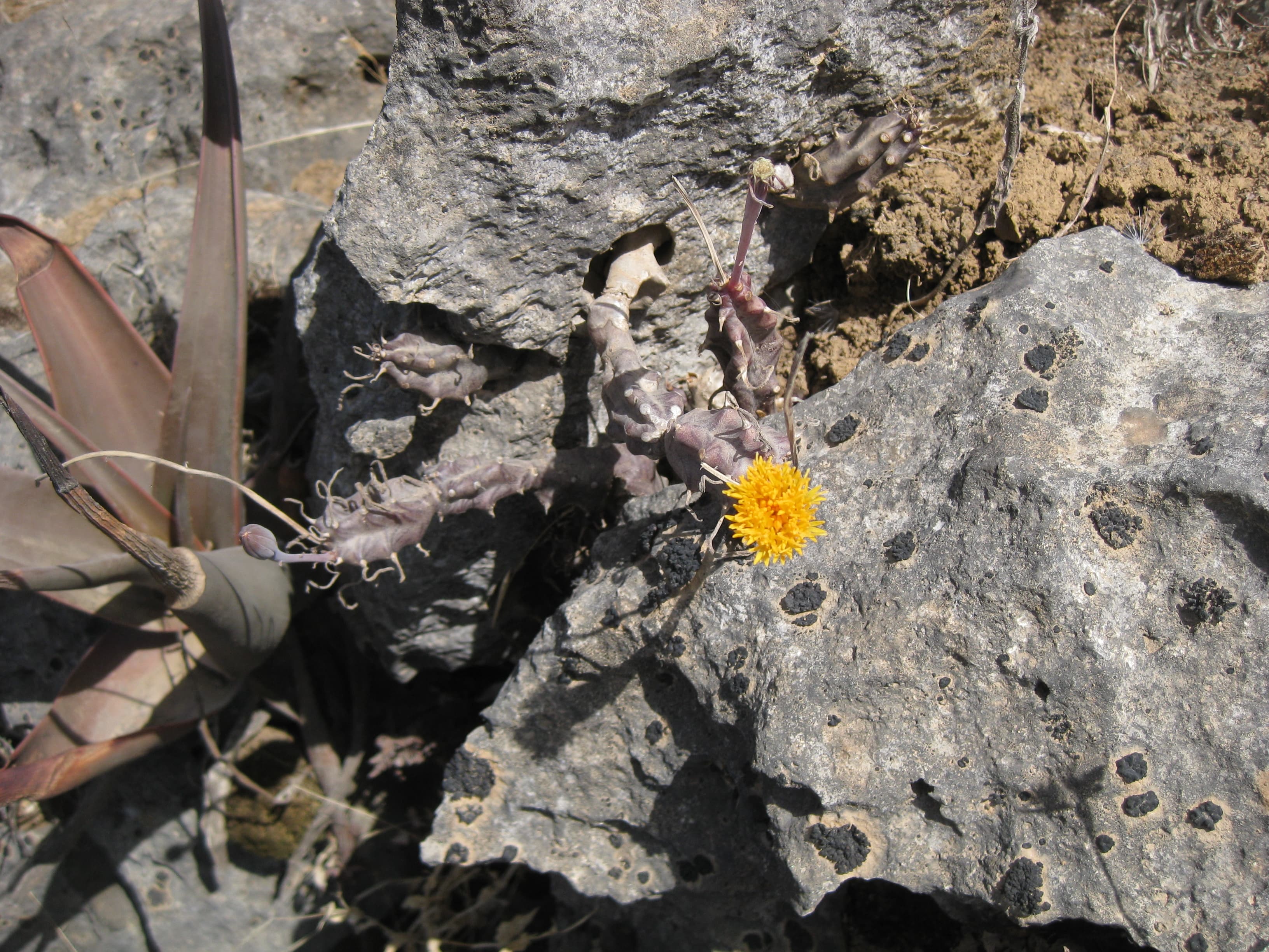 Succulent perennial ; up to 7 cm in diameter , glabrous . Stems Pendent to procumbent or erect , stout , jointed ; nodes raised to ± prominent mounds , becoming less prominent with age , and with 7–9 deeper green or purplish-green radiating lines . Leaves only at young shoots , elliptic or linear-lanceolate to linear-spathulate , acute , very variable in size , up to 14 × 2 cm , somewhat fleshy . Inflorescences solitary on 15–60 cm long , apically swollen peduncles arising from the end of the stem . Flowers ± 30–100 , yellow to orange , perfect , tubular . Fruit achenes , ± cylindric , 2–4 mm long , villose . Seeds pappus ± 15–22 mm long , of numerous barbellate , white bristles . (Ref . Flora of Oman ; vol . 3) .