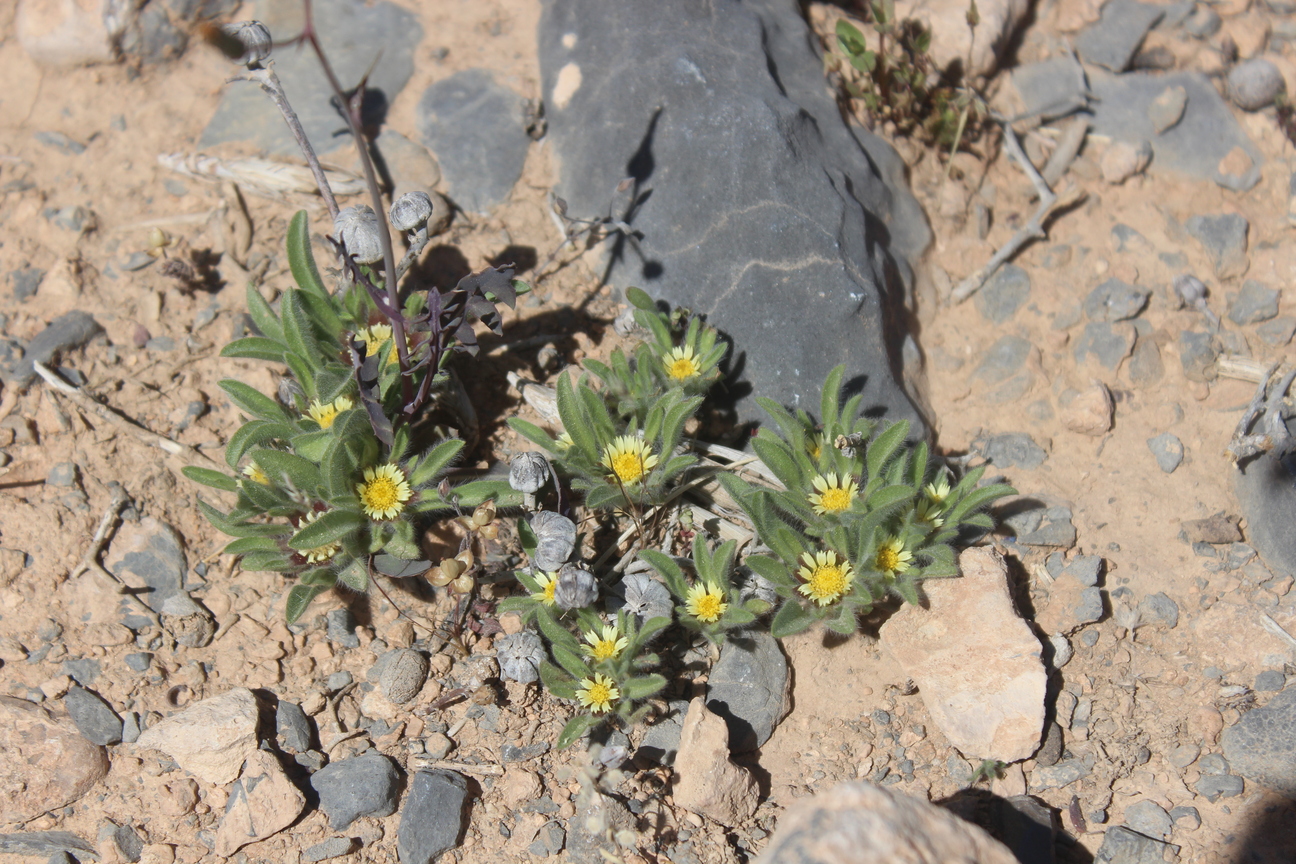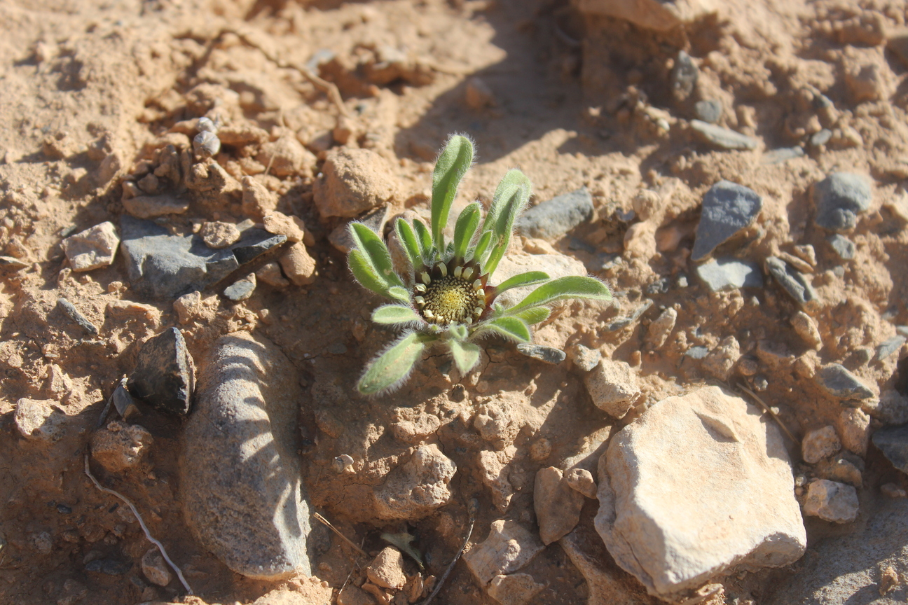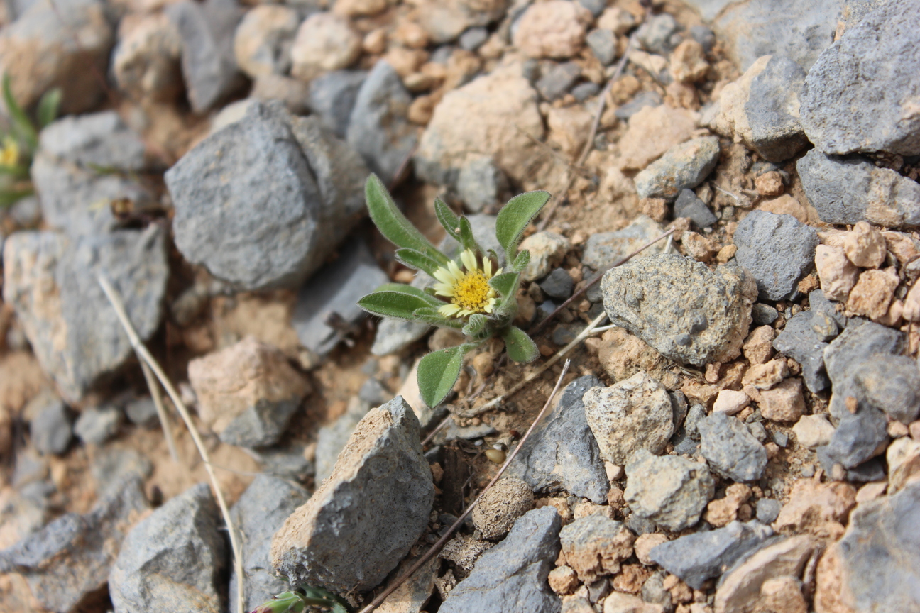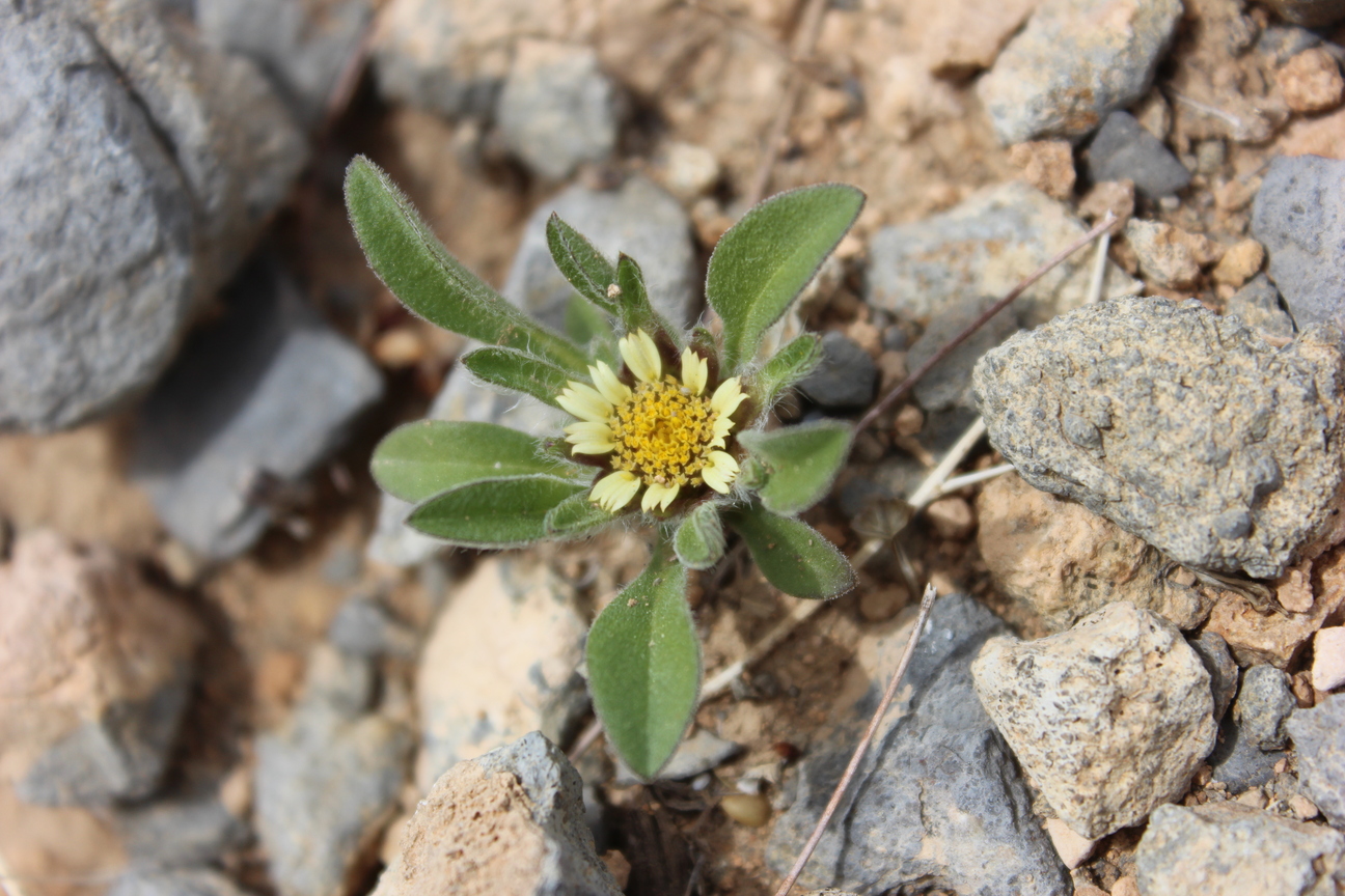 A dwarf leafy annual herb ; up to 5 cm high , shortly villose to scabrid , glabrescent . Stems procumbent , occasionally branching from the base . Leaves a basal rosette , spathulate , up to 10 × 1 cm , slightly hairy . Inflorescences one to several , sessile to shortly pedunculate in the forks of branches . Flowers pale yellow , no scent ; ray flowers 10–20 , ray lamina 3–6 × 1 . 5–2 . 5 mm ; disk flowers 40–200 . Fruit achenes , 1–2 mm long , turbinate , densely hairy , triquetrous in ray flowers and 4-angular to subterete in disk flowers . Seeds pappus , crown-like , of 6–10 scales ± 1–1 . 5 mm long . (Ref . Flora of Oman ; vol . 3) .