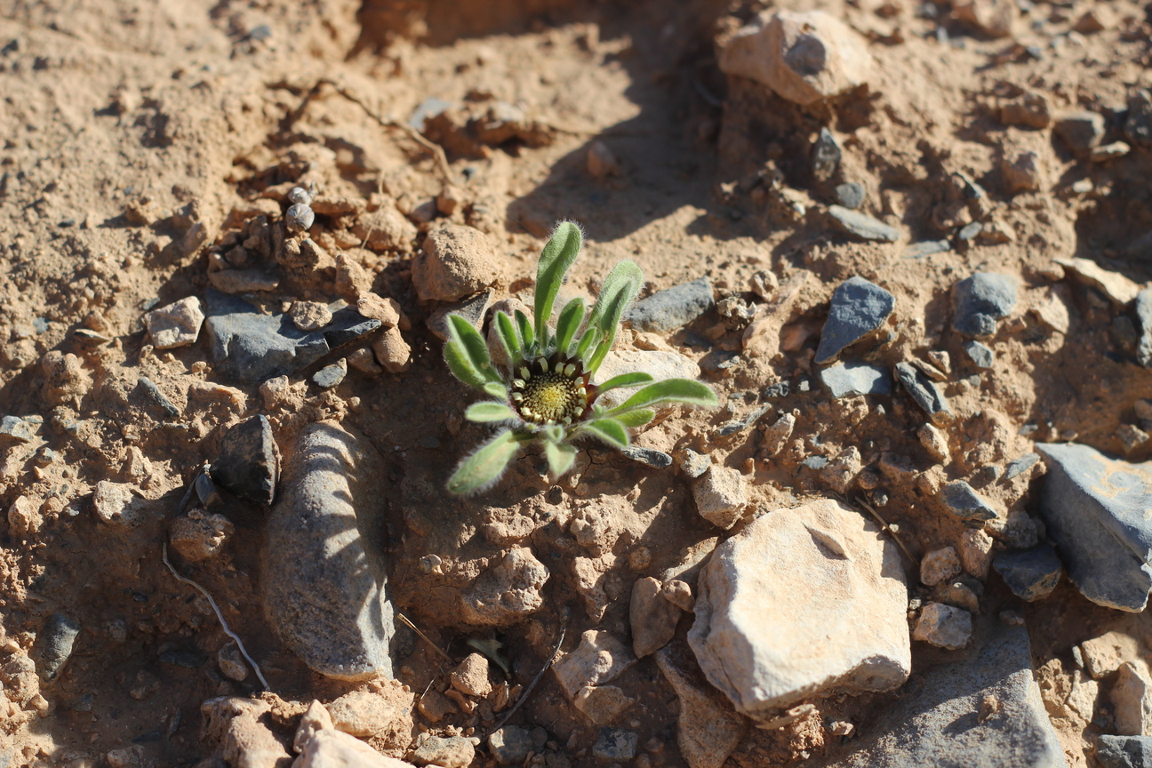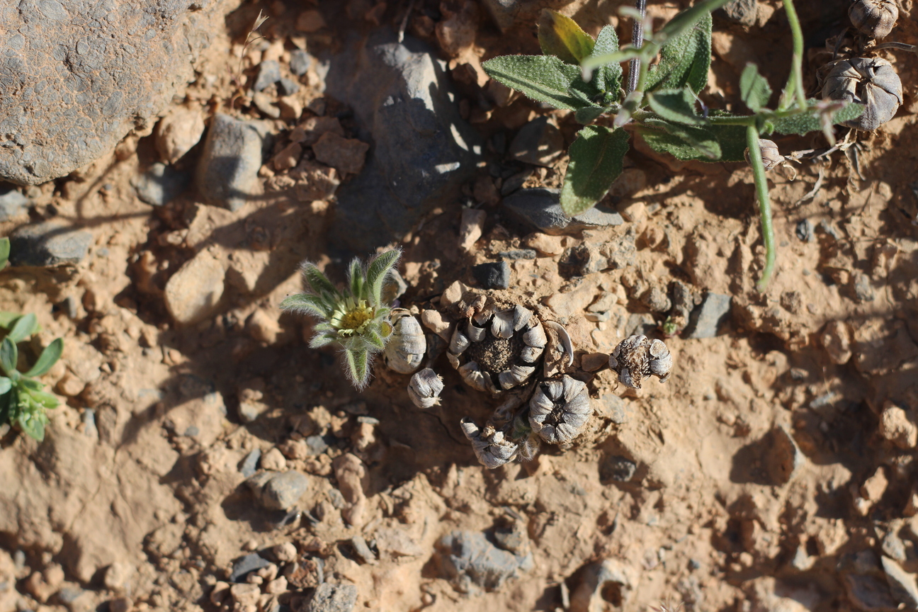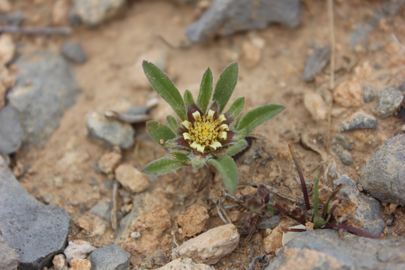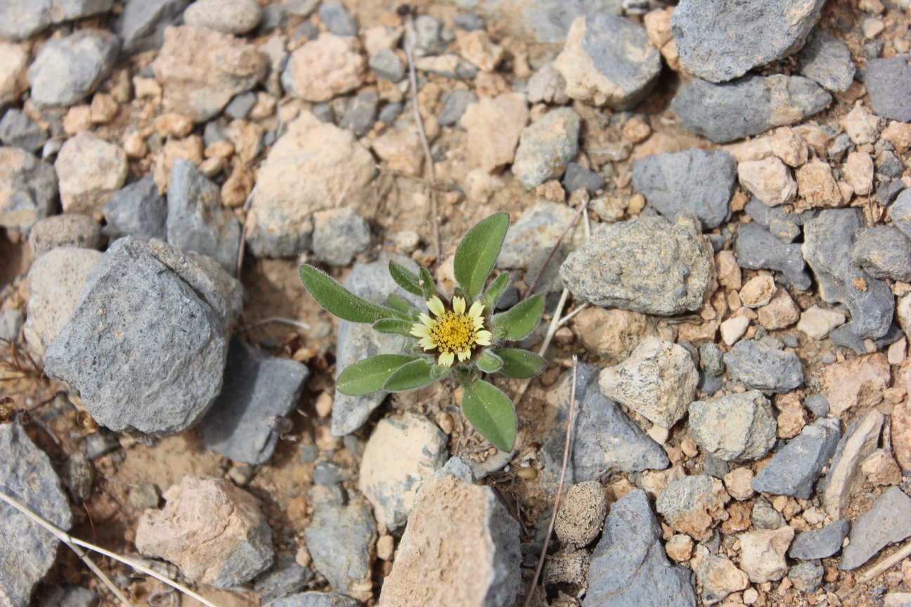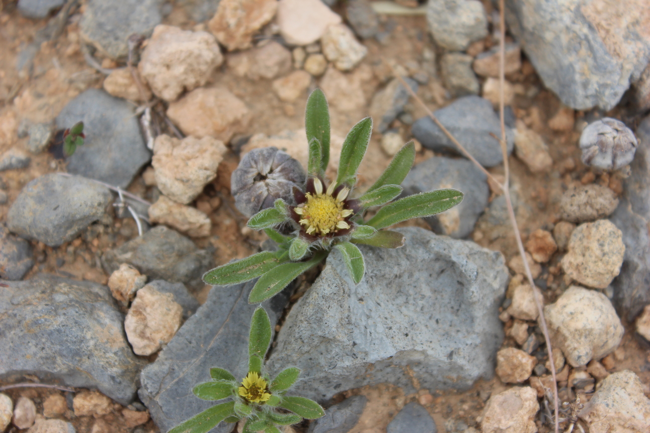 A dwarf leafy annual herb ; up to 5 cm high , shortly villose to scabrid , glabrescent . Stems procumbent , occasionally branching from the base . Leaves a basal rosette , spathulate , up to 10 × 1 cm , slightly hairy . Inflorescences one to several , sessile to shortly pedunculate in the forks of branches . Flowers pale yellow , no scent ; ray flowers 10–20 , ray lamina 3–6 × 1 . 5–2 . 5 mm ; disk flowers 40–200 . Fruit achenes , 1–2 mm long , turbinate , densely hairy , triquetrous in ray flowers and 4-angular to subterete in disk flowers . Seeds pappus , crown-like , of 6–10 scales ± 1–1 . 5 mm long . (Ref . Flora of Oman ; vol . 3) .