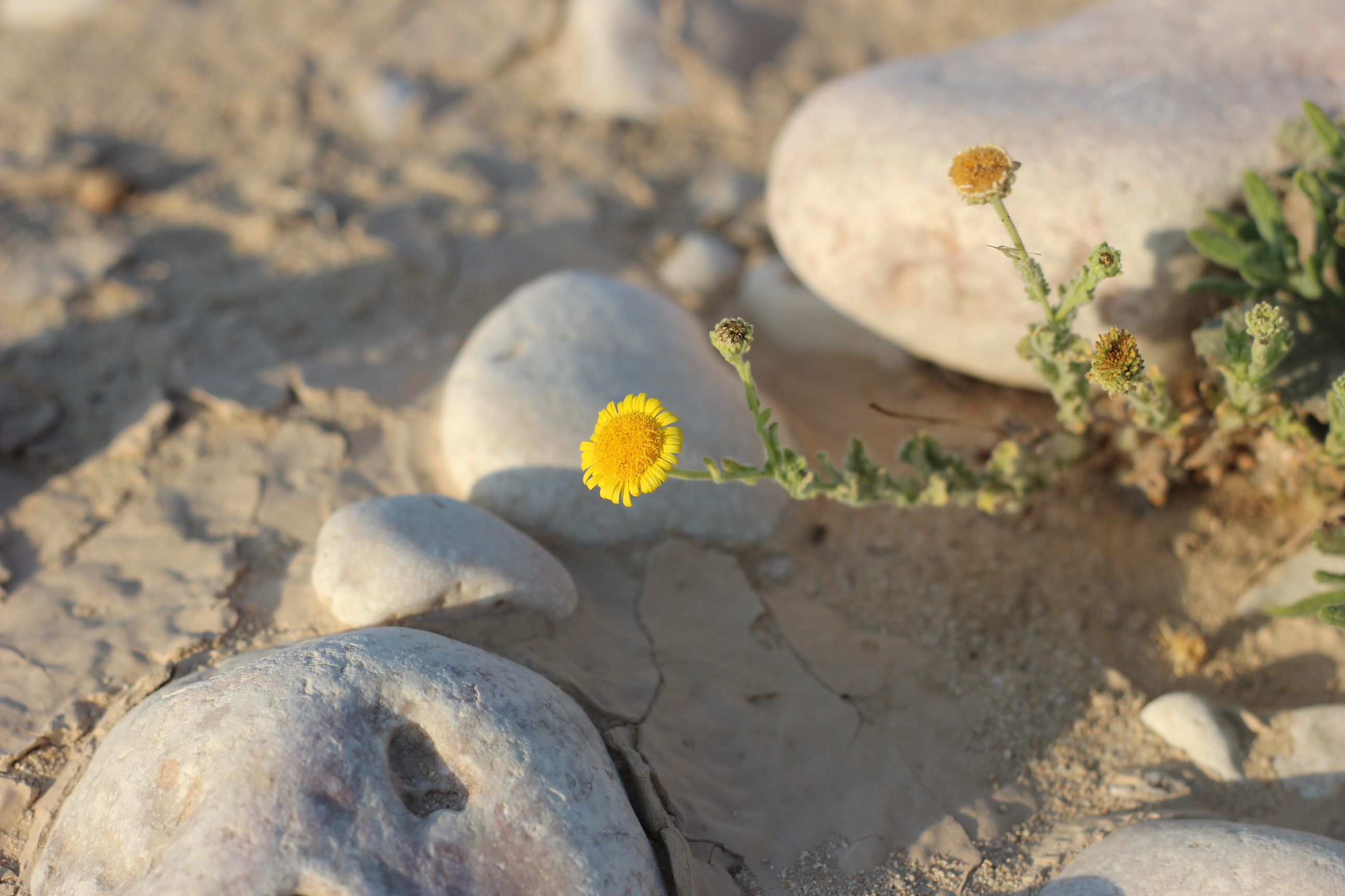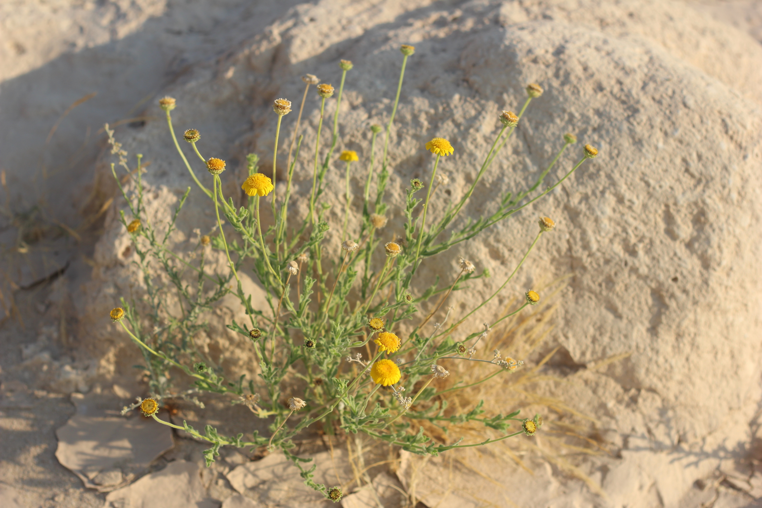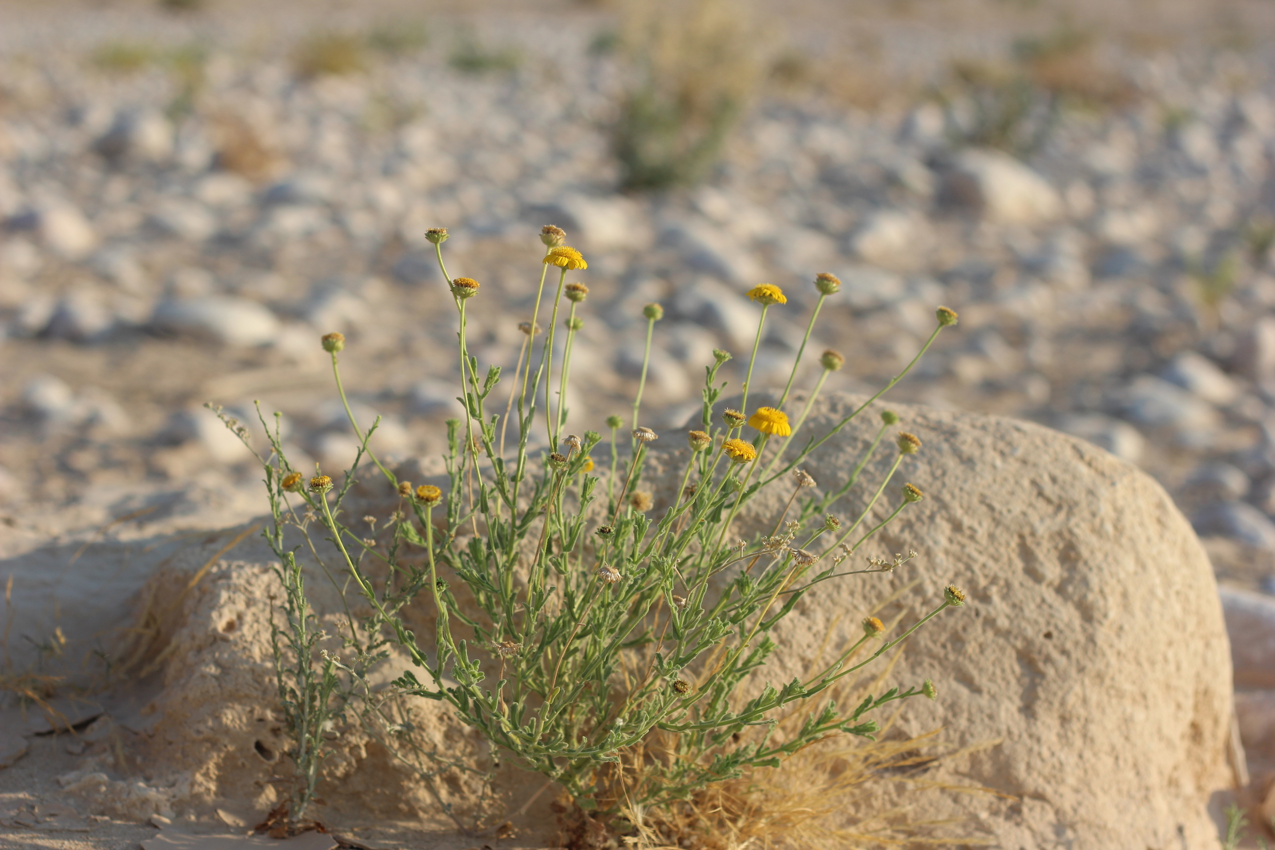 Strongly aromatic perennial herb ; up to 50 cm high . Stems erect , branched mostly from base , hairy and glandular , greyish-green . Leaves up to 4 × 1 . 5 cm , linear to lanceolate or spathulate , entire or with few teeth , obtuse , strongly hairy and glandular on both surfaces . Inflorescences solitary at the end of the branches . Flowers yellow ; ray flowers pistillate , ray lamina 2–3 mm long ; disk flowers perfect , tubular . Fruit achenes , 1 . 5–2 mm long , angular , basally attenuate . Seeds pappus of a corona 0 . 1–0 . 3 mm long and ± 15 bristles , ± 4 mm long . (Ref . Flora of Oman ; vol . 3) .