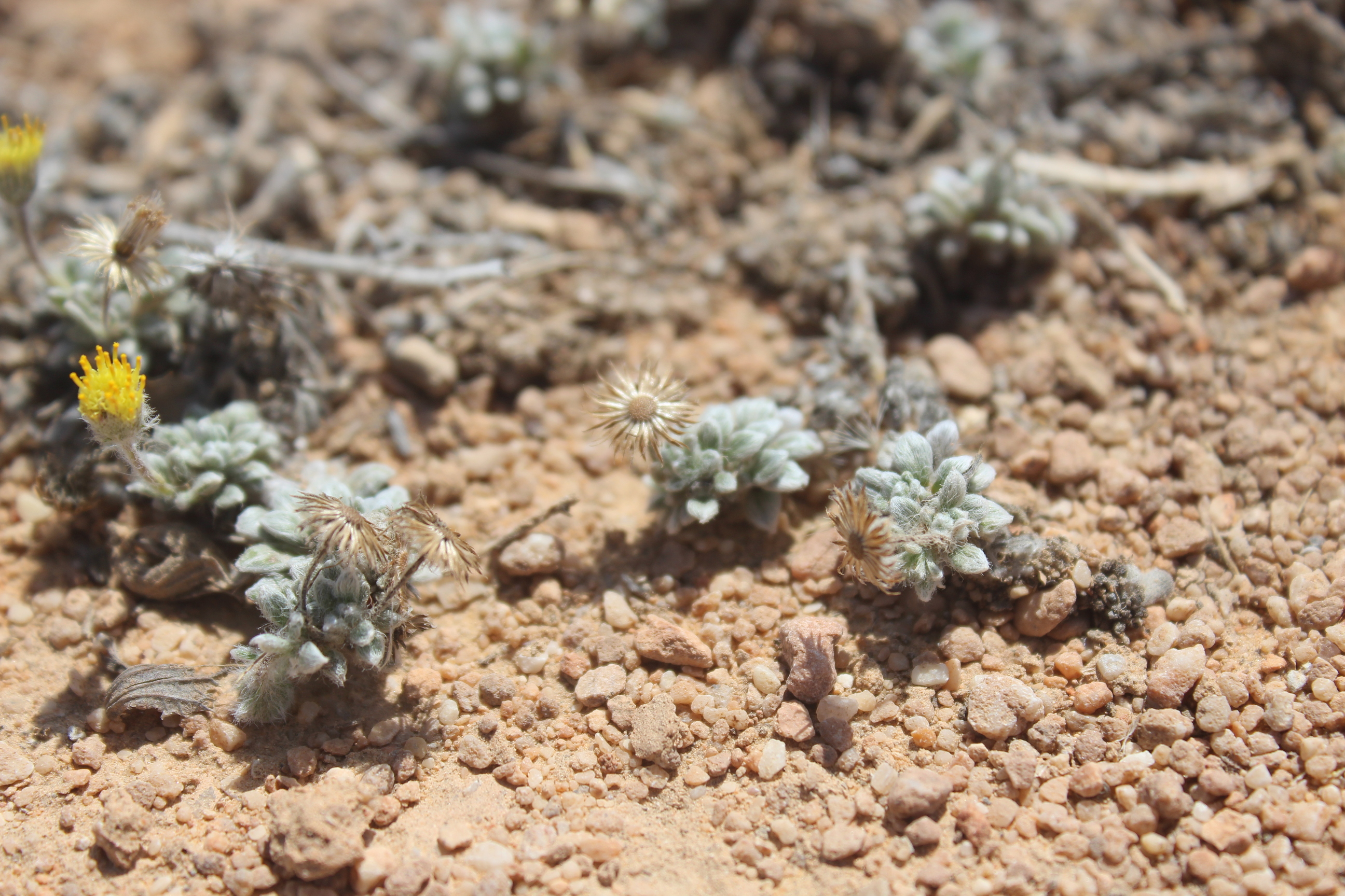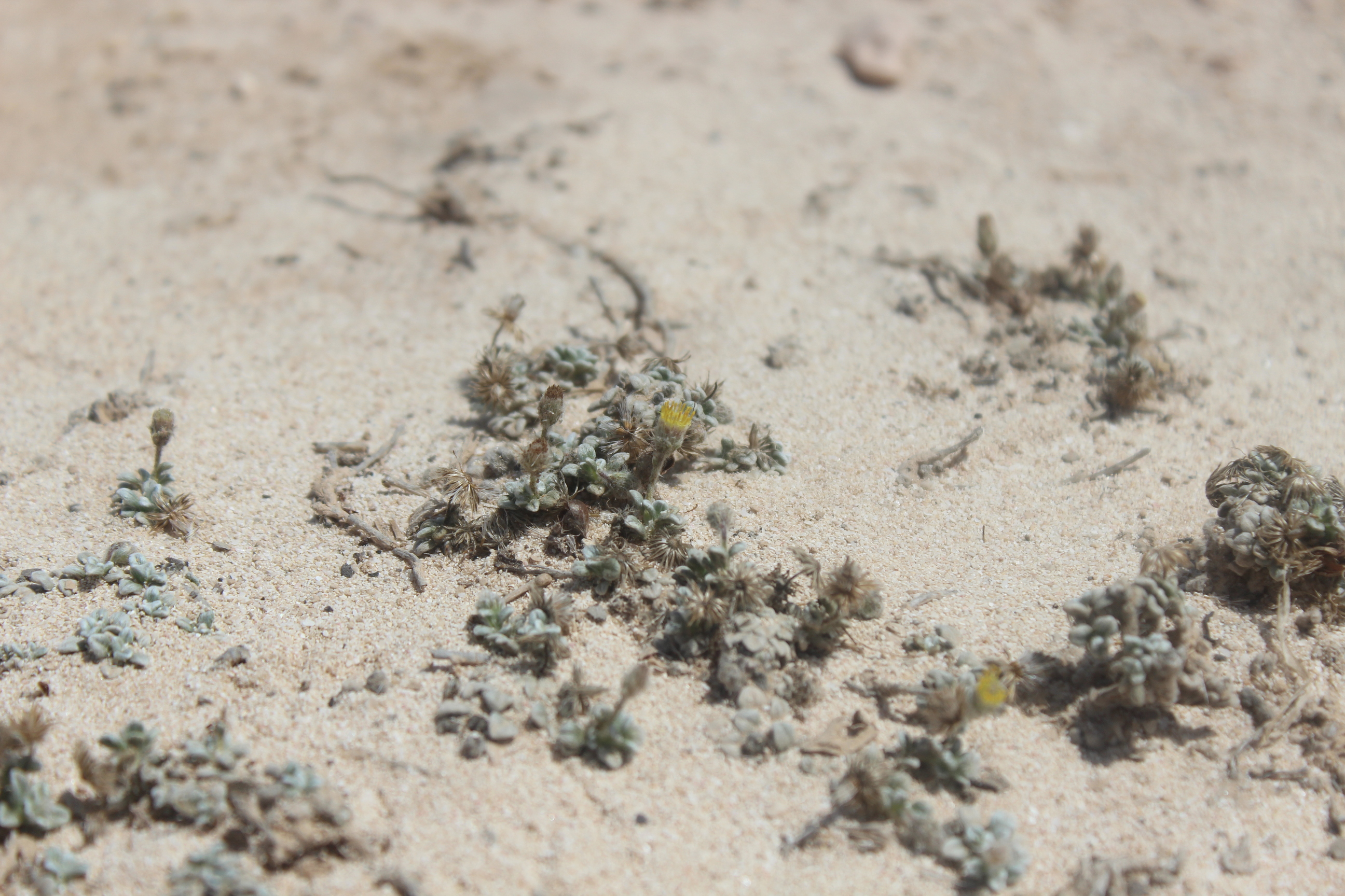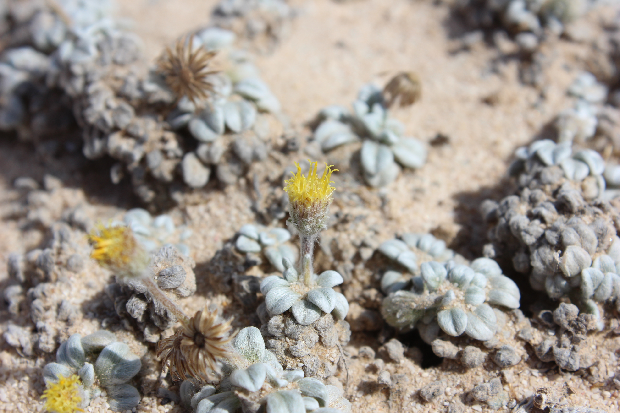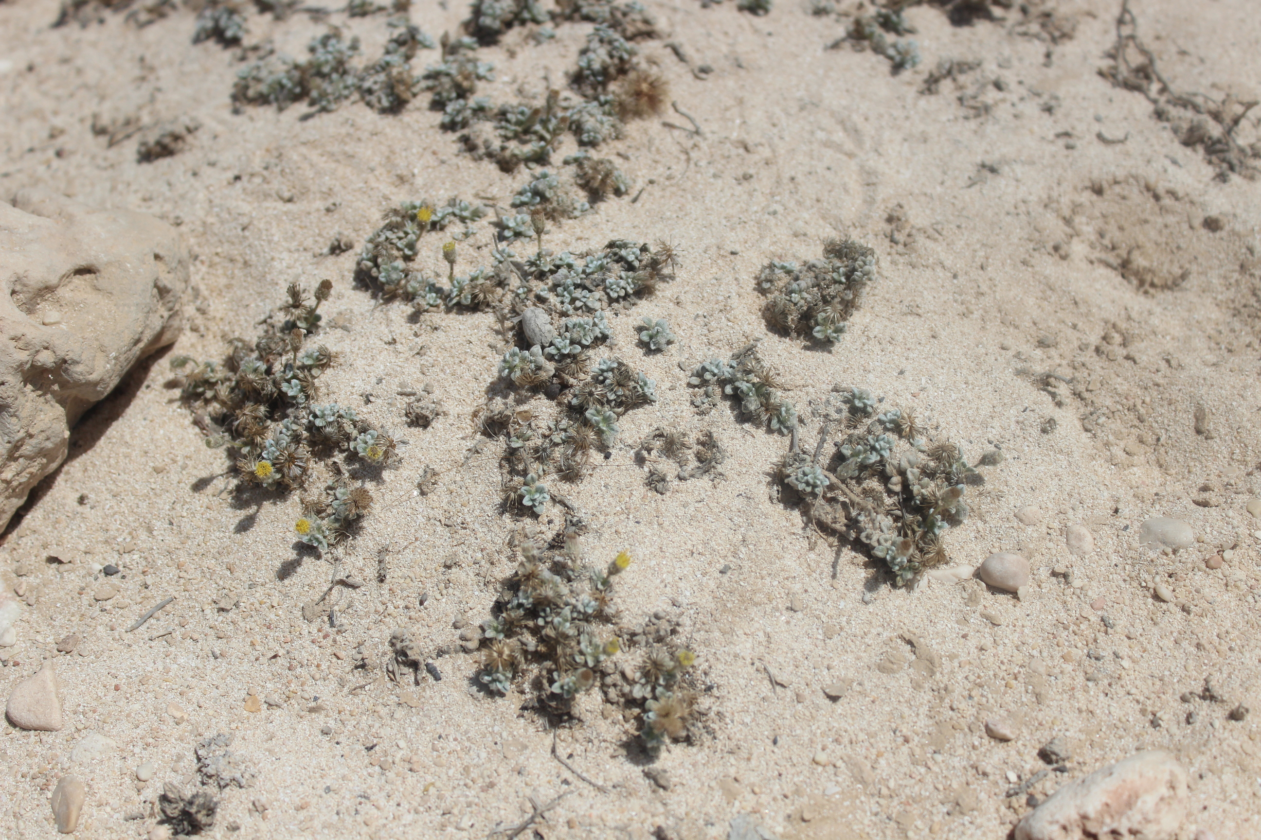 Mat forming perennial herb . Stems prostrate , delicate , leafy , long-hairy . Leaves up to 5 × 3 mm , obovate , entire , densely pilose . Inflorescences solitary , on up to ± 3 cm long , erect , filiform peduncles . Flowers pale yellow ; marginal flowers pistillate with very indistinct ray lamina ; disc flowers perfect , tubular . Fruit achenes , 1 . 3–1 . 4 mm long , cylindric , straw-coloured , smooth , apically (and sometimes , but less , basally) somewhat hairy . Seeds pappus of a corona ± 0 . 4 mm long and ± 10 bristles ± 3 mm long . (Ref . Flora of Oman ; vol . 3) .