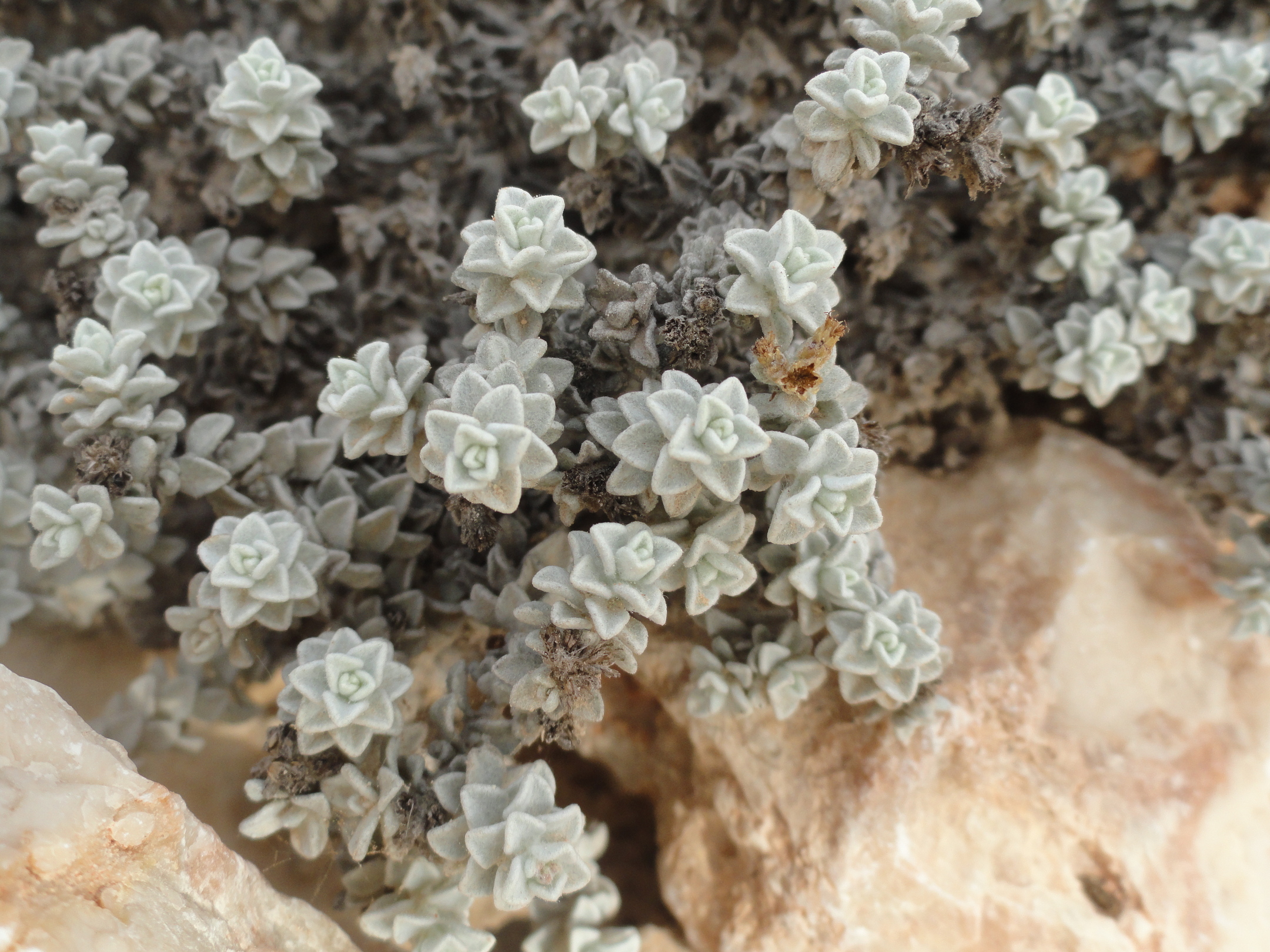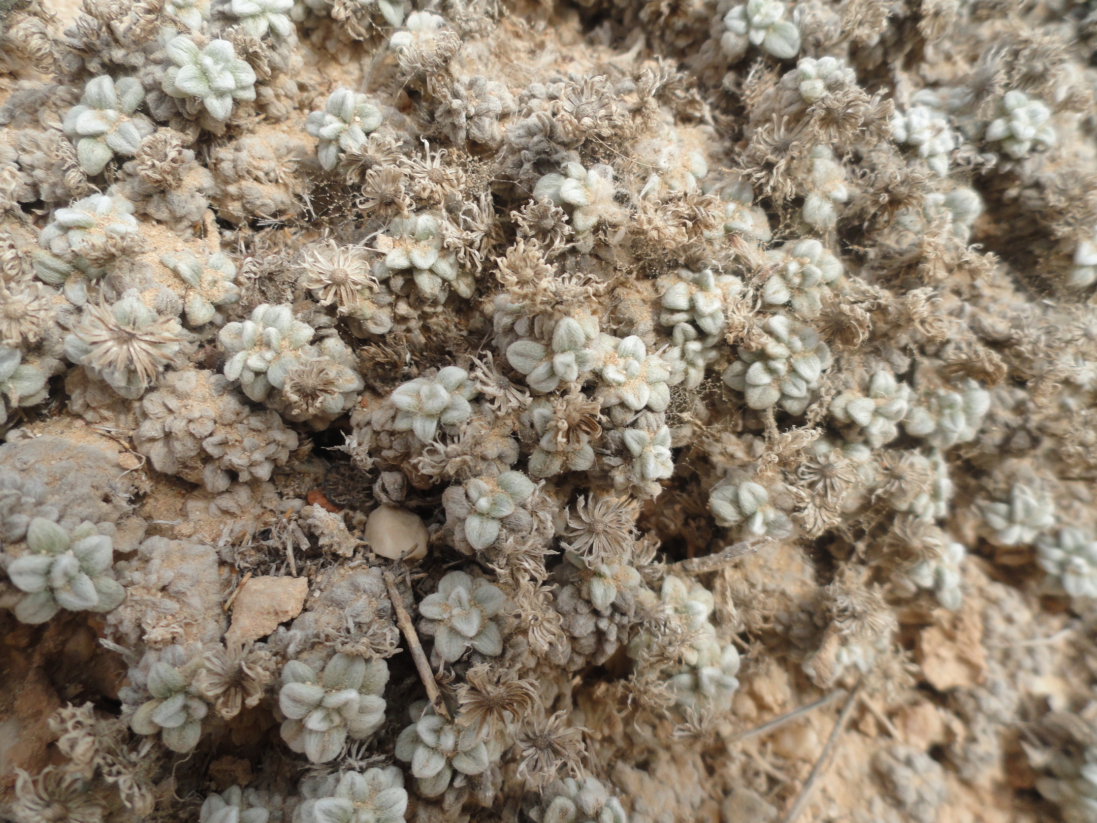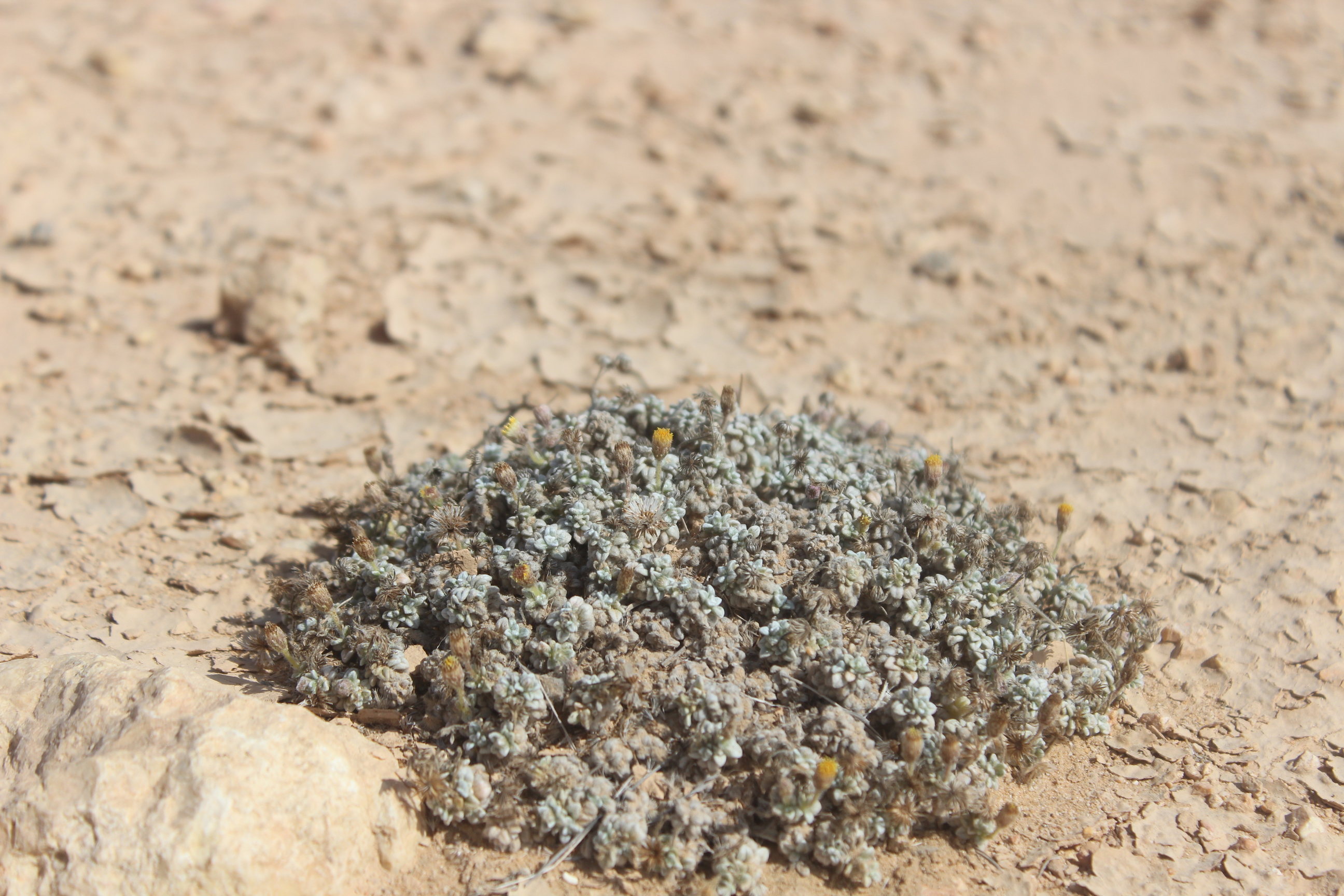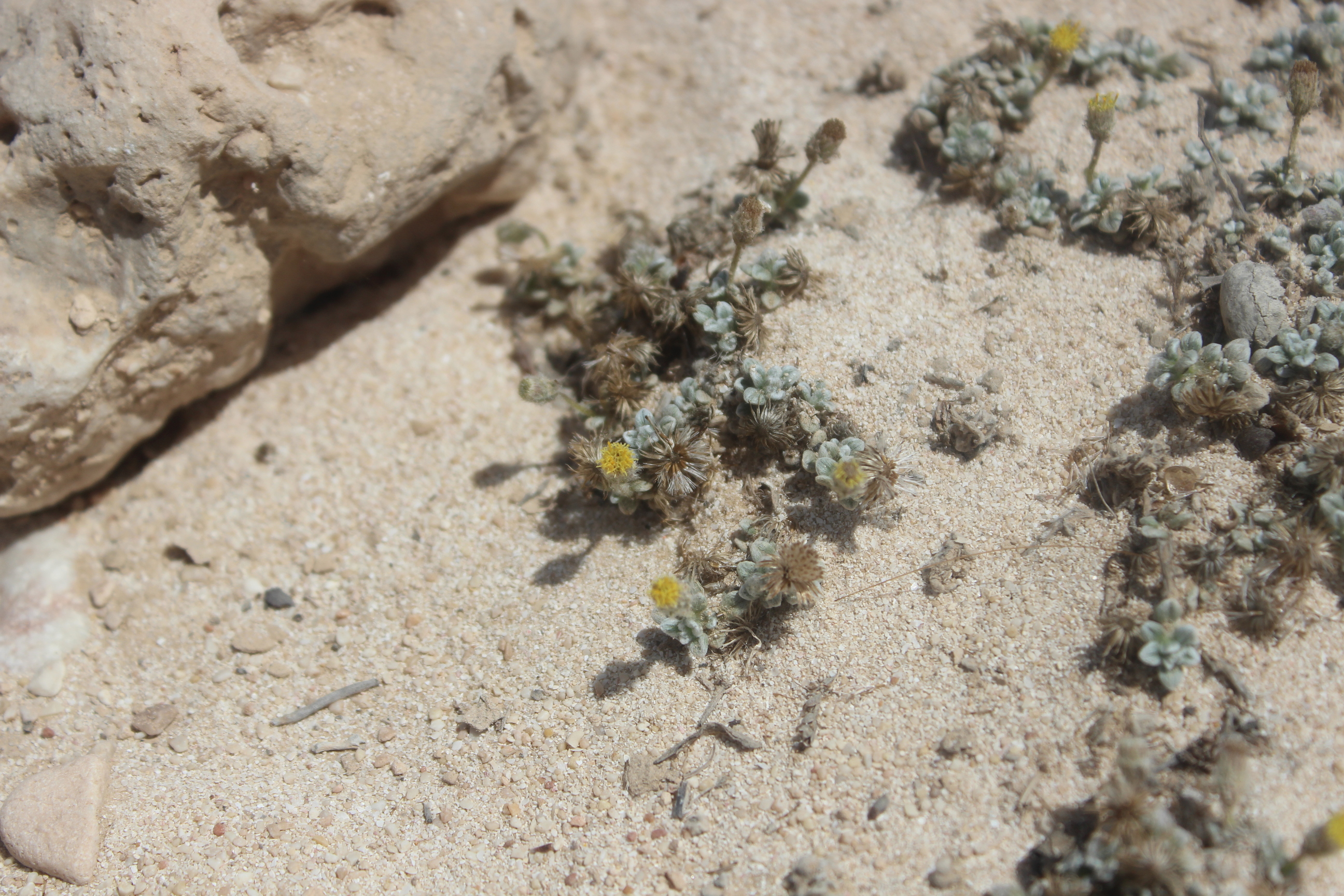 Mat forming perennial herb . Stems prostrate , delicate , leafy , long-hairy . Leaves up to 5 × 3 mm , obovate , entire , densely pilose . Inflorescences solitary , on up to ± 3 cm long , erect , filiform peduncles . Flowers pale yellow ; marginal flowers pistillate with very indistinct ray lamina ; disc flowers perfect , tubular . Fruit achenes , 1 . 3–1 . 4 mm long , cylindric , straw-coloured , smooth , apically (and sometimes , but less , basally) somewhat hairy . Seeds pappus of a corona ± 0 . 4 mm long and ± 10 bristles ± 3 mm long . (Ref . Flora of Oman ; vol . 3) .
