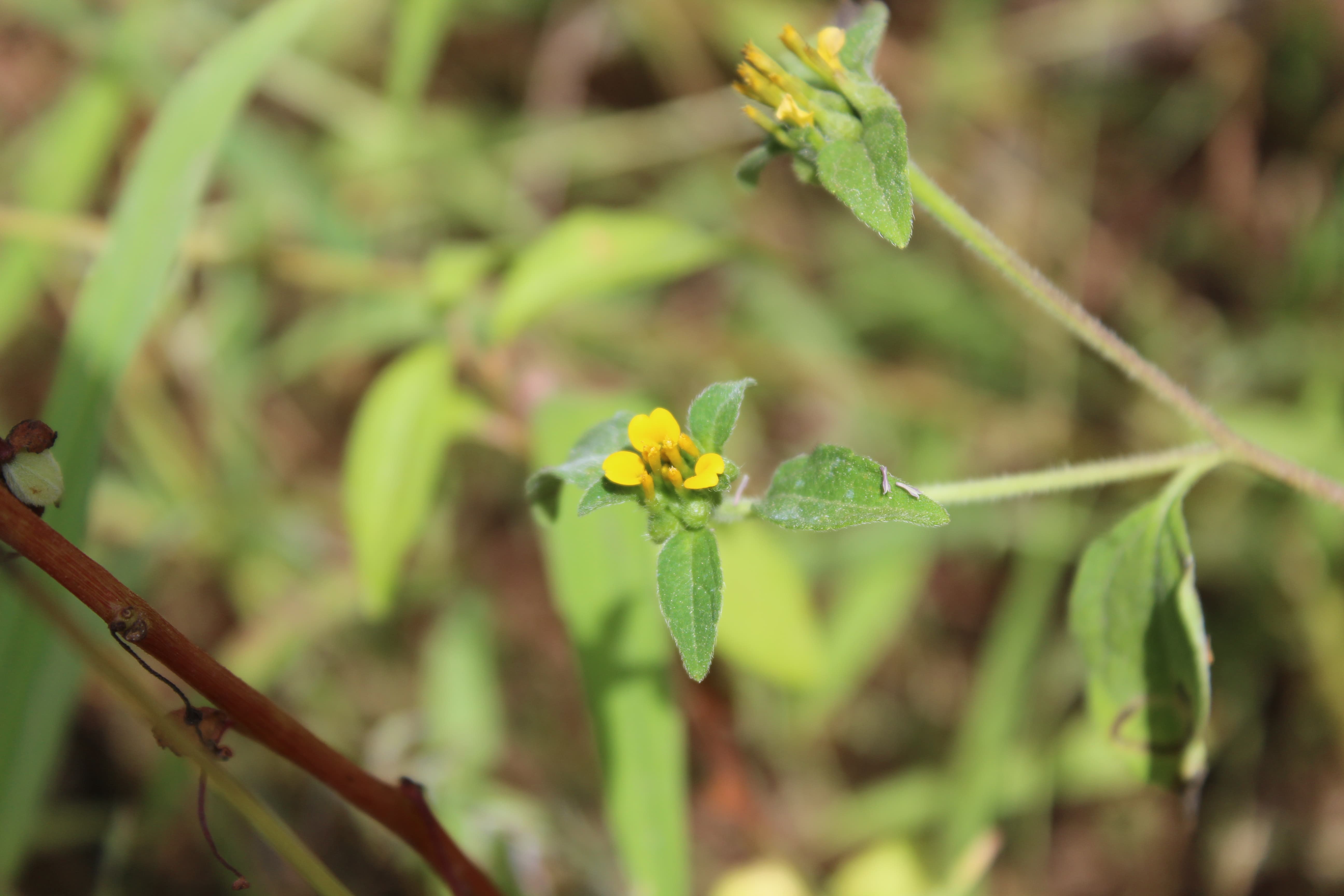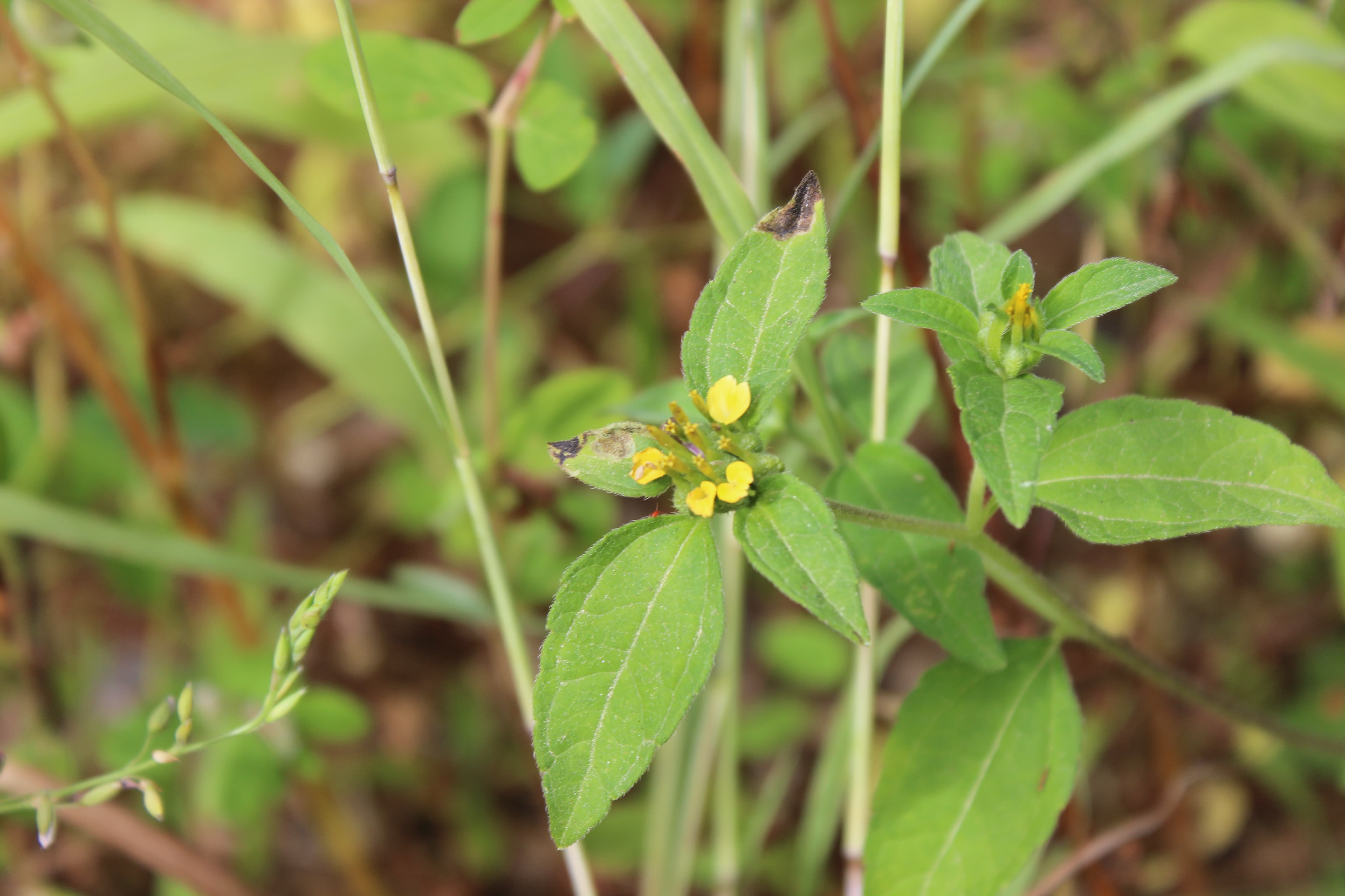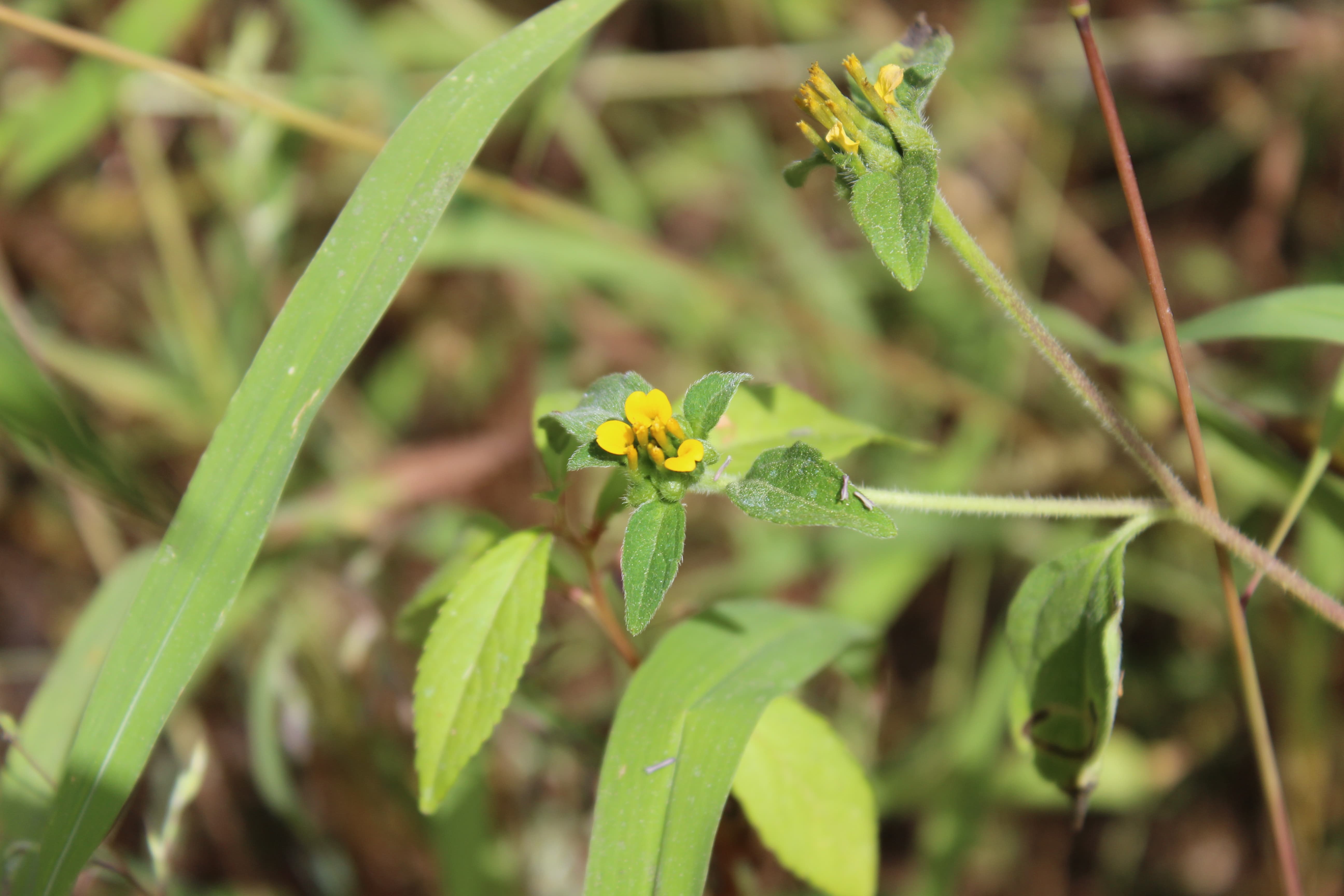 A weedy annual herb ; up to 1 m tall , scabrid to hispid in all parts . Stems erect , branched , leafy . Leaves opposite in the basal portion of the stem , alternate higher up , to 1 . 5 × 6 cm , ovate , basally cuneate , petiolate , apically acute , dentate . Inflorescences solitary at the end of branches . Flowers yellow ; ray flowers few , pistillate ; disk flowers perfect , tubular . Fruit achenes , 5–7 mm long , asymmetrically obovoid , black , overtopped by the firmly attached , clasping palaea . Seeds pappus , absent . (Ref . Flora of Oman ; vol . 3) .