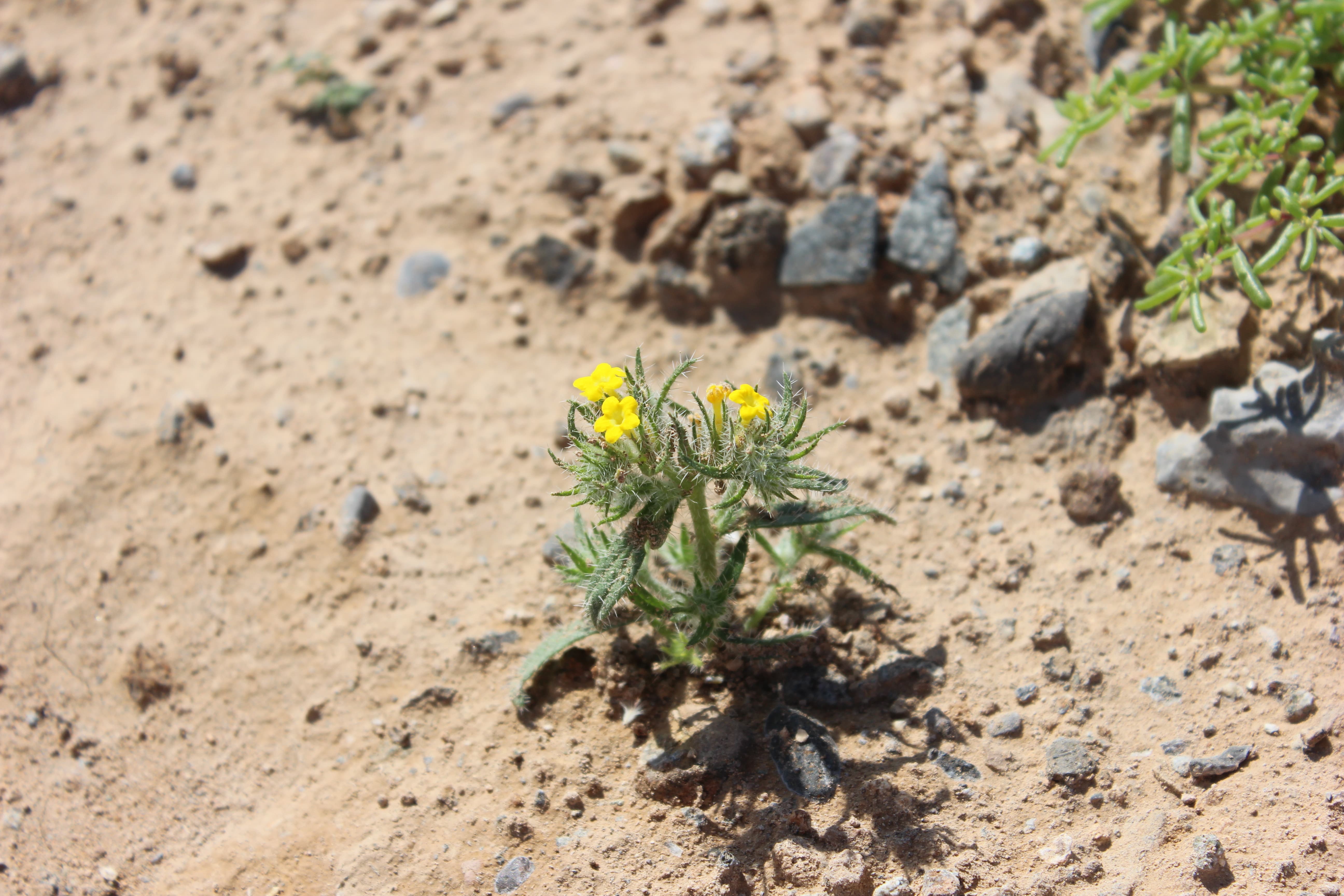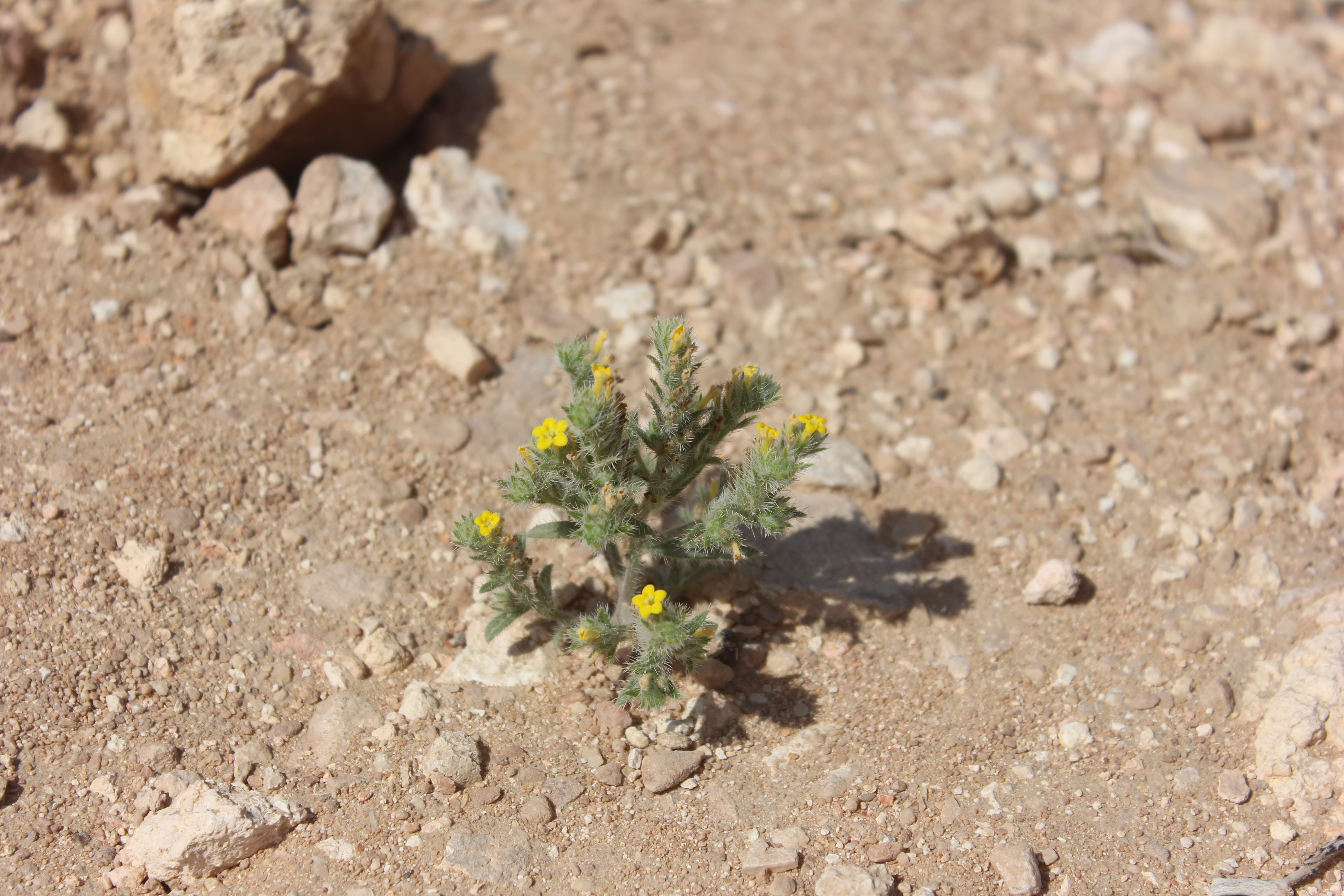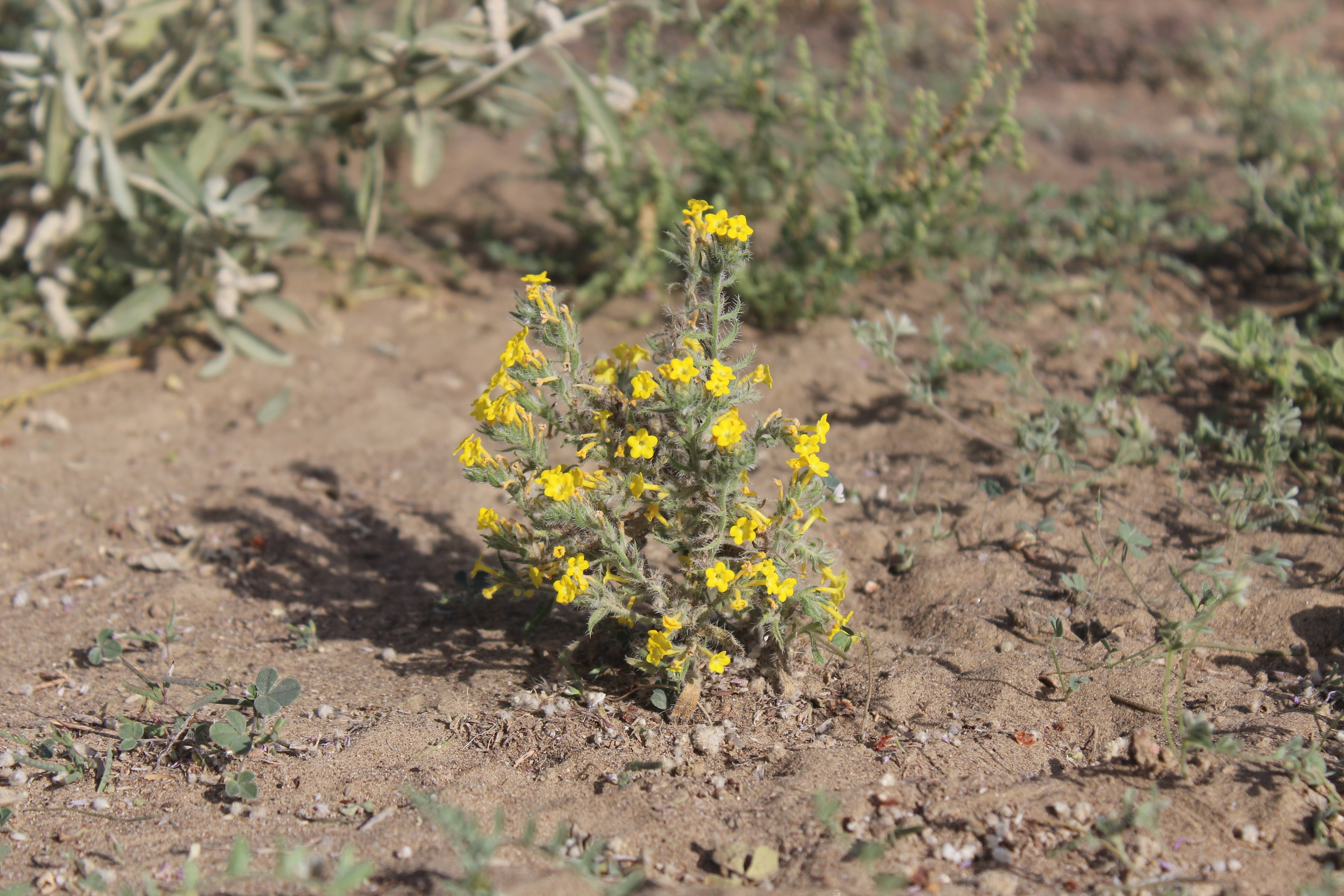 Erect annual or rarely perennial herb ; up to 5-25 cm high , with a woody base . Stems erect to ascending , branched , covered with hispid , long ± adpressed and short hairs . Leaves alternate , 10–50 × 2–7 mm , simple , greyish , without stipules , lanceolate or linear-lanceolate , base tapering or shortly petiolate , apex acute , margins entire , white hispid . Inflorescences solitary , in short cymes , subsessile ; bracts linear-lanceolate . Flowers bright yellow , bisexual , regular , slightly curved backwards ; calyx 5–8 mm , increasing in length ; lobes 5 , divided almost to base , linear ; corolla yellow , 10–15 mm , 5-lobed , hairy outside , glabrous or hairy inside ; tube cylindrical ; lobes a third of the tube , broadly rounded ; stamens 5 . Fruit nutlets , 4 , glossy . (Ref . Flora of Oman ; vol . 3) .