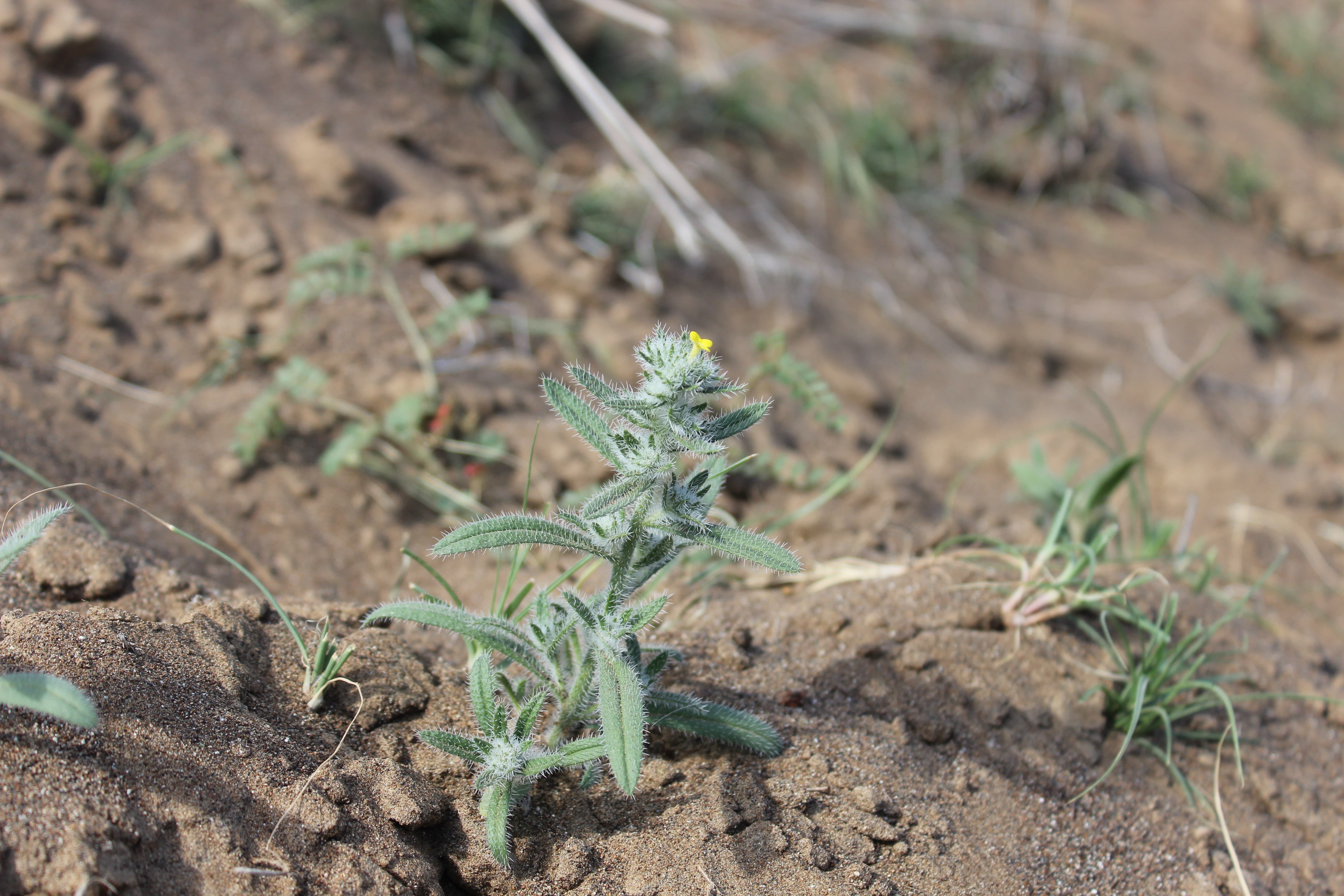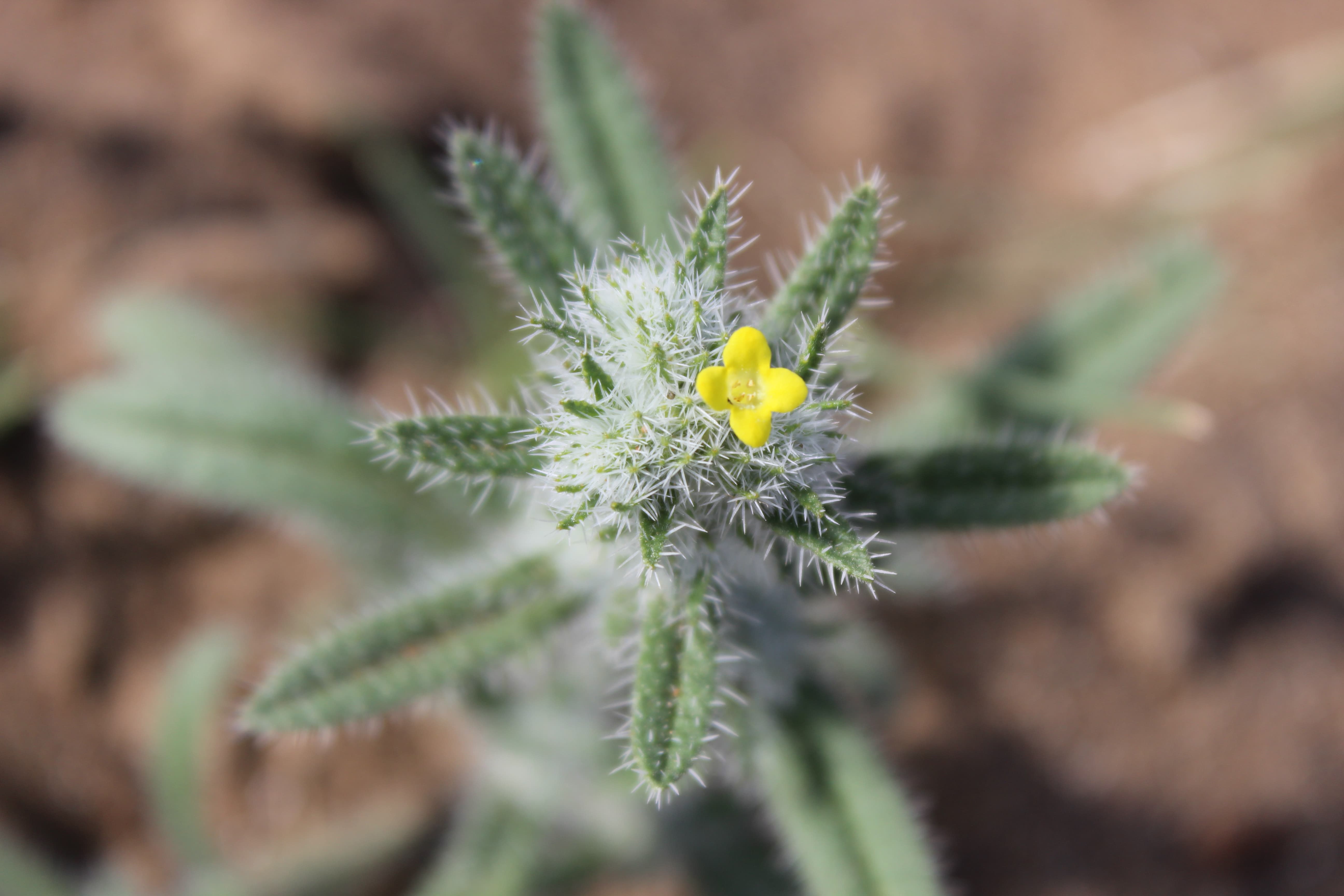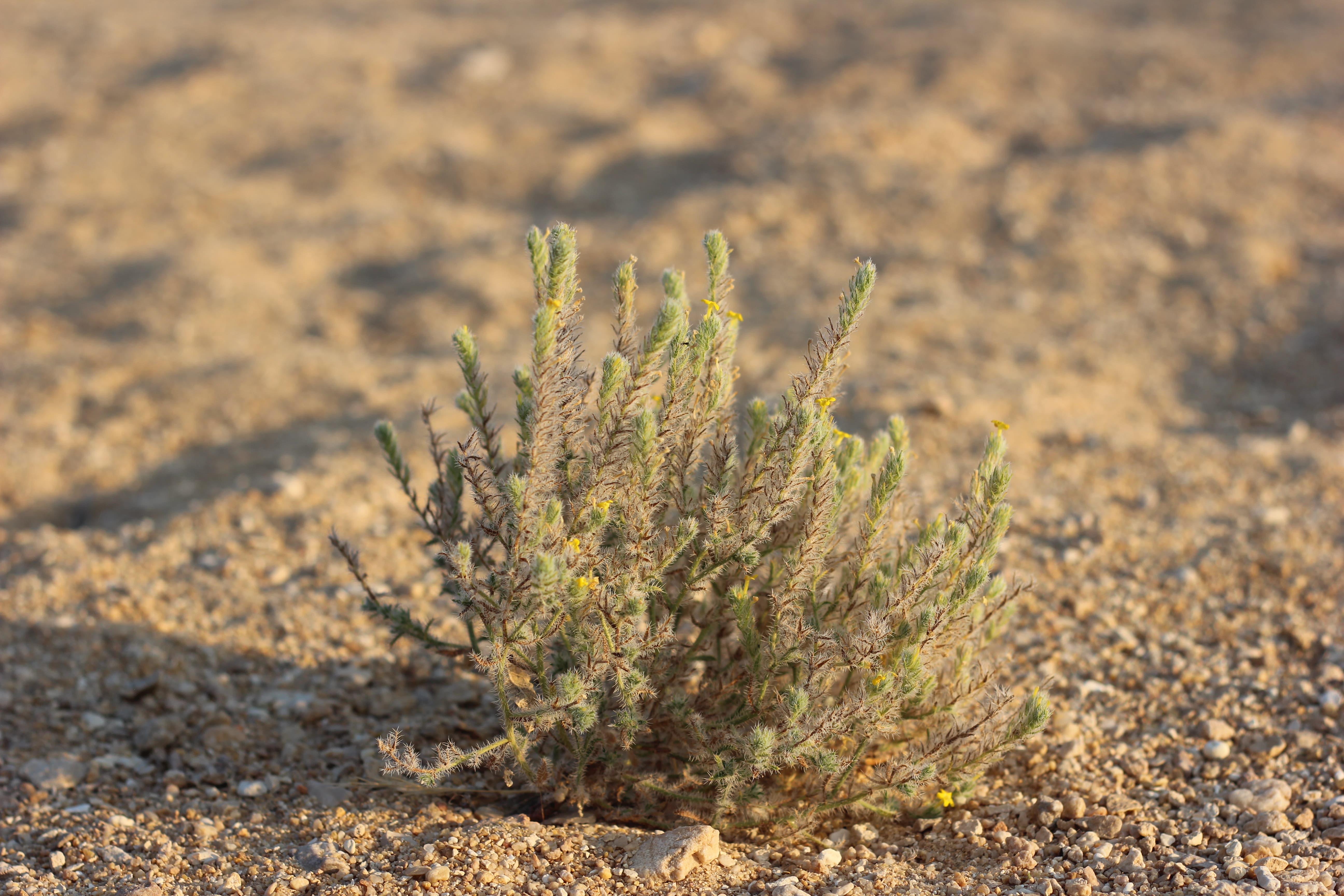 Erect annual or rarely perennial herb ; up to 5-25 cm high , with a woody base . Stems erect to ascending , branched , covered with hispid , long ± adpressed and short hairs . Leaves alternate , 10–50 × 2–7 mm , simple , greyish , without stipules , lanceolate or linear-lanceolate , base tapering or shortly petiolate , apex acute , margins entire , white hispid . Inflorescences solitary , in short cymes , subsessile ; bracts linear-lanceolate . Flowers bright yellow , bisexual , regular , slightly curved backwards ; calyx 5–8 mm , increasing in length ; lobes 5 , divided almost to base , linear ; corolla yellow , 10–15 mm , 5-lobed , hairy outside , glabrous or hairy inside ; tube cylindrical ; lobes a third of the tube , broadly rounded ; stamens 5 . Fruit nutlets , 4 , glossy . (Ref . Flora of Oman ; vol . 3) .