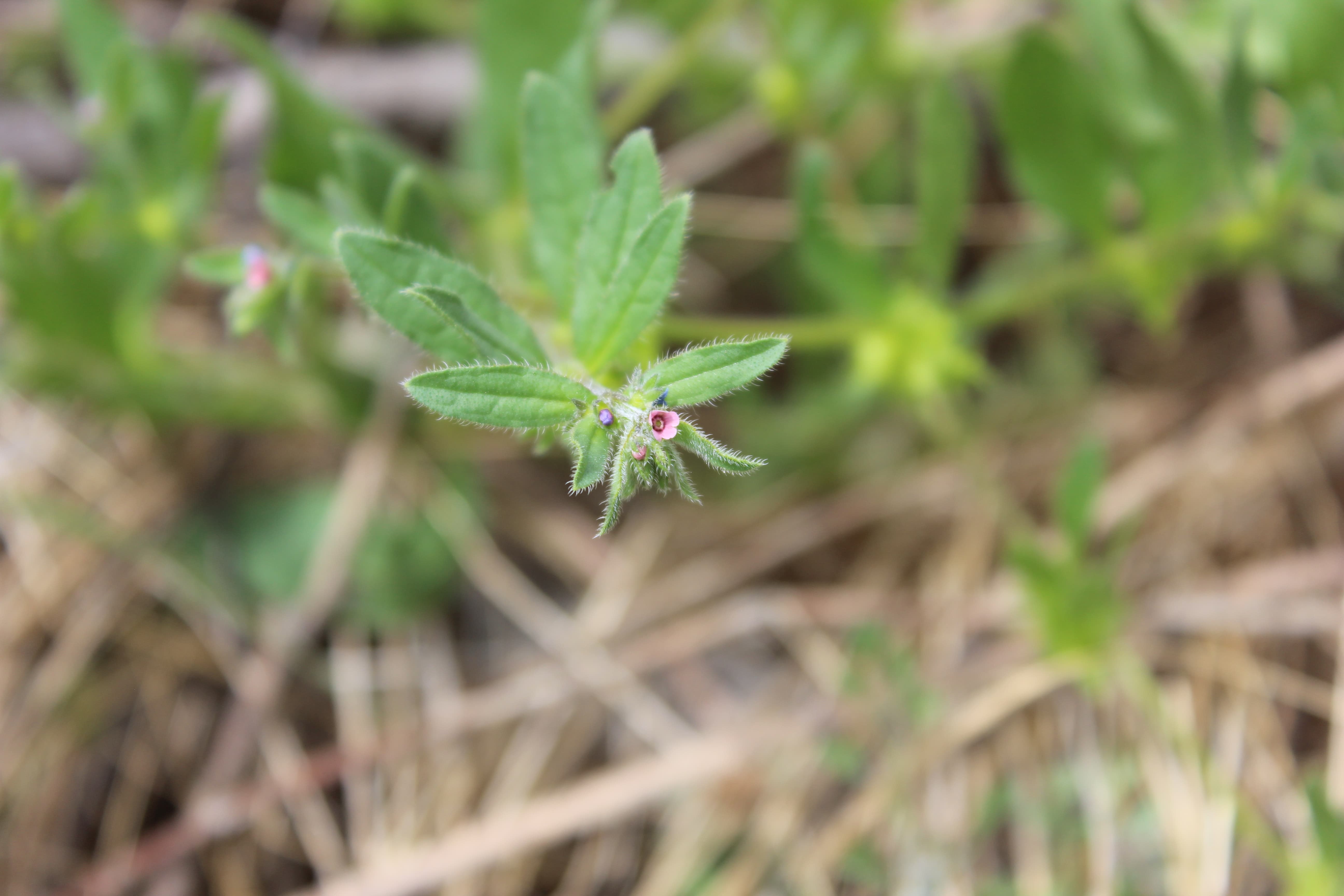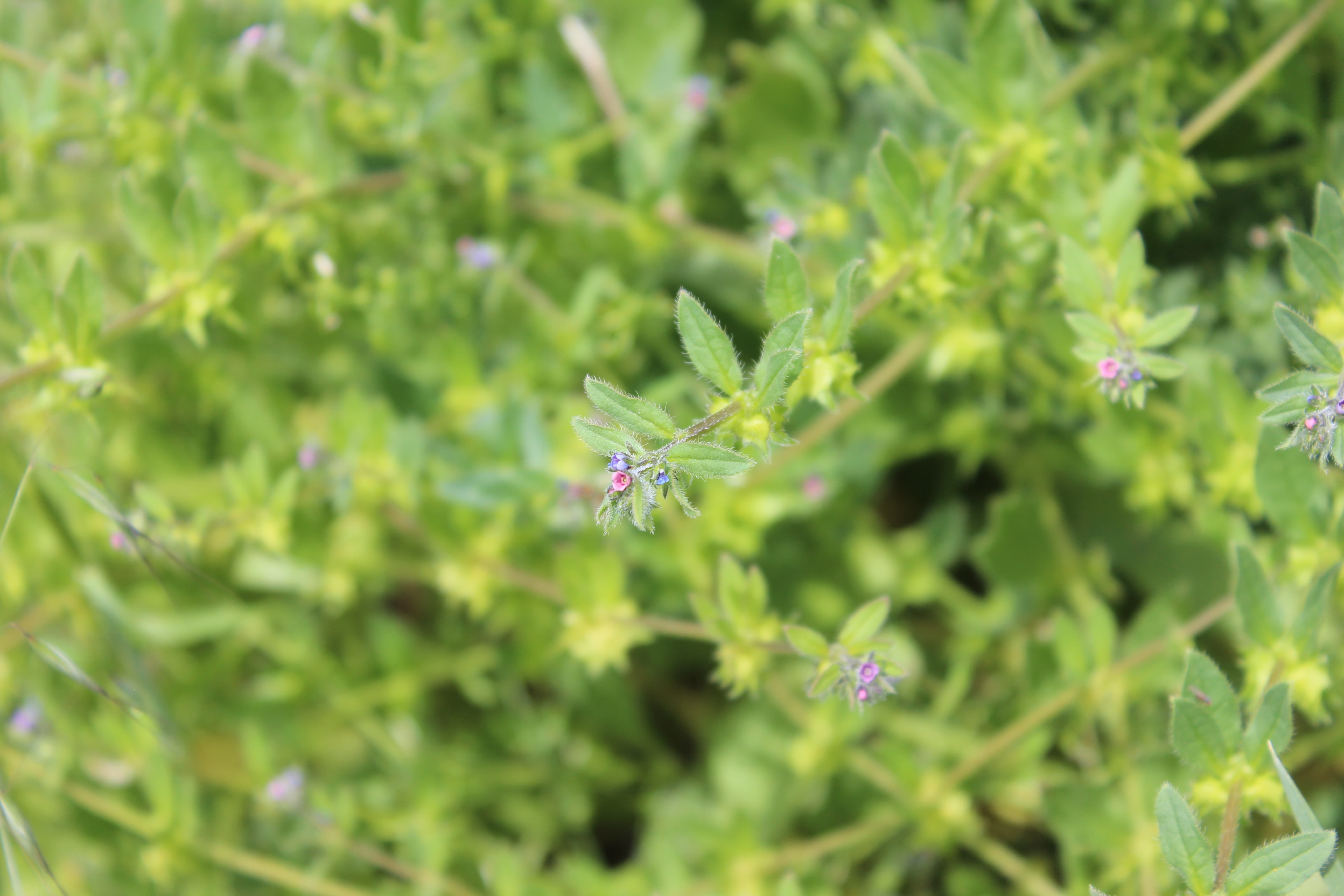 Annual herb ; up to 2 m tall , with bristly stout hairs . Stems ascending , simple or branched , weak , striate , hispid setose with adpressed hairs . Leaves opposite to partly alternate or sometimes whorled , 20–80 × 6–19 mm , oblanceolate to broadly lanceolate , base tapering , apex acute , margins entire , white hispid with bulbous-based hairs . Inflorescences solitary or paired , axillary ; pedicels 2–4 mm . Flowers blue , small , 2-4 mm long , radially symmetric , somewhat bell-shaped ; calyx ± 2 mm , nodding in fruit ; lobes 5 , divided almost to base , linear-lanceolate , nervose , accrescent , increasing in size and becoming folded , and enveloping the fruit ; corolla blue , 2–4 mm , 5-lobed ; tube cylindrical ; lobes as long as tube , broadly rounded ; anthers are c . 0 . 5 mm long , ovate ; style 0 . 5 mm ; stigma subcapitate . Fruit nutlets , 4 , laterally compressed , dark , shiny , brownish yellow to brown , minutely tuberculate . (Ref . Flora of Oman ; vol . 3) .