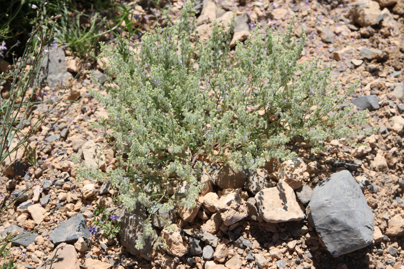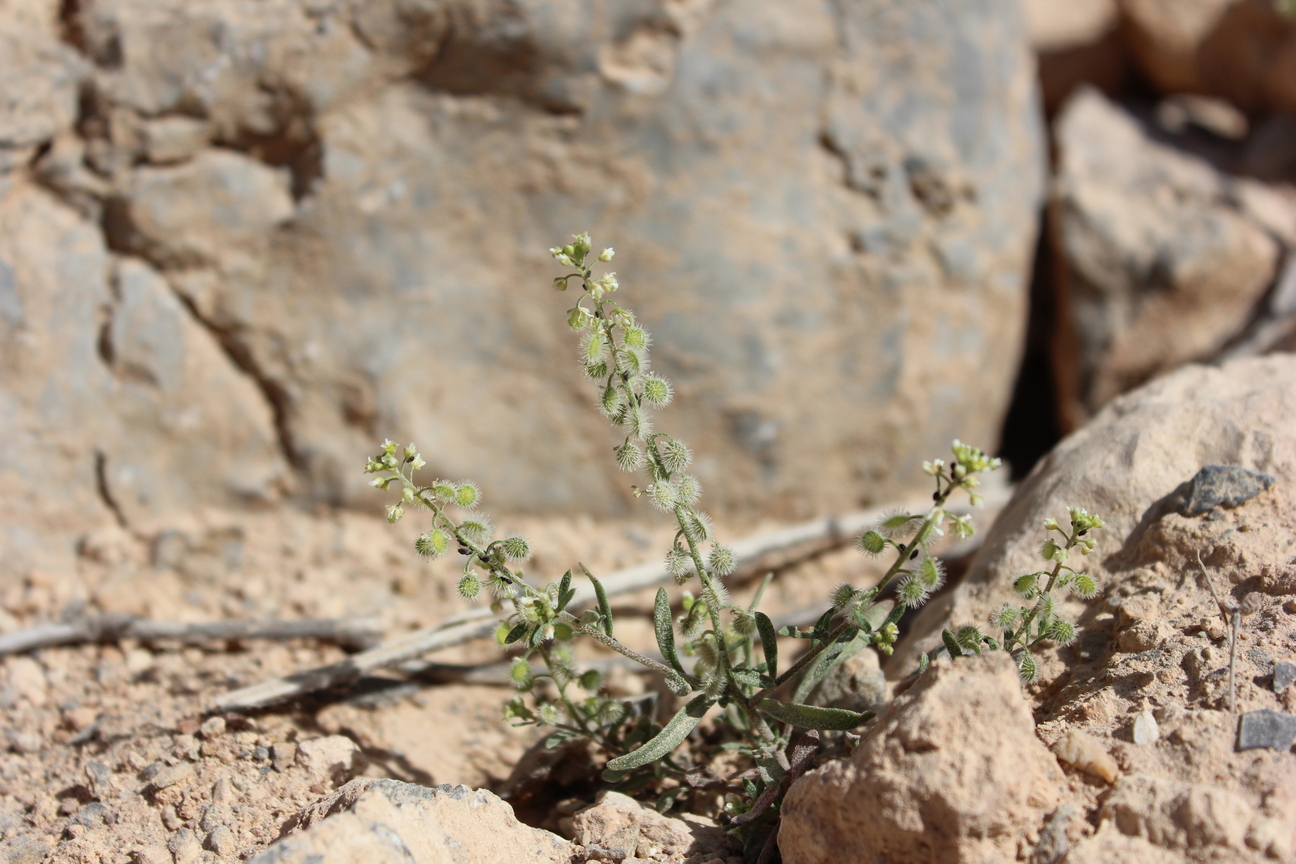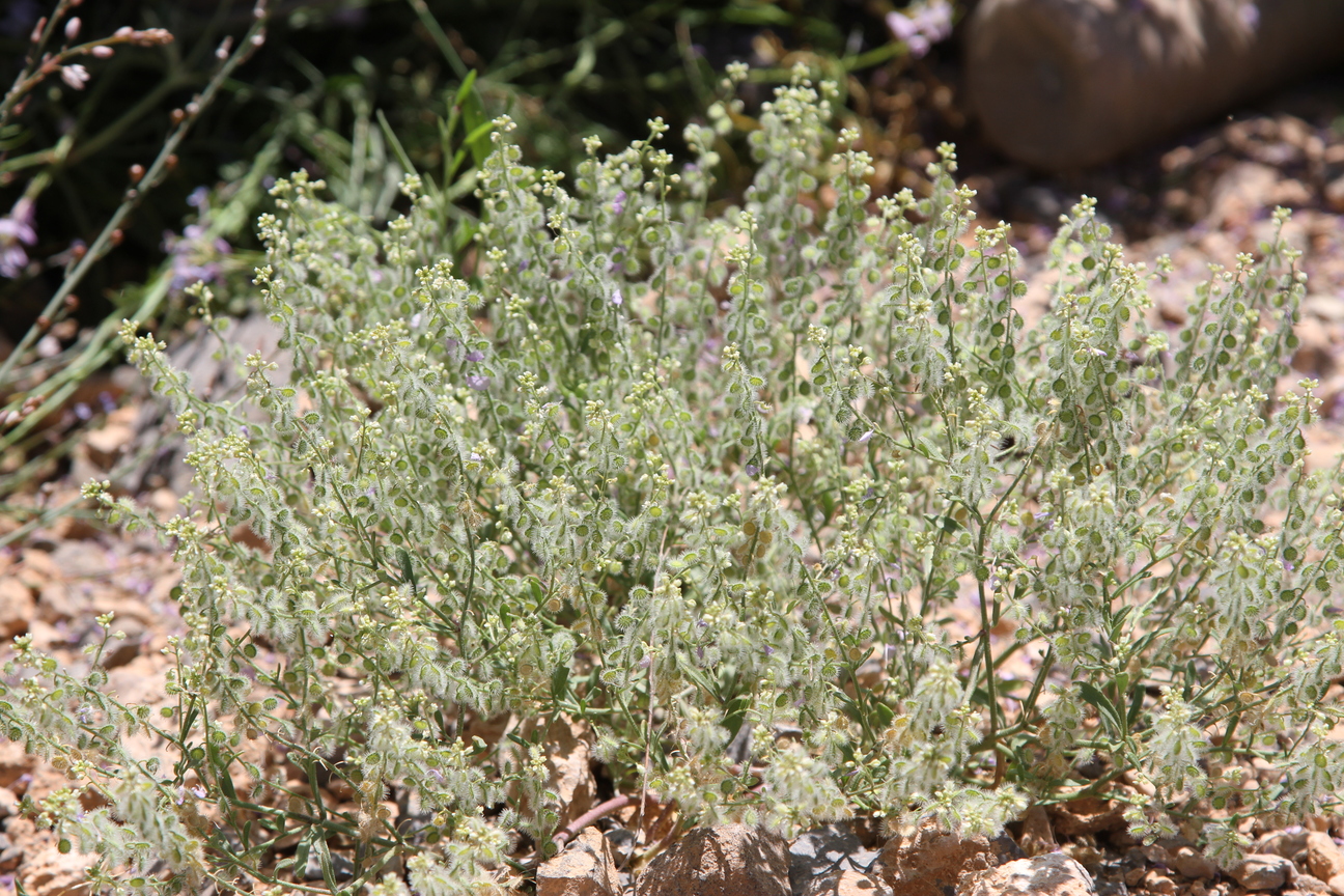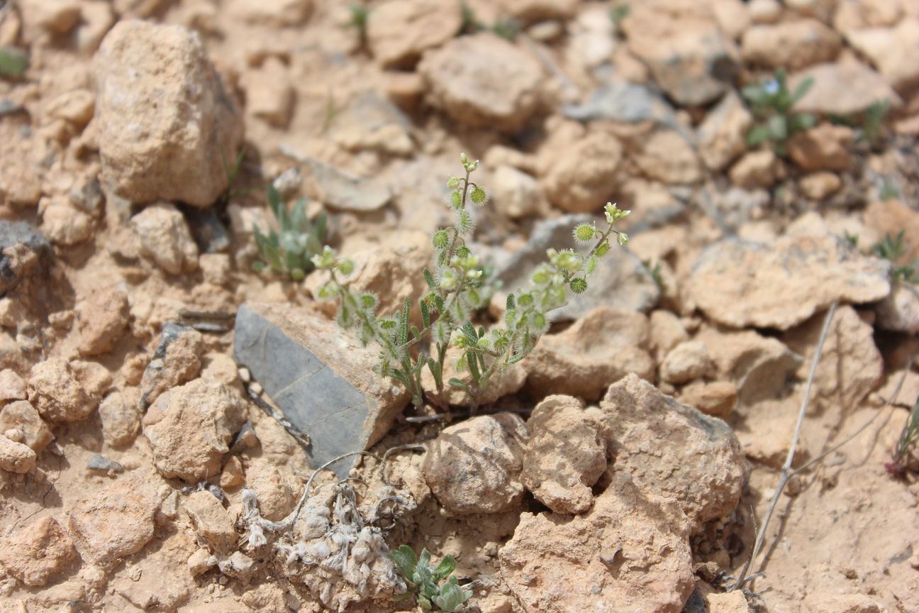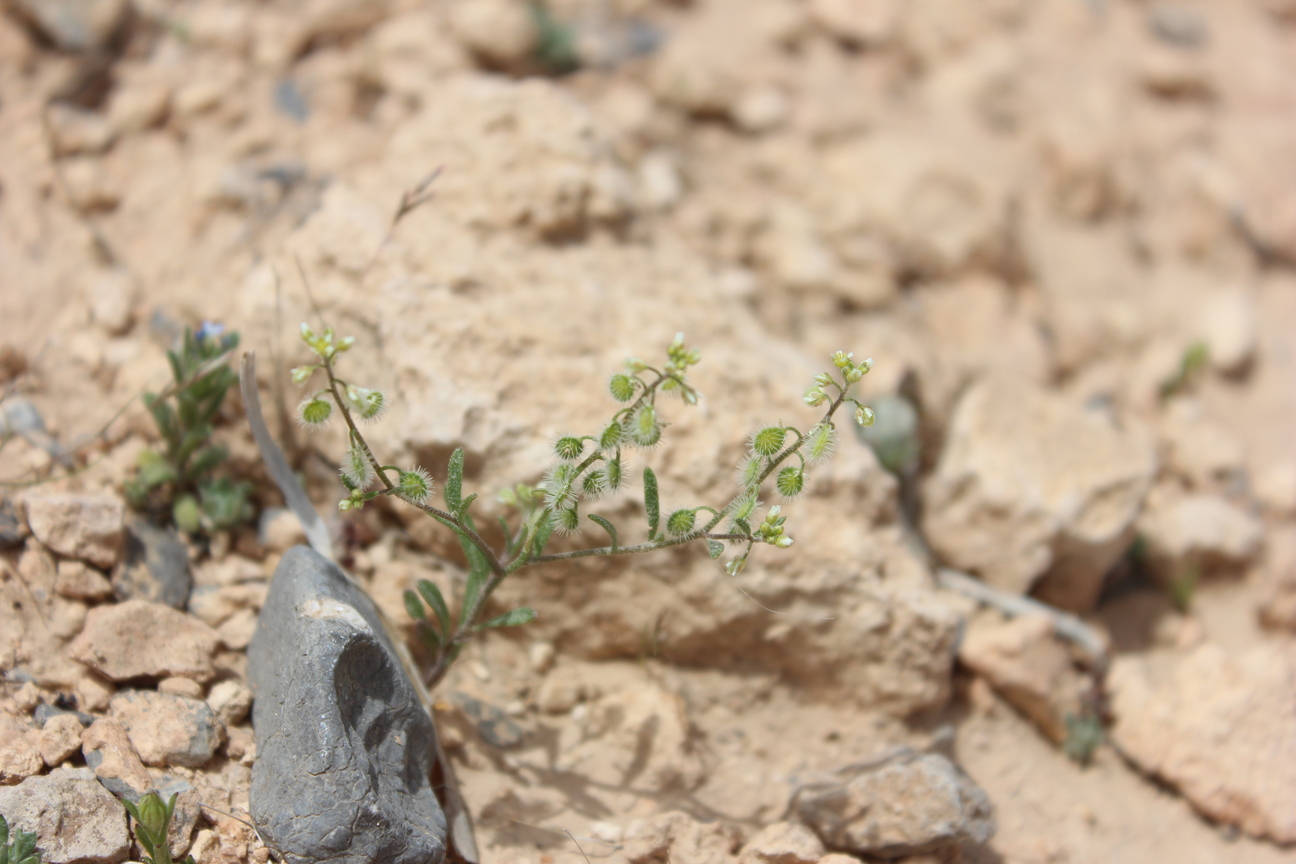 Delicate annual herb ; up to 20 cm high . Stems simple or branched , with stellate hairs . Leaves 5–20×1–3 mm , sessile , lanceolate to spatulate , apex acute , base tapering . Inflorescences in 20-50-flowered racemes , lax . Flowers yellow to white ; sepals ± 1 mm ; petals ± 1 . 5 mm , yellow to white ; stamens 6 , filaments toothed . Fruit siliqua , pendulous , 3 . 5–4 . 5 mm in diameter , suborbicular , without a pale margin , emarginate , densely covered with stiff , minutely barbulate hairs . (Ref . Flora of Oman ; vol . 1) .