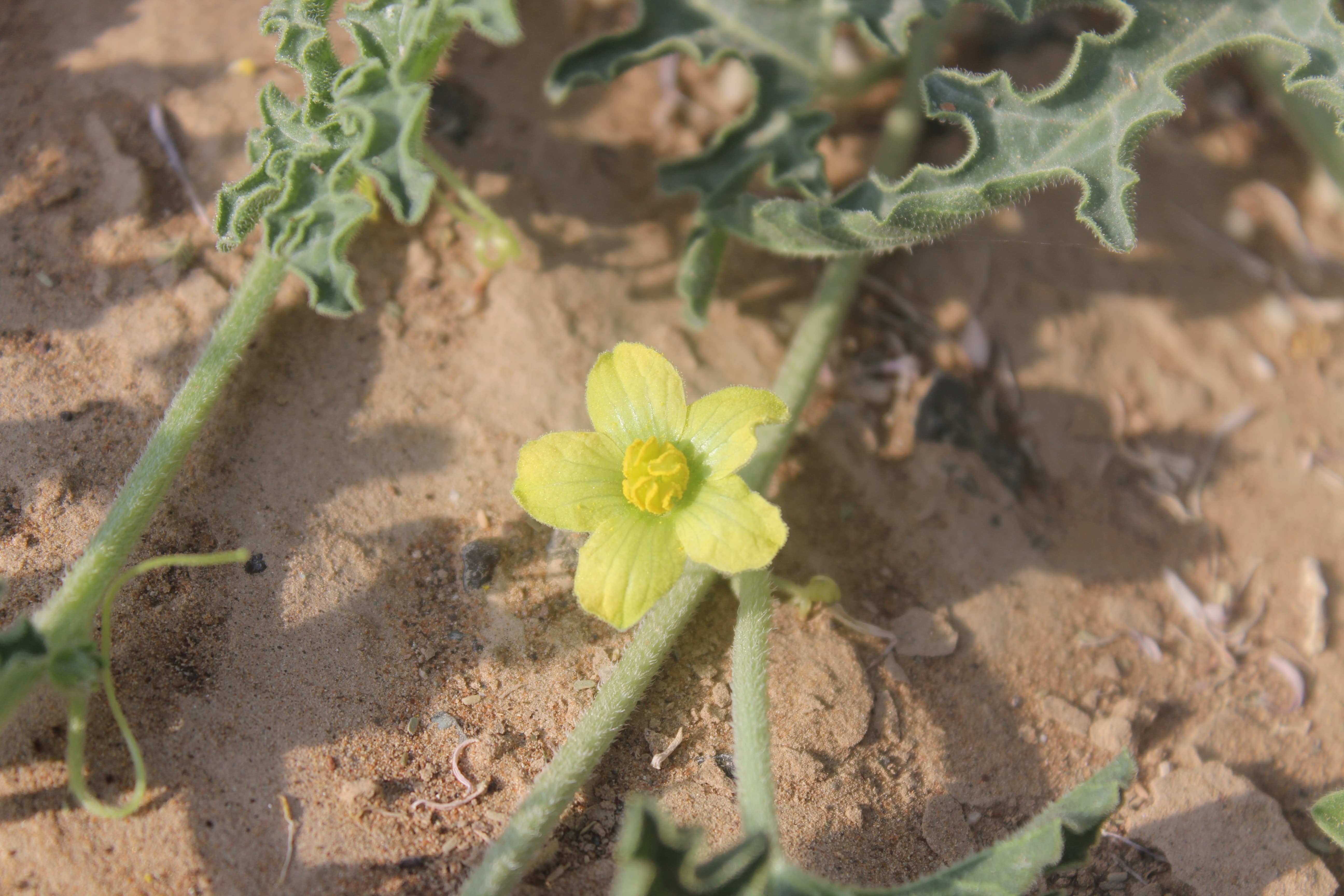 Trailing perennial herb , upt o 3 m or long , with tuberous rootstock , scabrid . Stems angled , prostrate , creeping , up to 2 m long . Leaves alternate , grey/green , triangular in shape , ovate to cordate in outline , deeply 3-5-lobed , apex obtuse to acute , base cordate , margin entire , sinuate , retrorsely hispid or scabrid , petiolate ; tendrils simple , appearing from the leaf nodes . Inflorescences solitary , arising from the leaf axils . Flowers sepals lanceolate ; petals obovate , greenish-yellow . Fruit large , round , smooth , turning from green with yellow stripes to yellow as they ripen ; pulp white , very bitter . Seeds ovate in outline , dark brown , smooth . (Ref . Flora of Oman ; vol . 1) .
