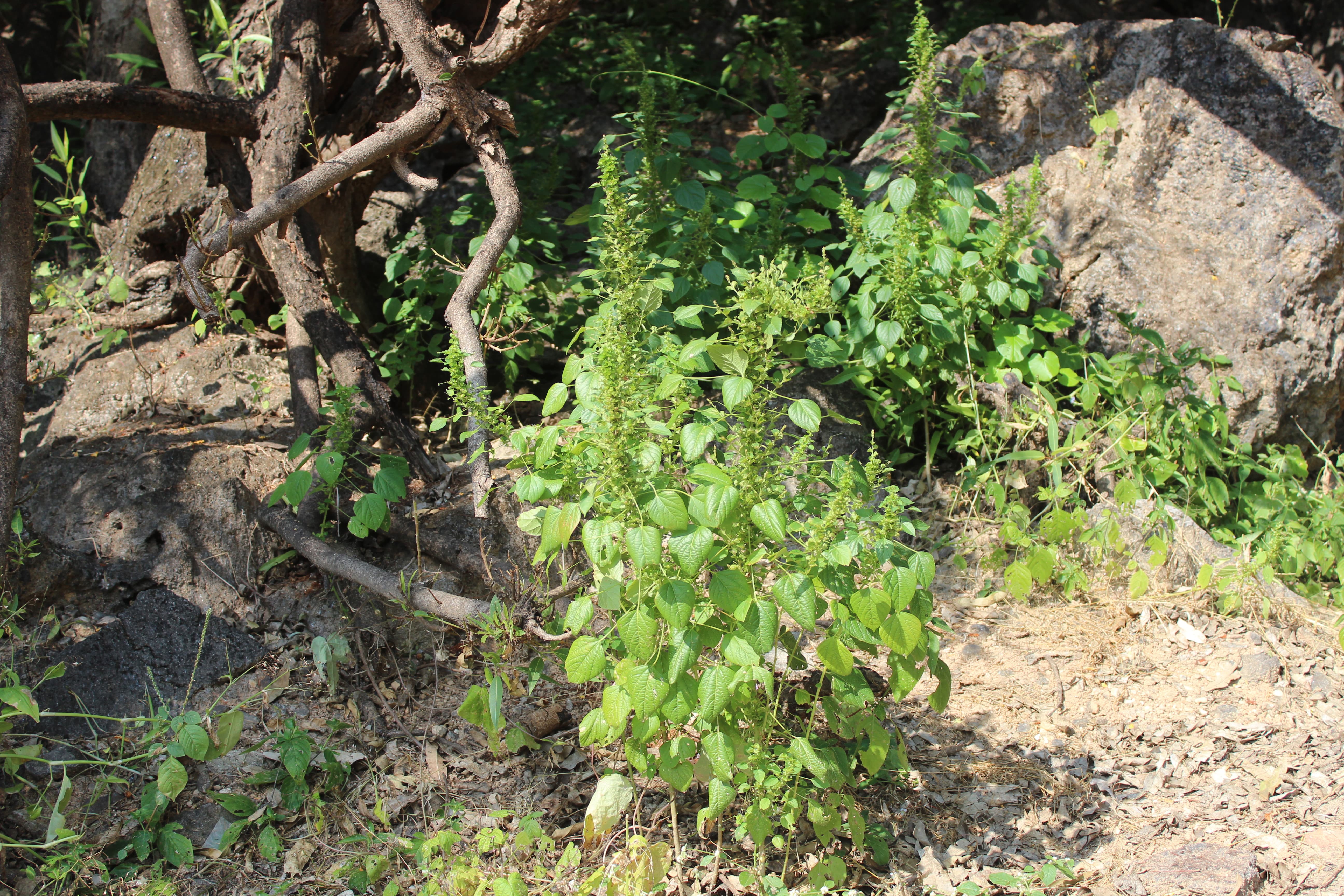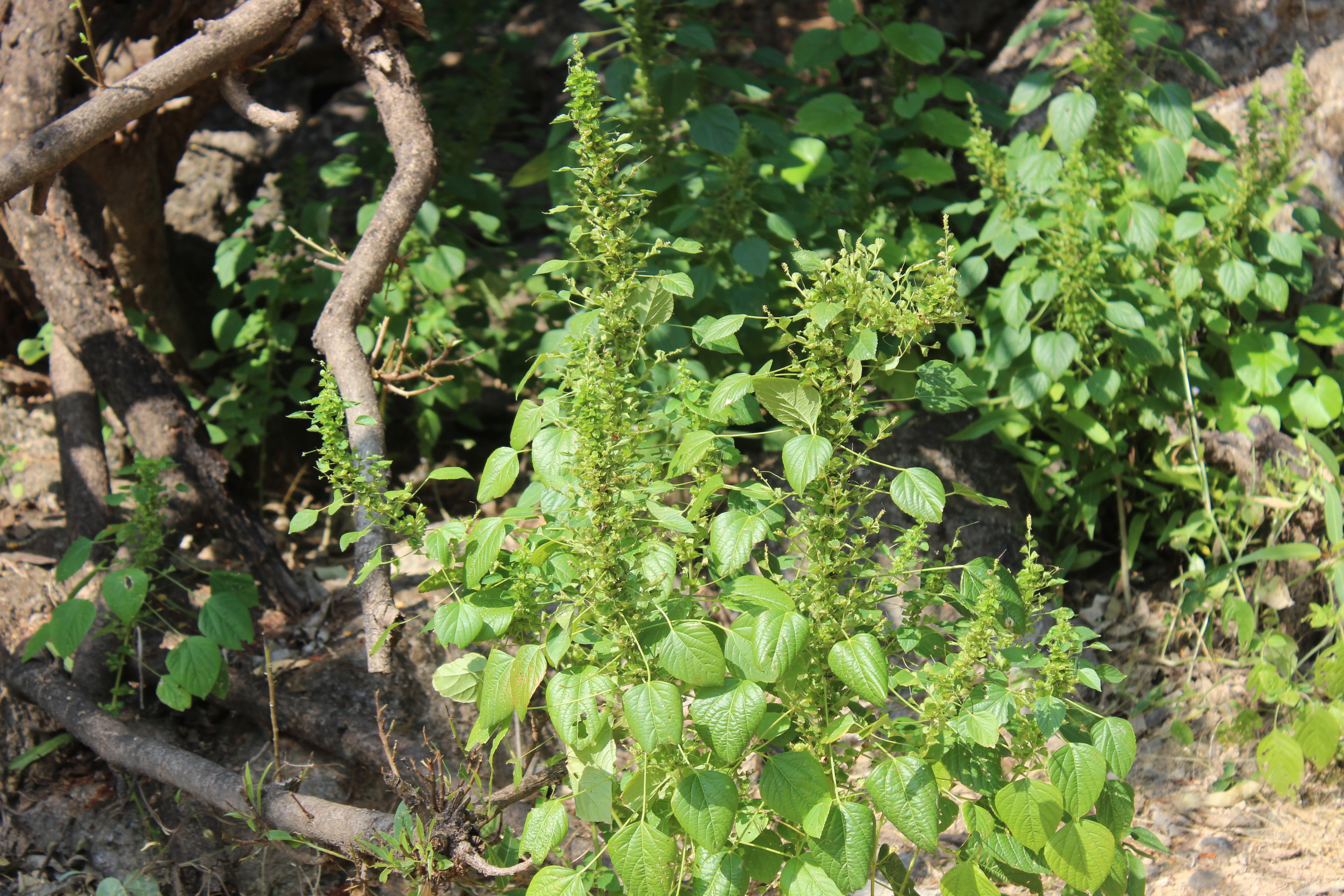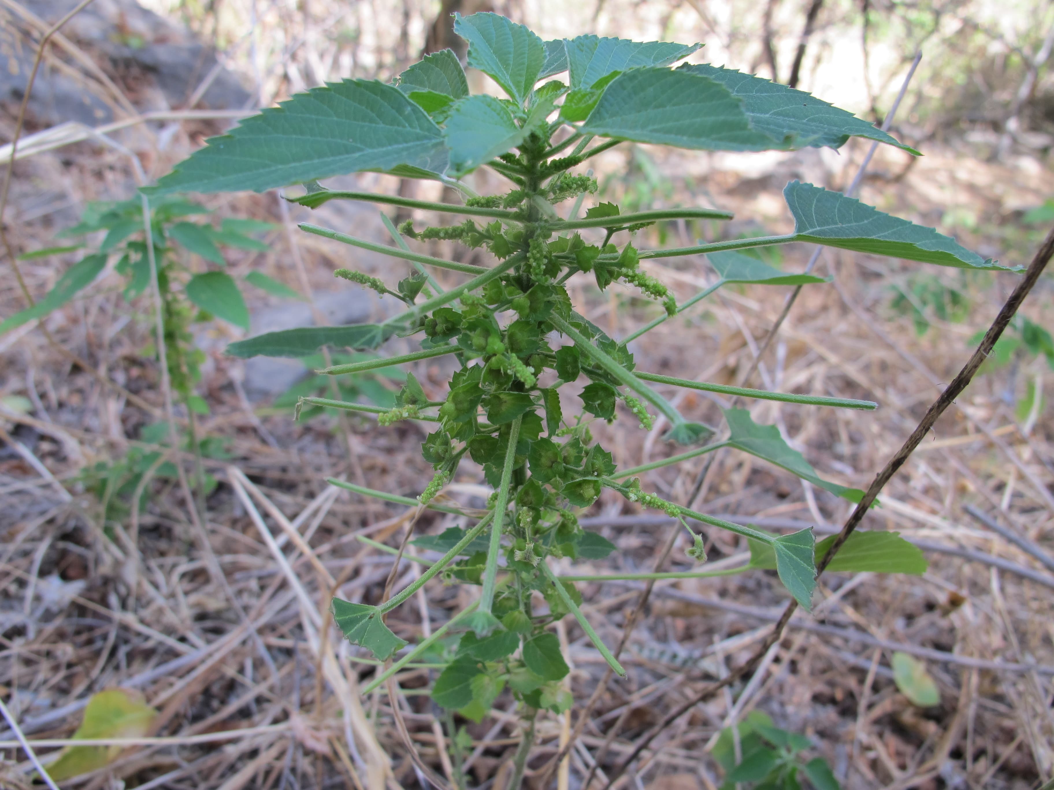 Monoecious . Erect woody annual herb or subshrub ; up to 80 cm tall or more . Stems erect , sparingly to evenly crisped-puberulous or tomentose . Leaves alternate , 2-9 x 1-5 cm , ovate , acute apex , base rounded , margin serrate , glabrescent or sparsely pubescent ; stipules setaceous ; petiole up to 10 cm . Inflorescences catkin-like , in groups of 3-5 , on spikes borne in leaf axils or terminally , up to 10 cm long . Flowers bisexual , small . Male flowers: minute , ± 1 mm , white-green , subsessile or shortly pedicellate ; sepals 4 ; petals absent ; arranged in a slender spike . Female flowers: green , sessile ; sepals 3 , triangular-ovate , ciliate ; petals absent ; in groups of 3-5 subtended and surrounded by a bract with toothed margins . Fruit capsule , 2-3 mm in diameter , 3-lobed , tuberculate and pubescent . Seeds 1 . 3 x 1 mm , ovoid , small , ± smooth , grey or brown , with a flattened linear caruncle . (Ref . Flora of Oman ; vol . 2) .