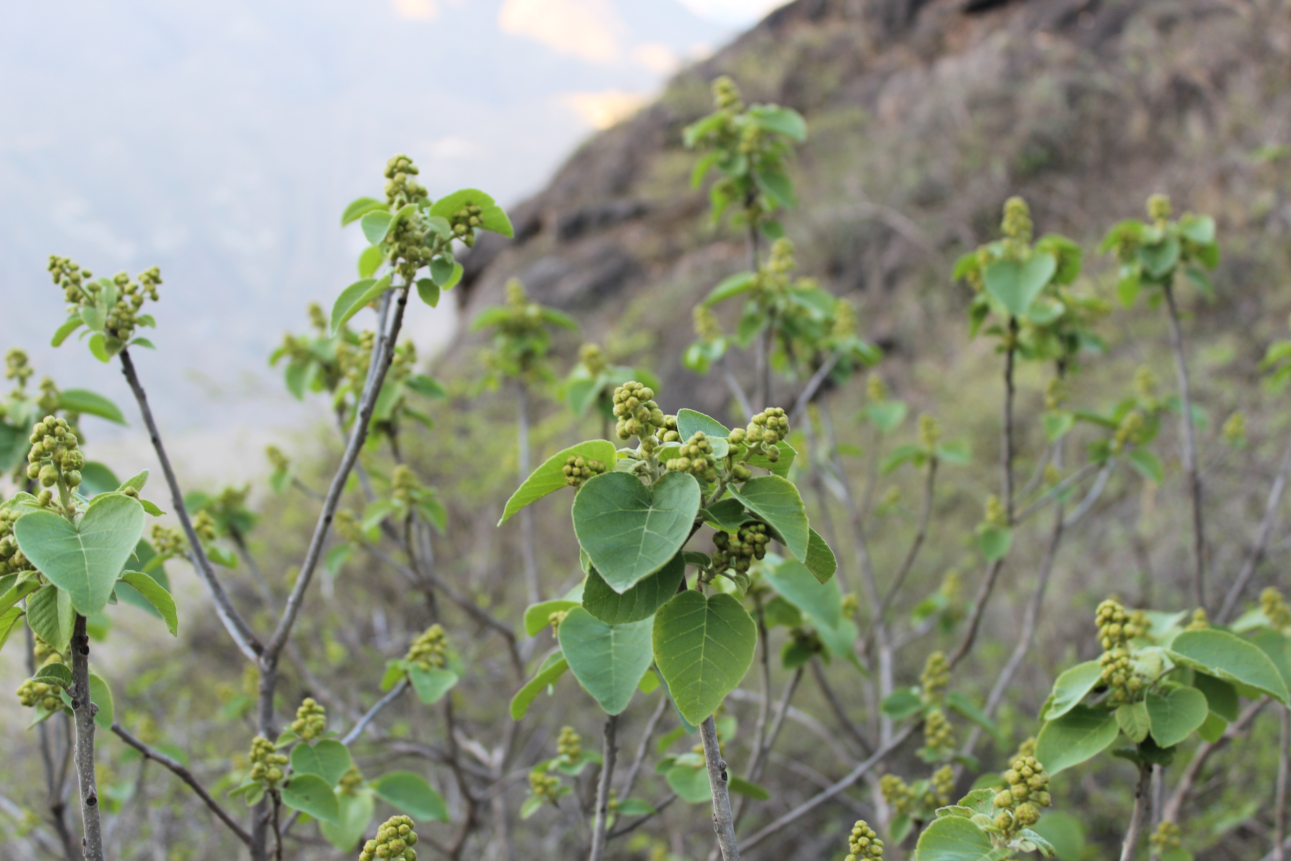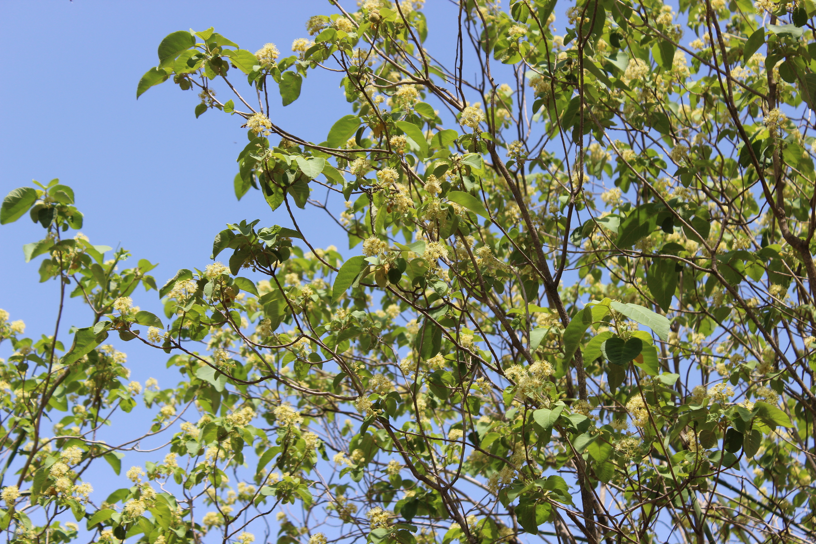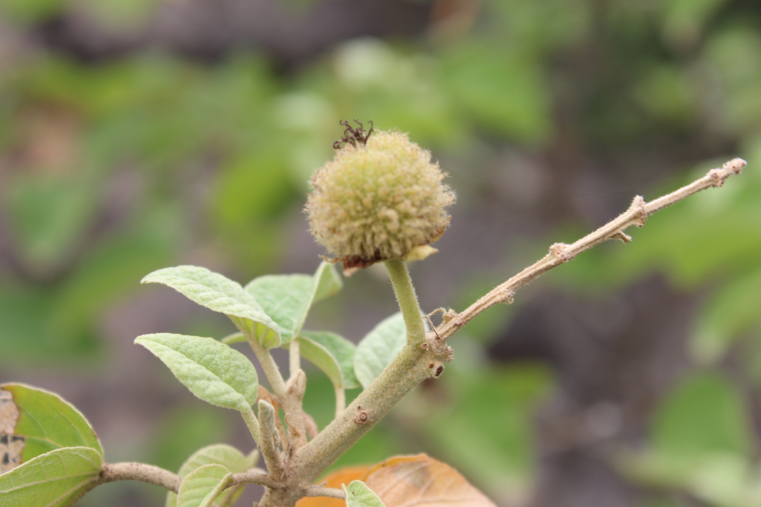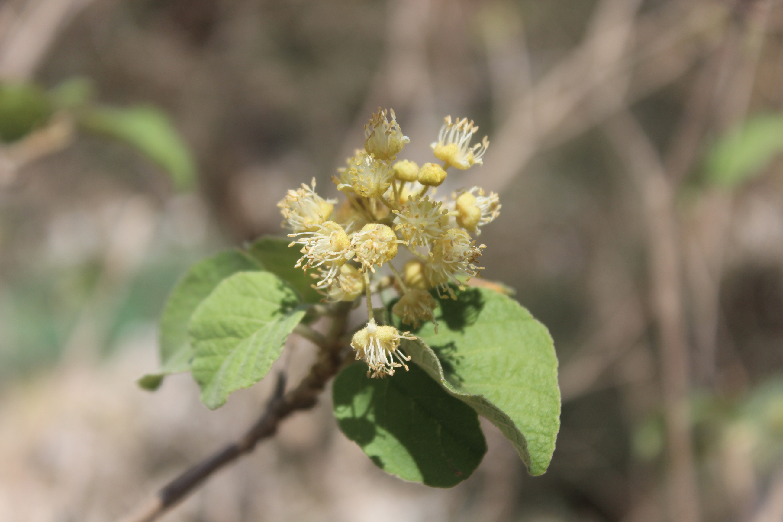 Deciduous , shrub or small tree ; up to 3-5 m tall , aromatic . Stems with young twigs densely covered by silvery or pale brown , deeply fringed scales ; bark smooth , grey . Leaves alternate , 5-12 x 3-9 . 5 cm , yellow-green , ovate to broadly-ovate , apex rounded to acute , base cordate , with two minute subsessile glands , margin entire or sometimes sinuate , veins prominent on the undersurface ; petiole 5-13 cm . Inflorescences racemose , terminal , to 8 cm long . Flowers monoecious with male flowers above and female flowers below and opening first . Male flowers: sepals 5-8 , broadly ovate , fused at base , stellate-pubescent ; petals 3-5 , ± 4 mm , oblong ; stamens exserted . Female flowers: sepals 5 ; petals absent ; ovary 3-4 locular , densely stellate-pubescent ; style arms 3-4 , each dichotomously branched again . Fruit capsule , 10-15 mm in diameter , subglobose , pale brown , covered by brownish spreading stellate hairs . Seeds ± 8 x 4 . 5 mm , oblong-ovoid , pale brown . (Ref . Flora of Oman ; vol . 2) .