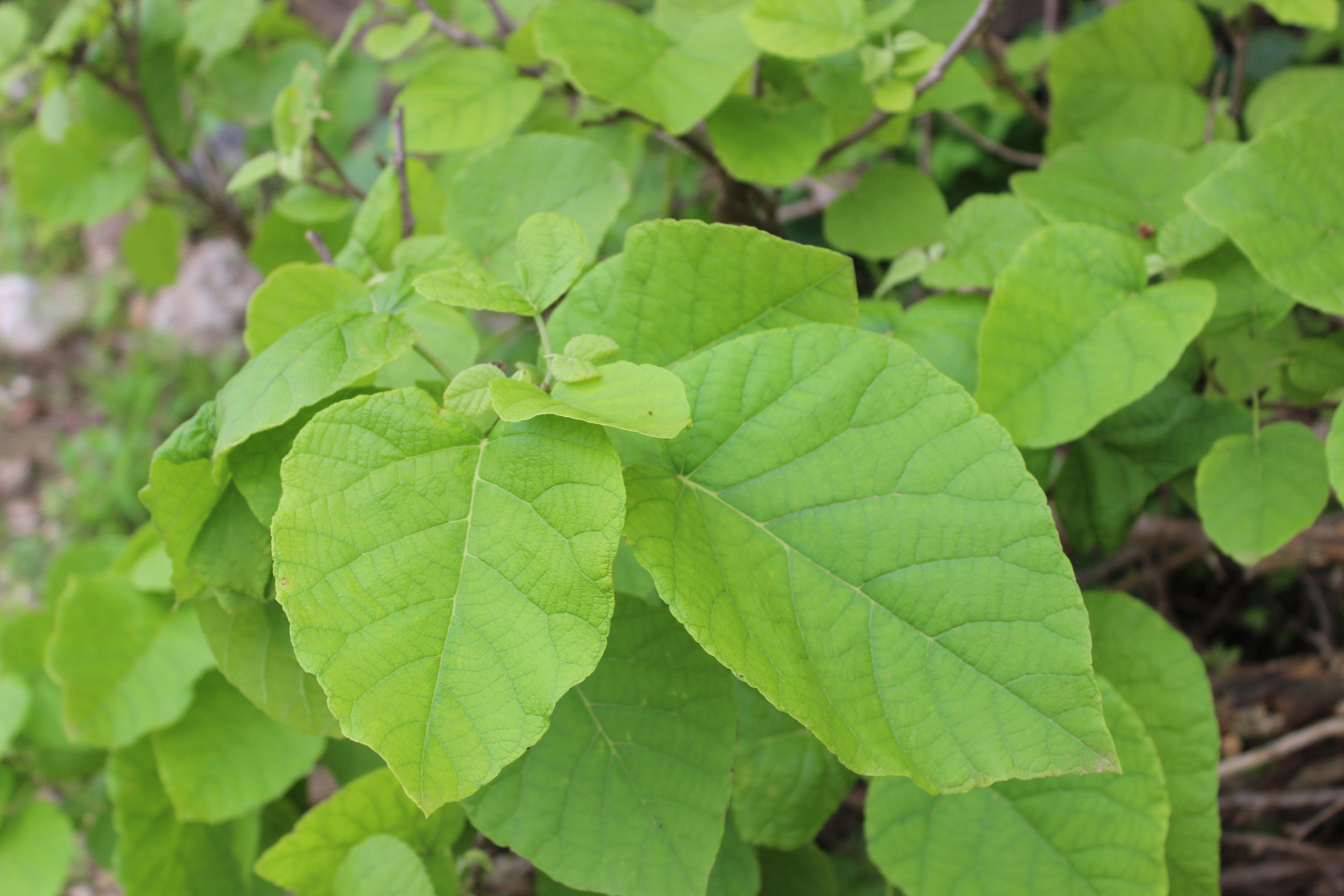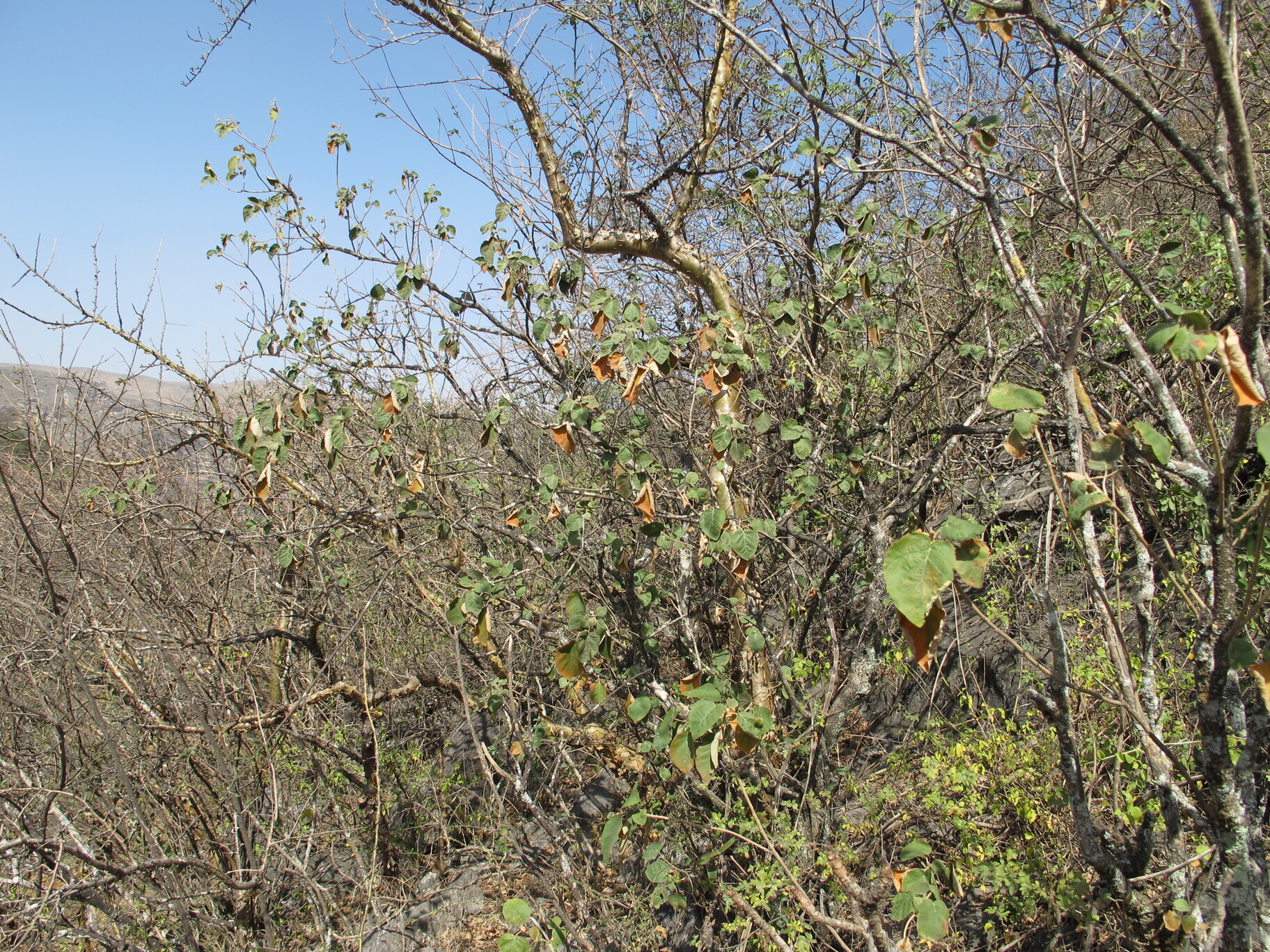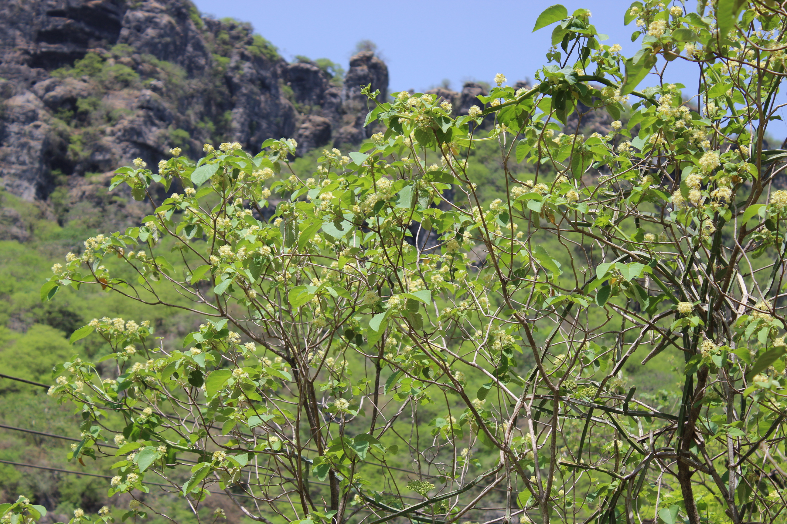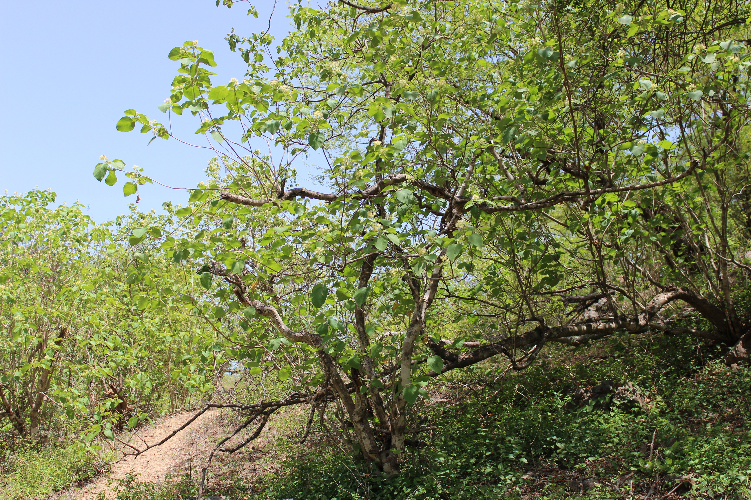 Deciduous , shrub or small tree ; up to 3-5 m tall , aromatic . Stems with young twigs densely covered by silvery or pale brown , deeply fringed scales ; bark smooth , grey . Leaves alternate , 5-12 x 3-9 . 5 cm , yellow-green , ovate to broadly-ovate , apex rounded to acute , base cordate , with two minute subsessile glands , margin entire or sometimes sinuate , veins prominent on the undersurface ; petiole 5-13 cm . Inflorescences racemose , terminal , to 8 cm long . Flowers monoecious with male flowers above and female flowers below and opening first . Male flowers: sepals 5-8 , broadly ovate , fused at base , stellate-pubescent ; petals 3-5 , ± 4 mm , oblong ; stamens exserted . Female flowers: sepals 5 ; petals absent ; ovary 3-4 locular , densely stellate-pubescent ; style arms 3-4 , each dichotomously branched again . Fruit capsule , 10-15 mm in diameter , subglobose , pale brown , covered by brownish spreading stellate hairs . Seeds ± 8 x 4 . 5 mm , oblong-ovoid , pale brown . (Ref . Flora of Oman ; vol . 2) .