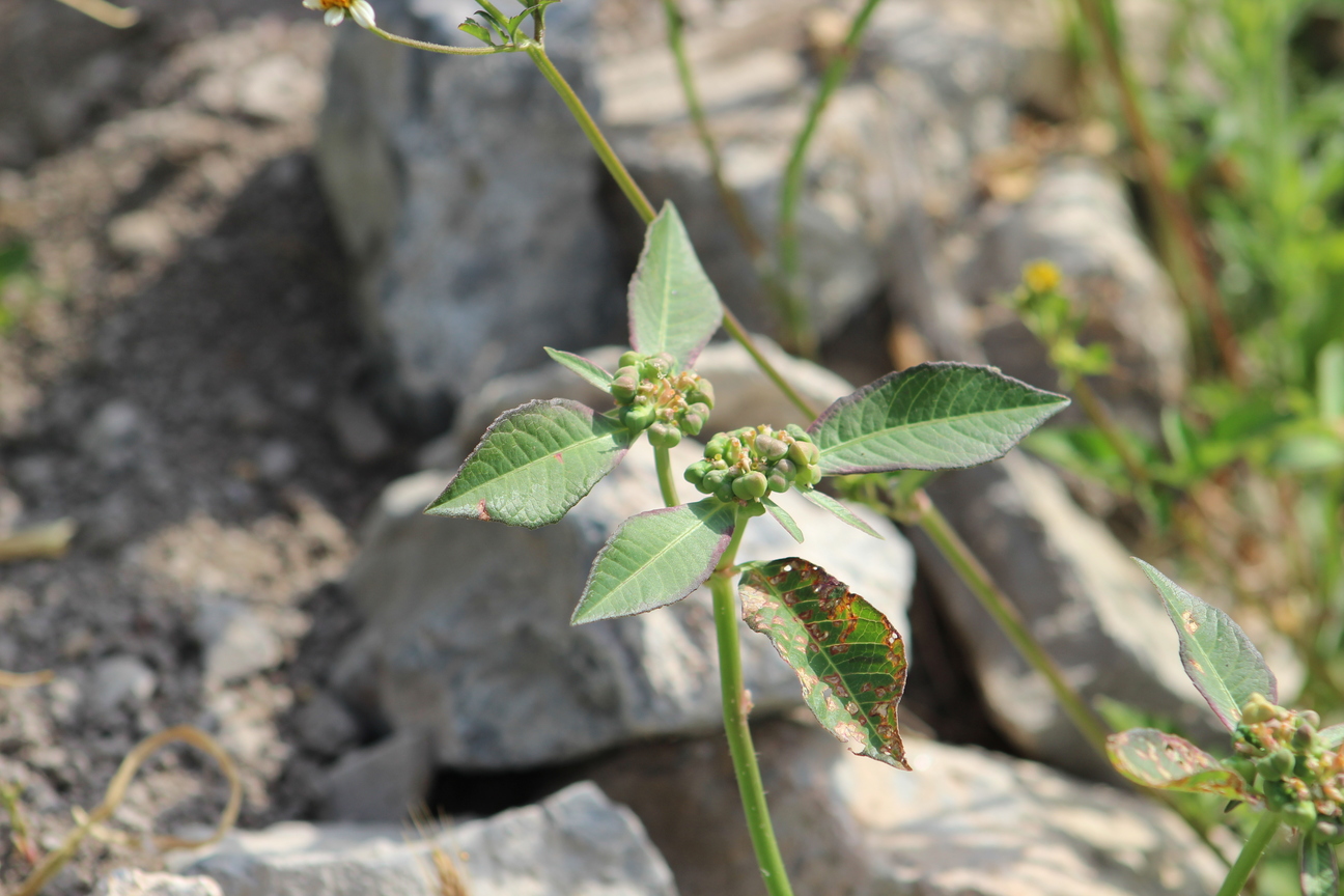 Erect annual herb ; up to 0 . 5 m high , often tinged red . Stems hollow , simple or sparsely branched , pubescent , purple-green . Leaves opposite , 4-8 x 2-5 cm , dull green , petiolate , ovate-lanceolate , apex acute , base tapering , margin irregularly serrate , pubescent on the undersurface with multicellular hairs . Inflorescences cyathia densely clustered in terminal and axillary cymes ; peduncle 6-11 mm . Flowers cyathia ; glands yellow , with barrel-shaped involucres , glabrous ; male flowers bracteoles few , ligulate , feathery ; female flower ovary pedicellate , glabrous or occasionally with minute scattered hairs . Fruit capsule , 4-5 mm , deeply 3-lobed , yellow-green , glabrous . Seeds 2 . 6 × 2 . 4 mm , conical with acute apex , bluntly verrucose , blackish-brown . (Ref . Flora of Oman ; vol . 2) .