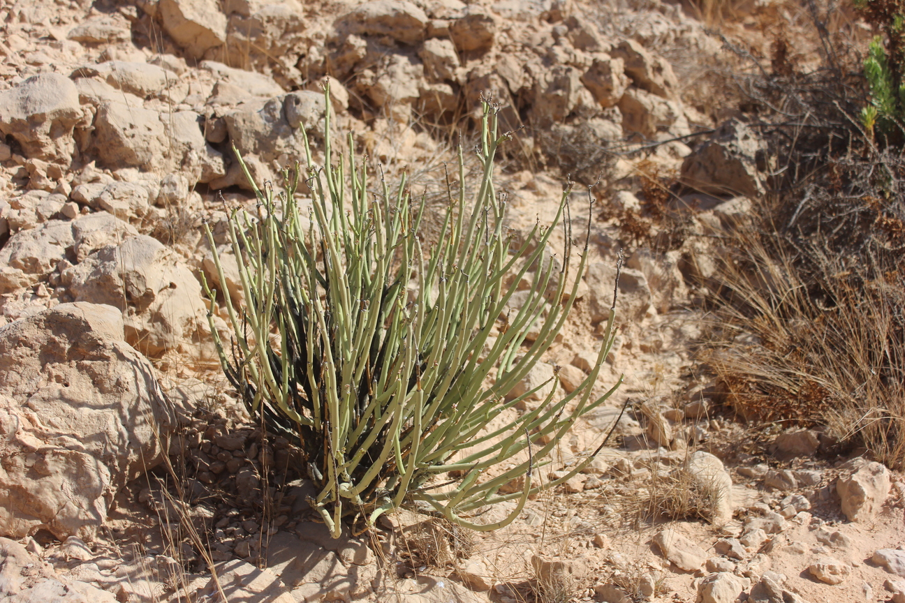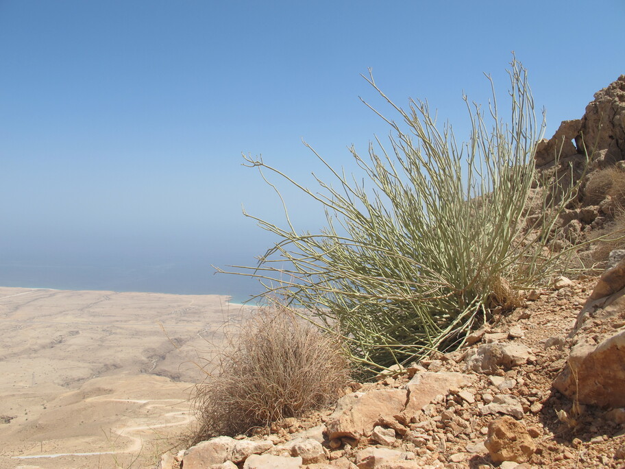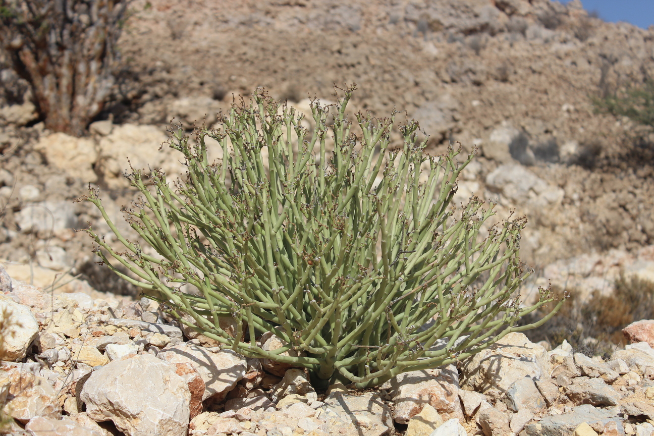 cut, E. smithii was usually preferred in the few places where both species are to be found growing together: E. larica grows in the Samhan foothills and inland from Mirbat to Hasik, in which areas E. smithii occurs only sporadically in the deeper wadis. It obviously took many more plants of E. larica to provide sufficient latex to treat the larger livestock; and to collect enough to treat a number of animals was hard and tiring work. As it was collected, this latex too was mixed with the urine of the infected animal, and was then put on the fire and brought to the boil. The thickened and cooled paste was then applied with a frayed out root of Salvadora persica or a cloth pad, and was left to harden and drop off of its own accord days later, or was scraped off with a knife, bringing hair, epidermis and scabs all off together. The raw, exposed layer of red skin was usually treated with a lotion of sulphur [DA, J: kibrit], mixed with oil and painted over the sore patches as a protection against further secondary infection and to speed up the healing process and growing in of the new soft hair. In its other uses this species of euphorbia also resembles E. smithii: for instance, the latex was painted around a pointed boil or infected swelling to draw the pus; small amounts of the latex were taken as a vermifuge and a purge; and the latex was used as an abortifacient. Young plants especially were considered to be of the group called [J: herum axitirot], that is 'dangerous plants', among which were also included E. hadramautica, E. smithii, and Cassia holosericea. In all these, the juice expressed from that part of the plant growing underground is taken to cause the patient's bowels to move, and that from the part growing above ground is taken to cause the patient to vomit. The latex was collected by women into a container and was mixed with very fine powdered clay, allowed to dry and stored for later use as a depilatory. When needed it was softened again by chewing. The prepared latex was used by some as a chewing gum (like that of E. balsamifera) but was never as well-liked, the latex being rather bitter and without the pleasant astringent flavour of that of E. balsamifera. The heated latex was a very efficient adhesive, and in areas where this species grew, replaced the latex adhesives of the more popular E. smithii and E. balsamifera of the monsoon areas". (Ref. Plants of Dhofar). In addition, Ghazanfar (2007) mentioned that: "The plant has been used in traditional medicine for its latex which is collected and applied around a boil to draw out the pus; mixed with fine clay it is used as a depilatory. It is also used for treating boils and wounds in camels and goats". (Ref. Flora of Oman; vol.2). Further, Pickering & Patzelt (2008) stated that: "Latex is poisonous and used to kill and catch fish, also as a glue to catch birds. In small quantities is a treatment for parasites in camels". (Ref. Field Guide to the Wild Plants of Oman; 2008). Furthermore, Patzelt (2015) wrote that: "The latex is used medicinally for humans, camels and goats around swellings to draw out the fluid. The latex is also mixed with clay, and used as depilatory". (Ref. Photographic Field Guide to the Plants of the Western Hajar Mountains; 2015).