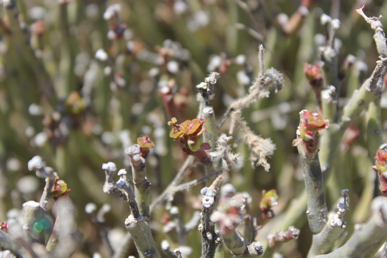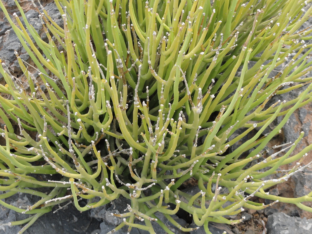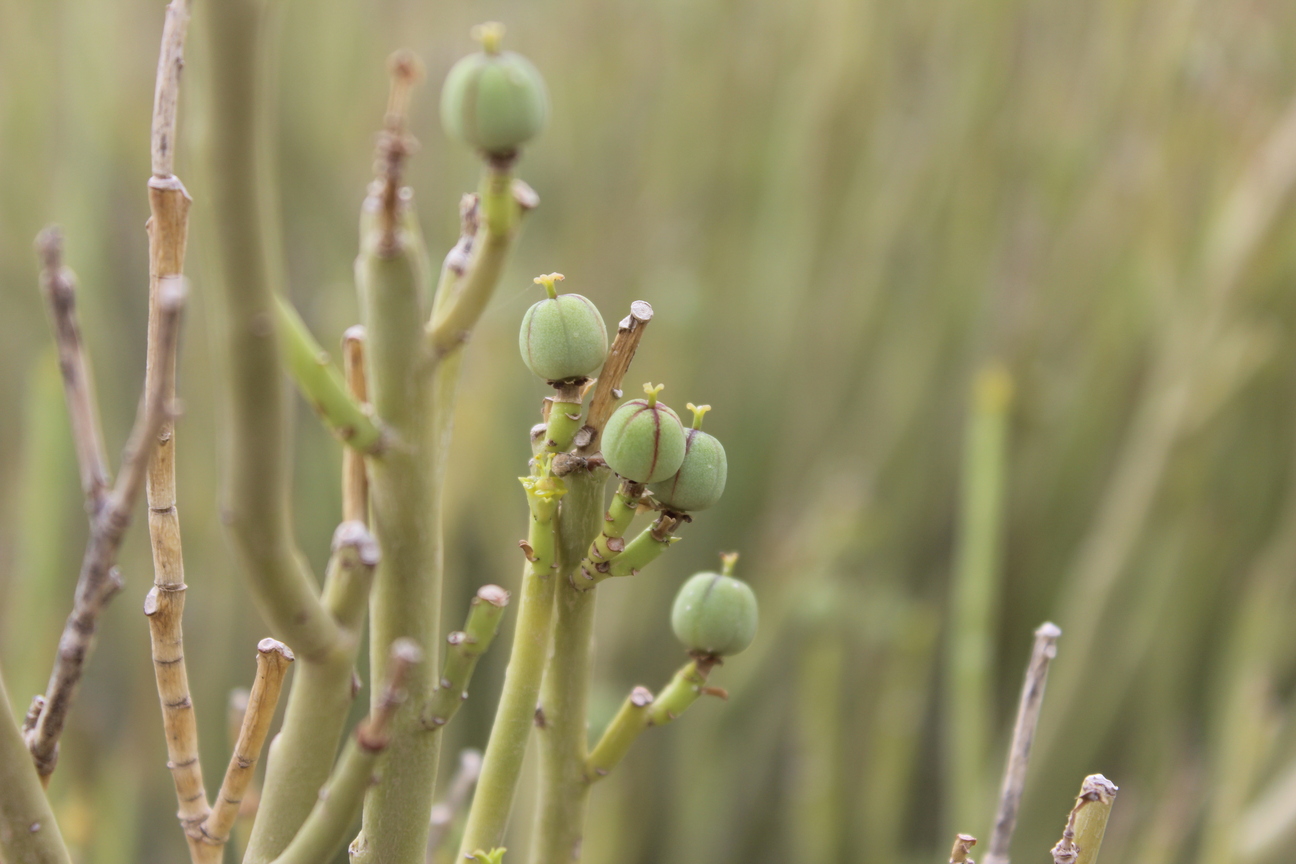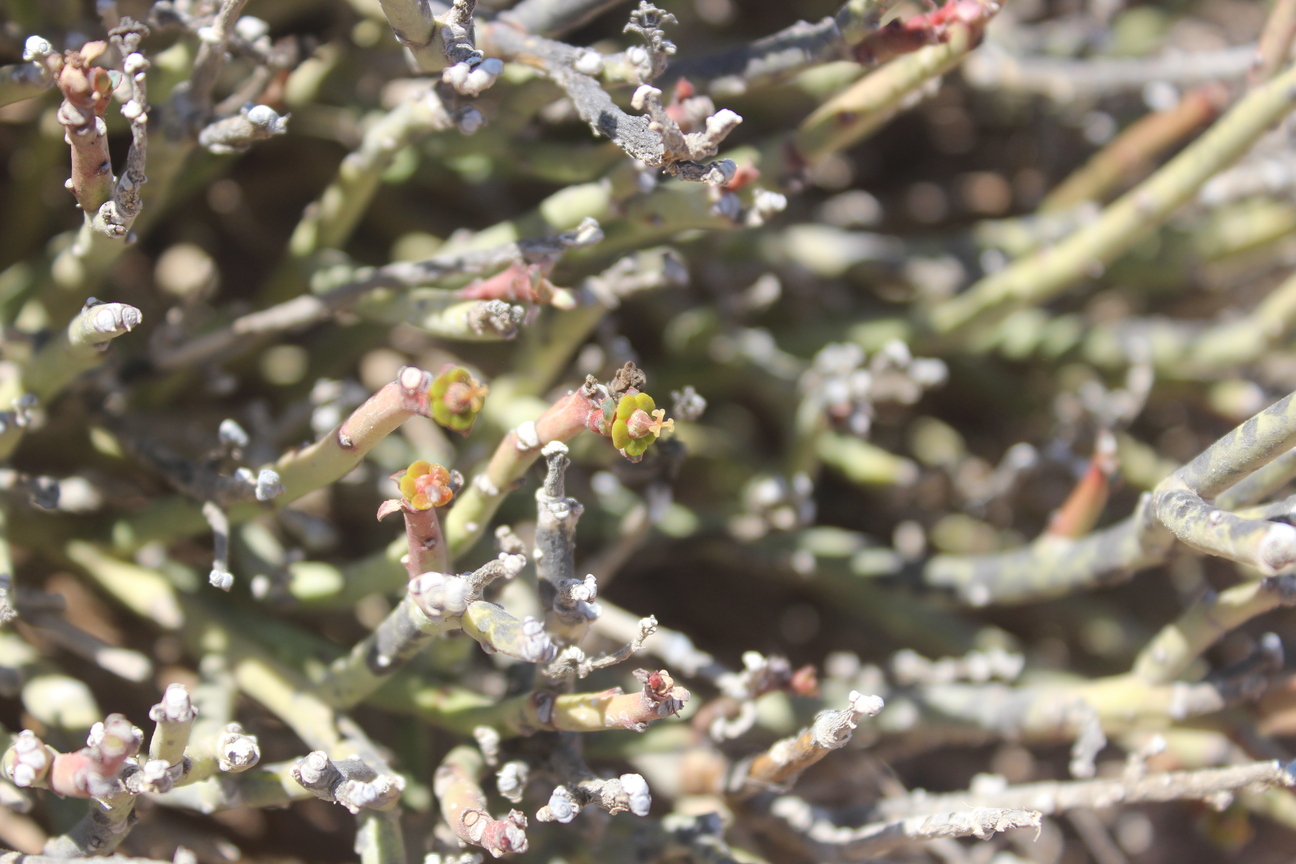 Deciduous . Erect succulent shrub or subshrub ; up to 1 m tall , with leafless yellow-green stems . Stems branched from base , succulent , ascending , glabrous , exude thick white latex if broken ; lower stems woody , brown ; young stems light green . Leaves alternate , 4-5 x 1-1 . 5 mm , obovate , acute tip , attenuate base , entire margin , often reddish , glabrous but with a few hairs , falling soon after formation , leaving the stem leafless . Inflorescences in terminal and upper lateral spikes , cyathia usually in groups of three , the central sessile and the two lateral shortly pedunculate . Flowers cyathia , green-yellow ; male flowers with fimbriate bracts at tip ; female flowers with glabrous ovary ; style c . 1 mm long , 3-lobed . Fruit capsule , 6-8 mm in diameter , subglobose , erect , green with 6 red longitudinal stripes , contain six segments with two seeds each . Seeds 4-4 . 5 mm , oblong-ovoid , slightly rugose , blackish with a white longitudinal stripe and tip . (Ref . Flora of Oman ; vol . 2) .