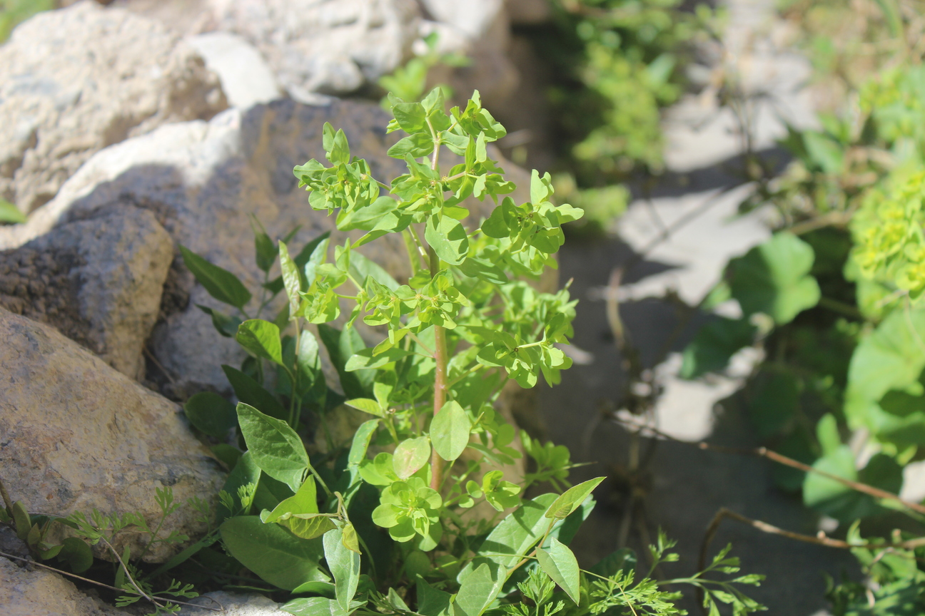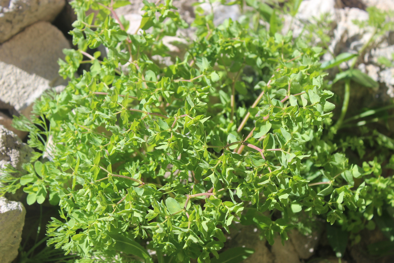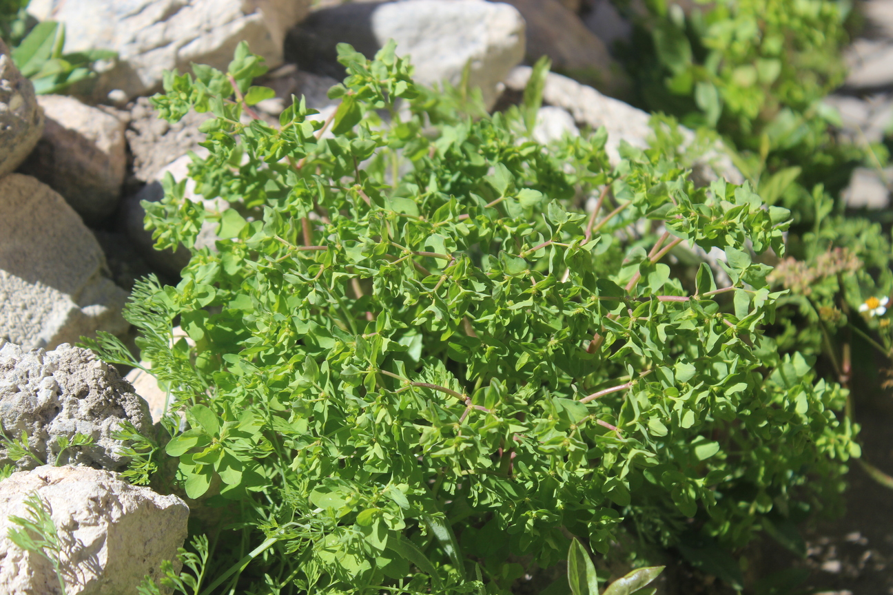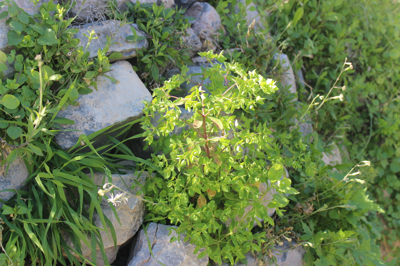 Much branched annual or short-lived perennial herb ; up to 50 cm tall . Stems erect , reddish , glabrous . Leaves 1–3 . 5 x 0 . 2–0 . 4 cm ; cauline leaves sessile , linear-lanceolate , entire margin ; floret leaves triangular-ovate . Inflorescences cymes in terminal umbels with 3 or more rays , forking many times . Flowers cyathia 2 mm in diameter ; glands 4 , yellowish green , spreading ; styles erect , 1 . 5–2 mm long , joined at the base , with bifid , slightly thickened apices . Fruit capsule , 3 . 5 x 4 mm , exserted on a recurved pedicel , deeply 3-lobed . Seeds 2 . 3 x 1 . 5 mm , oblong-ovoid , smooth , shiny black , grey or brown-speckled . (Ref . POWO ; 2023) .