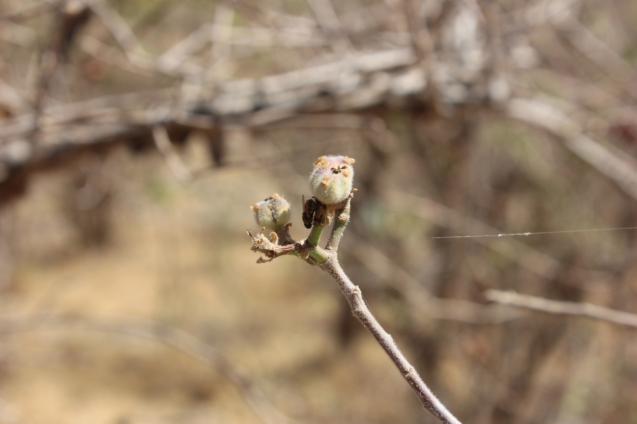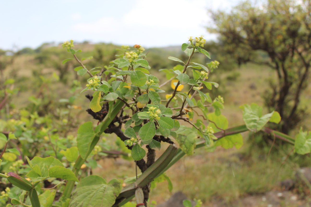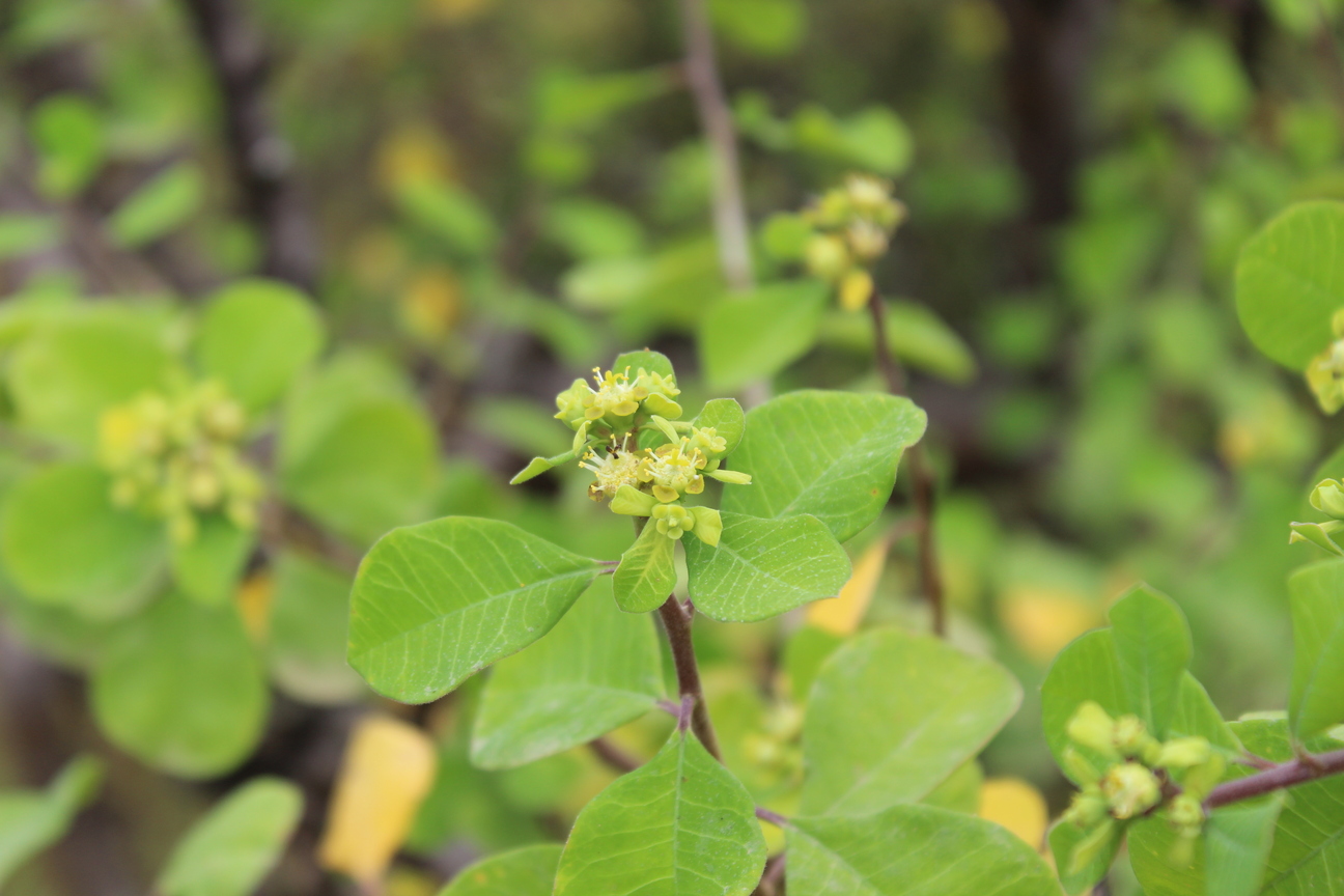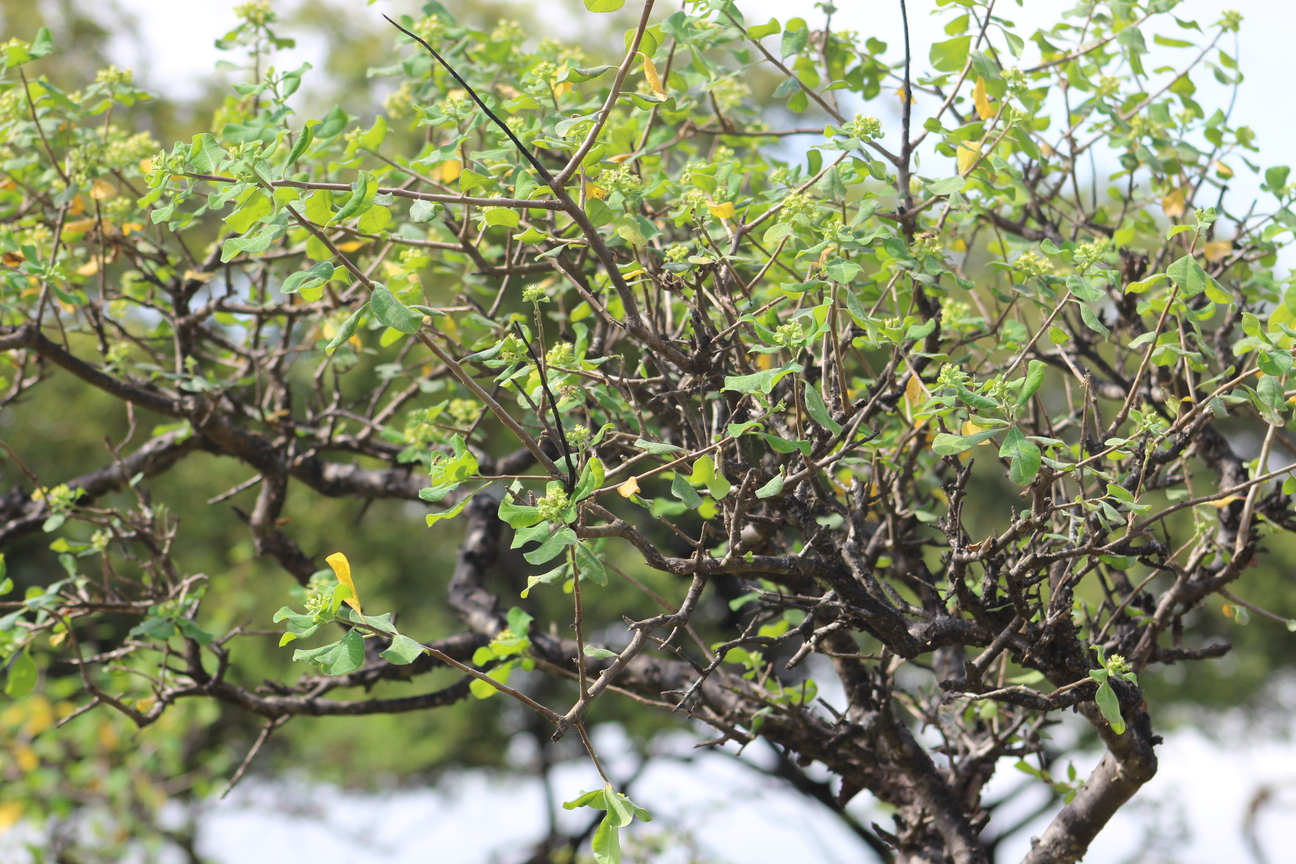 Deciduous . Small tree ; up to 5 m tall , with a single trunk or 2-3 from base , all parts producing copious white latex when cut . Stems erect , branched , reddish tinged , thinly pubescent becoming glabrous ; bark on the older branches peeling , brownish-red . Leaves alternate , 3-7 x 1 . 5-5 cm , obovate , tip rounded to minutely apiculate , base cuneate , margins entire , glabrous with sparse pubescent on the margins and veins , bluish-green above , pale green below . Inflorescences cyathia terminal in groups of three , sessile to shortly pedunculate , white-hairy ; bracts subtending the cyathia ± 1 mm ; involucre cup-shaped , ± 4 mm long . Flowers cyathia , brownish-green ; male flowers numerous , with fimbriate bracteoles ; female flowers with ovary densely white-hairy ; style arms connate at base , 2-lobed at apex . Fruit capsule , 8-9 mm in diameter , subglobose , obtusely 3-lobed , erect , ± sessile , densely white-hairy . Seeds 3-3 . 7 mm across , globose , smooth , brown or grey . (Ref . Flora of Oman ; vol . 2) .