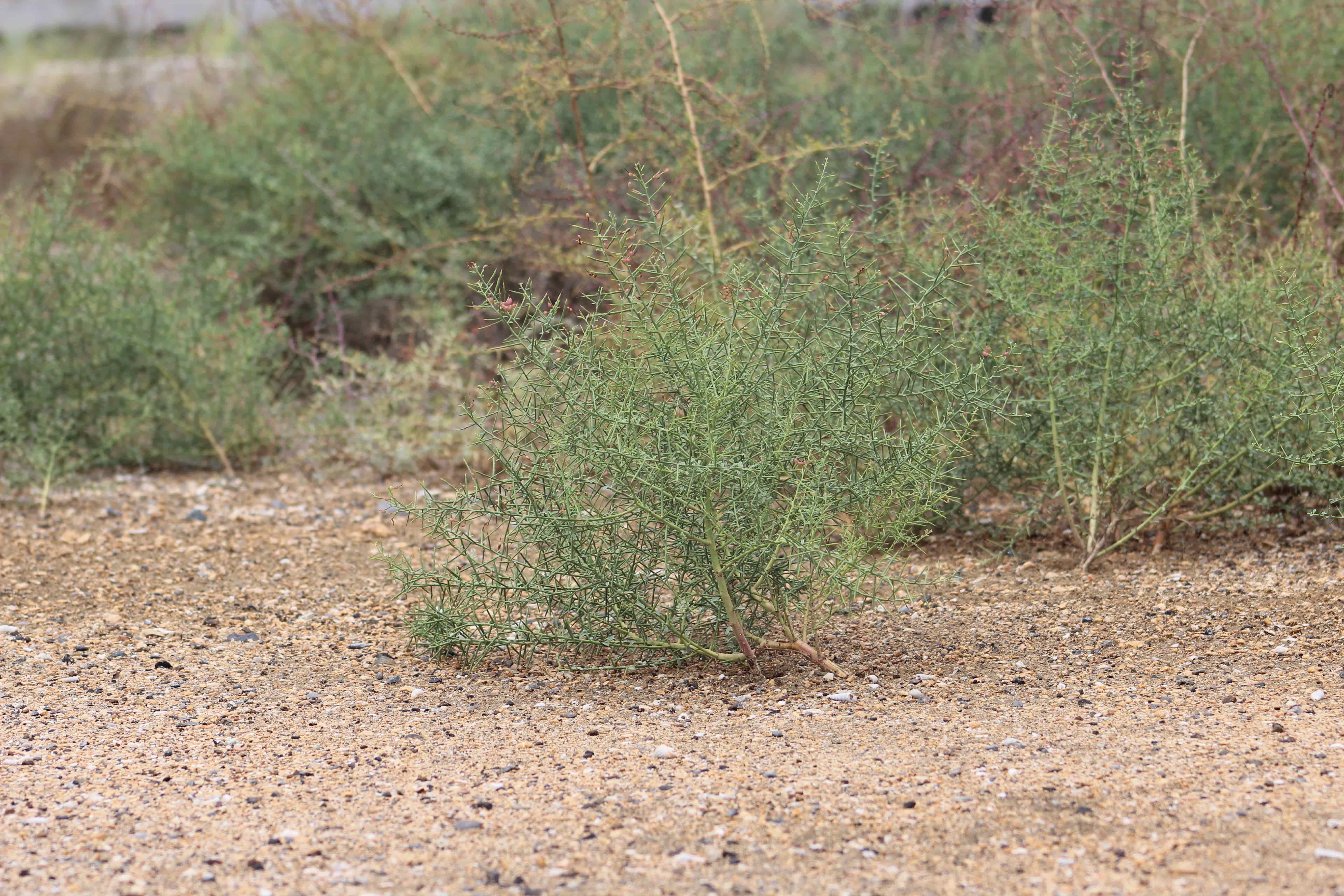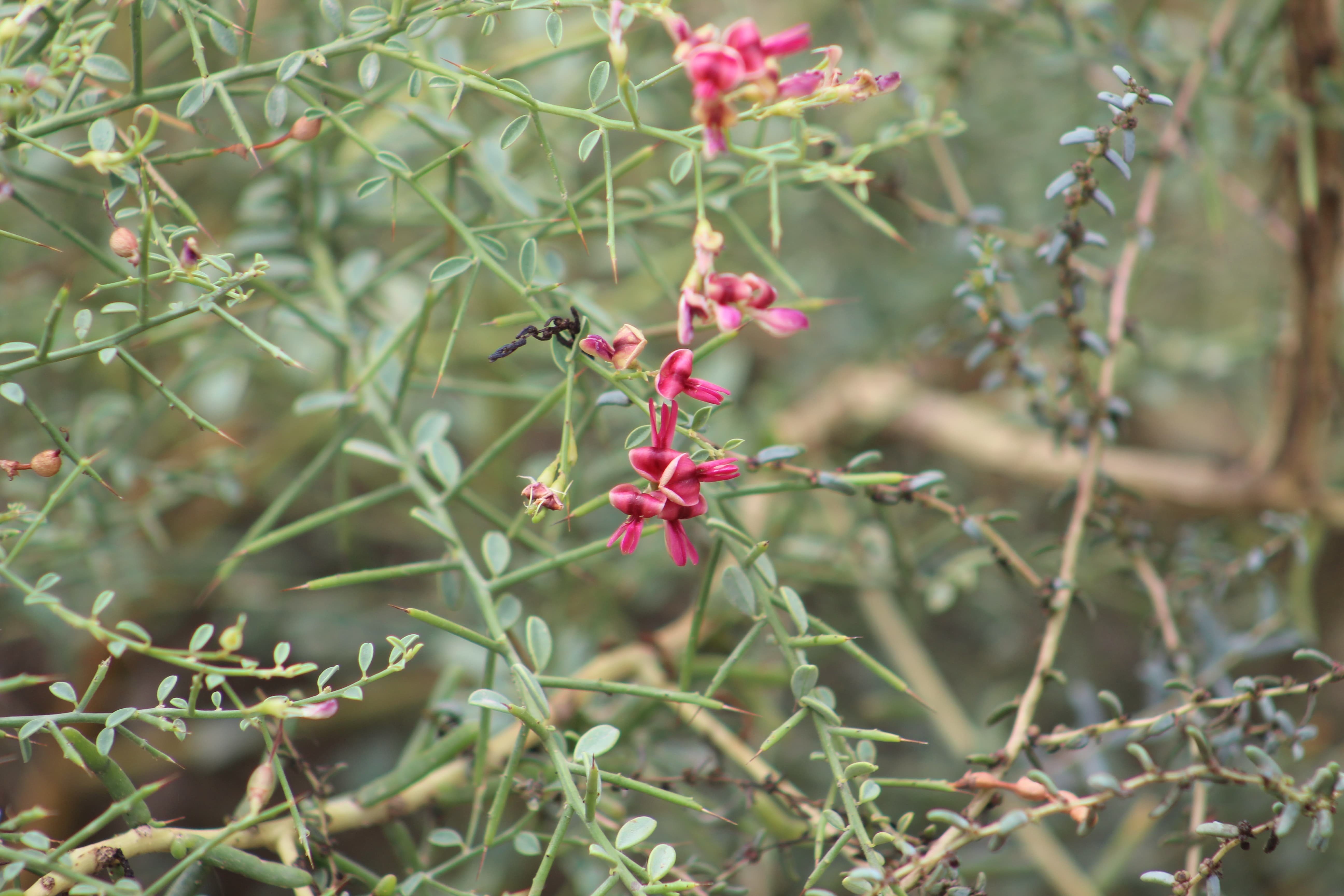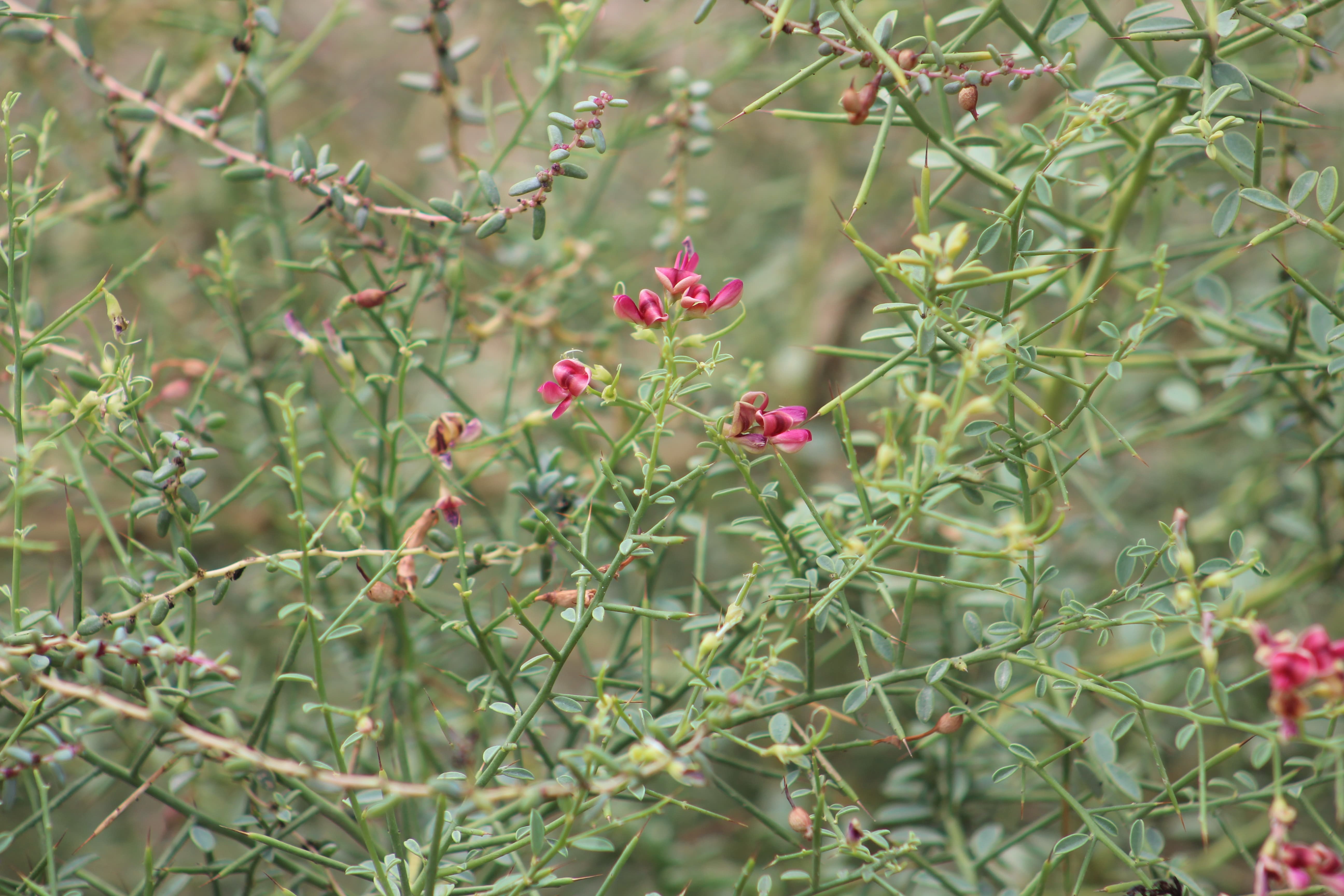 Woody base , spiny , erect , perennial subshrub ; up to 2 m tall , deep-rooted . Stems erect to ascending , lateral branches becoming spinescent , glabrous to pubescent . Leaves 10-20 x 3-8 mm , obovate to oblong-elliptic , apex apiculate , obtuse or emarginated , base rounded , margins entire , glabrous or pubescent , petiolate . Inflorescences in lax axillary racemes . Flowers red or purplish-red ; sepals 2-2 . 5 mm , teeth minute , glabrous ; petals 6-8 mm ; stamens 9+1 . Fruit pod , linear , constricted irregularly in between the seeds , glabrous , 1-9-seeded . (Ref . Flora of Oman ; vol . 2) .
