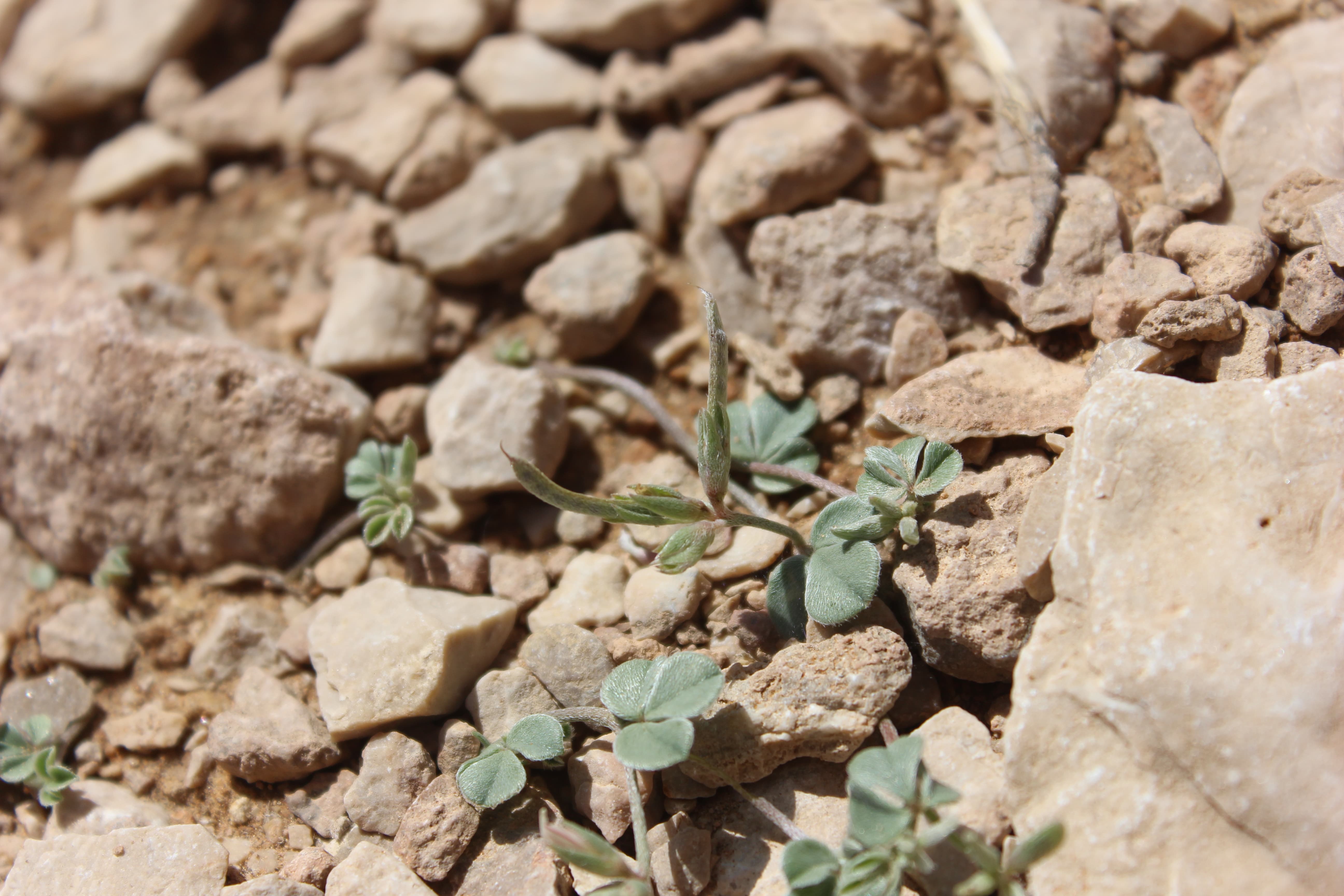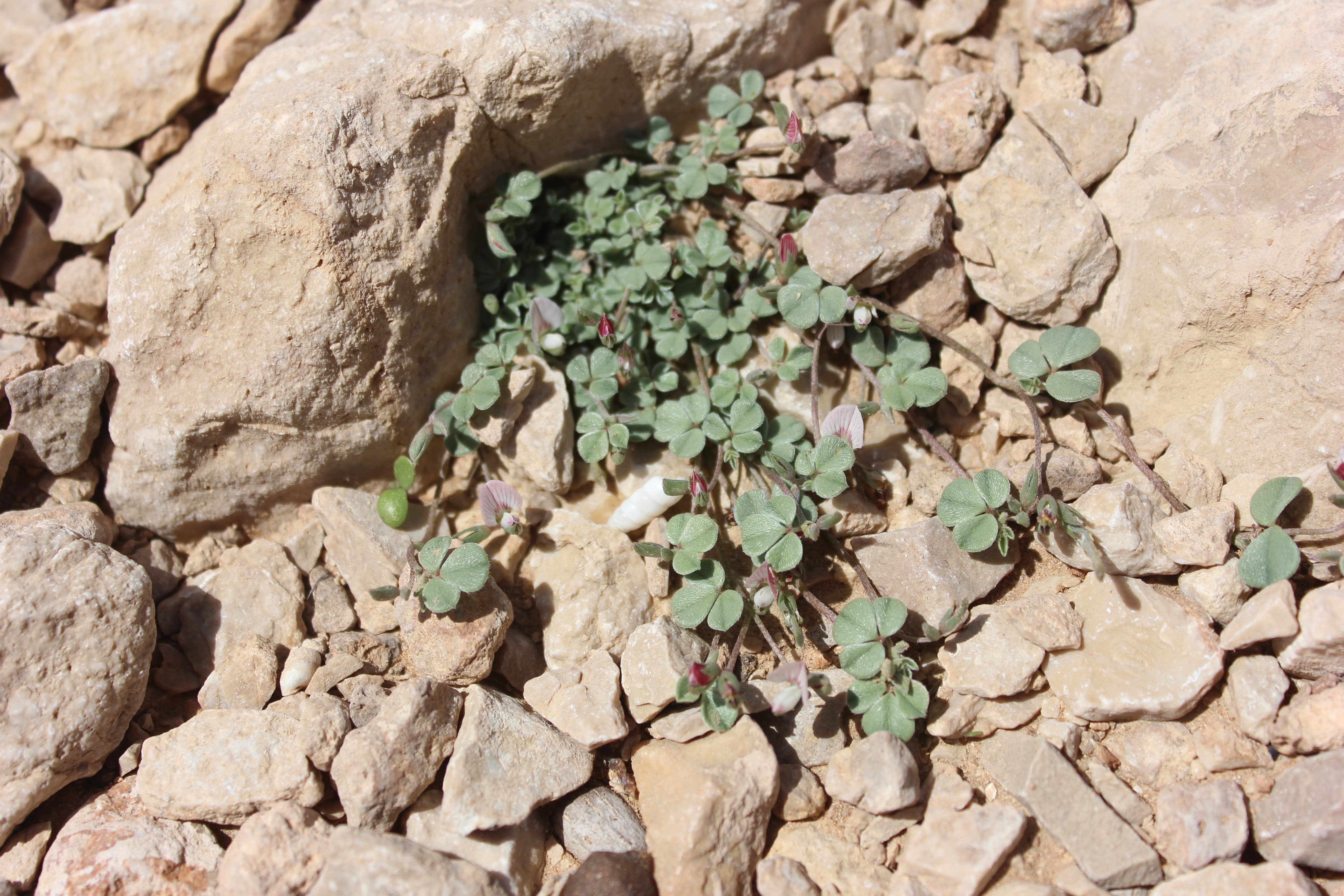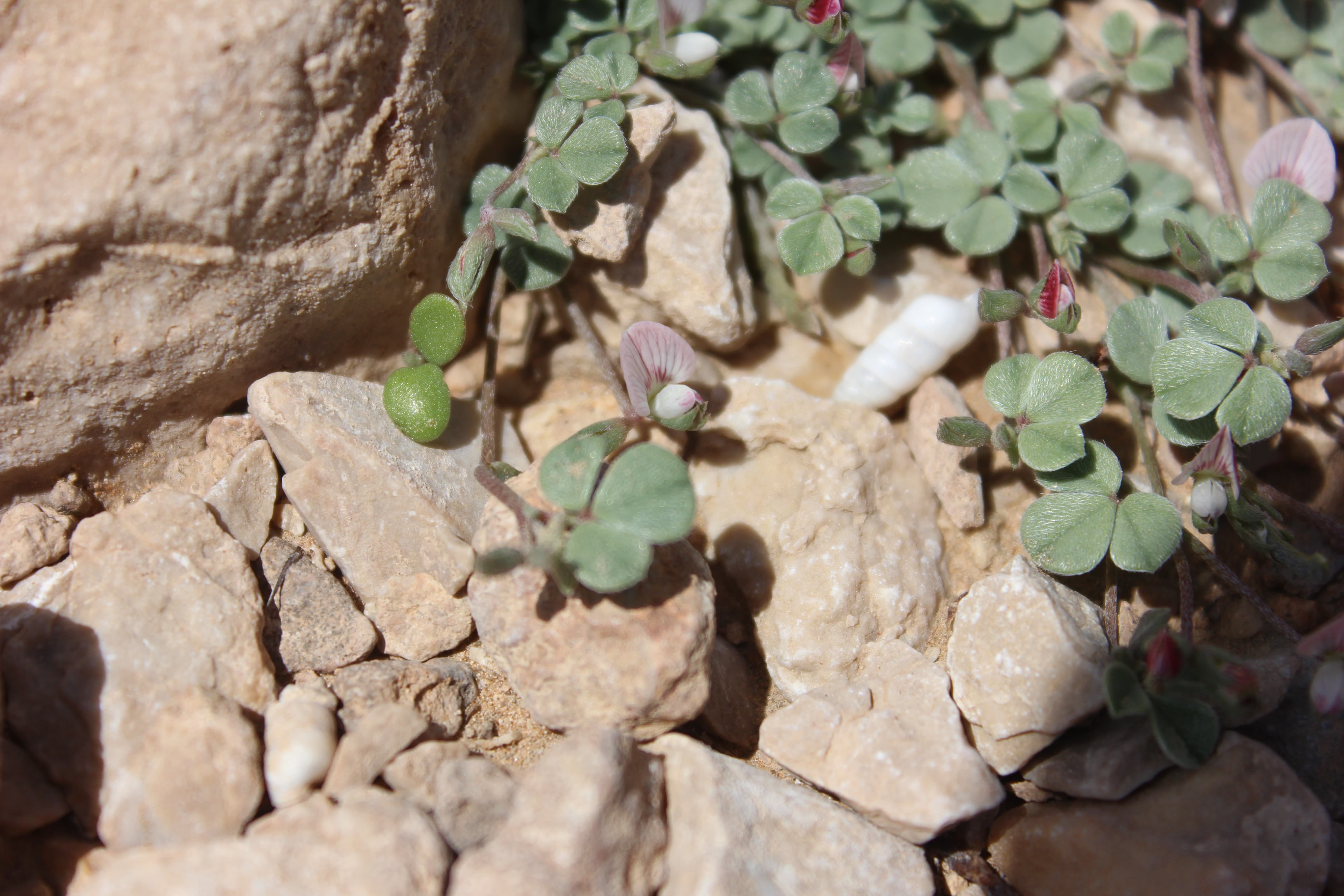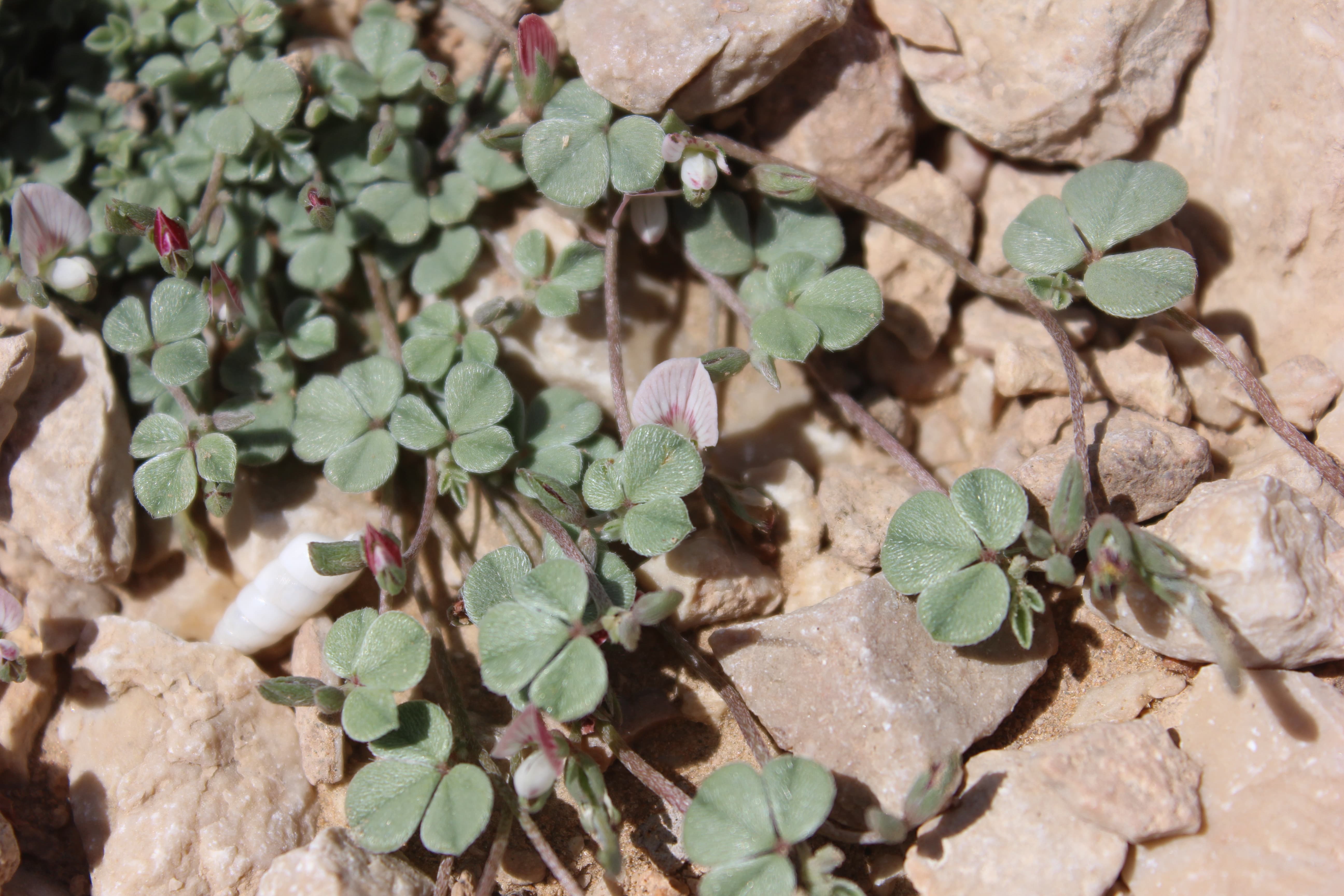 Small , prostrate annual herb ; up to 10-15 cm tall . Stems terete , much branched , herbaceous , whitish-green , with white appressed hairs . Leaves 1-3-foliolate ; leaflets 5-15 x 5-10 mm , obovate , obtuse at the apex , base of the lateral leaflets oblique , glabrous above , pilose below , smooth , shiny , whitish-green . Inflorescences in few-flowered terminal lax racemes . Flowers small , pinkish-red with red streaks ; calyx 4-5 mm , lobes linear , pilose ; corolla about as long as the calyx ; stamens joined into a tube . Fruit pod , 18-25 x 1-1 . 5 mm , narrow , compressed , long , grey-green , pilose , 8-12-seeded . Seeds numerous black . (Ref . Flora of Oman ; vol . 2) .