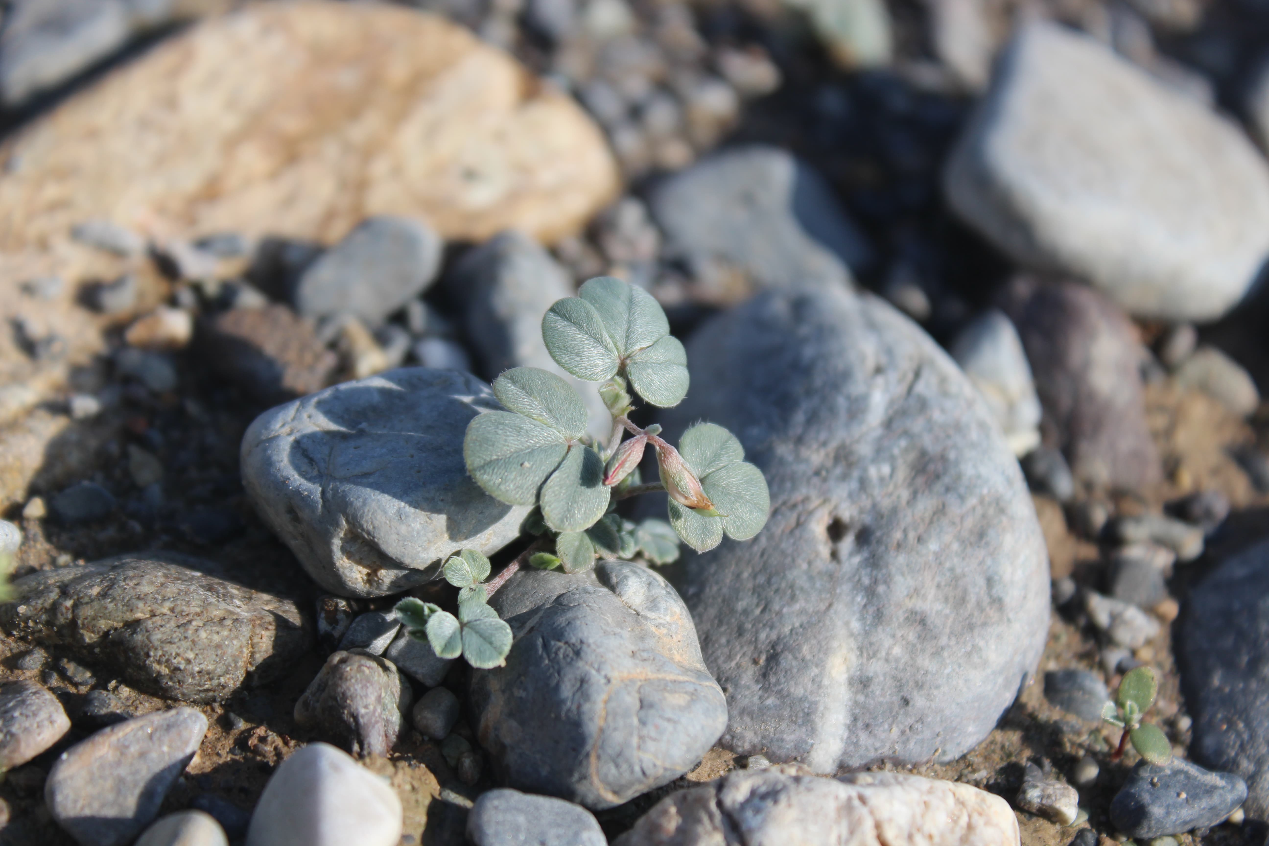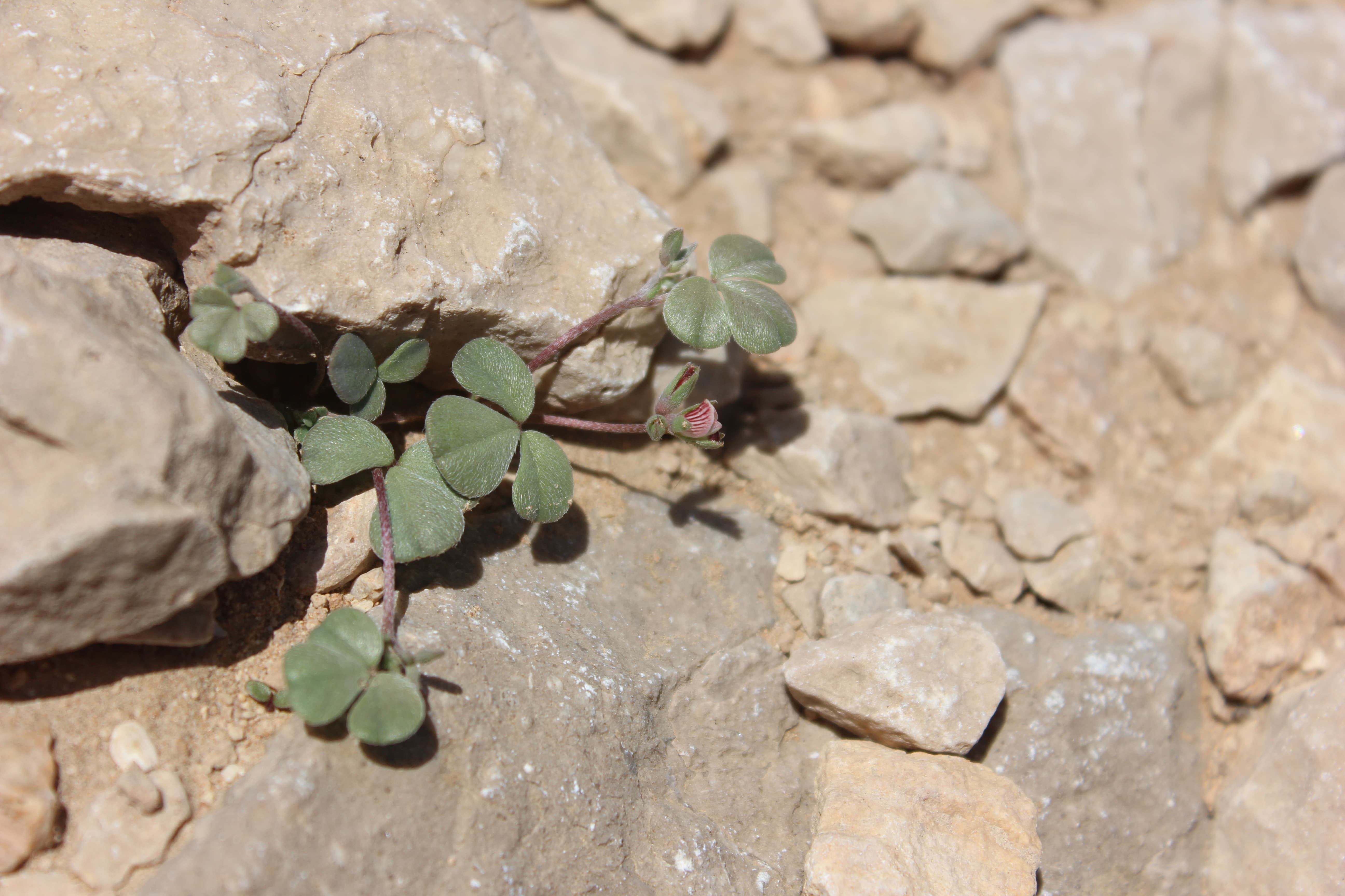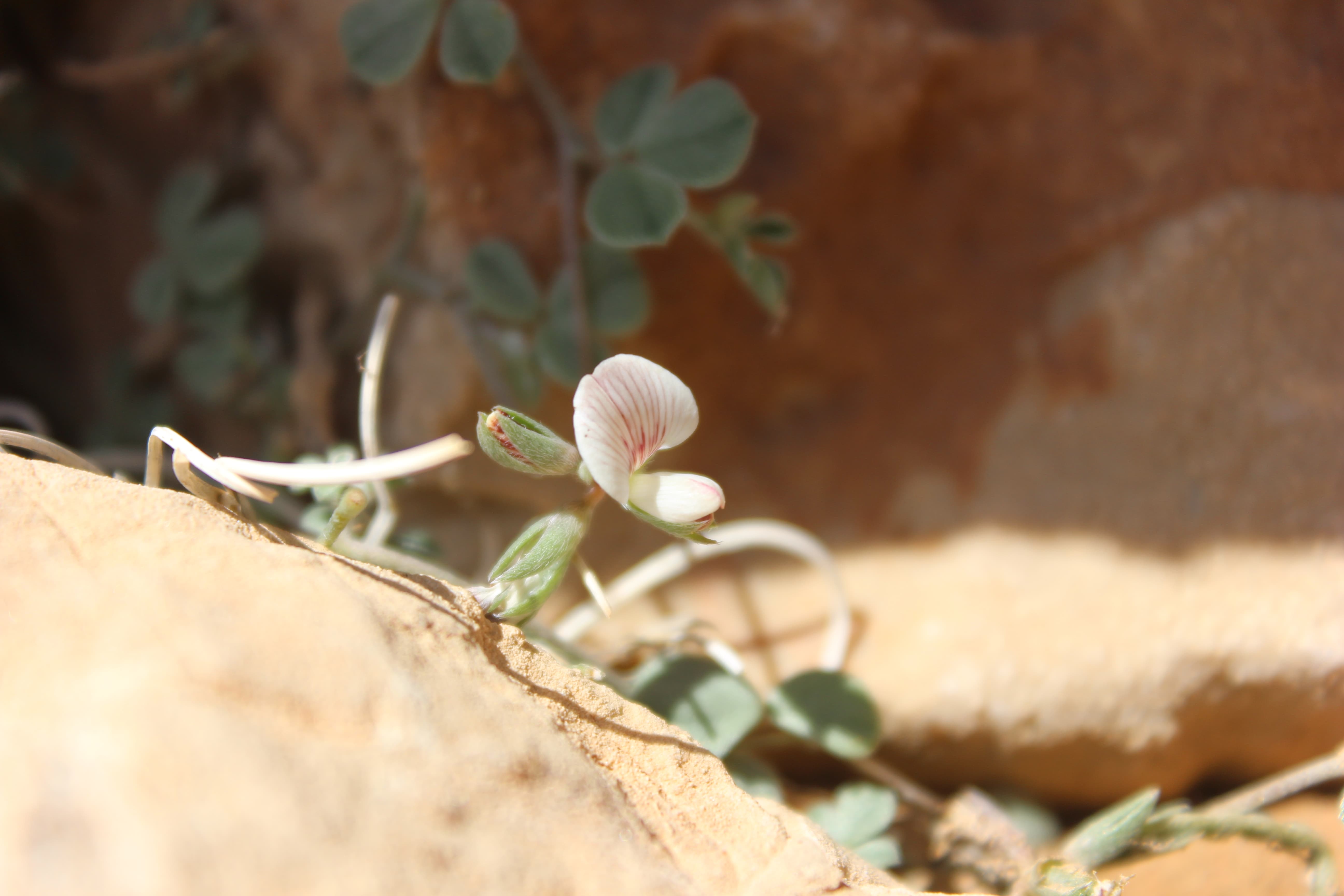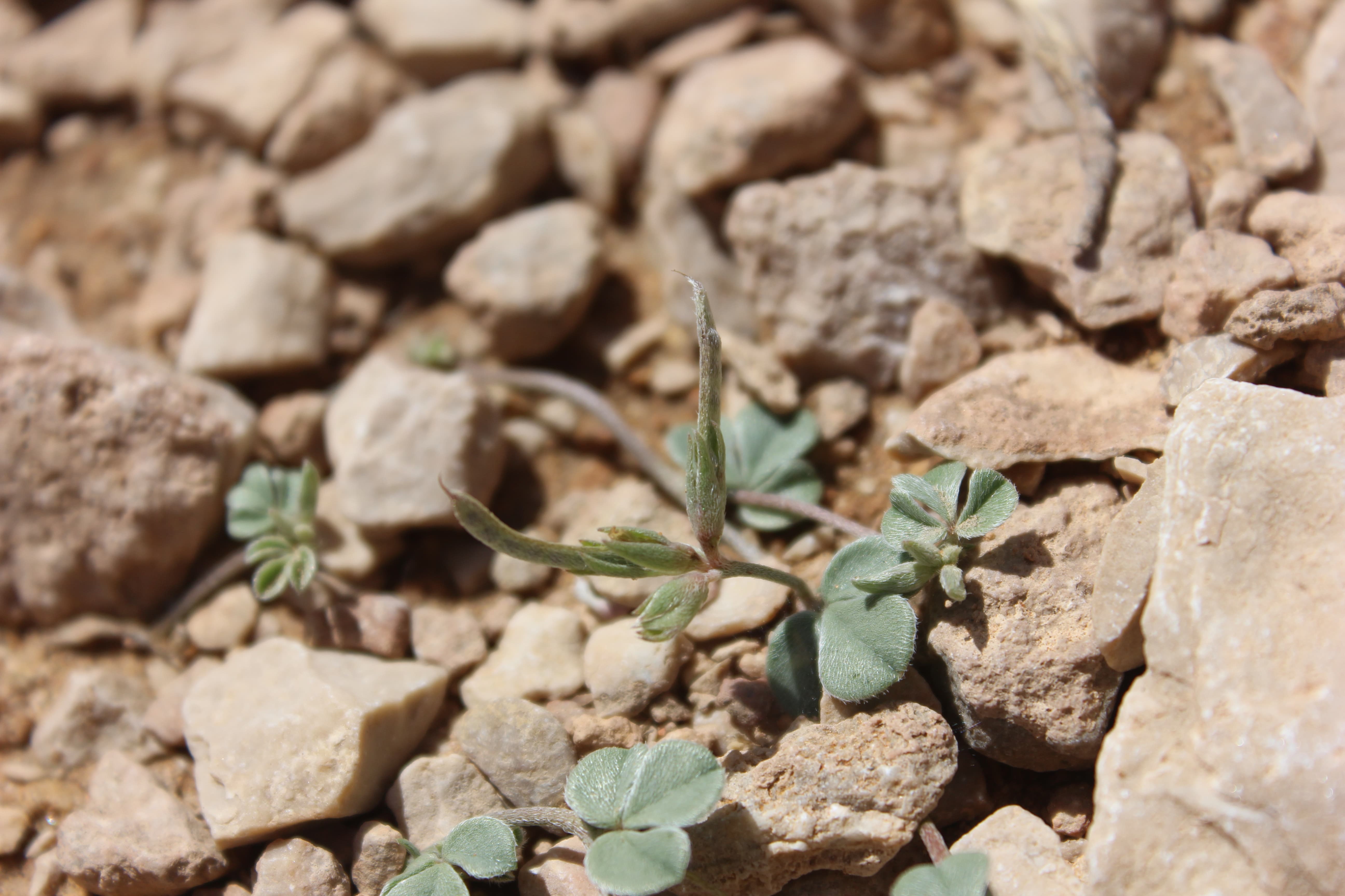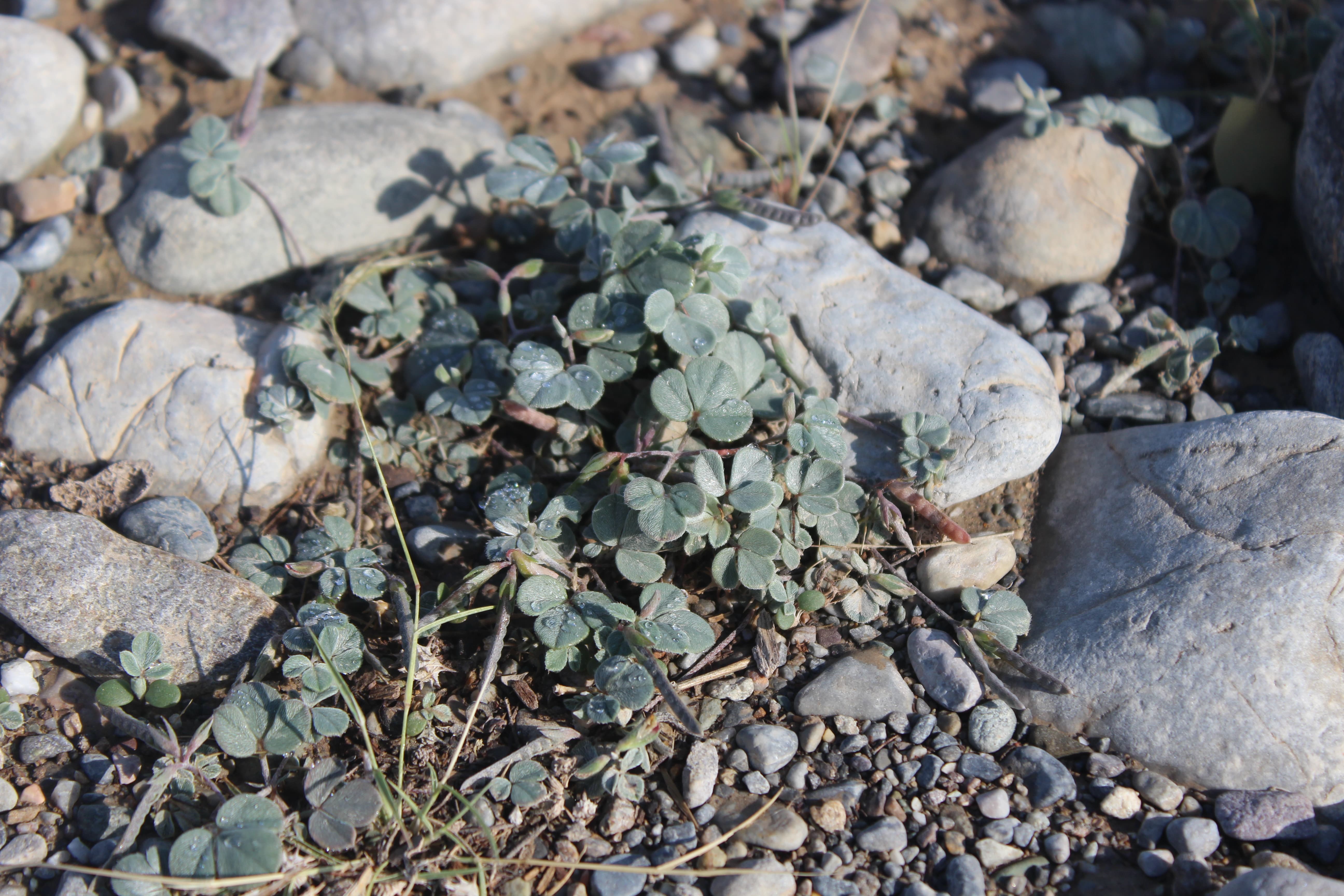 Small , prostrate annual herb ; up to 10-15 cm tall . Stems terete , much branched , herbaceous , whitish-green , with white appressed hairs . Leaves 1-3-foliolate ; leaflets 5-15 x 5-10 mm , obovate , obtuse at the apex , base of the lateral leaflets oblique , glabrous above , pilose below , smooth , shiny , whitish-green . Inflorescences in few-flowered terminal lax racemes . Flowers small , pinkish-red with red streaks ; calyx 4-5 mm , lobes linear , pilose ; corolla about as long as the calyx ; stamens joined into a tube . Fruit pod , 18-25 x 1-1 . 5 mm , narrow , compressed , long , grey-green , pilose , 8-12-seeded . Seeds numerous black . (Ref . Flora of Oman ; vol . 2) .