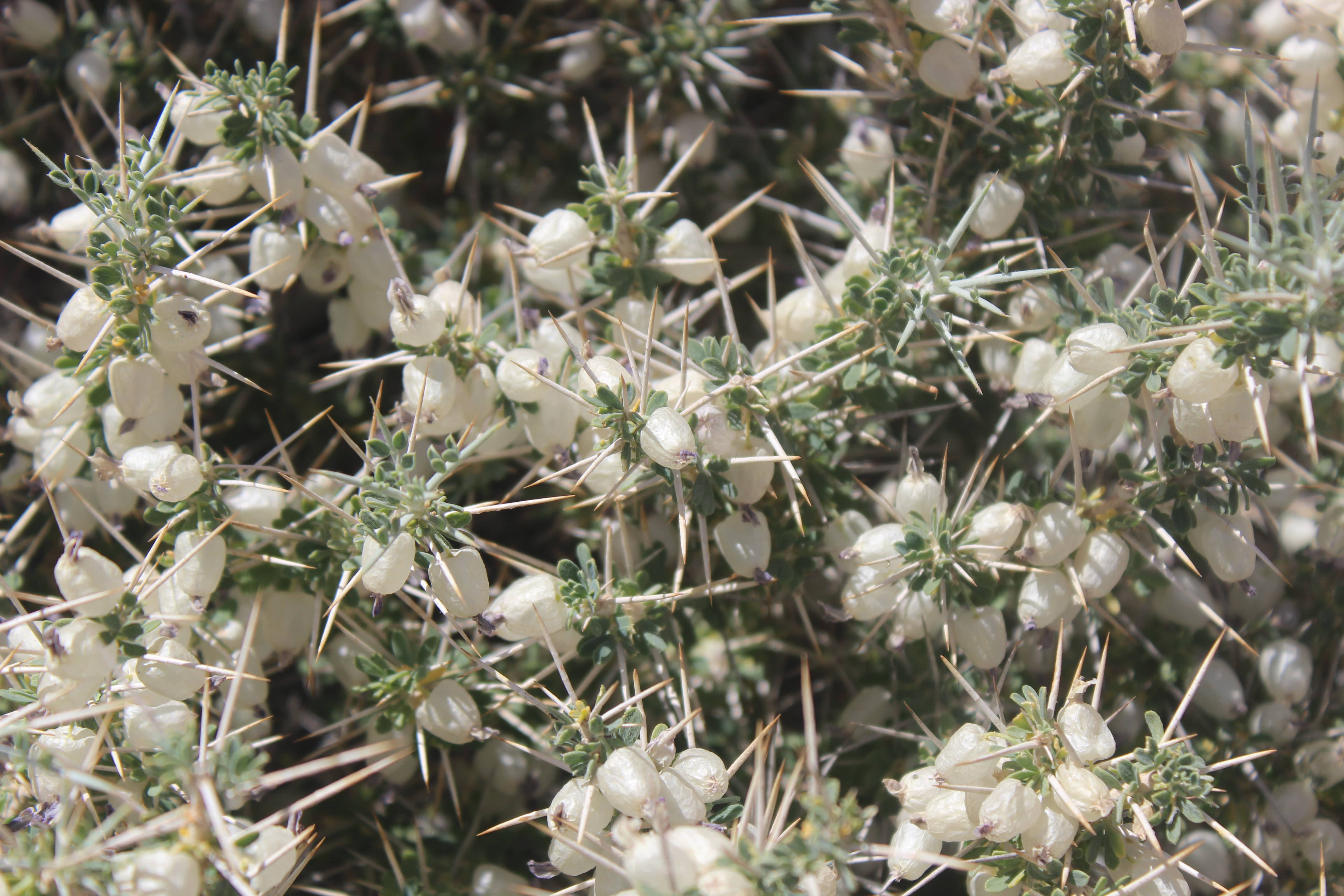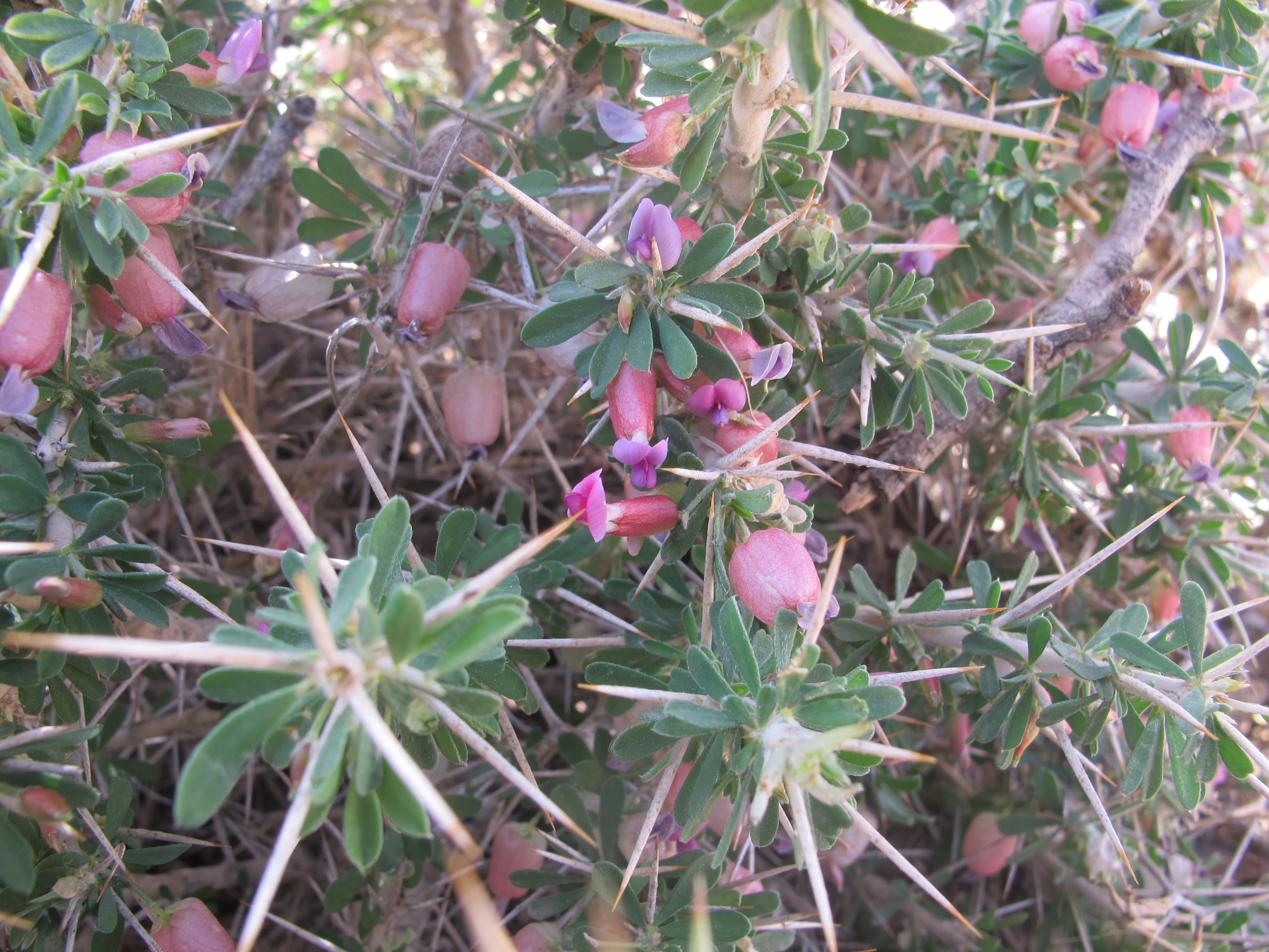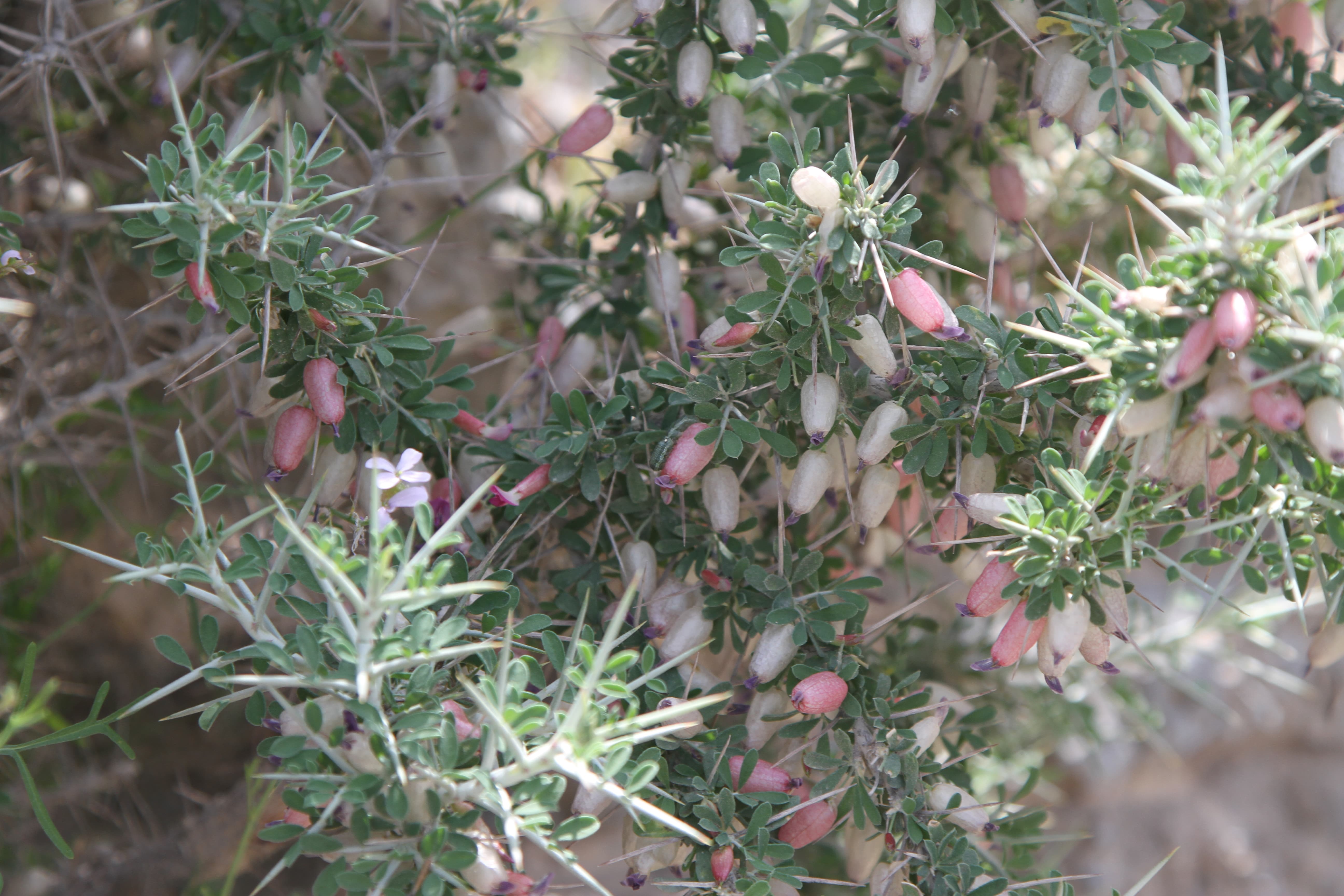 Spiny shrub ; up to 60 cm tall . Stems profusely branched , bark white , lateral branches spine-like , up to 2 cm , white-grey tipped brown , sharply pointed at the tip , pubescent with basifixed hairs . Leaves paripinnate , with 2(-3) pairs of leaflets , glaucous , shortly petiolate , in fascicles on the main stem and the spiny lateral branches ; leaflets 5-9 x 2-4 mm , obovate to oblong-obovate , obtuse , pubescent . Inflorescences solitary or 1-2 in the axils of leaves . Flowers pink to pink-purple ; calyx 11-12 mm , tubular , becoming inflated and membranous , pinkish at first becoming whitish later , lobes short acute ; corolla pink to pink-purple , ± 15 mm . Fruit pod , ± 10 mm , stipitate , enclosed within the calyx , 2-seeded . (Ref . Flora of Oman ; vol . 2) .
