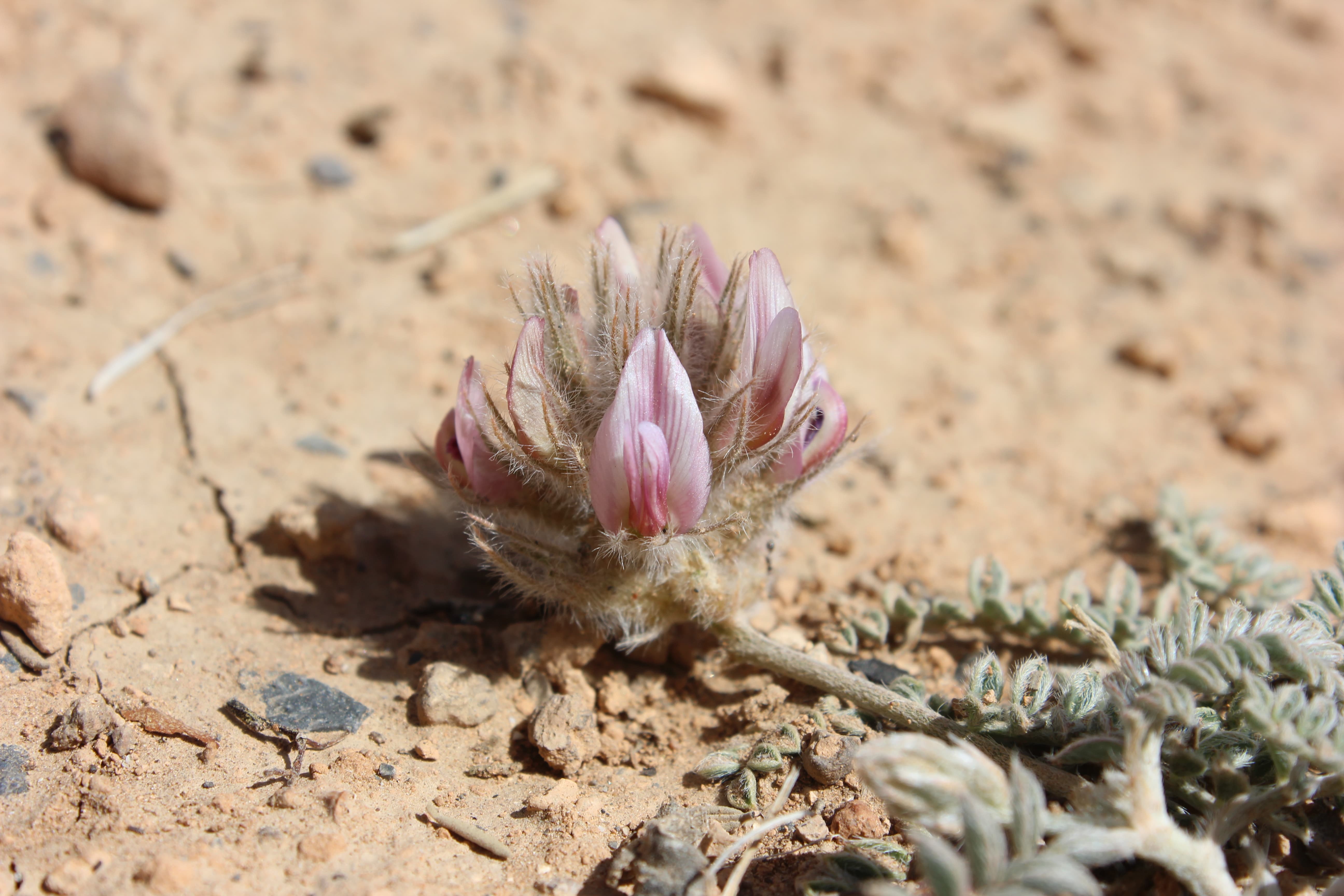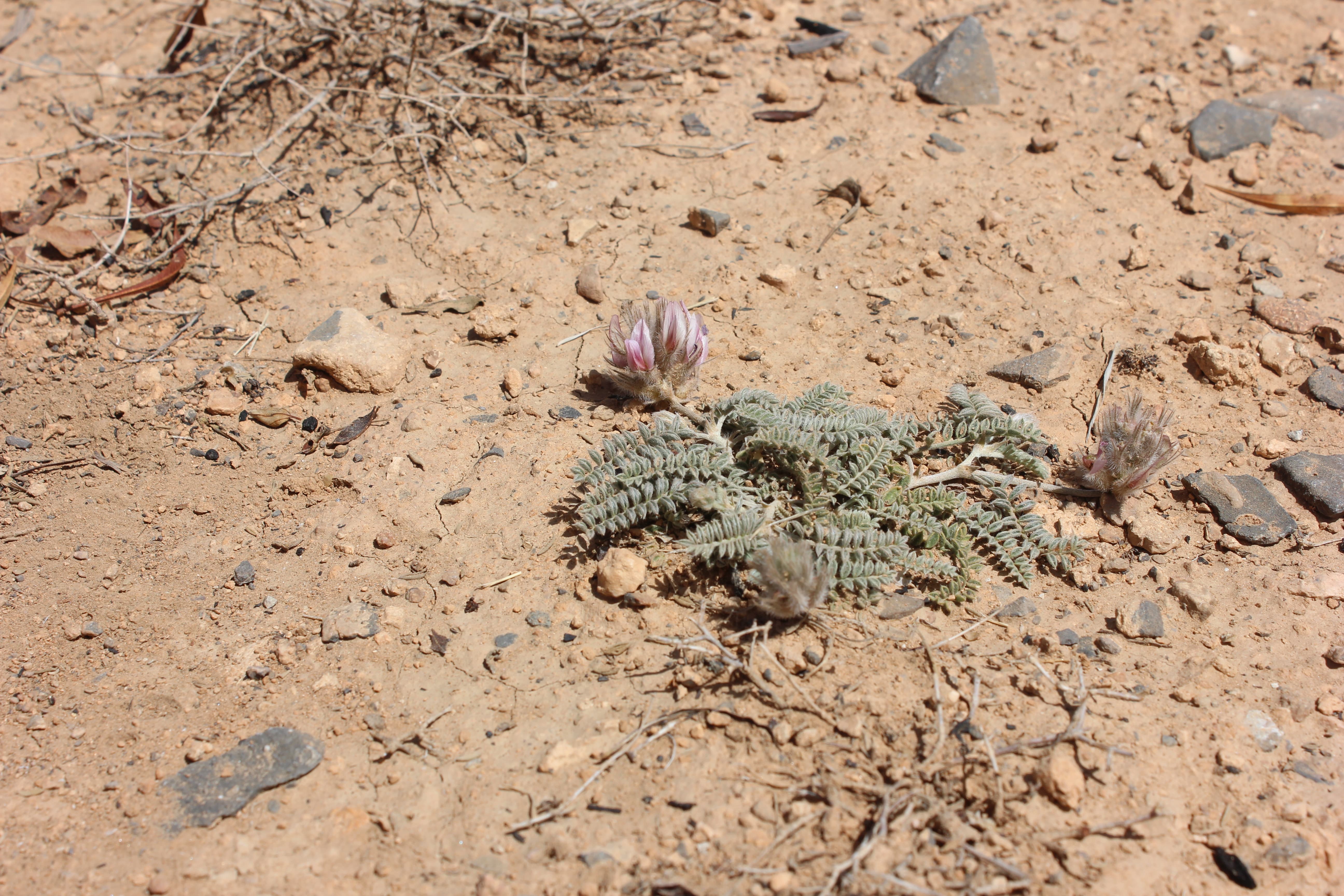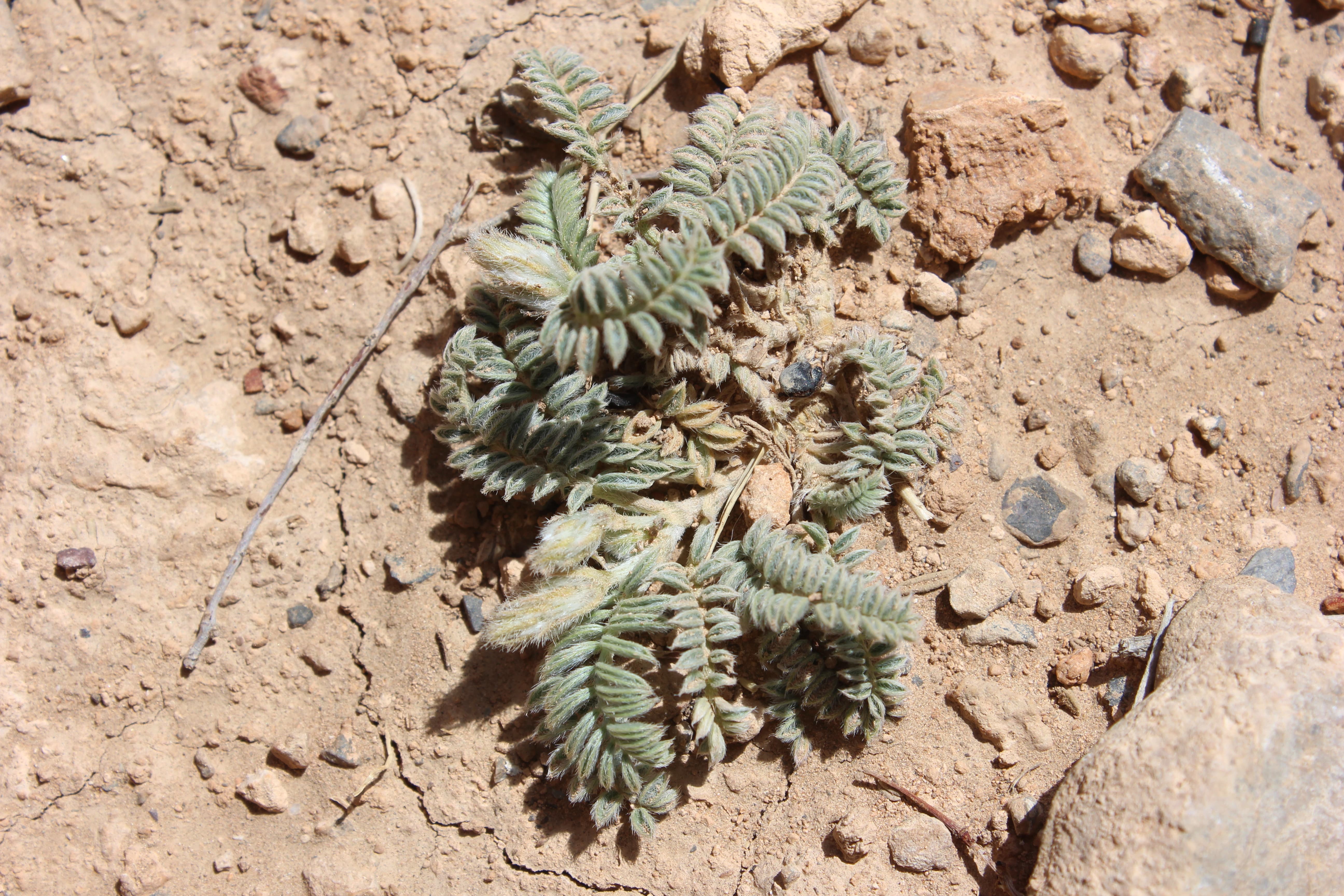 Annual herb with a woody rootstock . Stems short , the whole plant densely white-pilose . Leaves 3-4 , arising from the base , paripinnate , 6-8 cm long with 12-17 pairs of leaflets ; leaflets 5-8 x 2-3 mm , apical leaflets smaller in size , elliptic , white-pilose on both surfaces . Inflorescences with short pedicels , in pedunculate spicate heads . Flowers pink-purple ; calyx 12-15 mm , 5-lobed , lobes linear , about as long as the calyx tube and almost reaching the corolla , densely pilose ; corolla pink-purple , 12-15 mm . Fruit pod . (Ref . Flora of Oman ; vol . 2) .